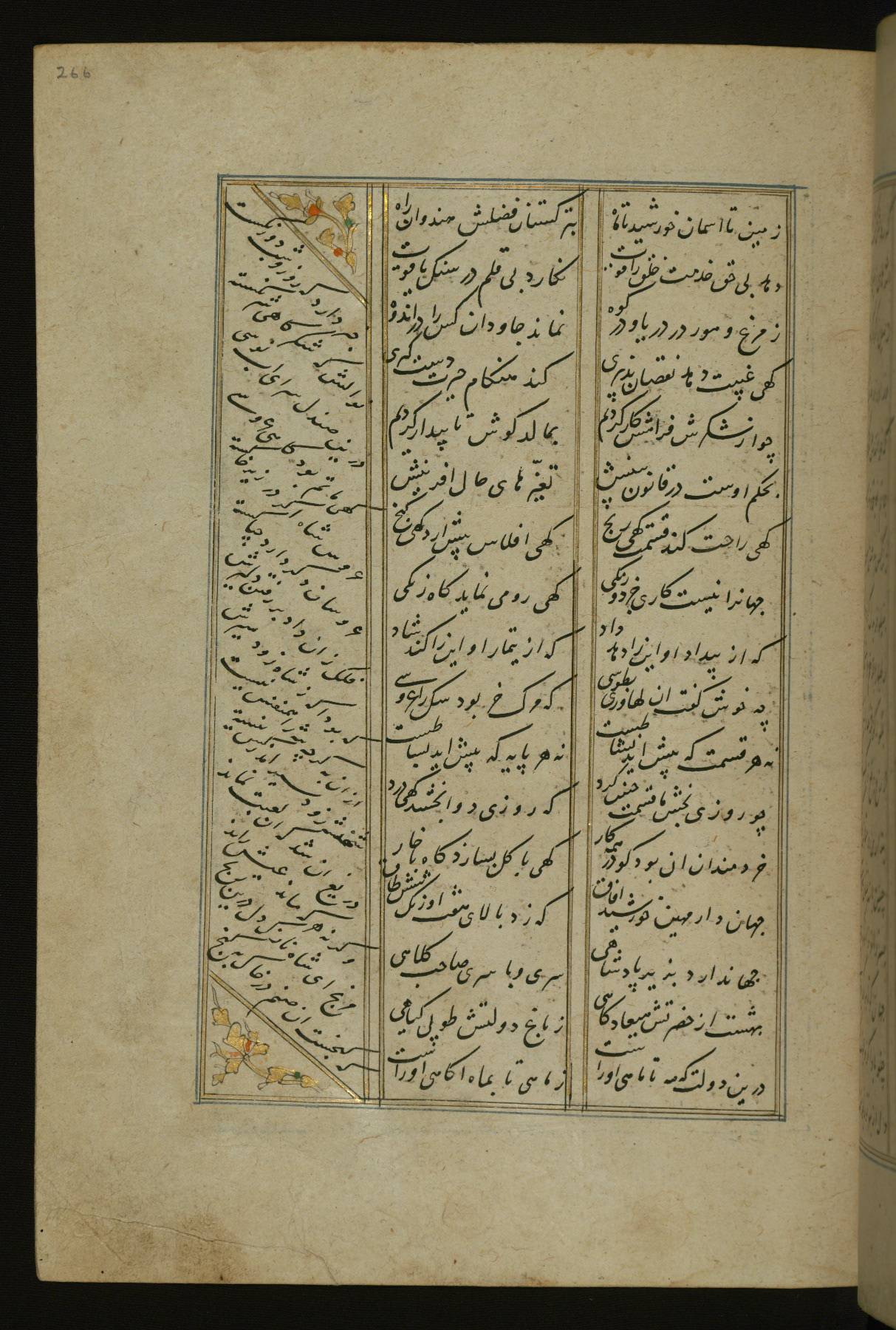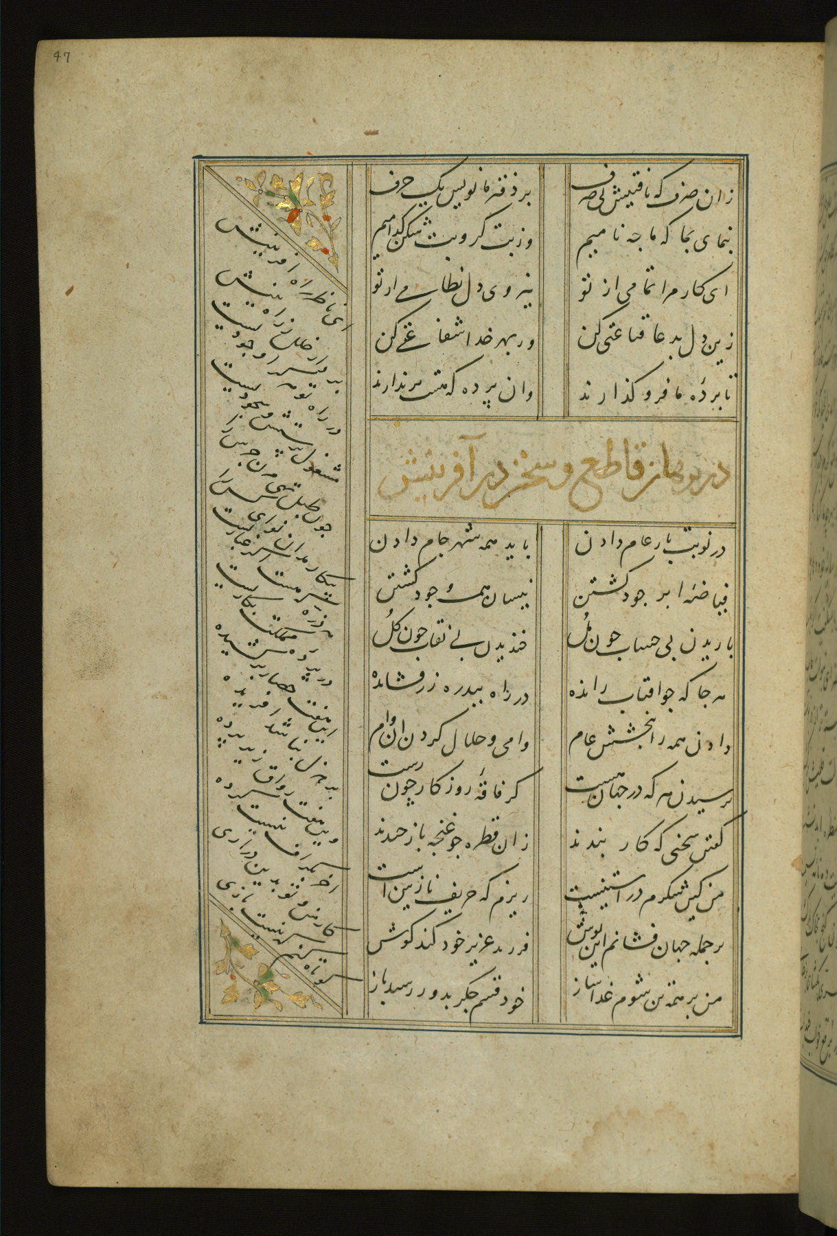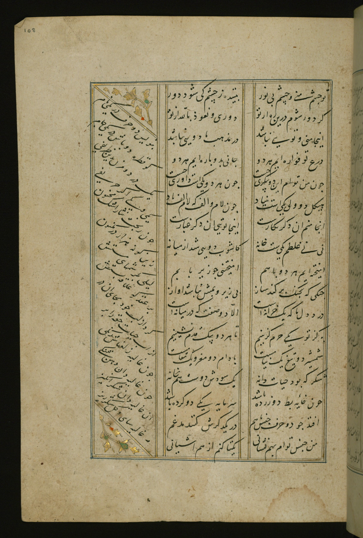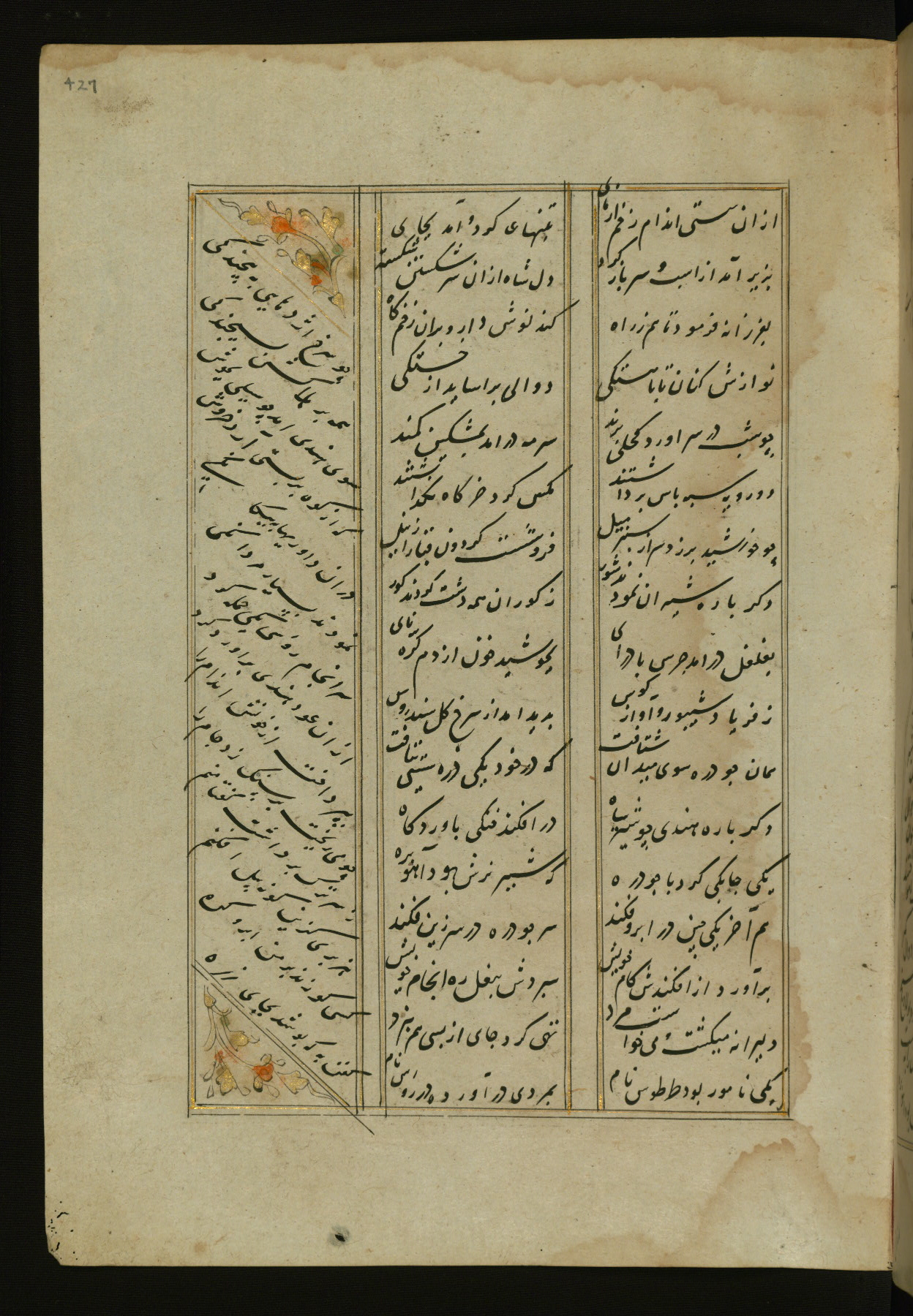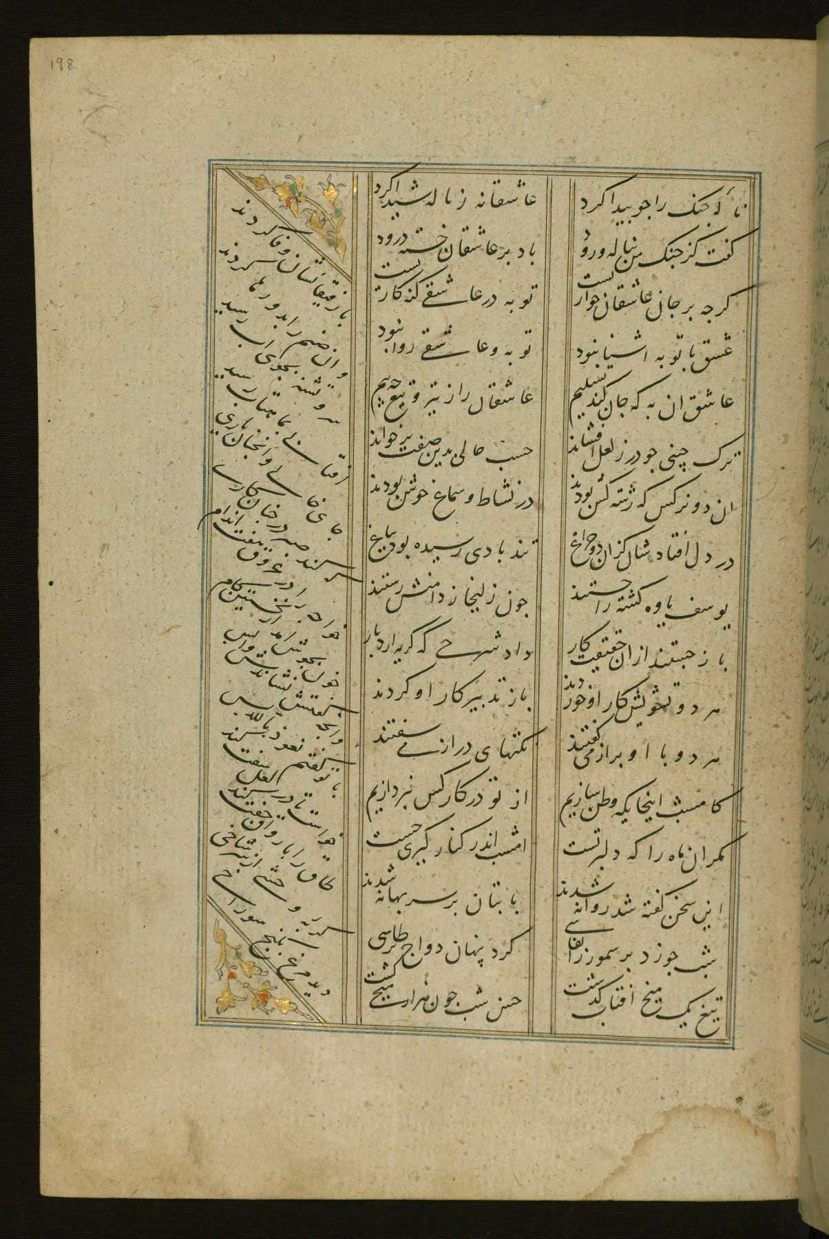 This copy of the Khamsah (quintet) of Niẓāmī Ganjavī (d. 605 AH / 1209 CE) was written by Abū Bakr Shāh ibn Ḥasan ibn ʿAlī al-Shahrastānī and illuminated by Jamāl al-Dīn ibn Muḥammad al-Ṣiddīqī al-Iṣfahānī between 892 AH / 1486 CE and 900 AH / 1494-5 CE. The manuscript opens with a double-page illuminated frontispiece with an inscription giving the title of the work and the name of the author (fols. 1b-2a). There are four illuminated titlepieces with the names of the individual poems and twenty-six repainted illustrations. According to evidence supplied by the colophons, the original binding was by the hand of Jamāl al-Dīn ibn Muḥammad al-Ṣiddīqī al-Iṣfahānī, as well. Unfortunately, it has not survived. The binding presently attached to the manuscript dates to the twelfth century AH / eighteenth CE.