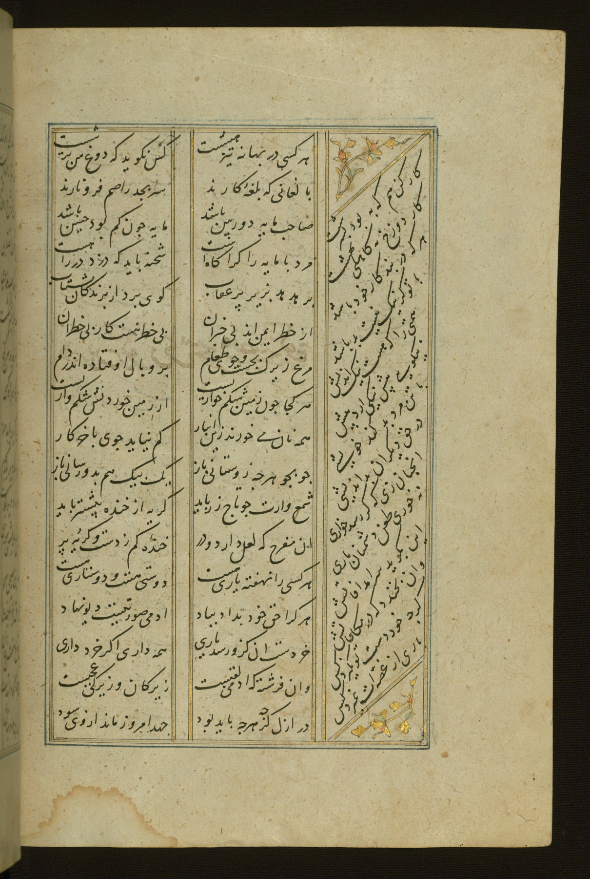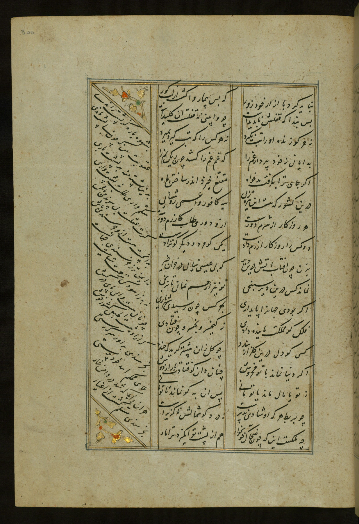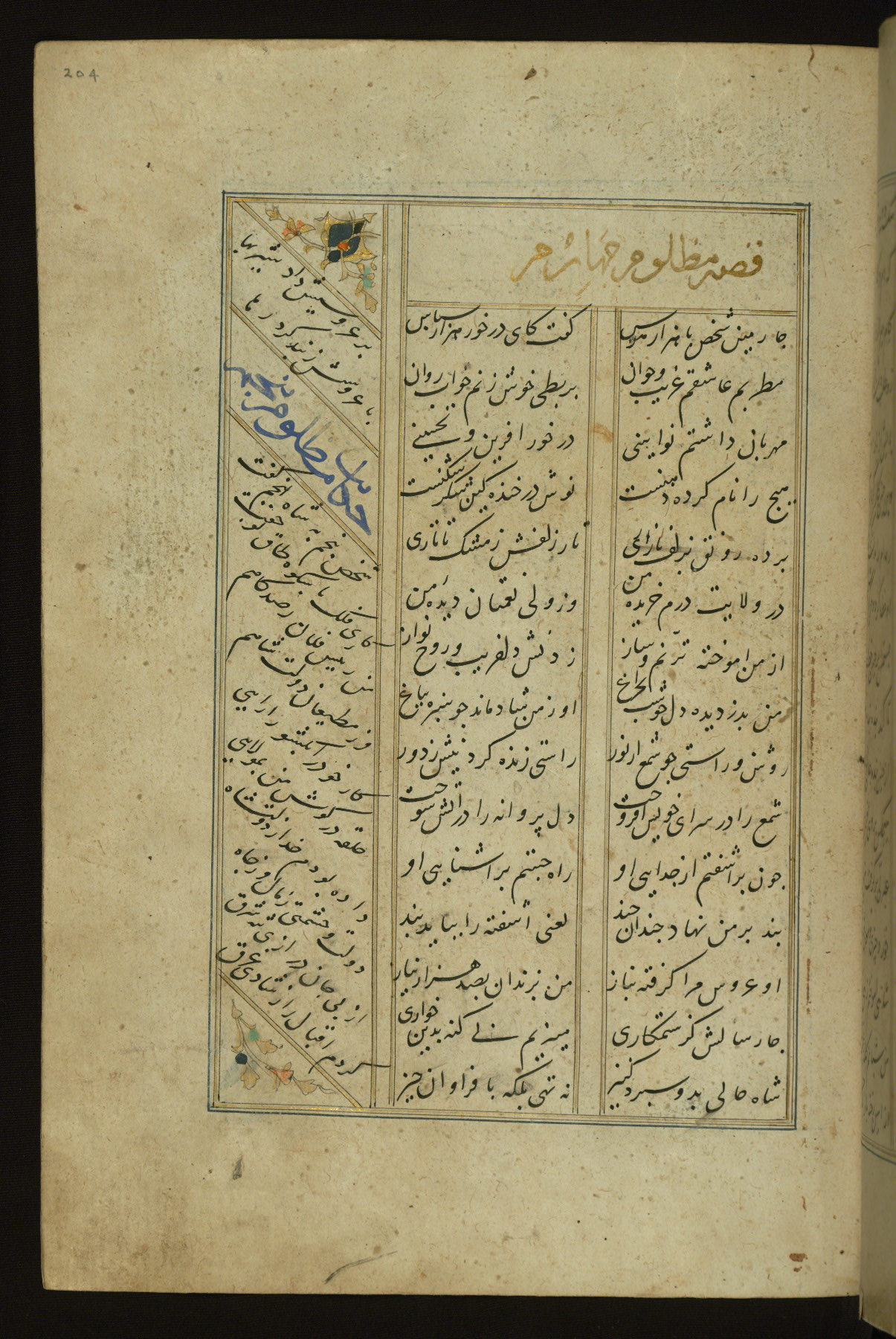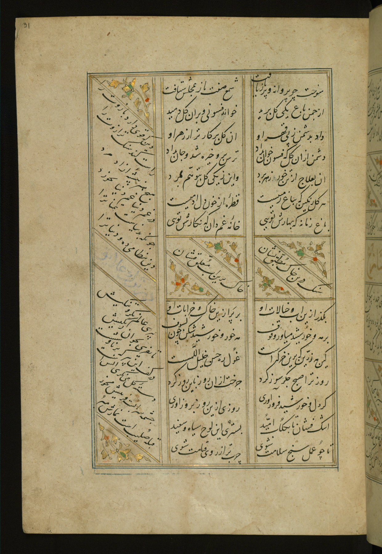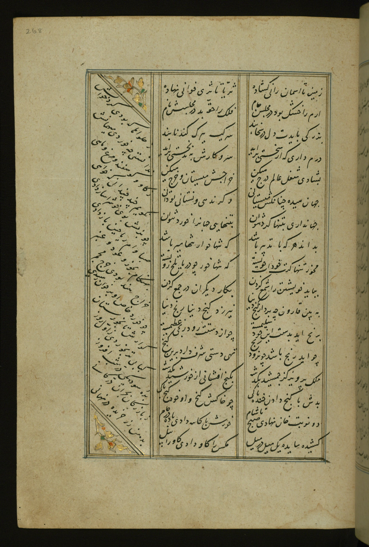 This copy of the Khamsah (quintet) of Niẓāmī Ganjavī (d. 605 AH / 1209 CE) was written by Abū Bakr Shāh ibn Ḥasan ibn ʿAlī al-Shahrastānī and illuminated by Jamāl al-Dīn ibn Muḥammad al-Ṣiddīqī al-Iṣfahānī between 892 AH / 1486 CE and 900 AH / 1494-5 CE. The manuscript opens with a double-page illuminated frontispiece with an inscription giving the title of the work and the name of the author (fols. 1b-2a). There are four illuminated titlepieces with the names of the individual poems and twenty-six repainted illustrations. According to evidence supplied by the colophons, the original binding was by the hand of Jamāl al-Dīn ibn Muḥammad al-Ṣiddīqī al-Iṣfahānī, as well. Unfortunately, it has not survived. The binding presently attached to the manuscript dates to the twelfth century AH / eighteenth CE.