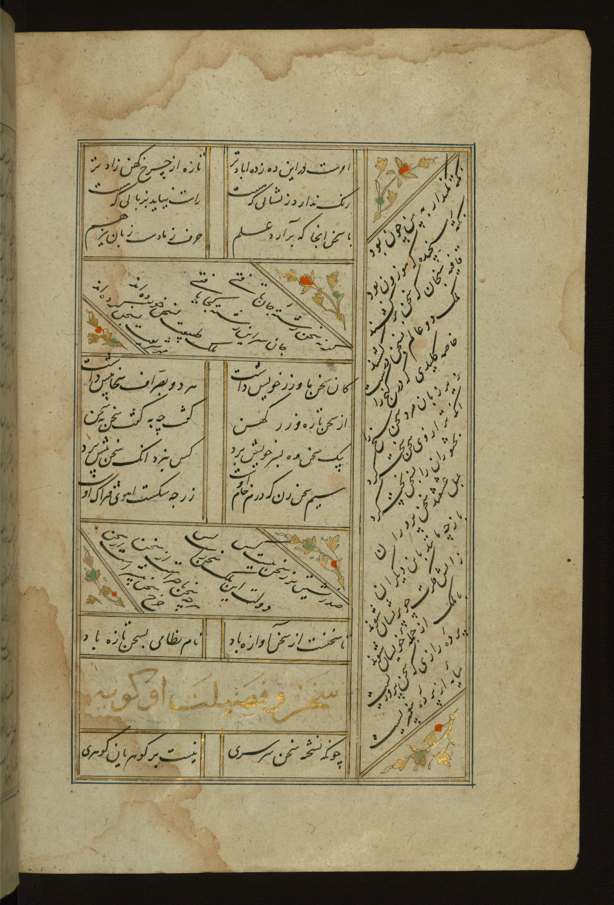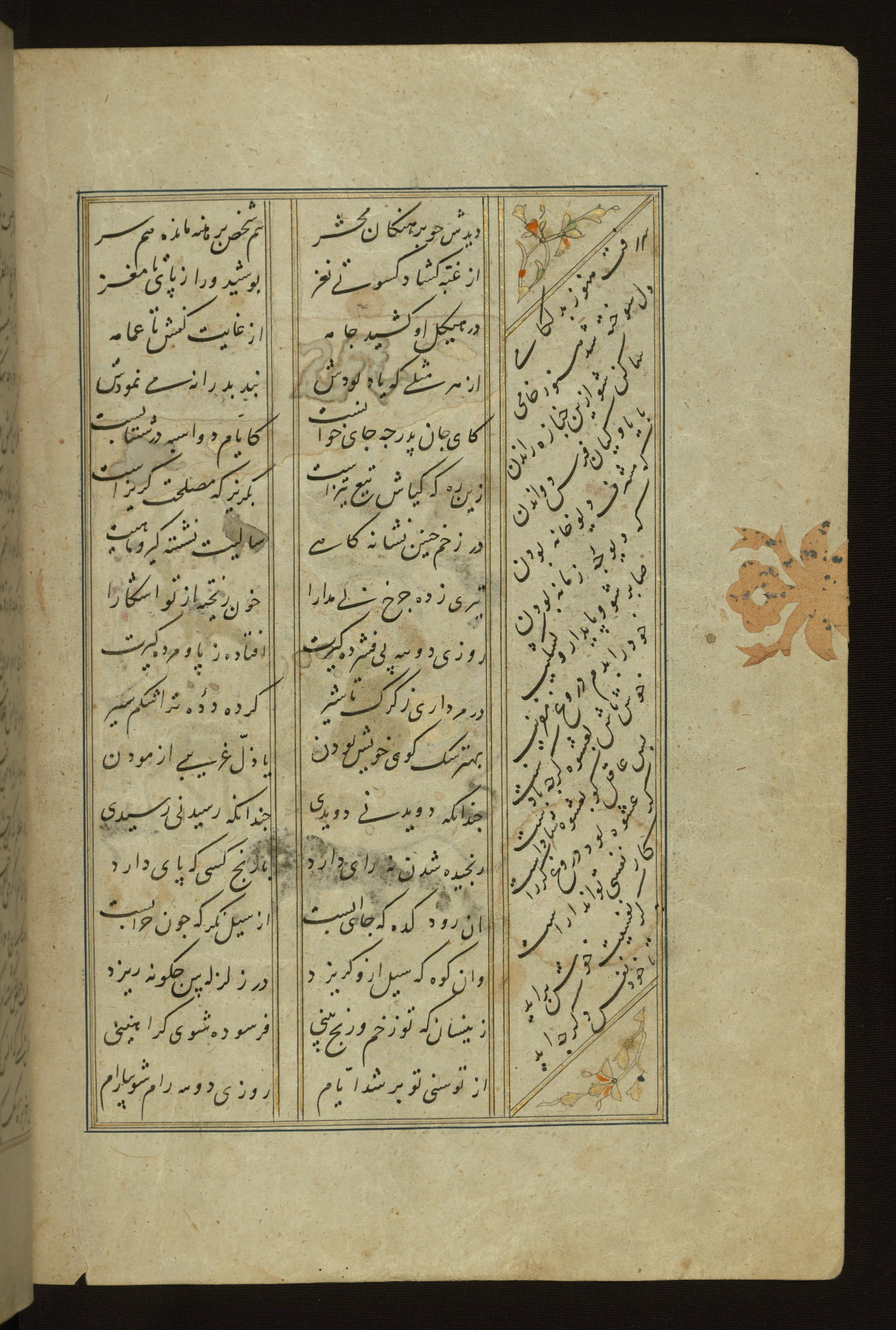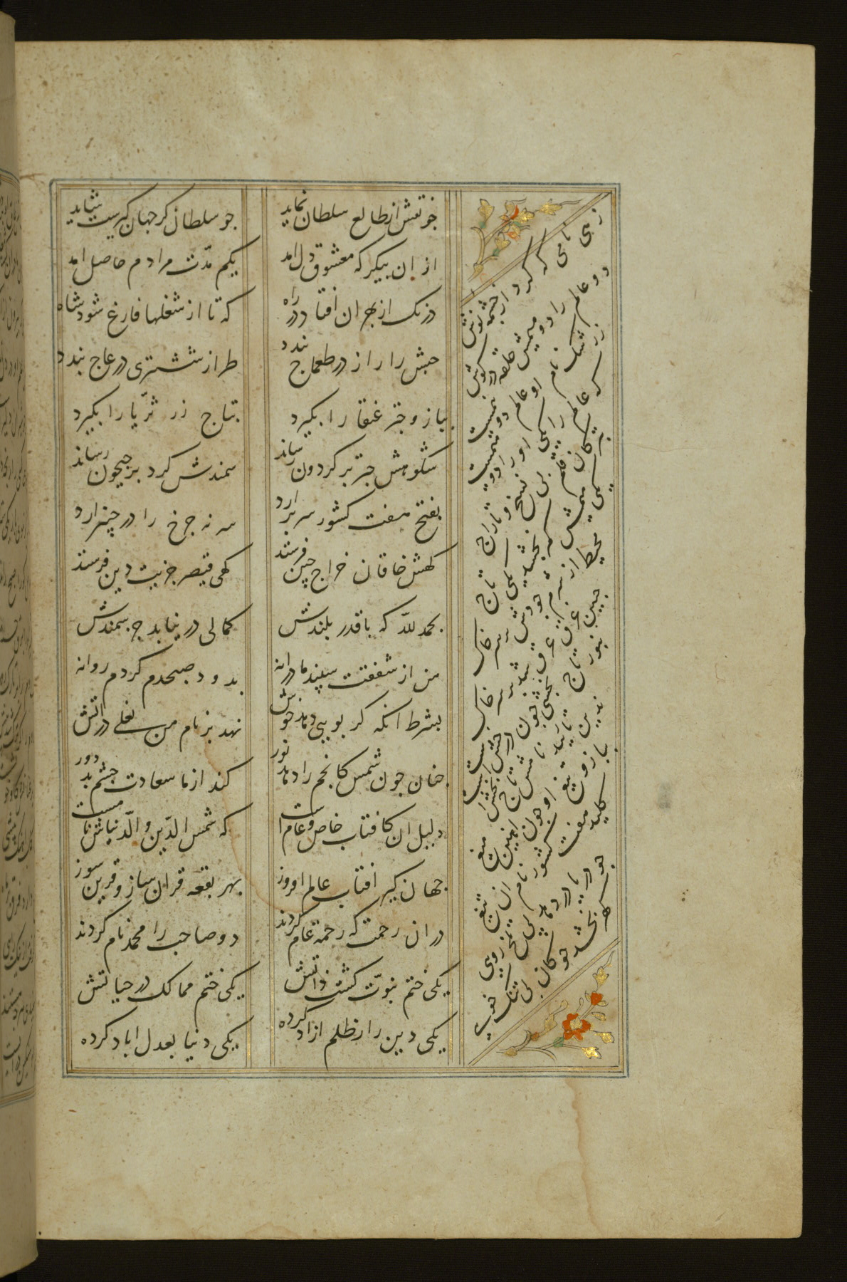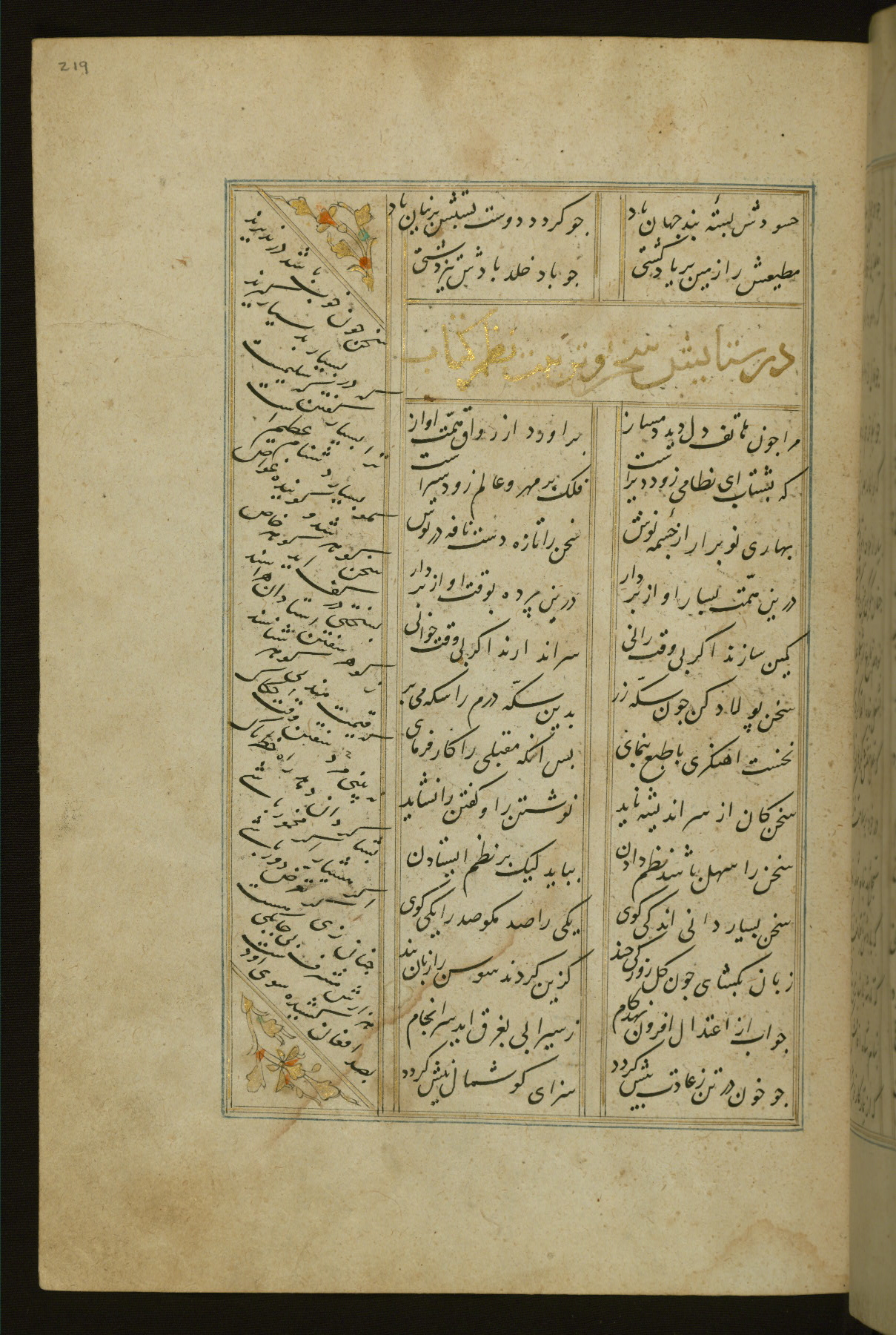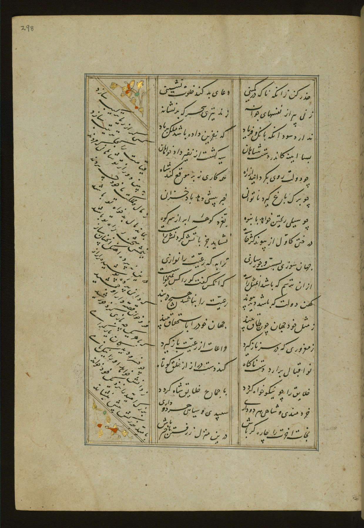 This copy of the Khamsah (quintet) of Niẓāmī Ganjavī (d. 605 AH / 1209 CE) was written by Abū Bakr Shāh ibn Ḥasan ibn ʿAlī al-Shahrastānī and illuminated by Jamāl al-Dīn ibn Muḥammad al-Ṣiddīqī al-Iṣfahānī between 892 AH / 1486 CE and 900 AH / 1494-5 CE. The manuscript opens with a double-page illuminated frontispiece with an inscription giving the title of the work and the name of the author (fols. 1b-2a). There are four illuminated titlepieces with the names of the individual poems and twenty-six repainted illustrations. According to evidence supplied by the colophons, the original binding was by the hand of Jamāl al-Dīn ibn Muḥammad al-Ṣiddīqī al-Iṣfahānī, as well. Unfortunately, it has not survived. The binding presently attached to the manuscript dates to the twelfth century AH / eighteenth CE.