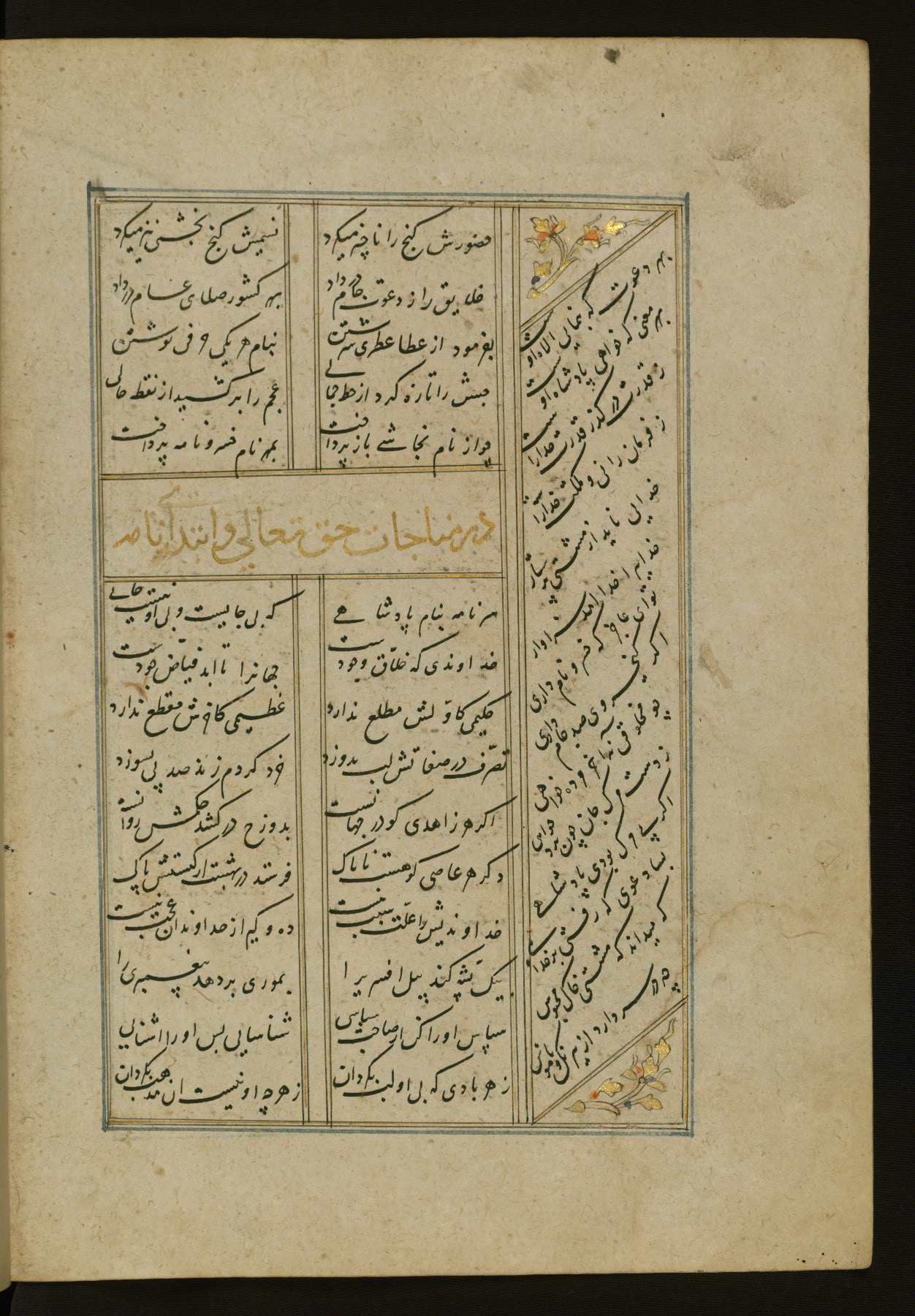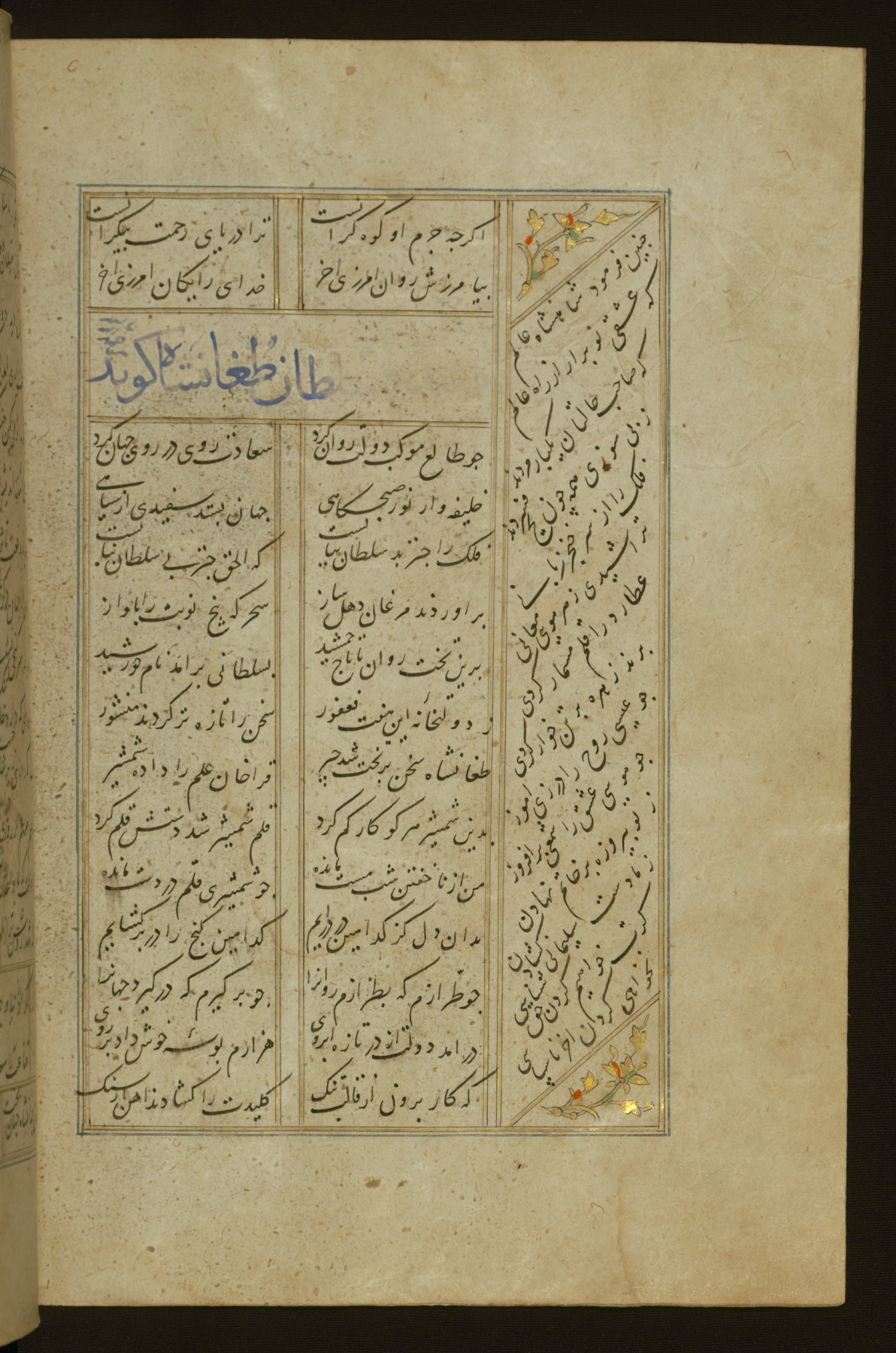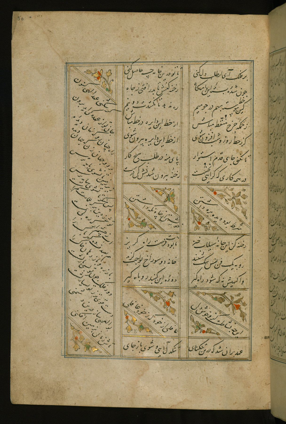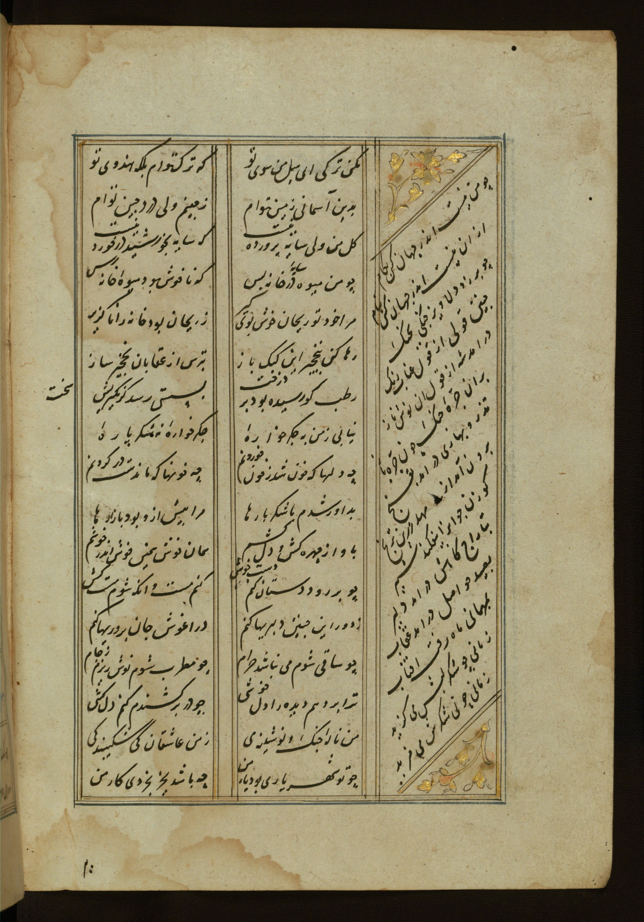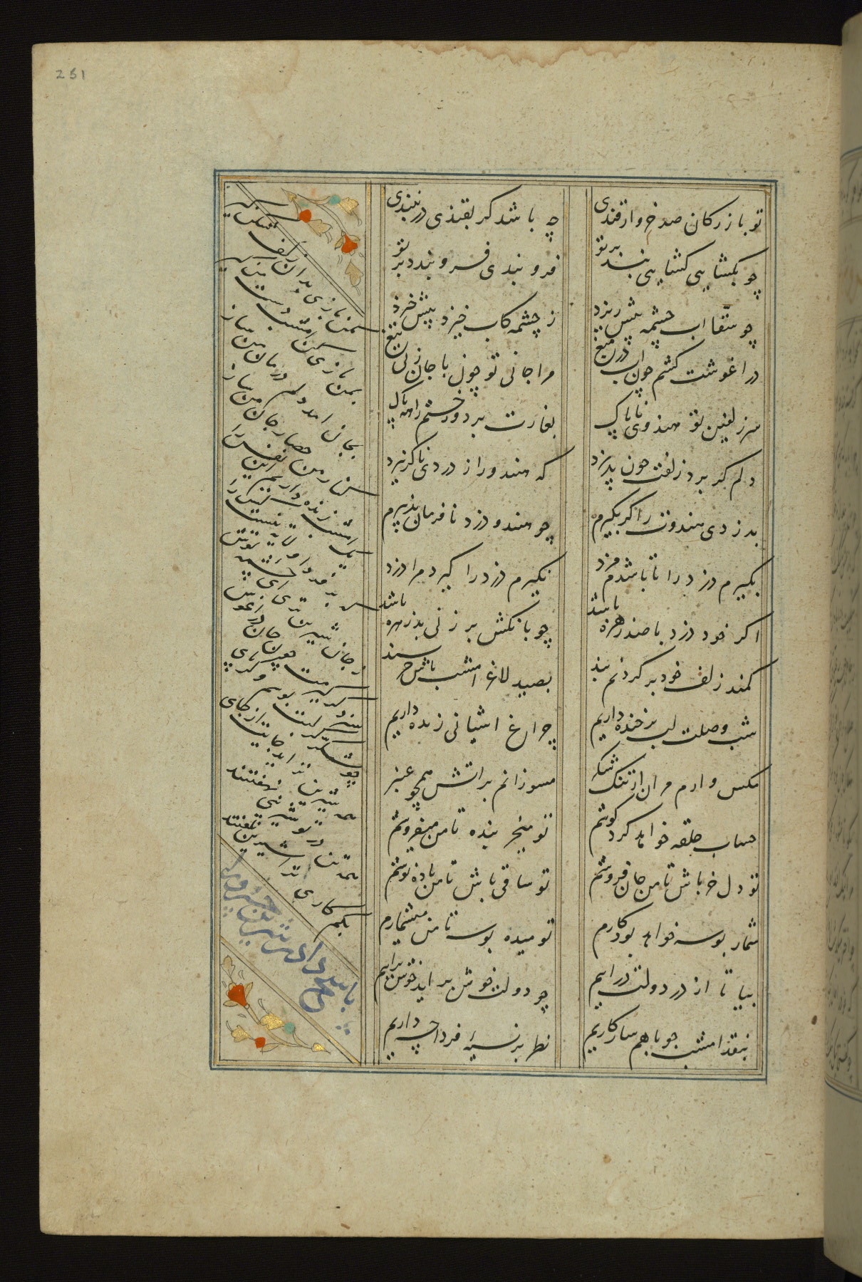 This copy of the Khamsah (quintet) of Niẓāmī Ganjavī (d. 605 AH / 1209 CE) was written by Abū Bakr Shāh ibn Ḥasan ibn ʿAlī al-Shahrastānī and illuminated by Jamāl al-Dīn ibn Muḥammad al-Ṣiddīqī al-Iṣfahānī between 892 AH / 1486 CE and 900 AH / 1494-5 CE. The manuscript opens with a double-page illuminated frontispiece with an inscription giving the title of the work and the name of the author (fols. 1b-2a). There are four illuminated titlepieces with the names of the individual poems and twenty-six repainted illustrations. According to evidence supplied by the colophons, the original binding was by the hand of Jamāl al-Dīn ibn Muḥammad al-Ṣiddīqī al-Iṣfahānī, as well. Unfortunately, it has not survived. The binding presently attached to the manuscript dates to the twelfth century AH / eighteenth CE.