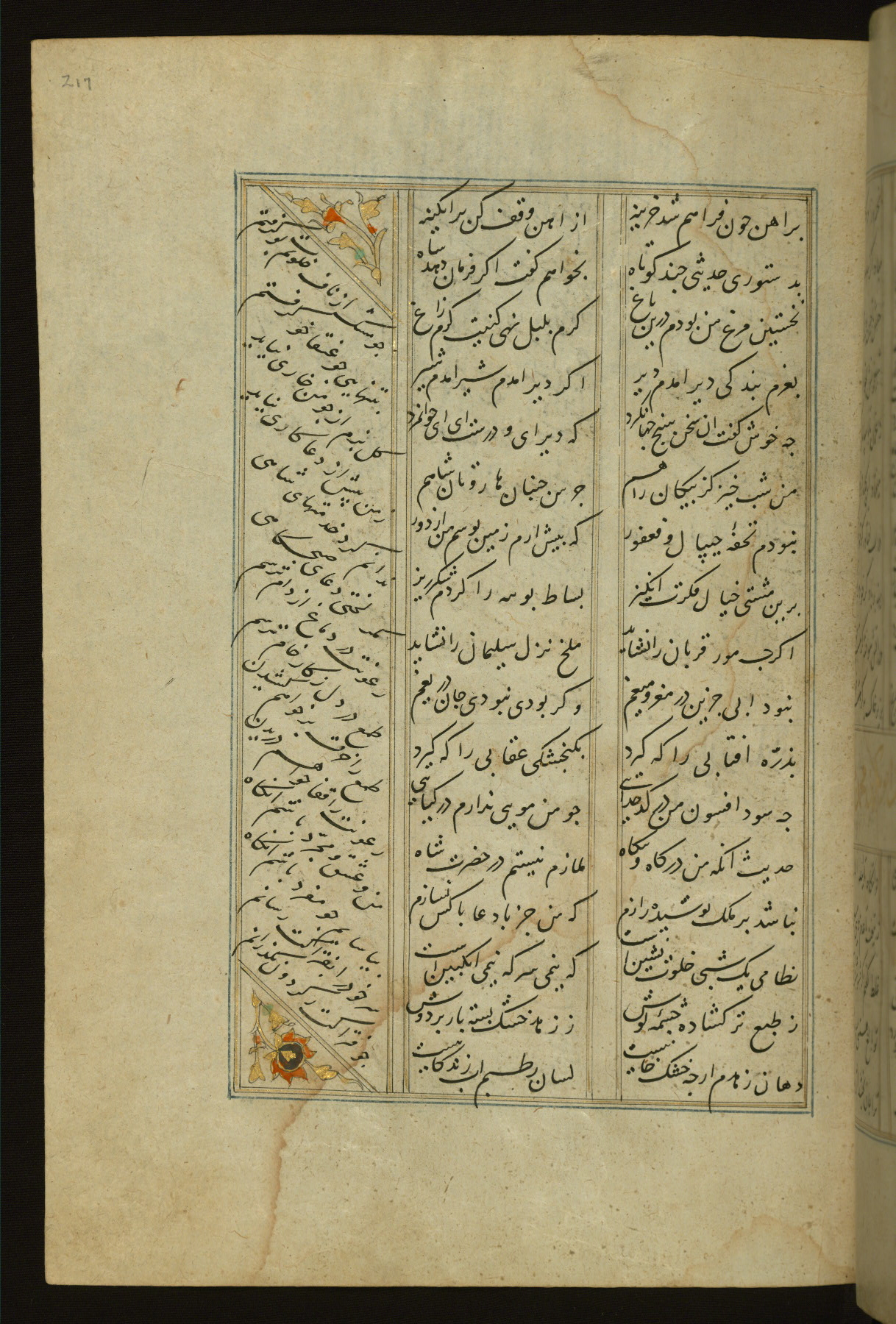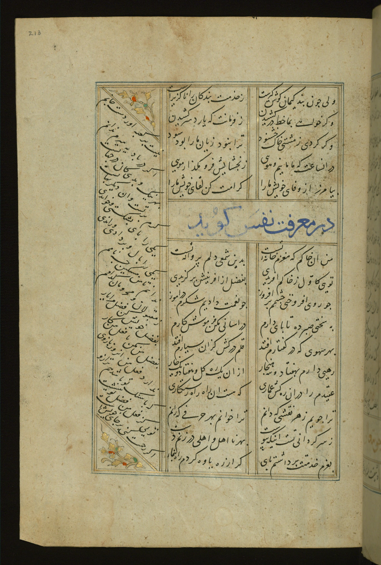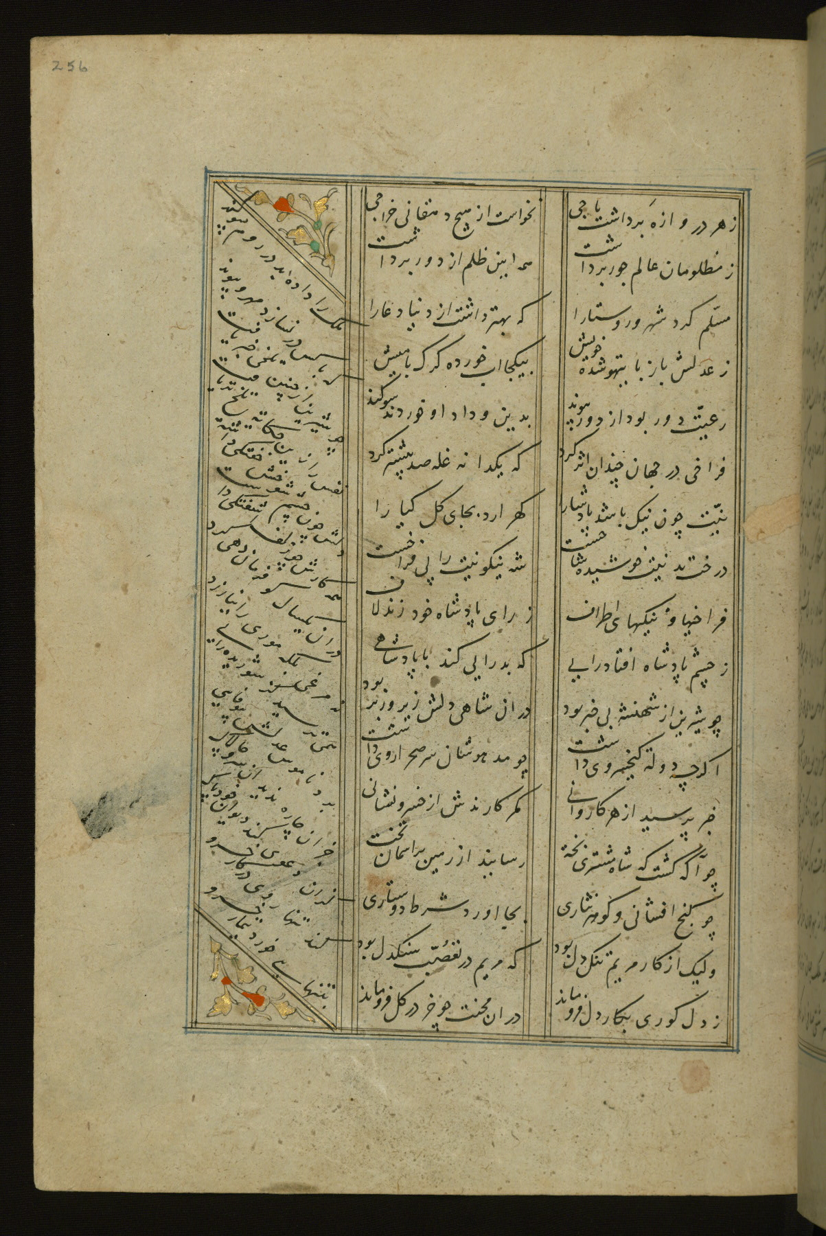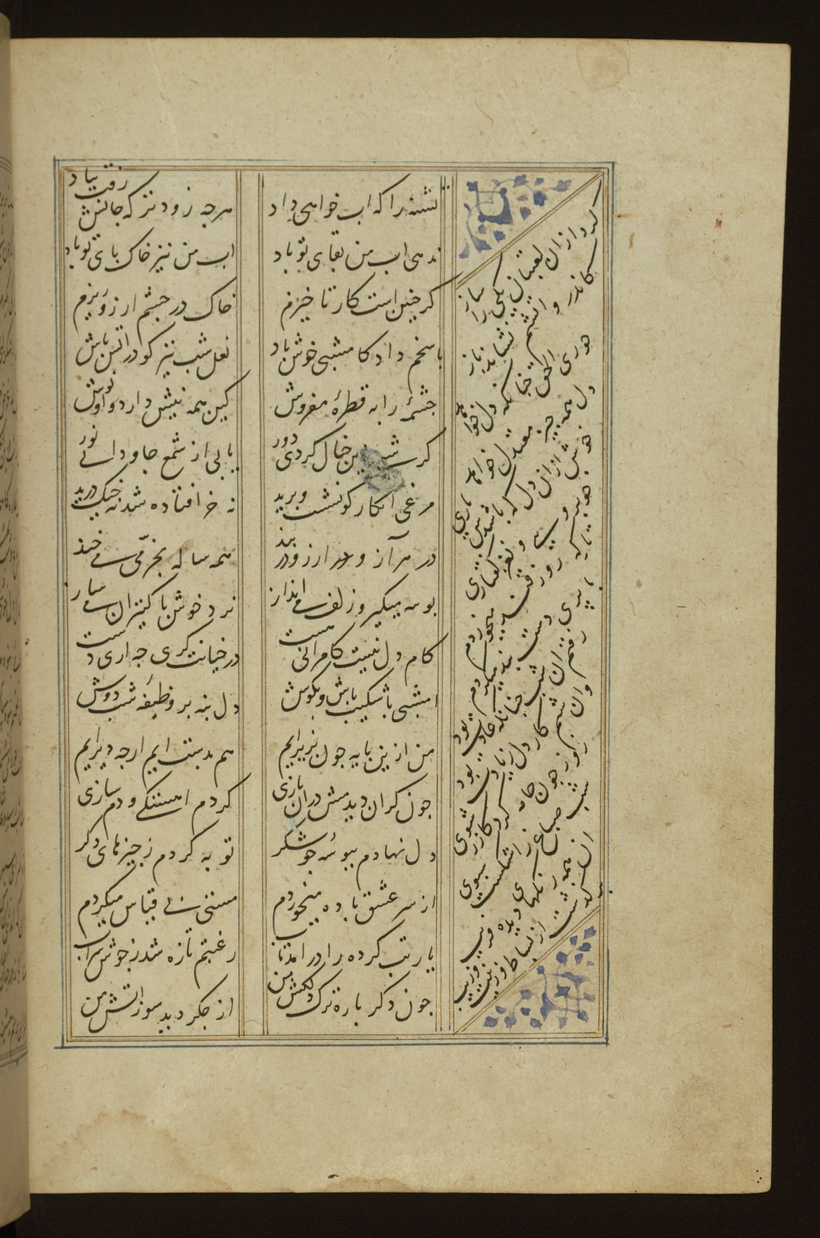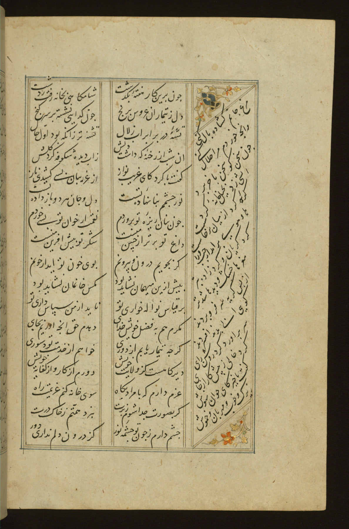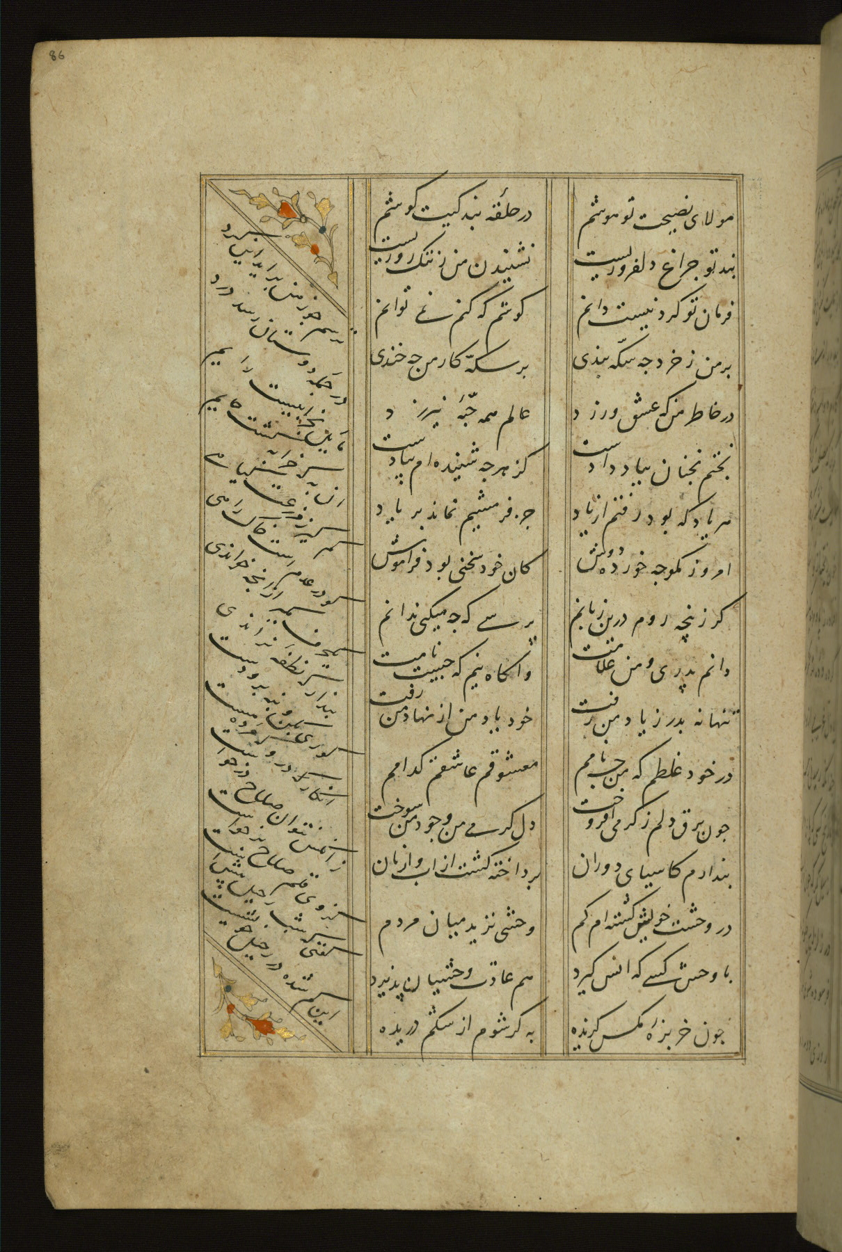 This copy of the Khamsah (quintet) of Niẓāmī Ganjavī (d. 605 AH / 1209 CE) was written by Abū Bakr Shāh ibn Ḥasan ibn ʿAlī al-Shahrastānī and illuminated by Jamāl al-Dīn ibn Muḥammad al-Ṣiddīqī al-Iṣfahānī between 892 AH / 1486 CE and 900 AH / 1494-5 CE. The manuscript opens with a double-page illuminated frontispiece with an inscription giving the title of the work and the name of the author (fols. 1b-2a). There are four illuminated titlepieces with the names of the individual poems and twenty-six repainted illustrations. According to evidence supplied by the colophons, the original binding was by the hand of Jamāl al-Dīn ibn Muḥammad al-Ṣiddīqī al-Iṣfahānī, as well. Unfortunately, it has not survived. The binding presently attached to the manuscript dates to the twelfth century AH / eighteenth CE.