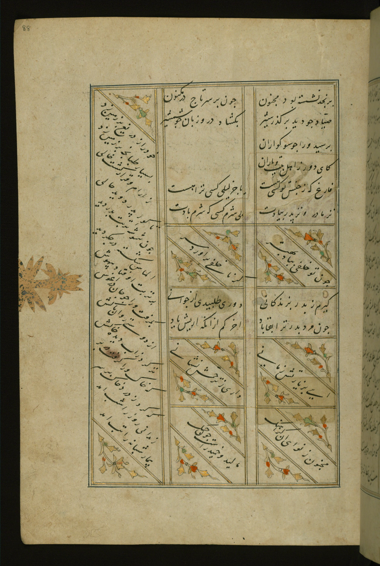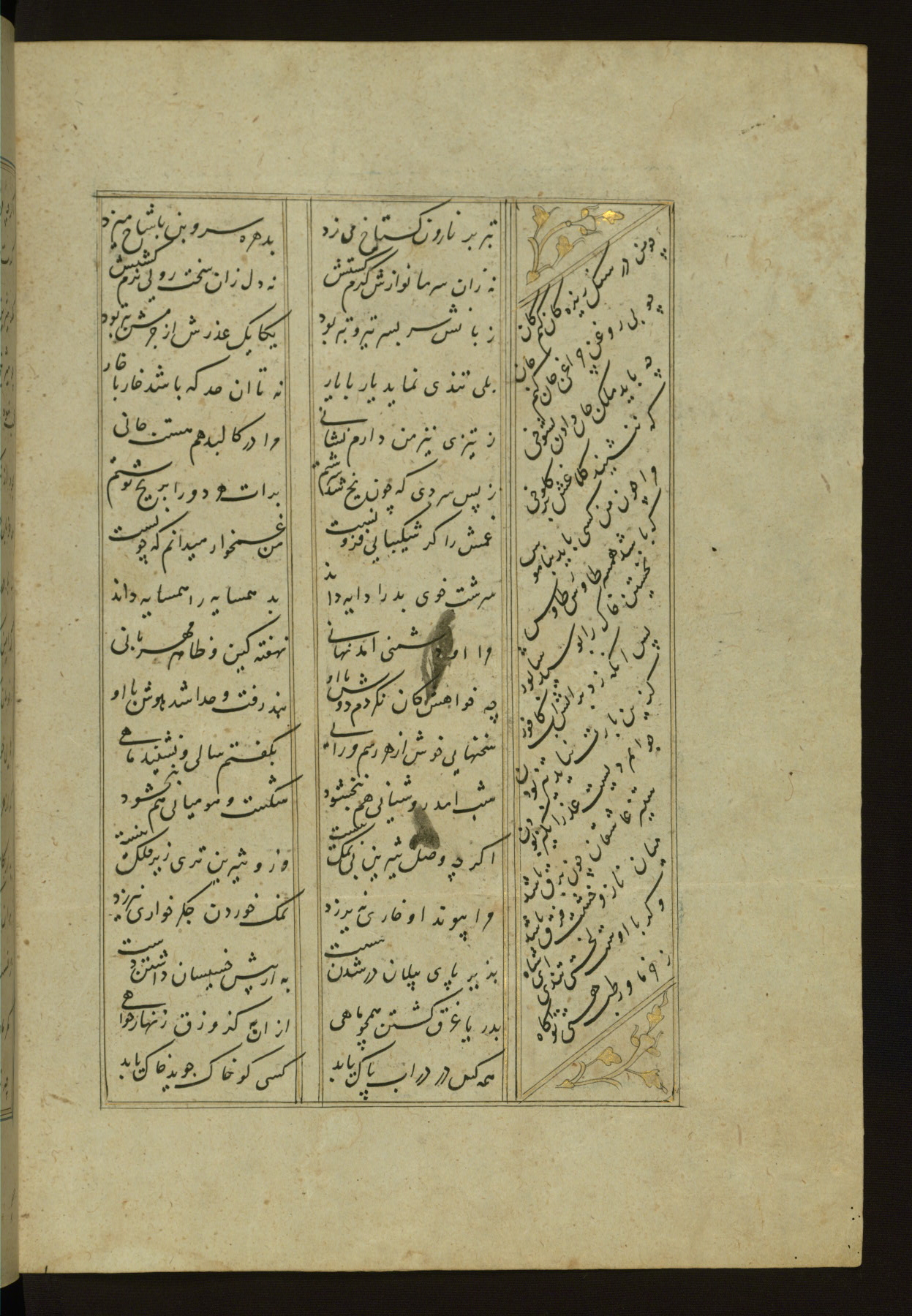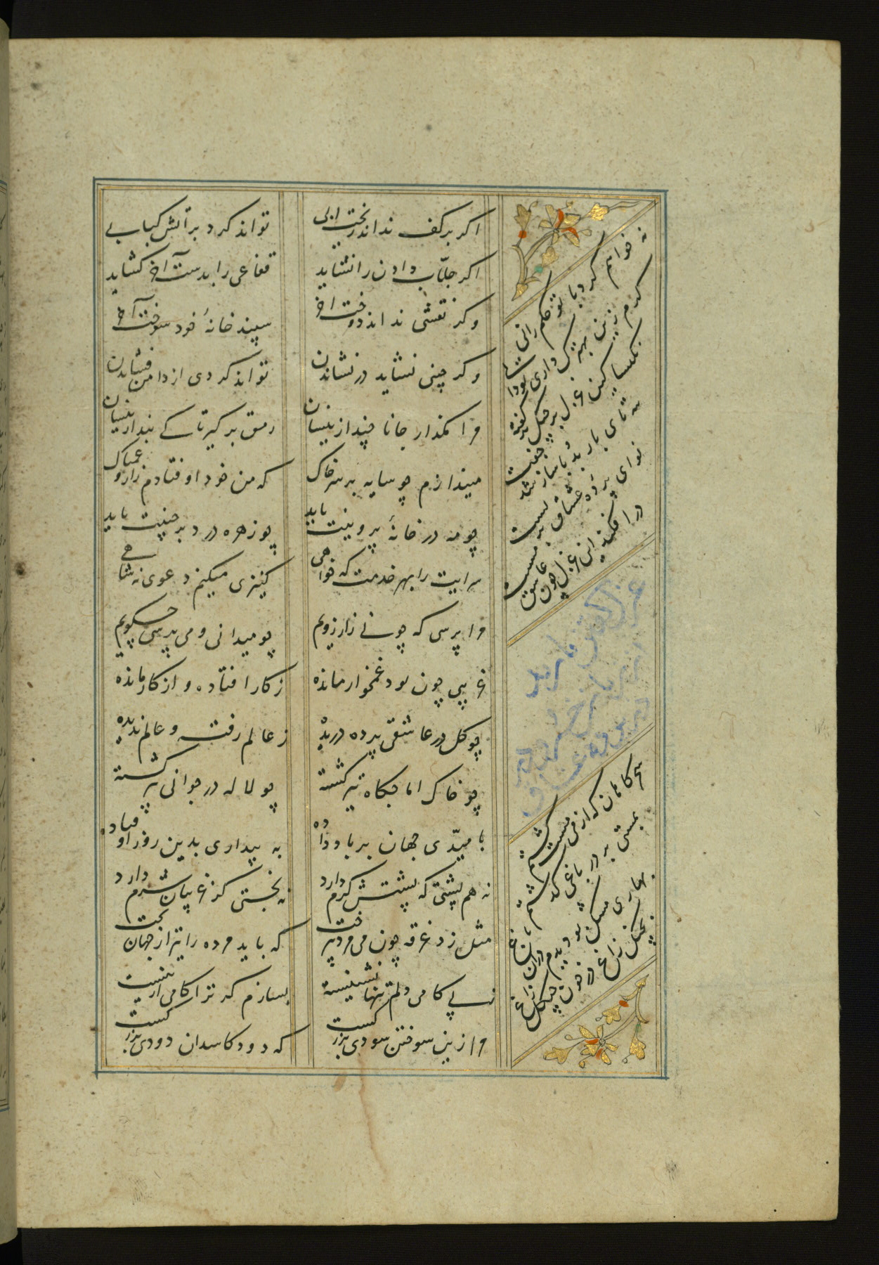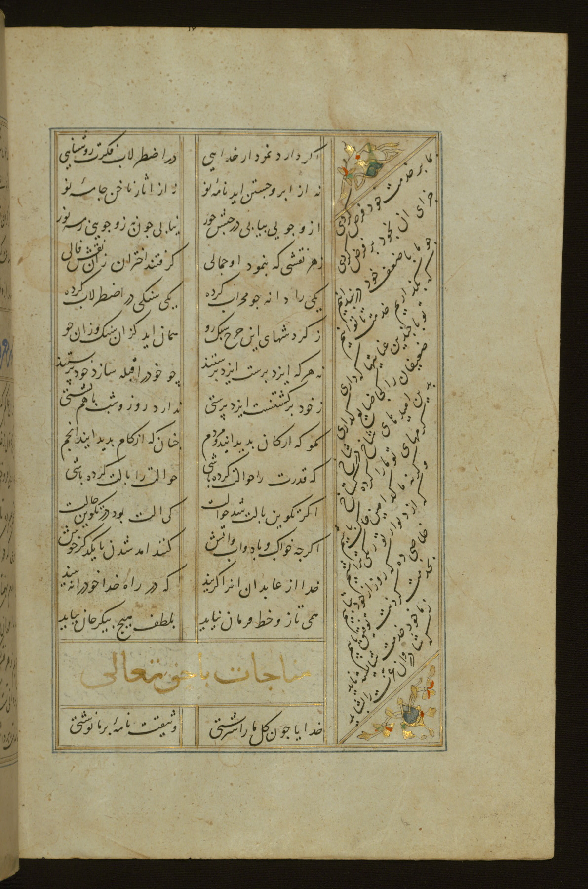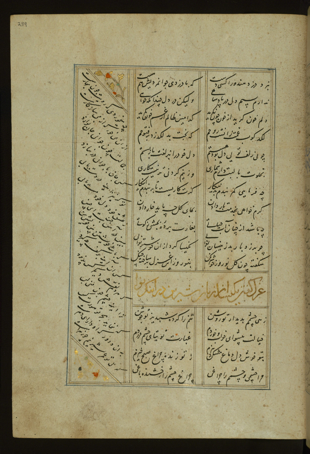 This copy of the Khamsah (quintet) of Niẓāmī Ganjavī (d. 605 AH / 1209 CE) was written by Abū Bakr Shāh ibn Ḥasan ibn ʿAlī al-Shahrastānī and illuminated by Jamāl al-Dīn ibn Muḥammad al-Ṣiddīqī al-Iṣfahānī between 892 AH / 1486 CE and 900 AH / 1494-5 CE. The manuscript opens with a double-page illuminated frontispiece with an inscription giving the title of the work and the name of the author (fols. 1b-2a). There are four illuminated titlepieces with the names of the individual poems and twenty-six repainted illustrations. According to evidence supplied by the colophons, the original binding was by the hand of Jamāl al-Dīn ibn Muḥammad al-Ṣiddīqī al-Iṣfahānī, as well. Unfortunately, it has not survived. The binding presently attached to the manuscript dates to the twelfth century AH / eighteenth CE.
