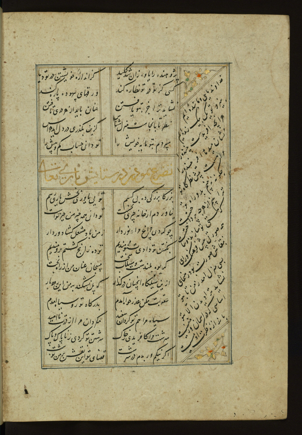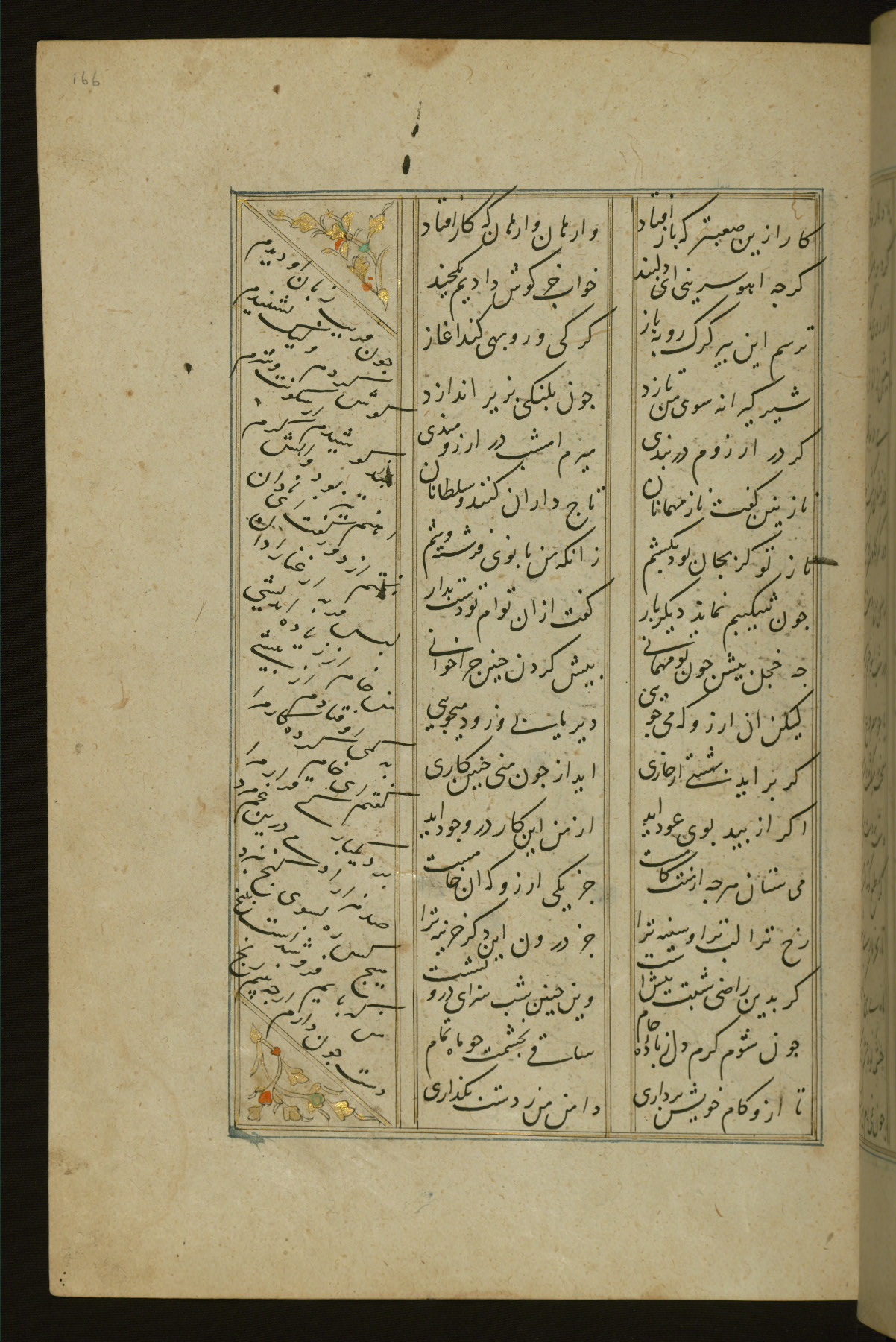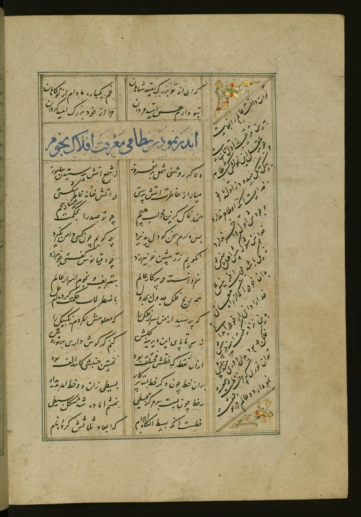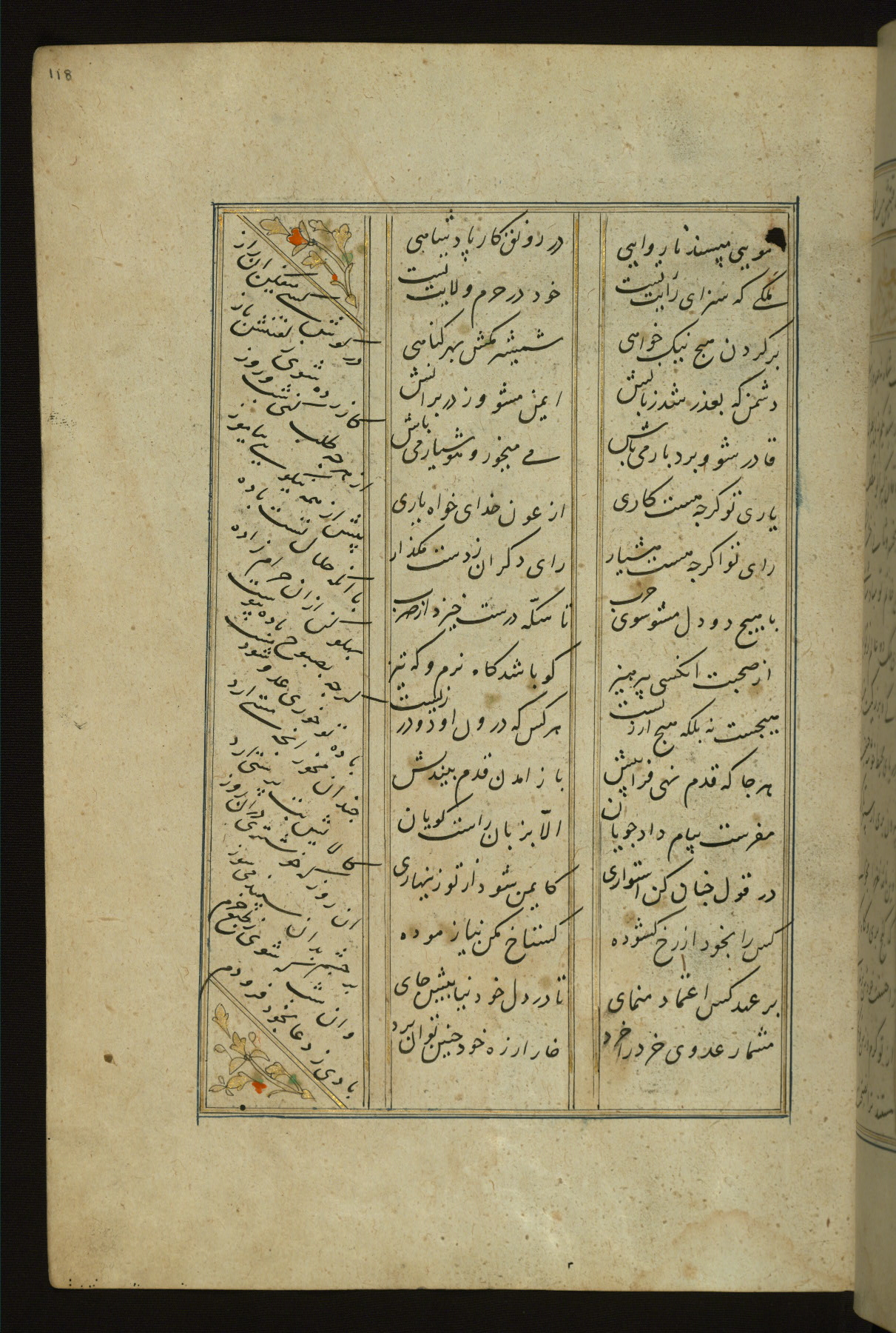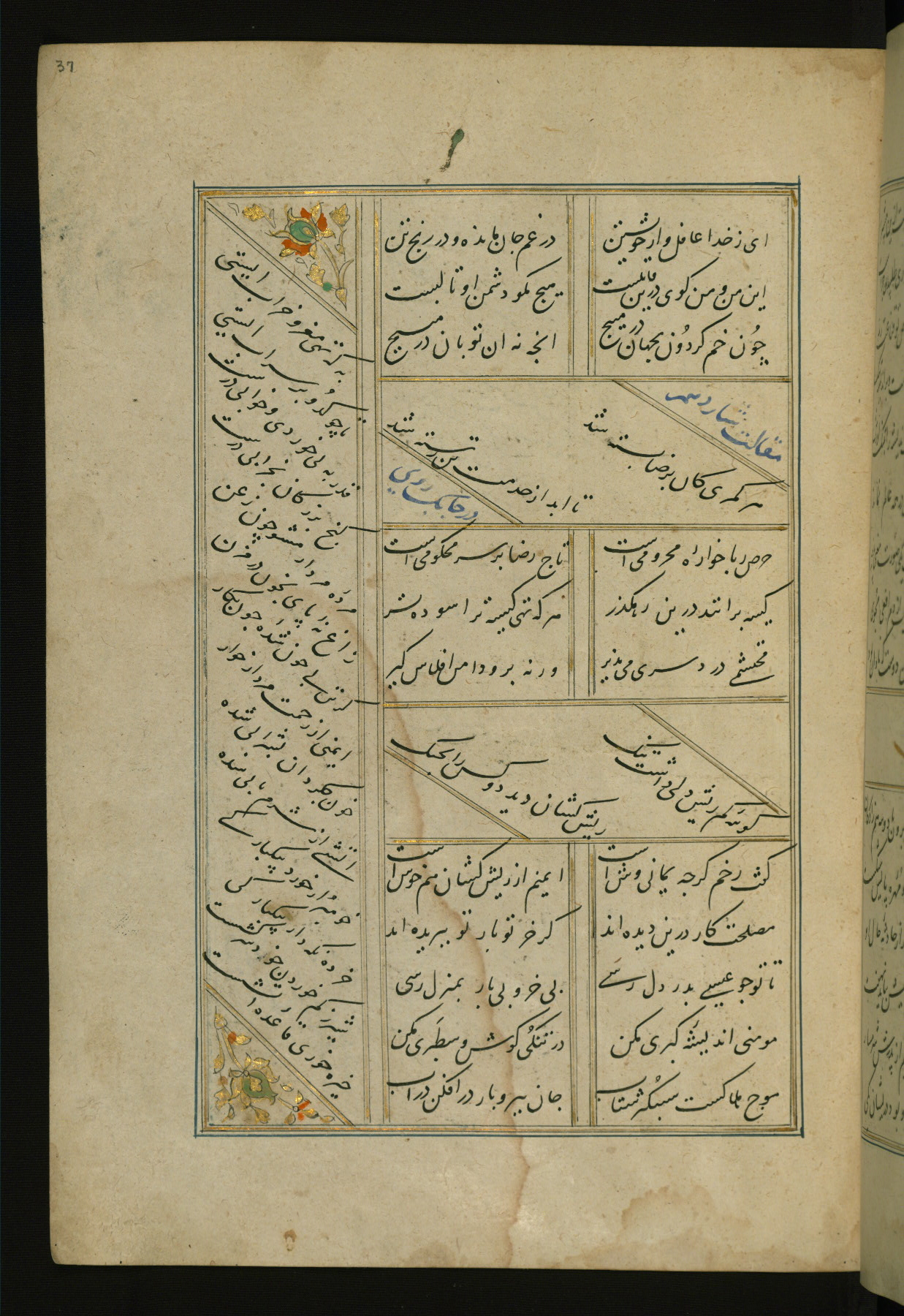 This copy of the Khamsah (quintet) of Niẓāmī Ganjavī (d. 605 AH / 1209 CE) was written by Abū Bakr Shāh ibn Ḥasan ibn ʿAlī al-Shahrastānī and illuminated by Jamāl al-Dīn ibn Muḥammad al-Ṣiddīqī al-Iṣfahānī between 892 AH / 1486 CE and 900 AH / 1494-5 CE. The manuscript opens with a double-page illuminated frontispiece with an inscription giving the title of the work and the name of the author (fols. 1b-2a). There are four illuminated titlepieces with the names of the individual poems and twenty-six repainted illustrations. According to evidence supplied by the colophons, the original binding was by the hand of Jamāl al-Dīn ibn Muḥammad al-Ṣiddīqī al-Iṣfahānī, as well. Unfortunately, it has not survived. The binding presently attached to the manuscript dates to the twelfth century AH / eighteenth CE.