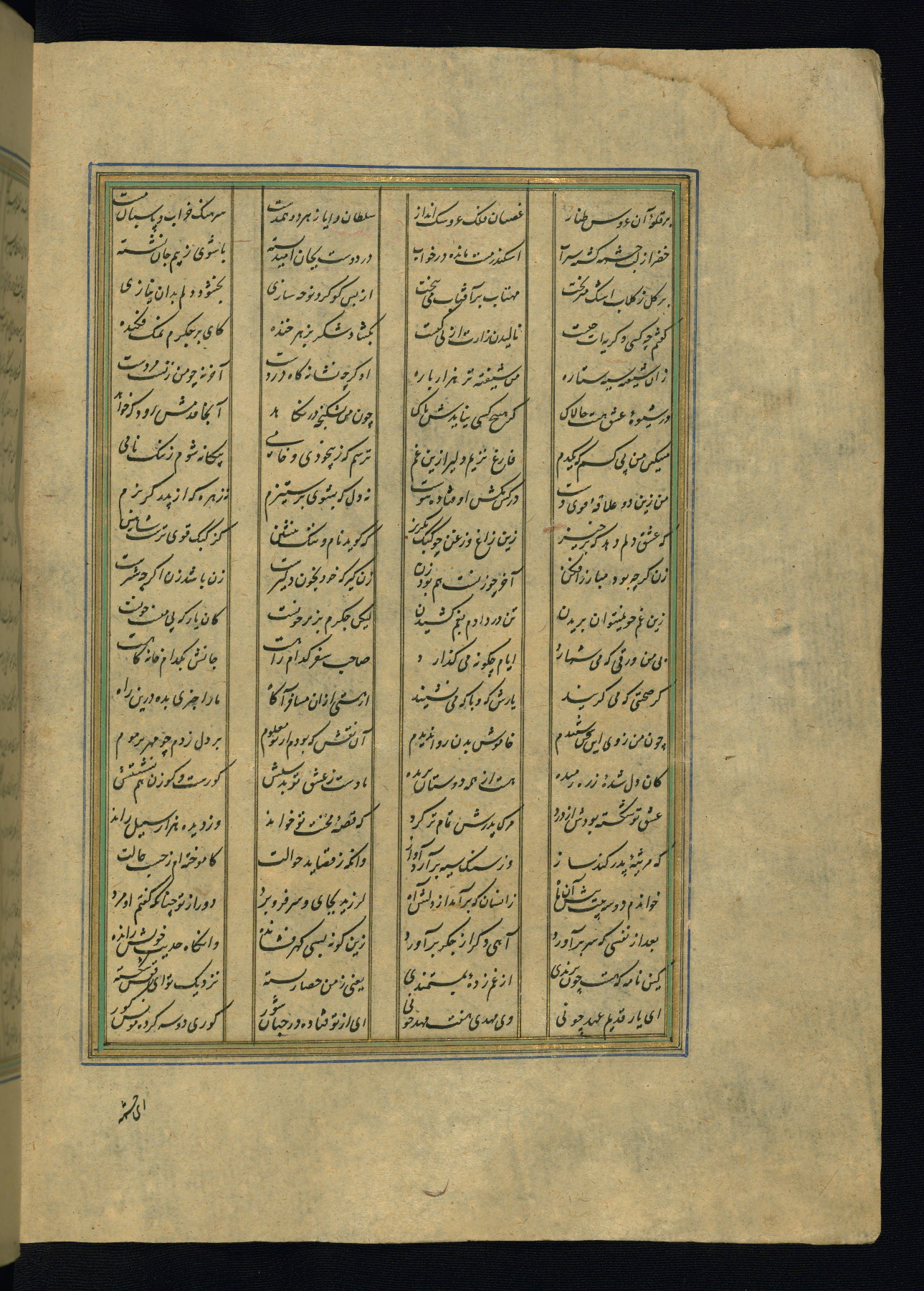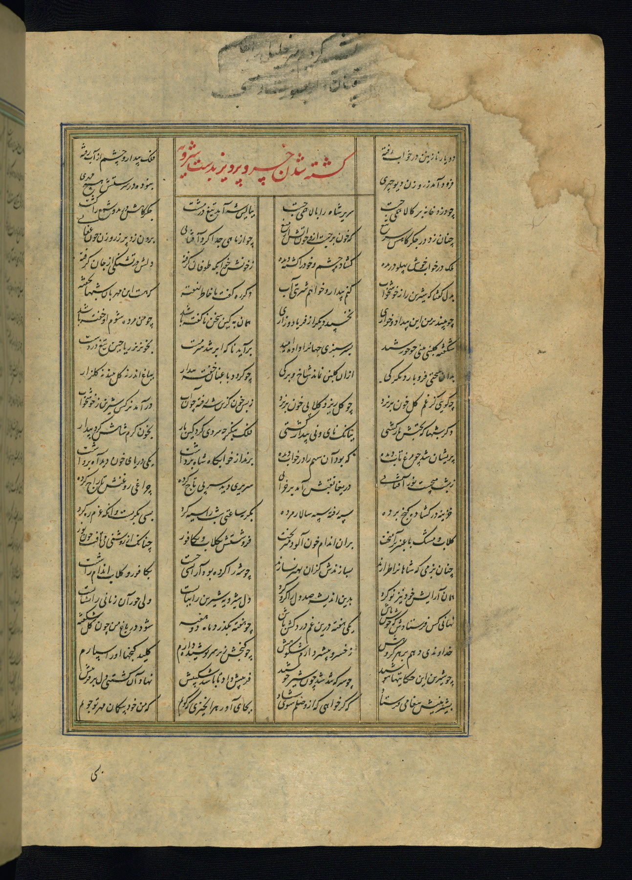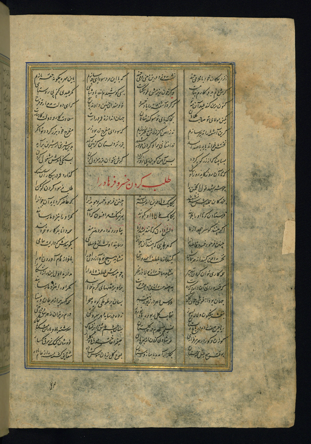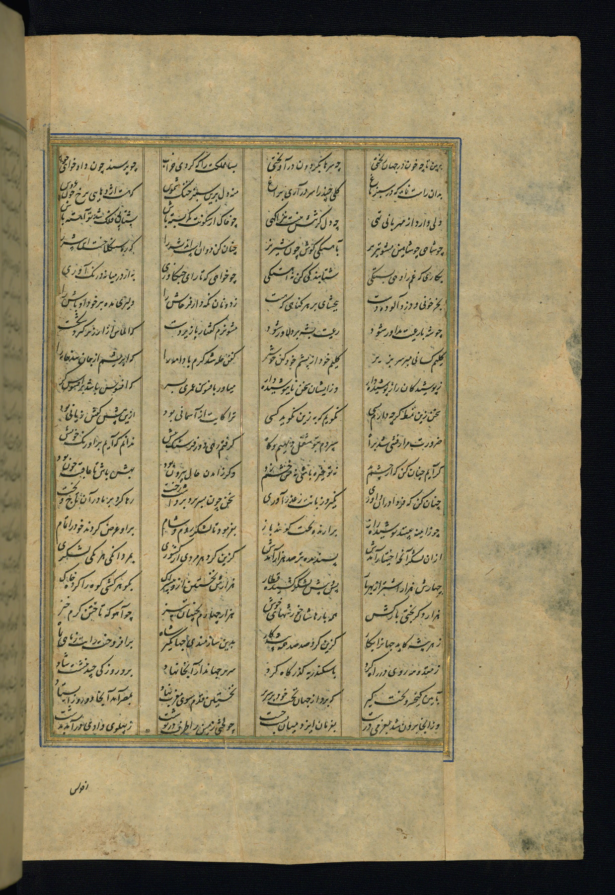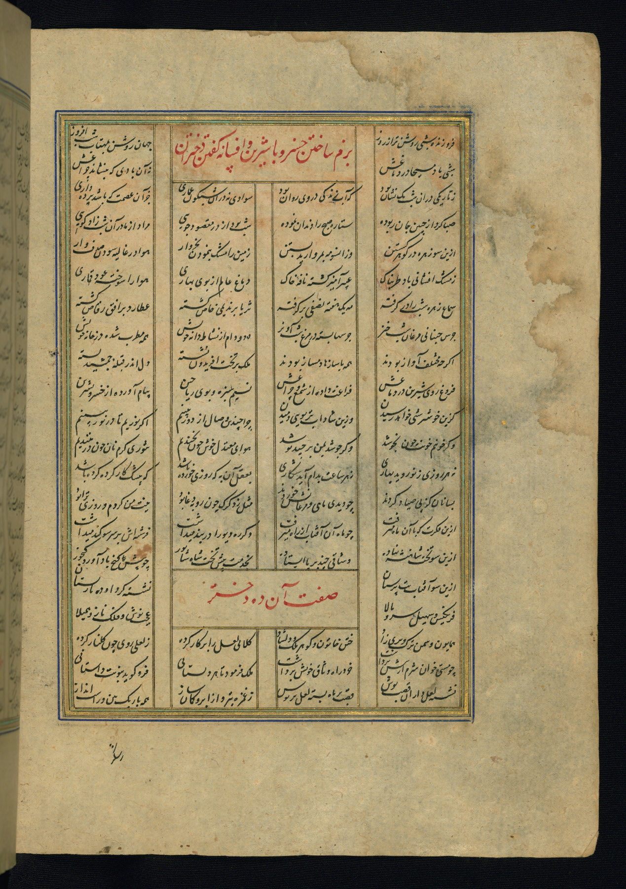 This is an illuminated and illustrated copy of the Khamsah (quintet) by Niẓāmī Ganjavī (d. 605 AH / 1209 CE), completed by Ḥabīb Allāh ibn ʿAlī ibn Ḥusām in Safavid Iran in Rabīʿ II 971 AH / 1563 CE. Illuminated titlepieces introduce the five poems, and there are thirty illustrations, the majority of which are attributable to thirteenth century AH / nineteenth CE Qajar Iran. Ownership notes and seals indicating the provenance of this manuscript are found throughout the codex (fols. 1a, 2a, 153a, 177a, 233a, 349a, and 351a). The binding is not original to the manuscript.