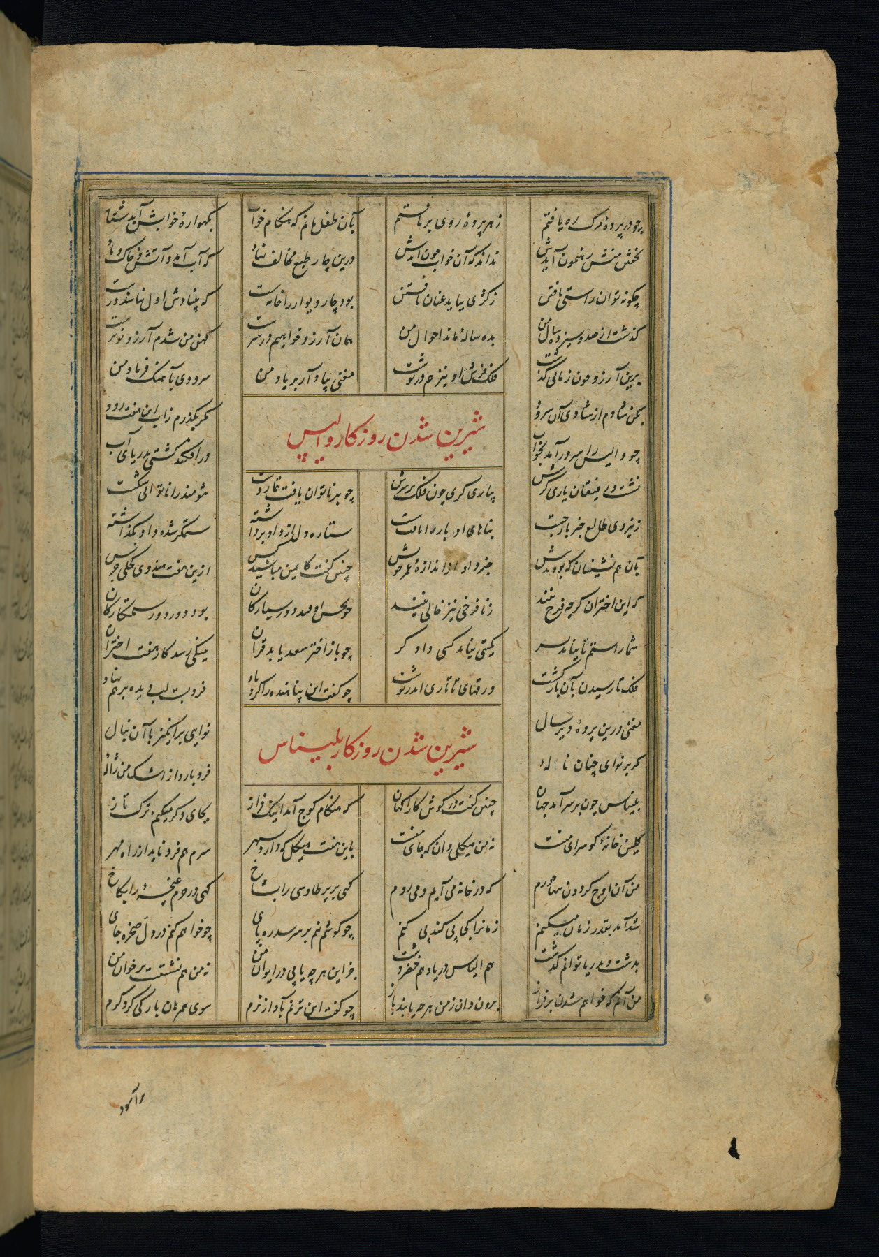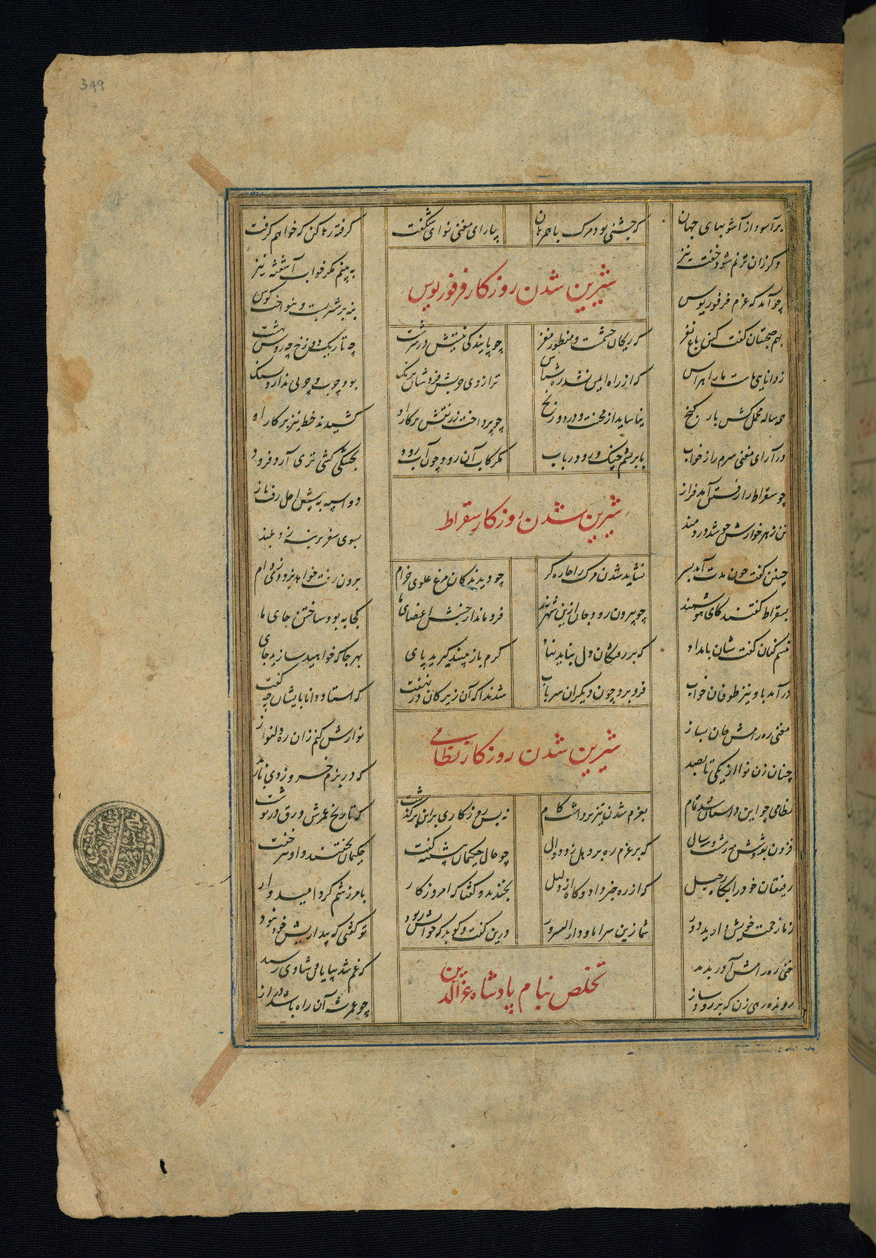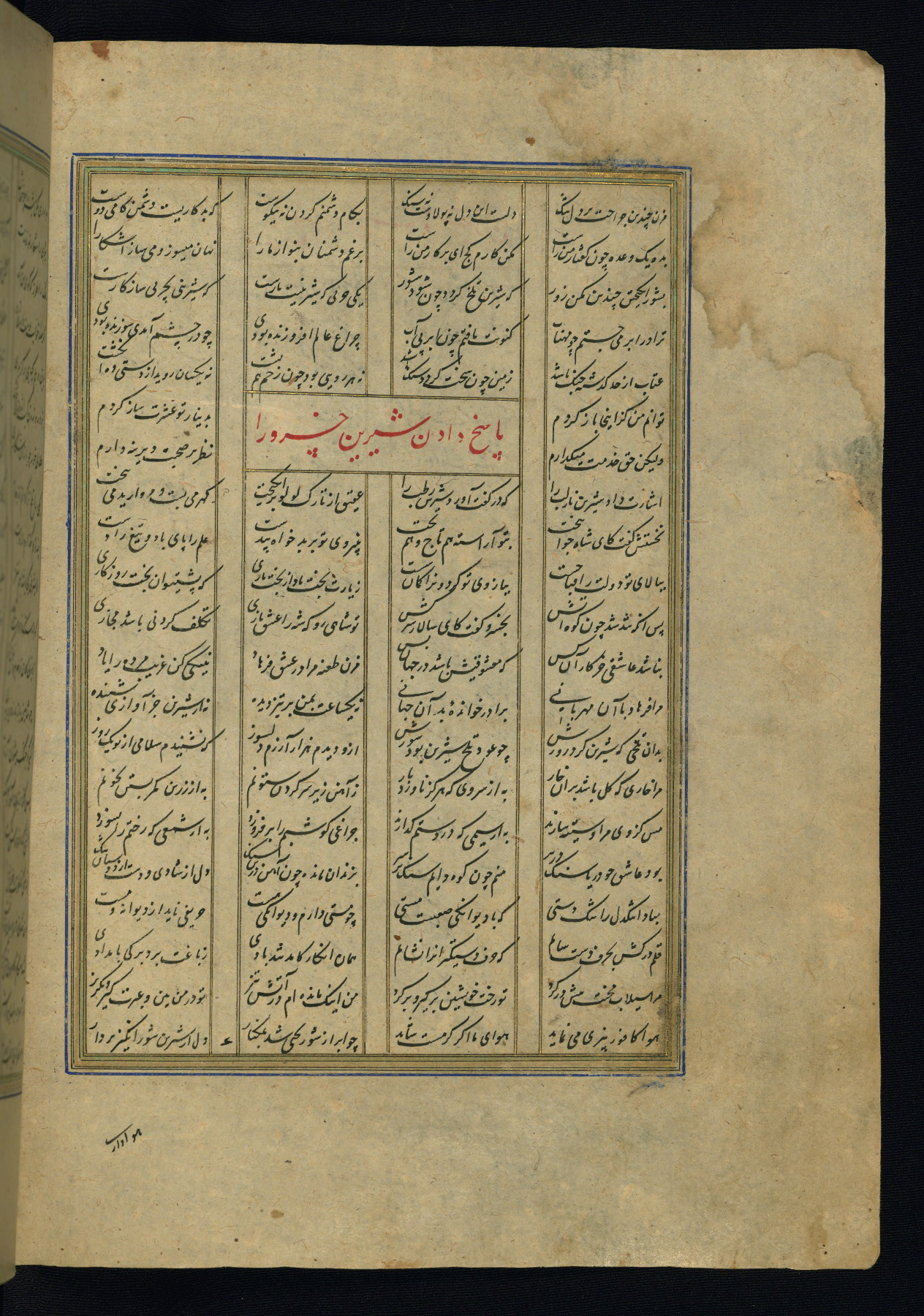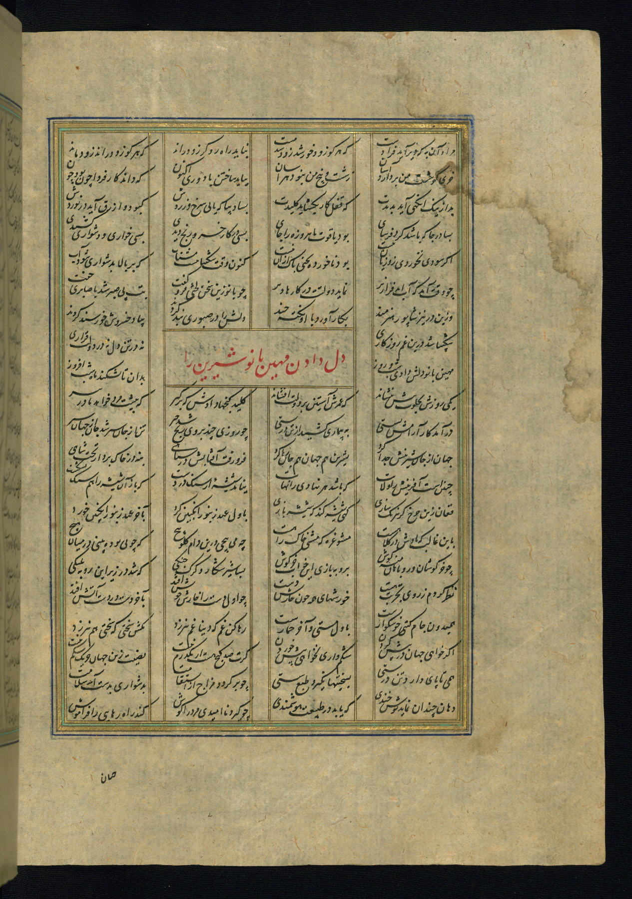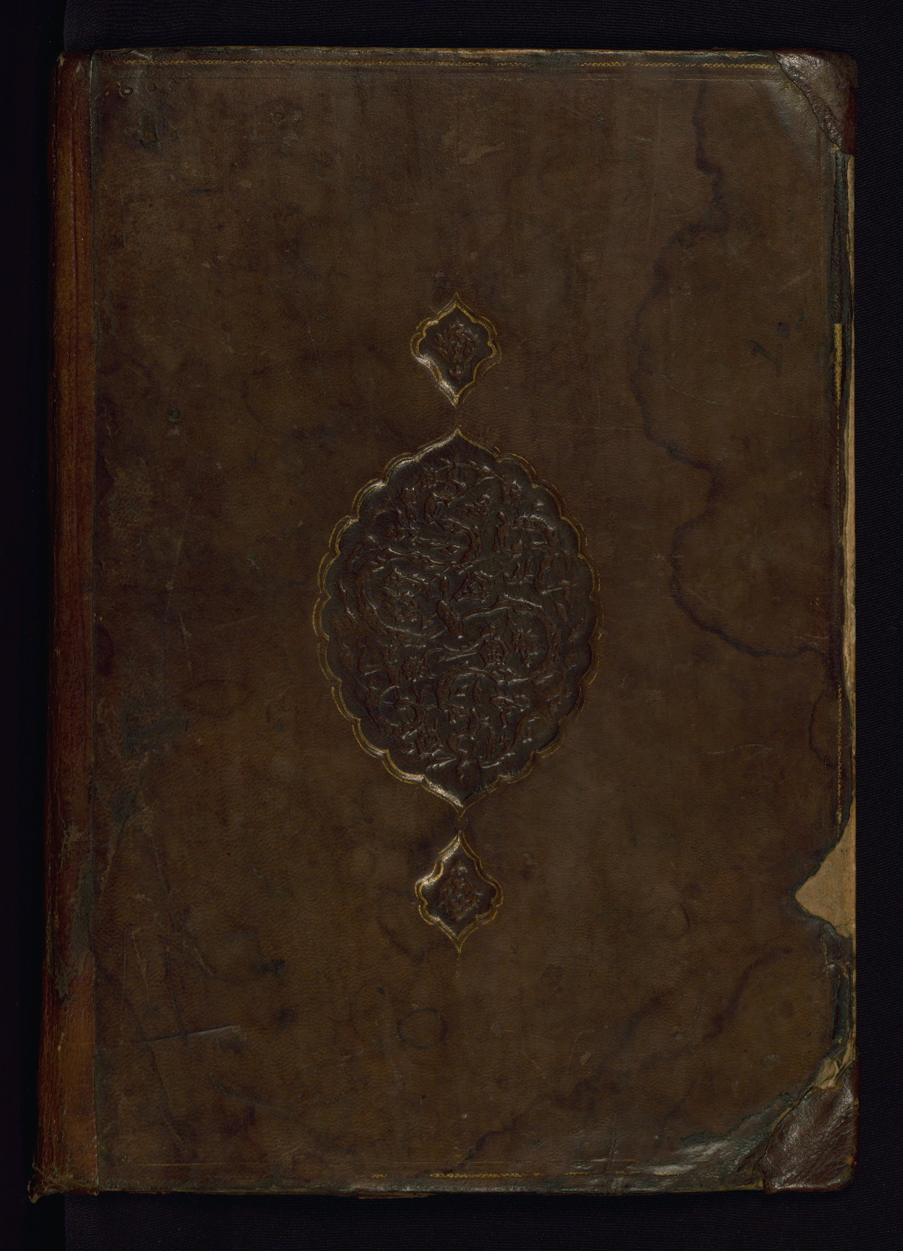 This is an illuminated and illustrated copy of the Khamsah (quintet) by Niẓāmī Ganjavī (d. 605 AH / 1209 CE), completed by Ḥabīb Allāh ibn ʿAlī ibn Ḥusām in Safavid Iran in Rabīʿ II 971 AH / 1563 CE. Illuminated titlepieces introduce the five poems, and there are thirty illustrations, the majority of which are attributable to thirteenth century AH / nineteenth CE Qajar Iran. Ownership notes and seals indicating the provenance of this manuscript are found throughout the codex (fols. 1a, 2a, 153a, 177a, 233a, 349a, and 351a). The binding is not original to the manuscript.
