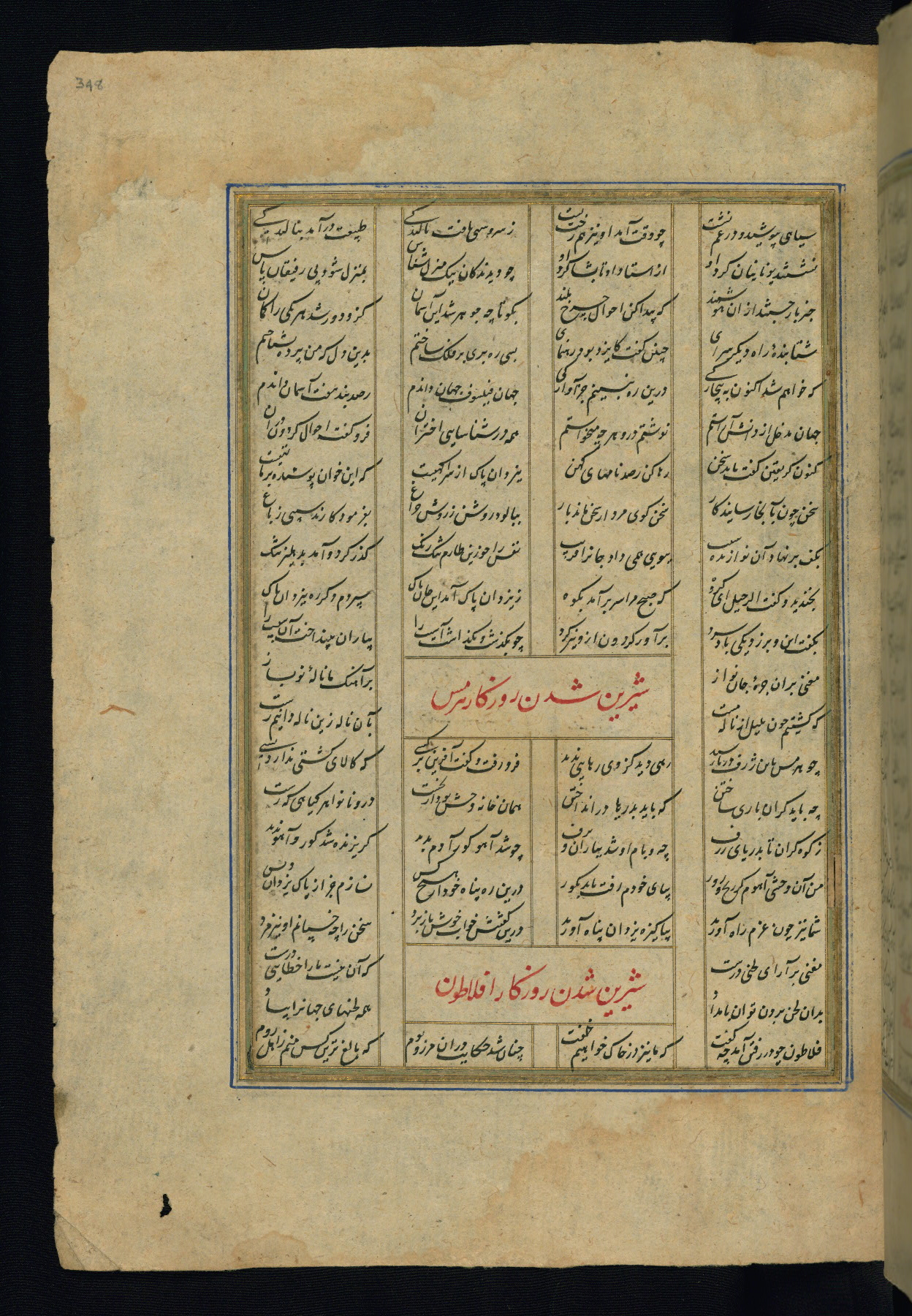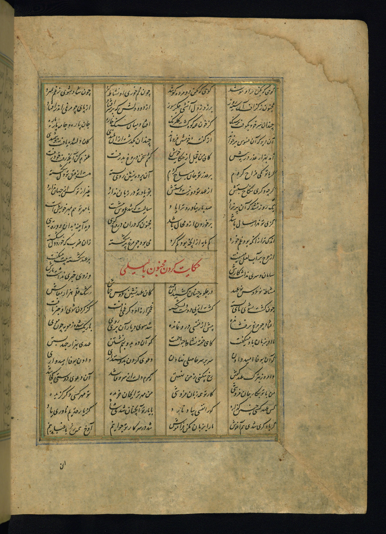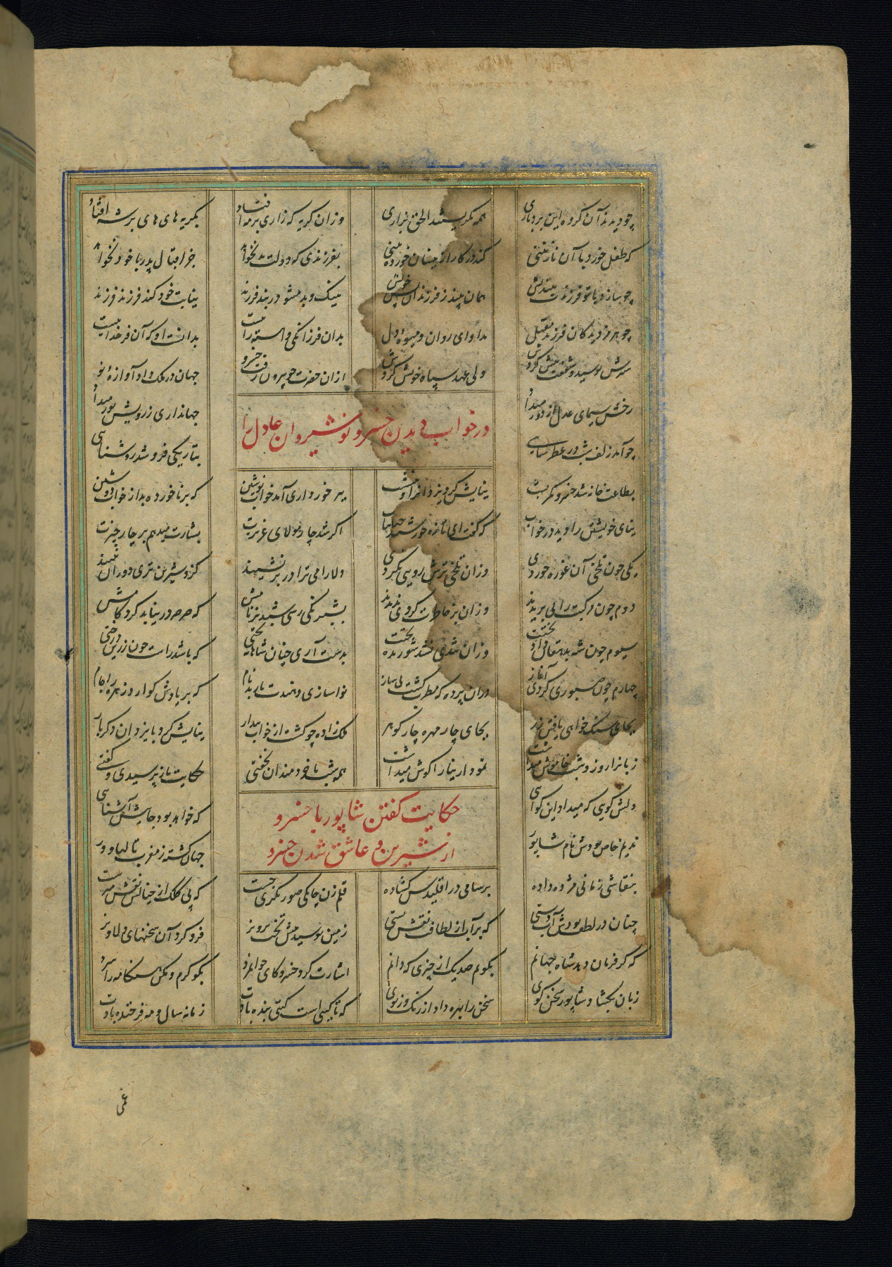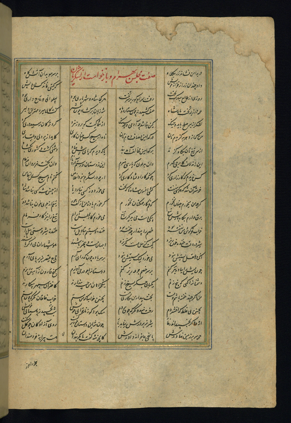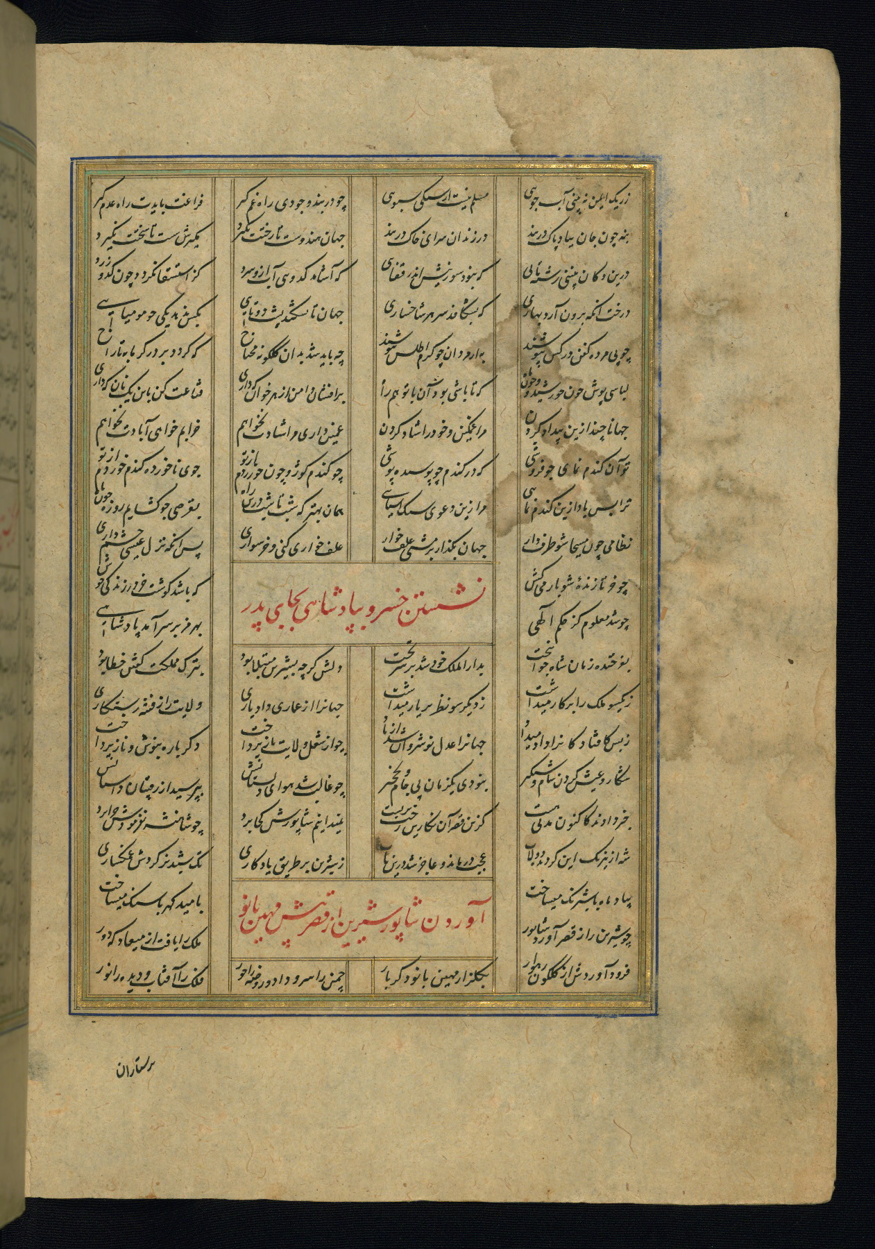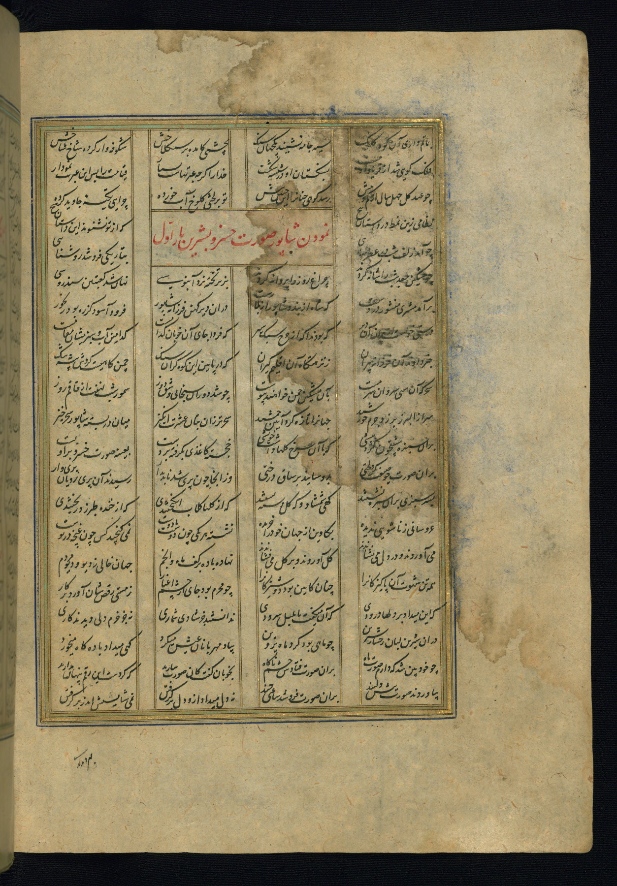 This is an illuminated and illustrated copy of the Khamsah (quintet) by Niẓāmī Ganjavī (d. 605 AH / 1209 CE), completed by Ḥabīb Allāh ibn ʿAlī ibn Ḥusām in Safavid Iran in Rabīʿ II 971 AH / 1563 CE. Illuminated titlepieces introduce the five poems, and there are thirty illustrations, the majority of which are attributable to thirteenth century AH / nineteenth CE Qajar Iran. Ownership notes and seals indicating the provenance of this manuscript are found throughout the codex (fols. 1a, 2a, 153a, 177a, 233a, 349a, and 351a). The binding is not original to the manuscript.