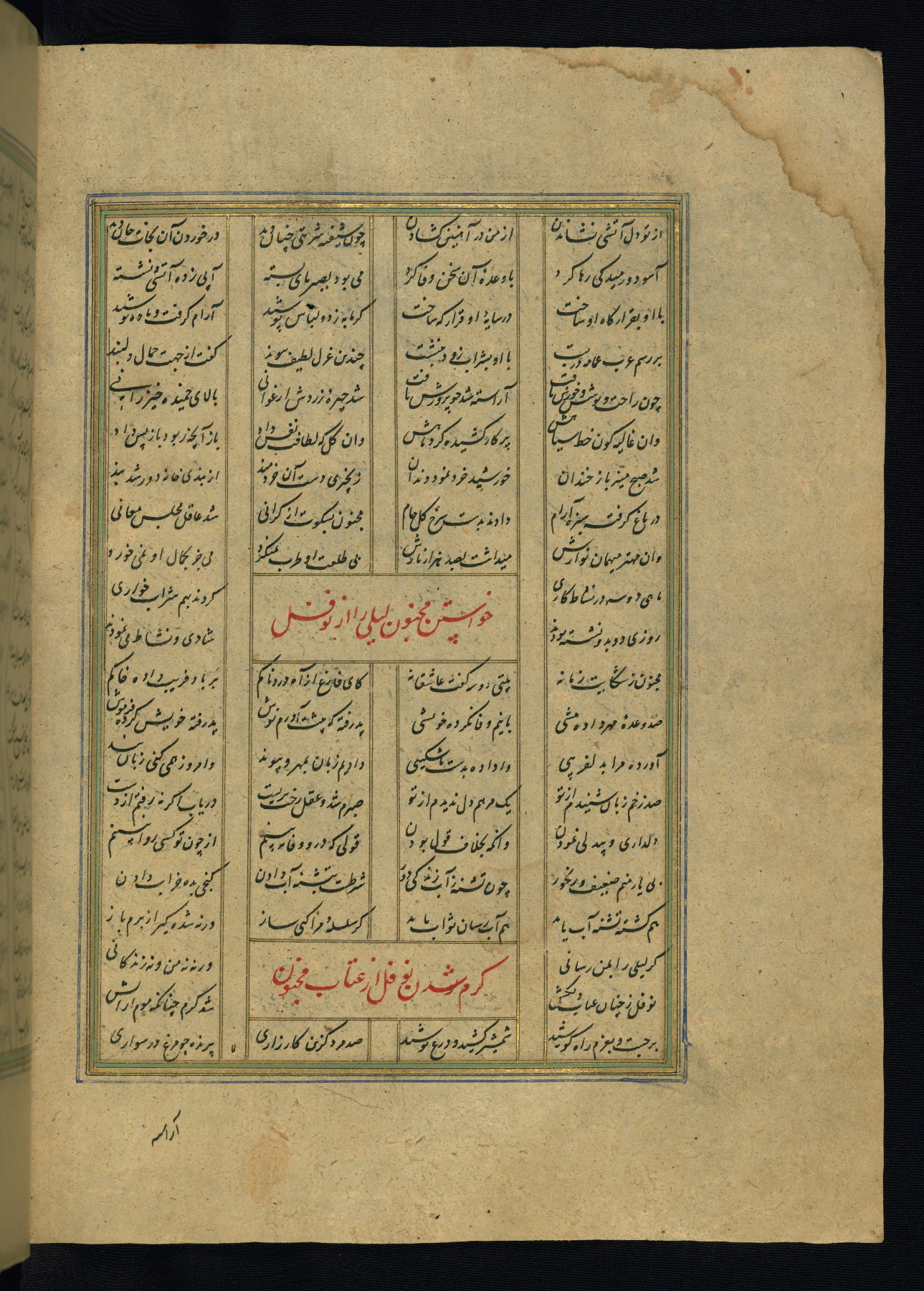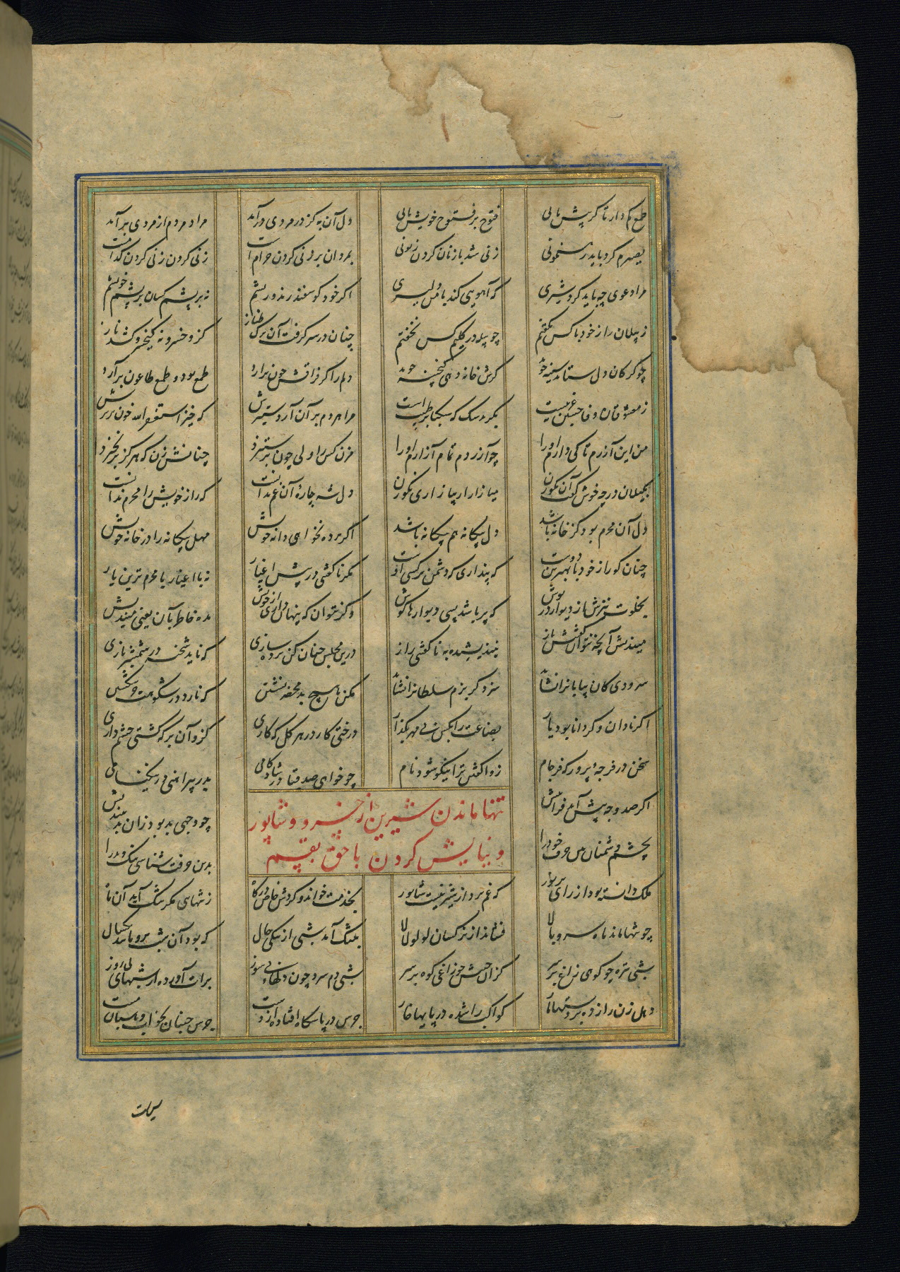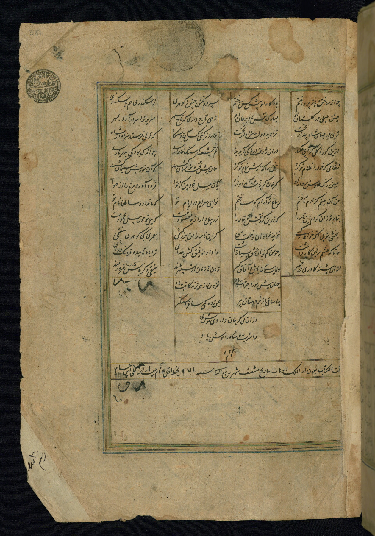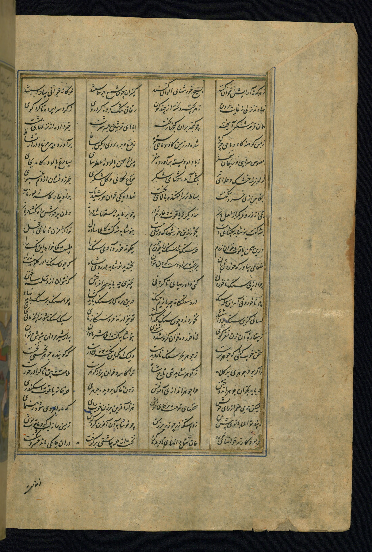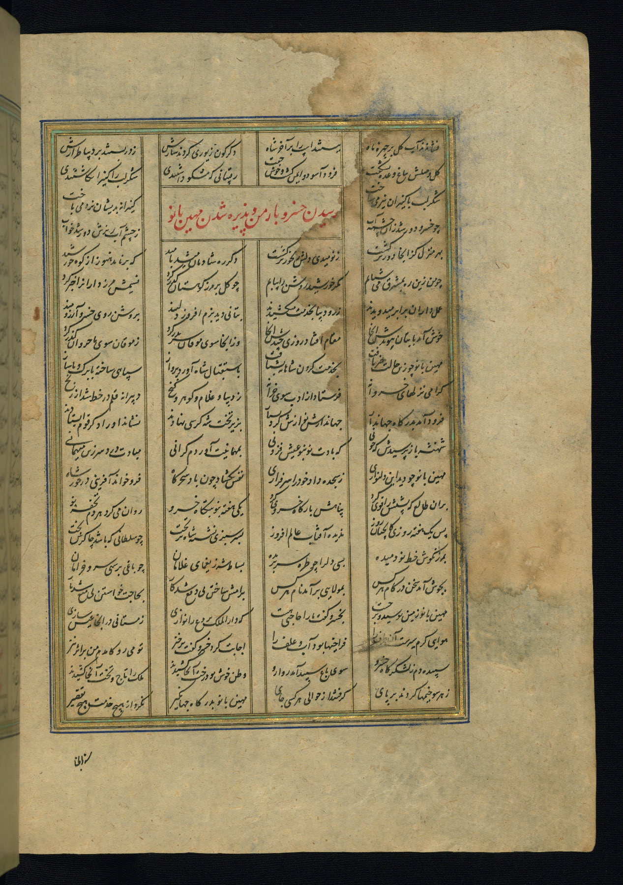This is an illuminated and illustrated copy of the Khamsah (quintet) by Niẓāmī Ganjavī (d. 605 AH / 1209 CE), completed by Ḥabīb Allāh ibn ʿAlī ibn Ḥusām in Safavid Iran in Rabīʿ II 971 AH / 1563 CE. Illuminated titlepieces introduce the five poems, and there are thirty illustrations, the majority of which are attributable to thirteenth century AH / nineteenth CE Qajar Iran. Ownership notes and seals indicating the provenance of this manuscript are found throughout the codex (fols. 1a, 2a, 153a, 177a, 233a, 349a, and 351a). The binding is not original to the manuscript.