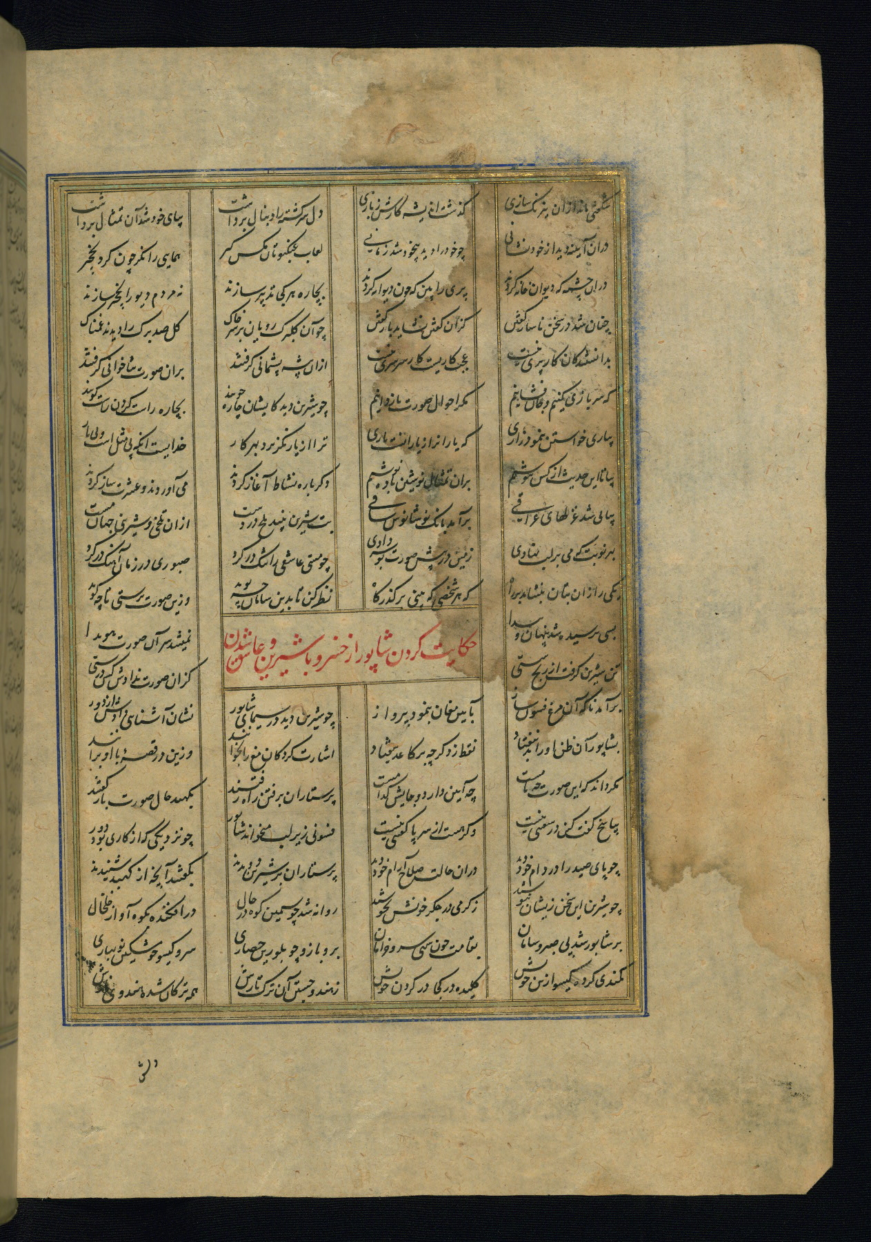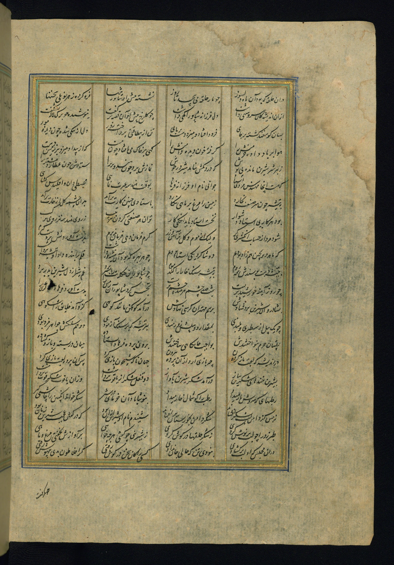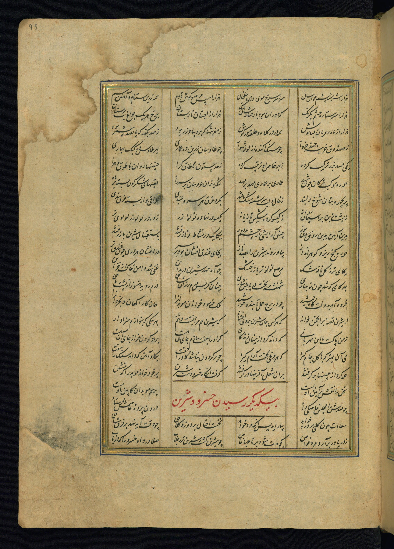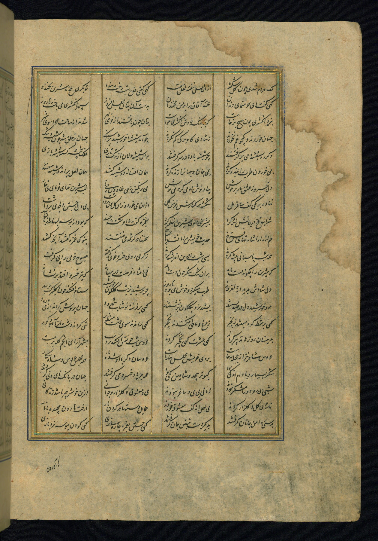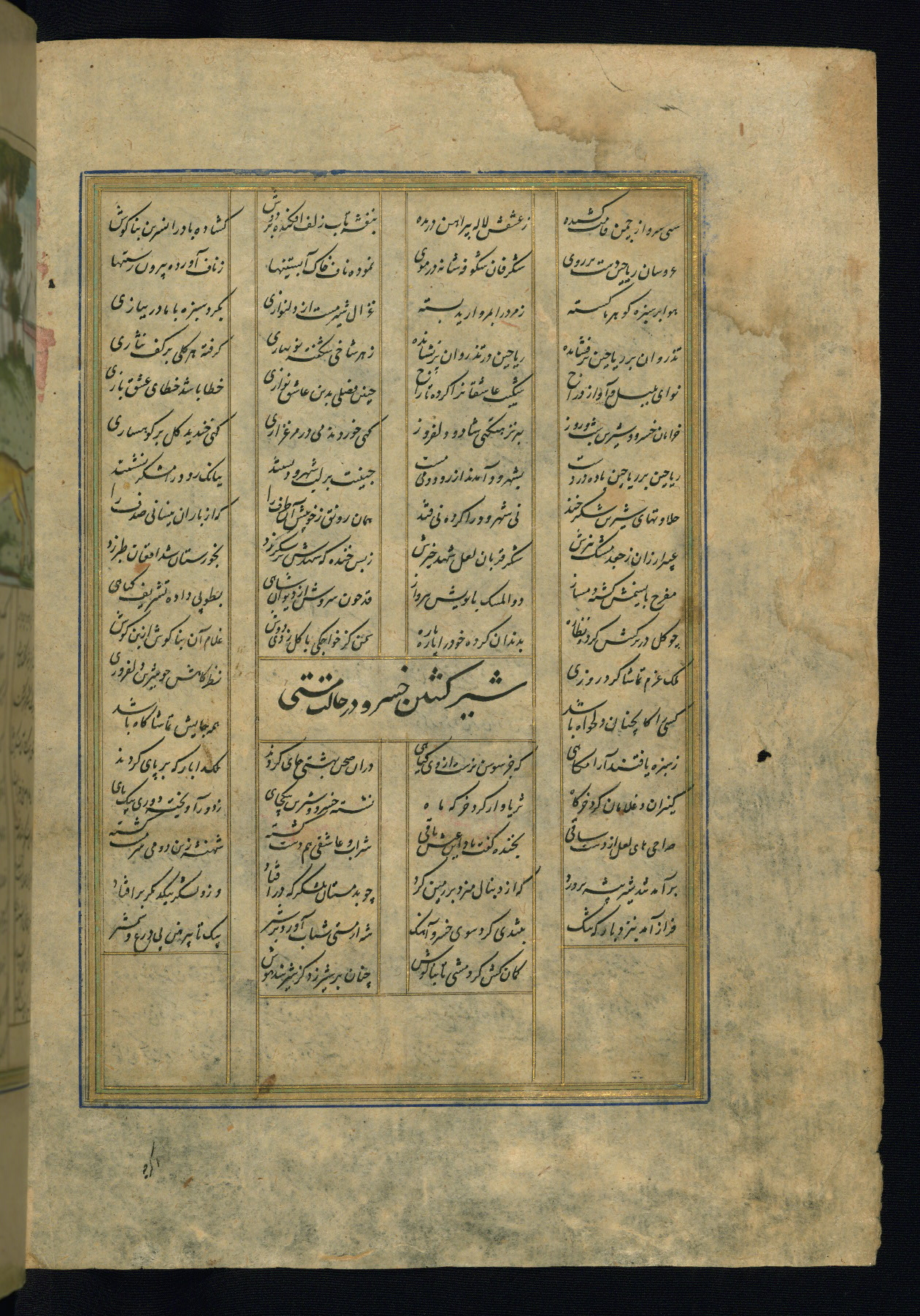 This is an illuminated and illustrated copy of the Khamsah (quintet) by Niẓāmī Ganjavī (d. 605 AH / 1209 CE), completed by Ḥabīb Allāh ibn ʿAlī ibn Ḥusām in Safavid Iran in Rabīʿ II 971 AH / 1563 CE. Illuminated titlepieces introduce the five poems, and there are thirty illustrations, the majority of which are attributable to thirteenth century AH / nineteenth CE Qajar Iran. Ownership notes and seals indicating the provenance of this manuscript are found throughout the codex (fols. 1a, 2a, 153a, 177a, 233a, 349a, and 351a). The binding is not original to the manuscript.