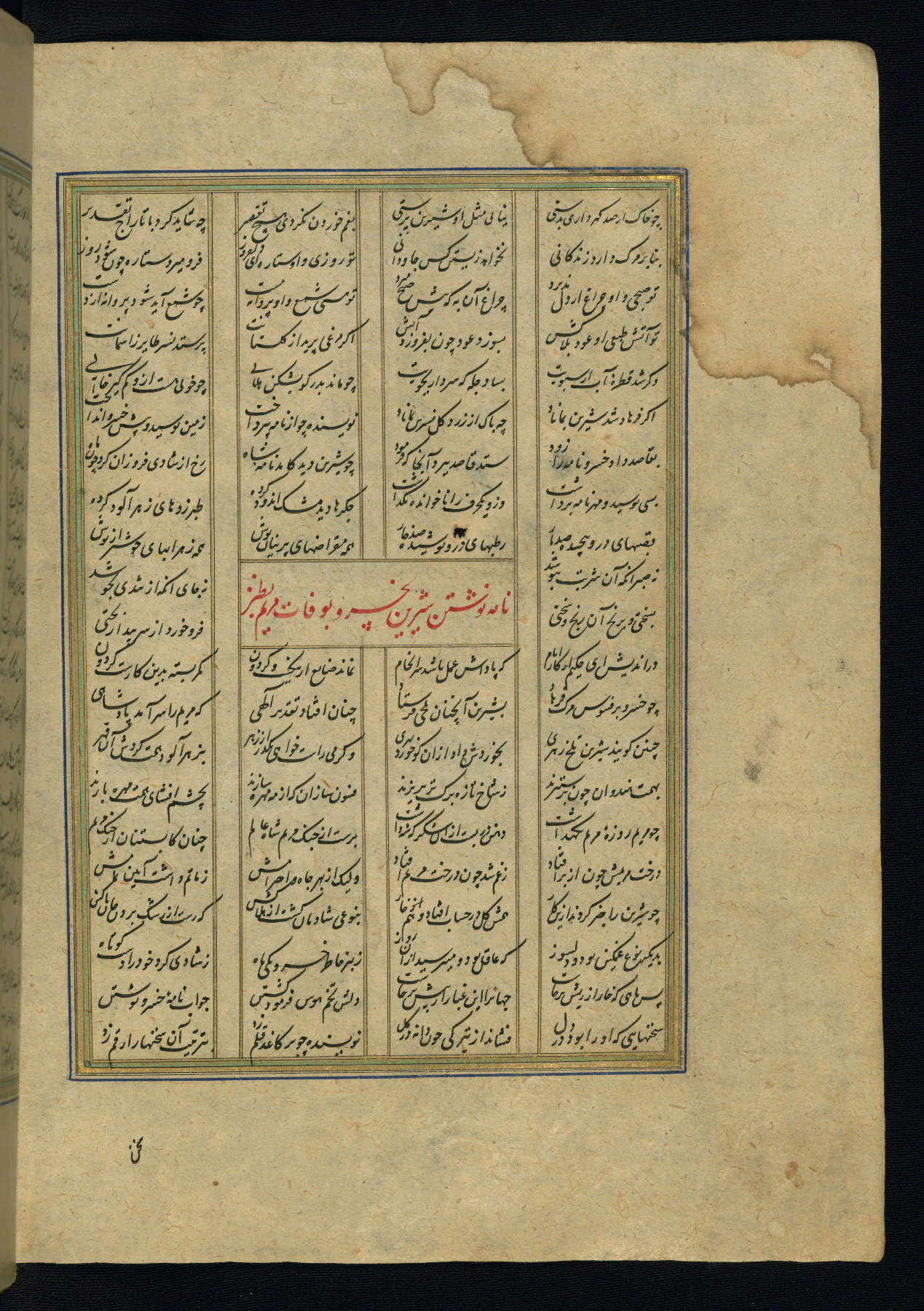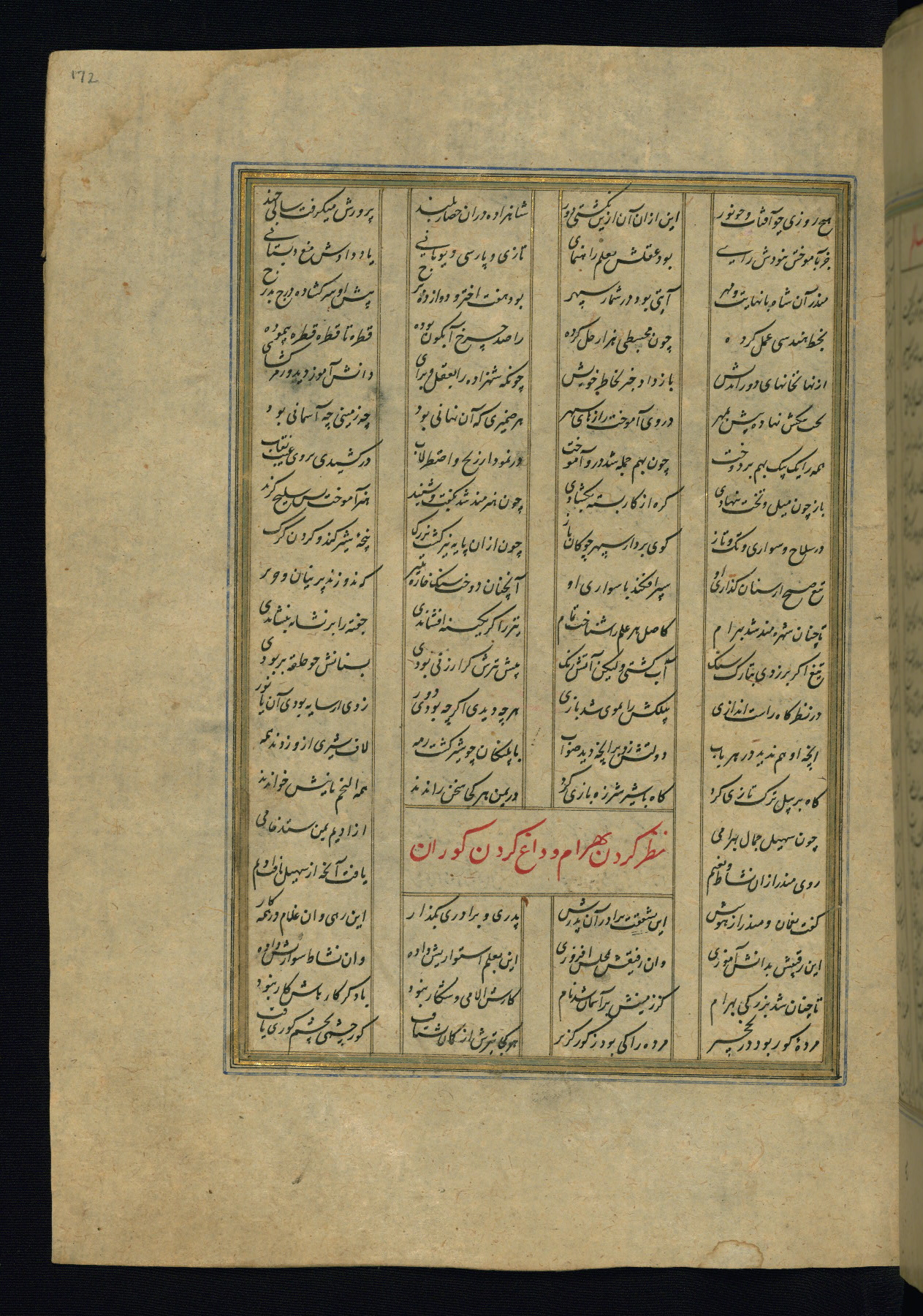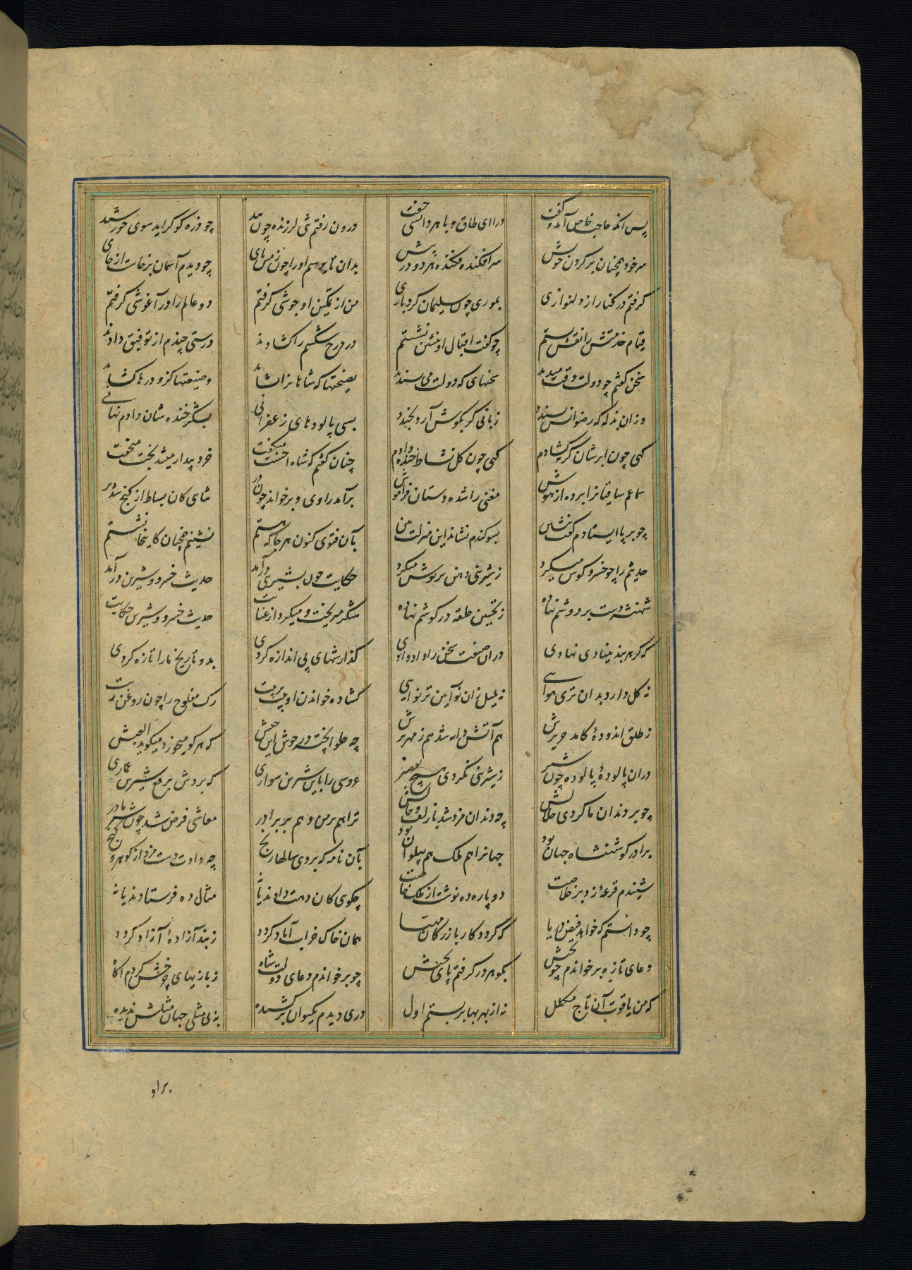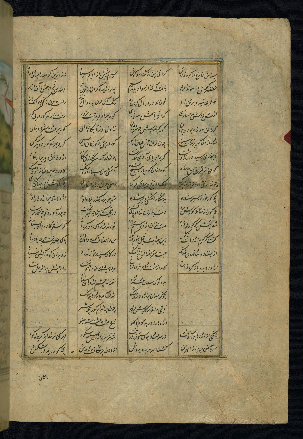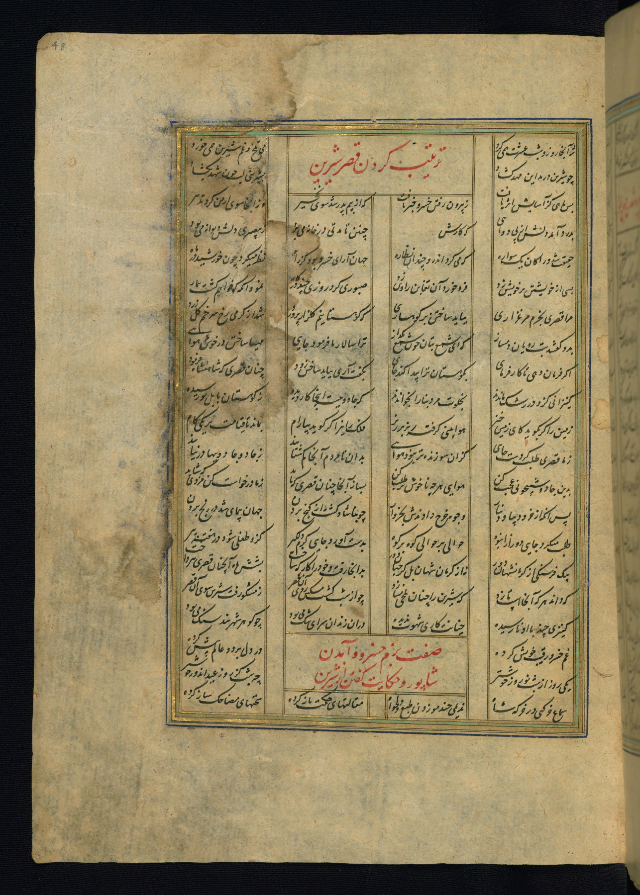 This is an illuminated and illustrated copy of the Khamsah (quintet) by Niẓāmī Ganjavī (d. 605 AH / 1209 CE), completed by Ḥabīb Allāh ibn ʿAlī ibn Ḥusām in Safavid Iran in Rabīʿ II 971 AH / 1563 CE. Illuminated titlepieces introduce the five poems, and there are thirty illustrations, the majority of which are attributable to thirteenth century AH / nineteenth CE Qajar Iran. Ownership notes and seals indicating the provenance of this manuscript are found throughout the codex (fols. 1a, 2a, 153a, 177a, 233a, 349a, and 351a). The binding is not original to the manuscript.