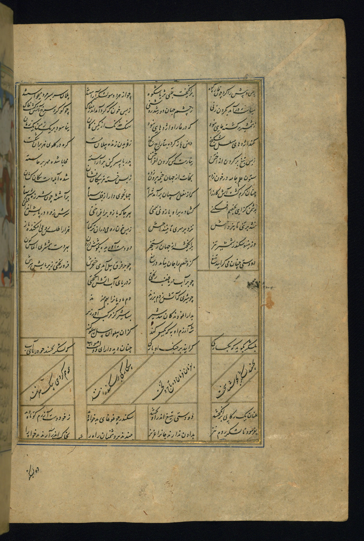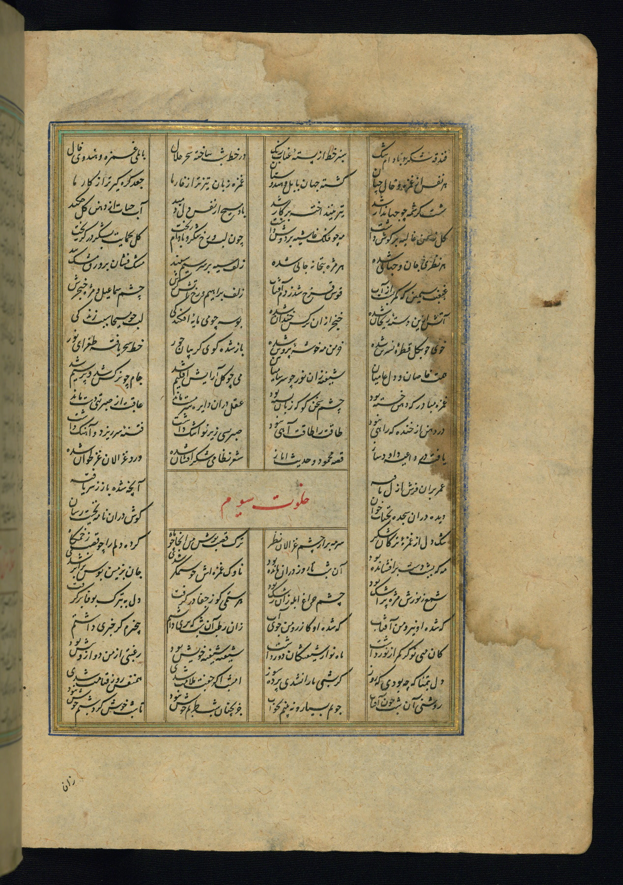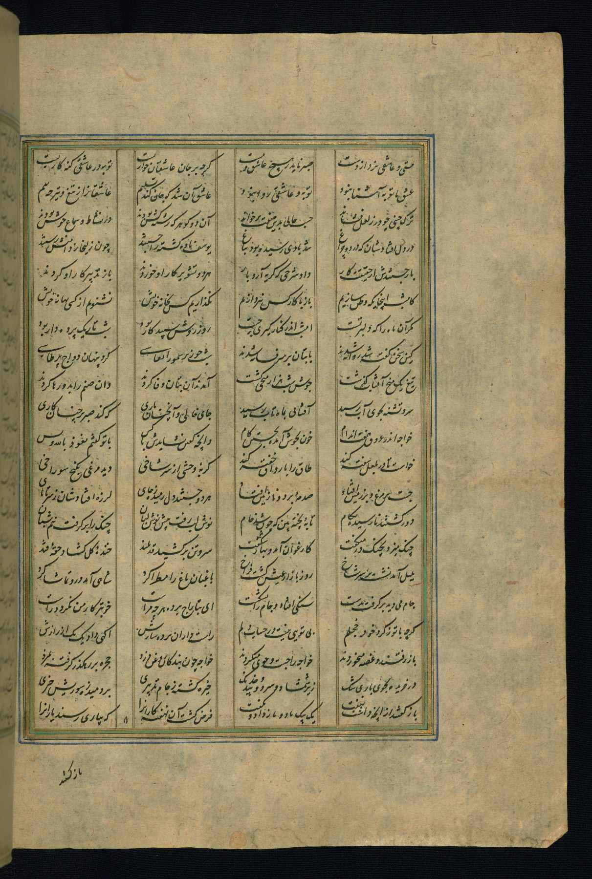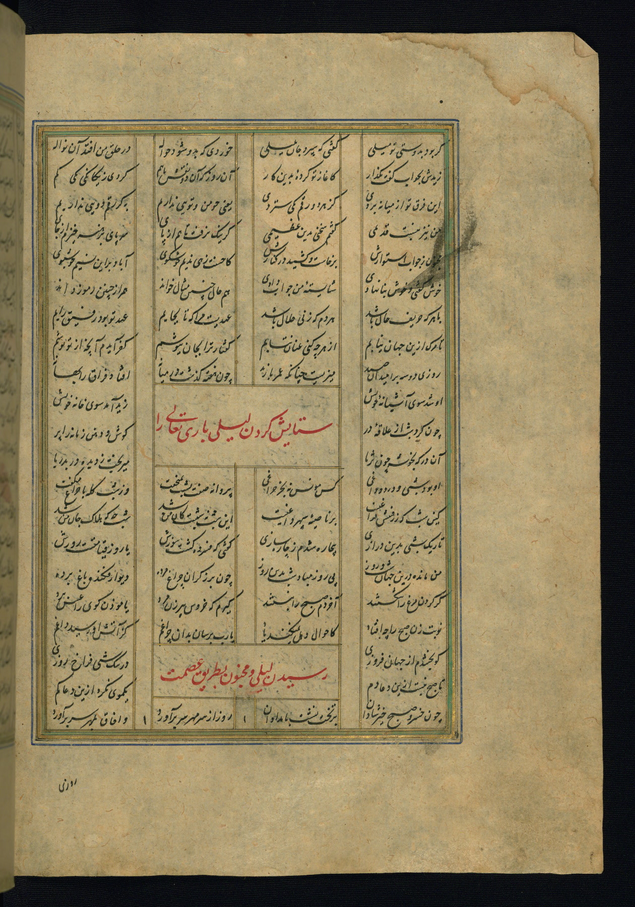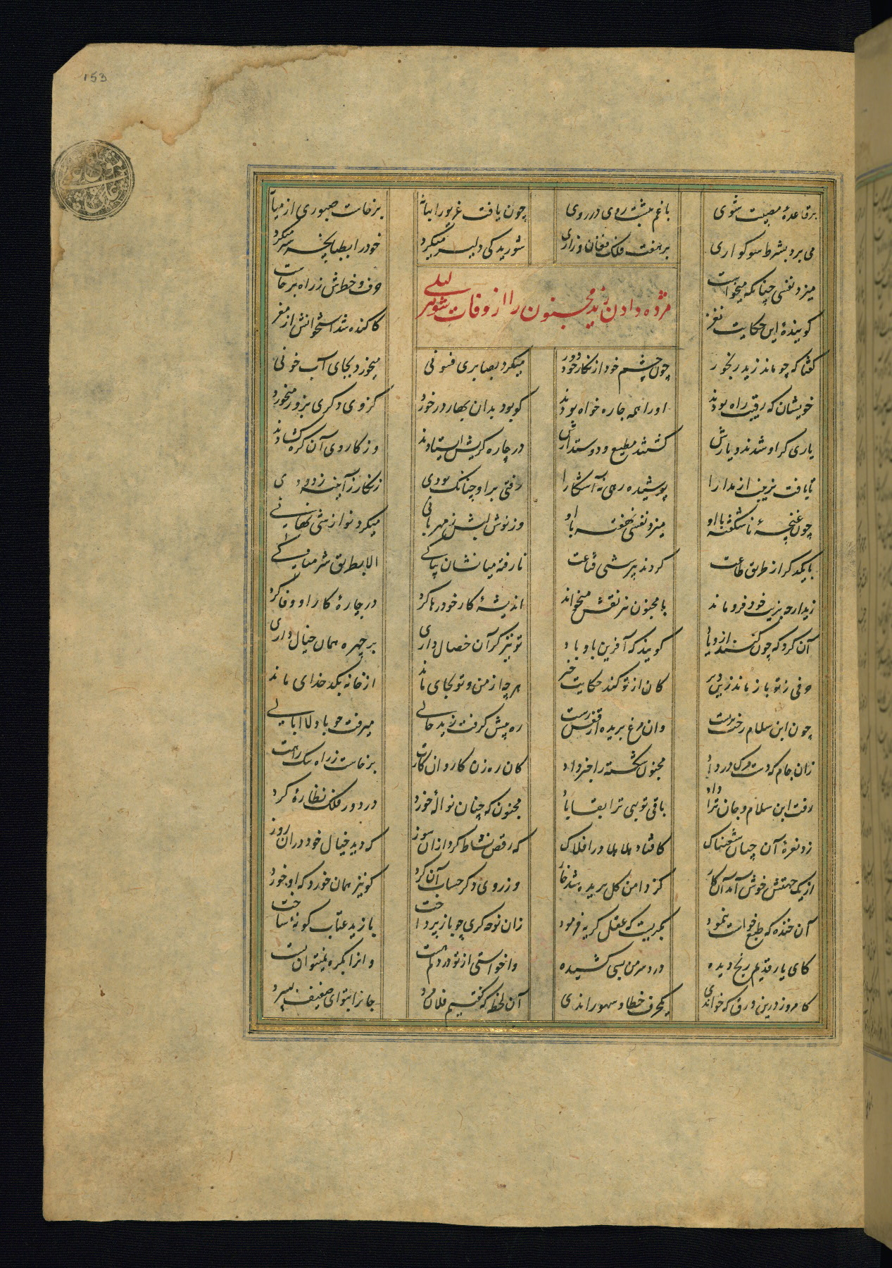 This is an illuminated and illustrated copy of the Khamsah (quintet) by Niẓāmī Ganjavī (d. 605 AH / 1209 CE), completed by Ḥabīb Allāh ibn ʿAlī ibn Ḥusām in Safavid Iran in Rabīʿ II 971 AH / 1563 CE. Illuminated titlepieces introduce the five poems, and there are thirty illustrations, the majority of which are attributable to thirteenth century AH / nineteenth CE Qajar Iran. Ownership notes and seals indicating the provenance of this manuscript are found throughout the codex (fols. 1a, 2a, 153a, 177a, 233a, 349a, and 351a). The binding is not original to the manuscript.