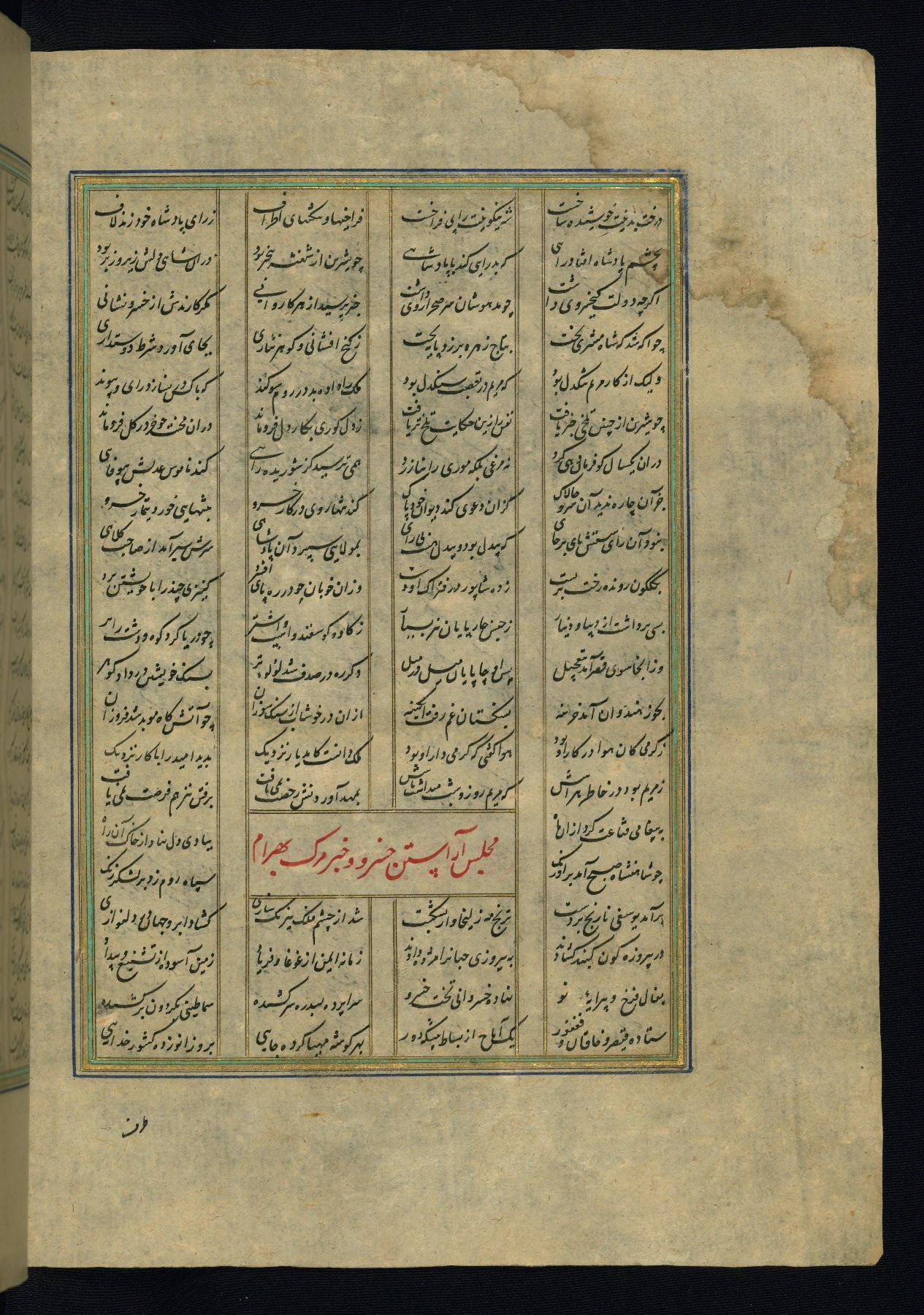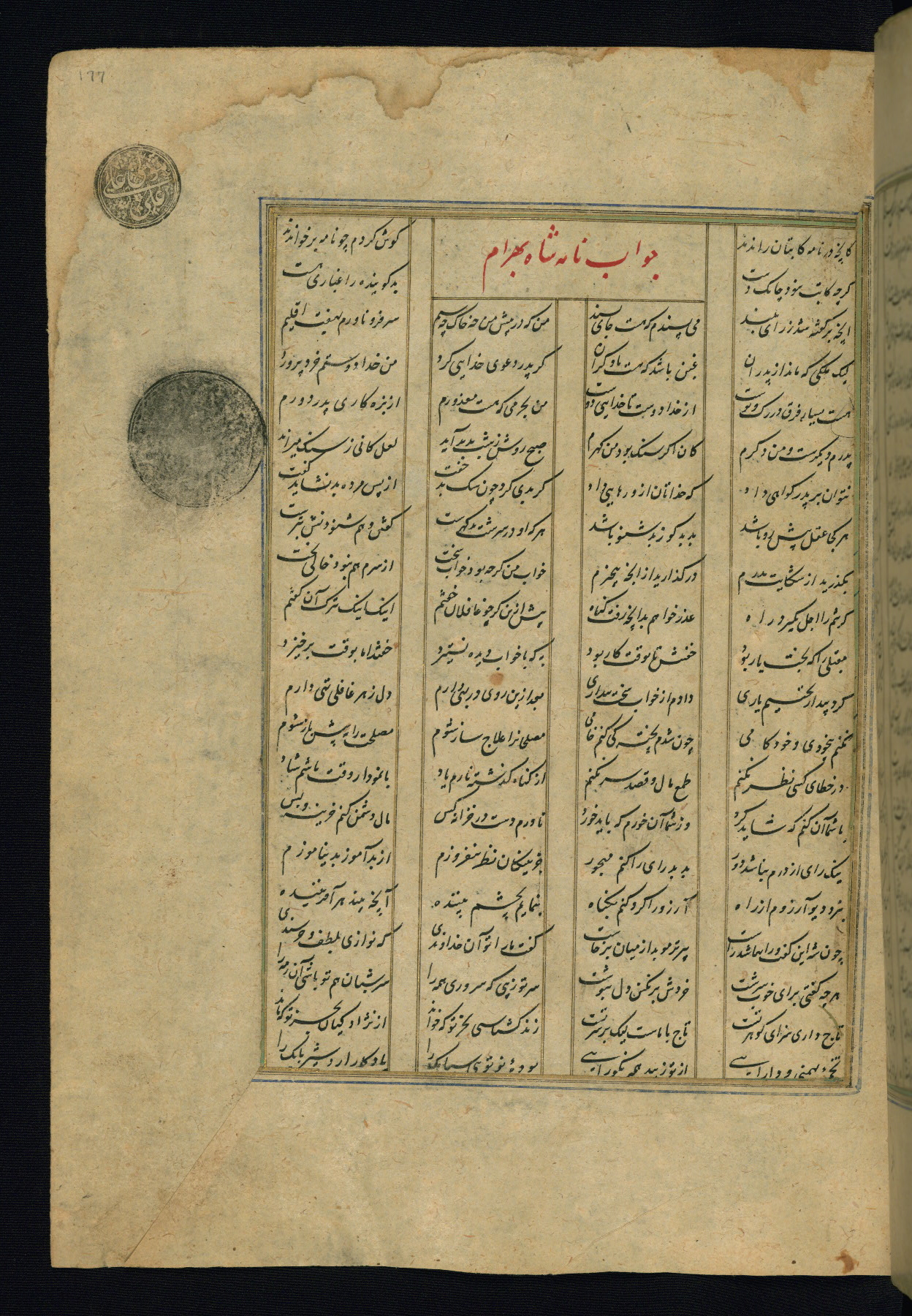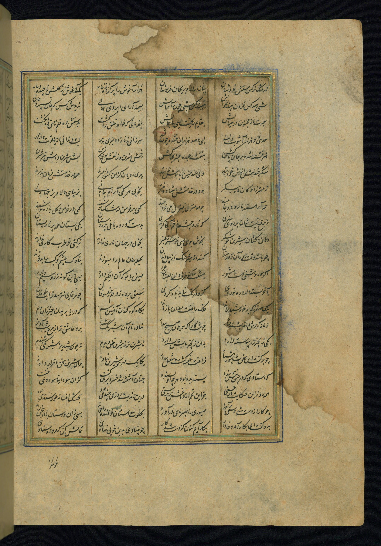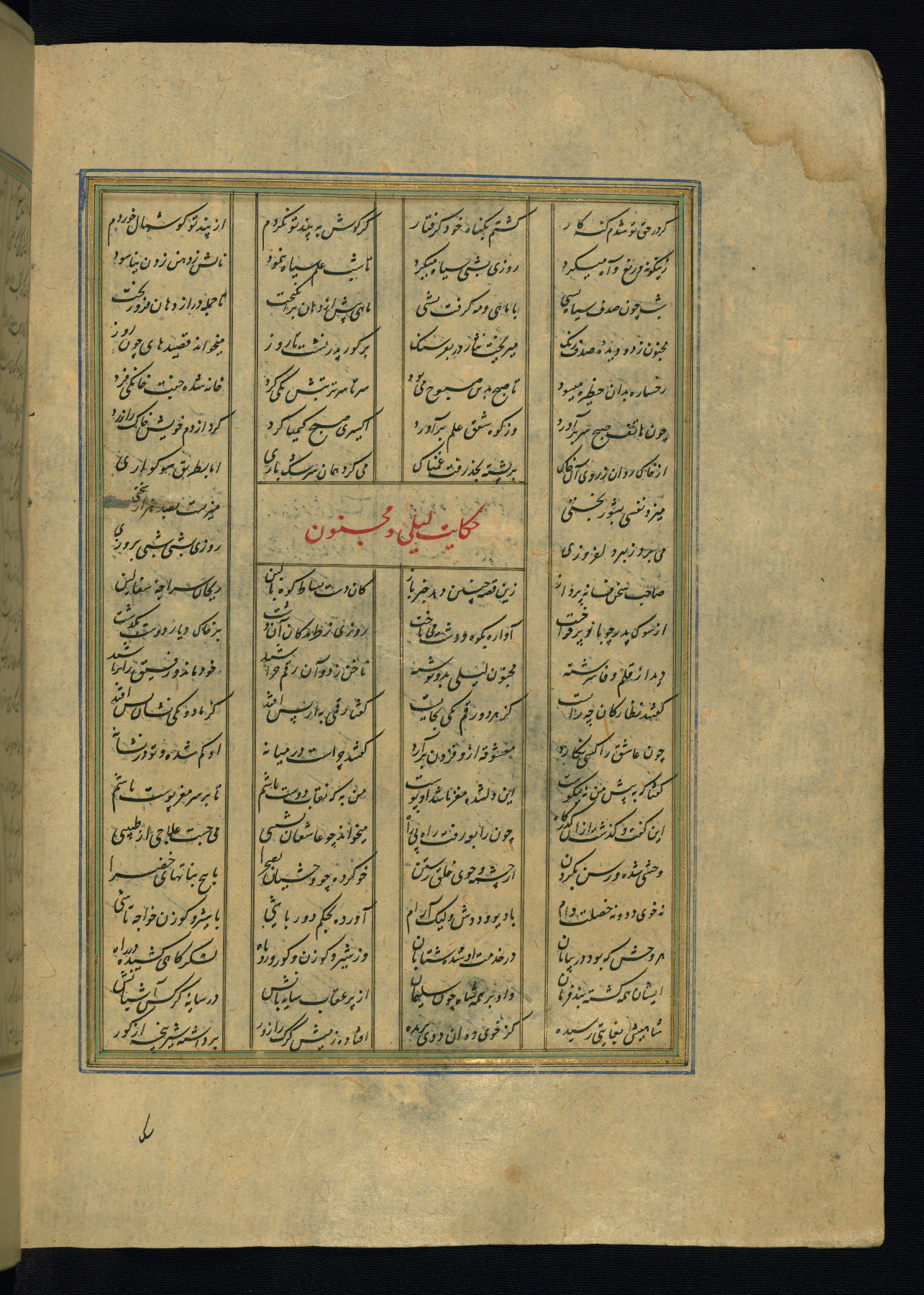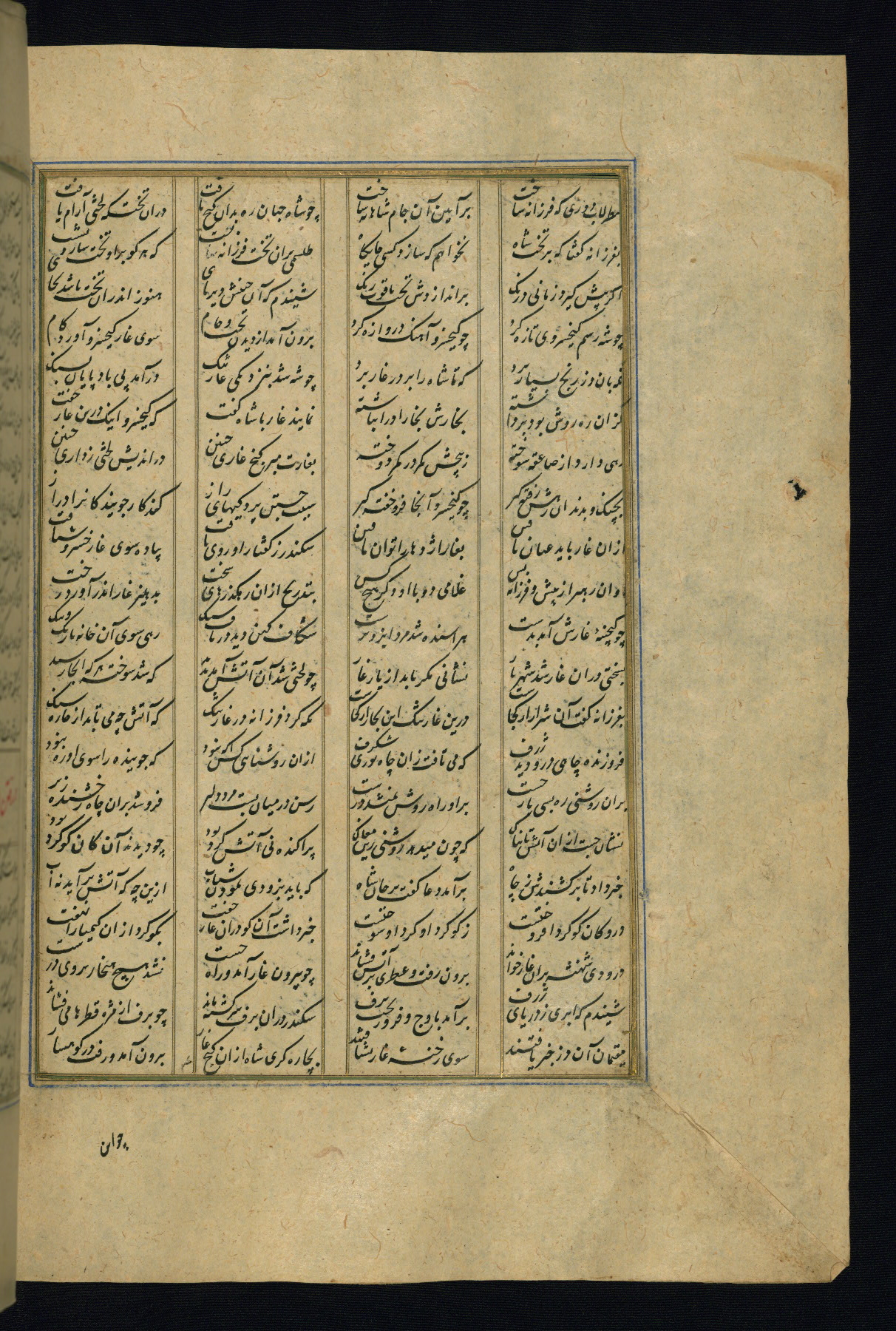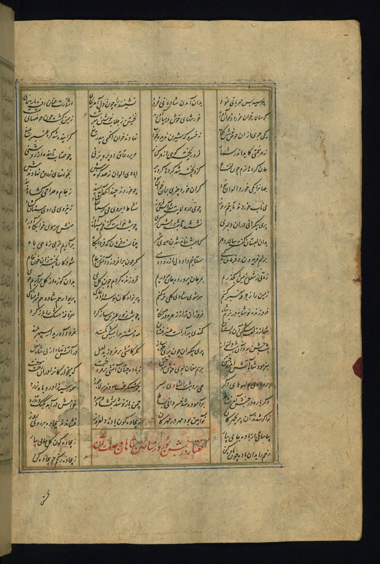 This is an illuminated and illustrated copy of the Khamsah (quintet) by Niẓāmī Ganjavī (d. 605 AH / 1209 CE), completed by Ḥabīb Allāh ibn ʿAlī ibn Ḥusām in Safavid Iran in Rabīʿ II 971 AH / 1563 CE. Illuminated titlepieces introduce the five poems, and there are thirty illustrations, the majority of which are attributable to thirteenth century AH / nineteenth CE Qajar Iran. Ownership notes and seals indicating the provenance of this manuscript are found throughout the codex (fols. 1a, 2a, 153a, 177a, 233a, 349a, and 351a). The binding is not original to the manuscript.