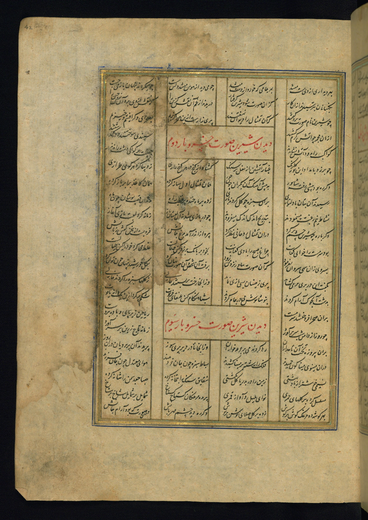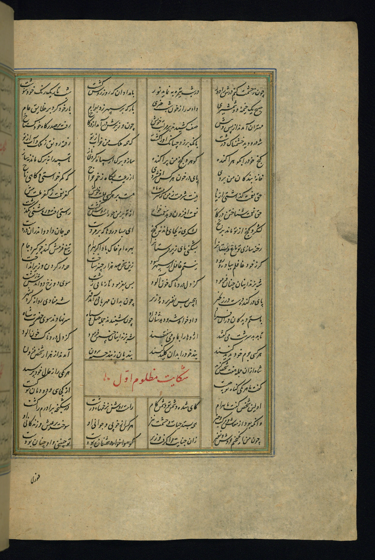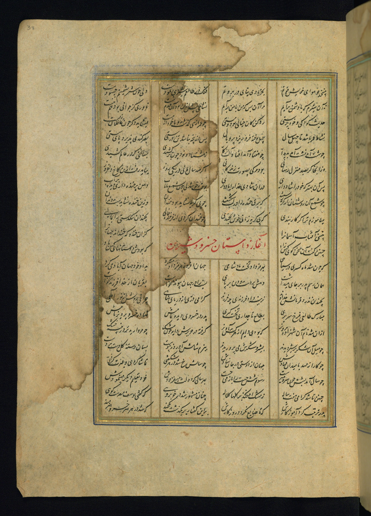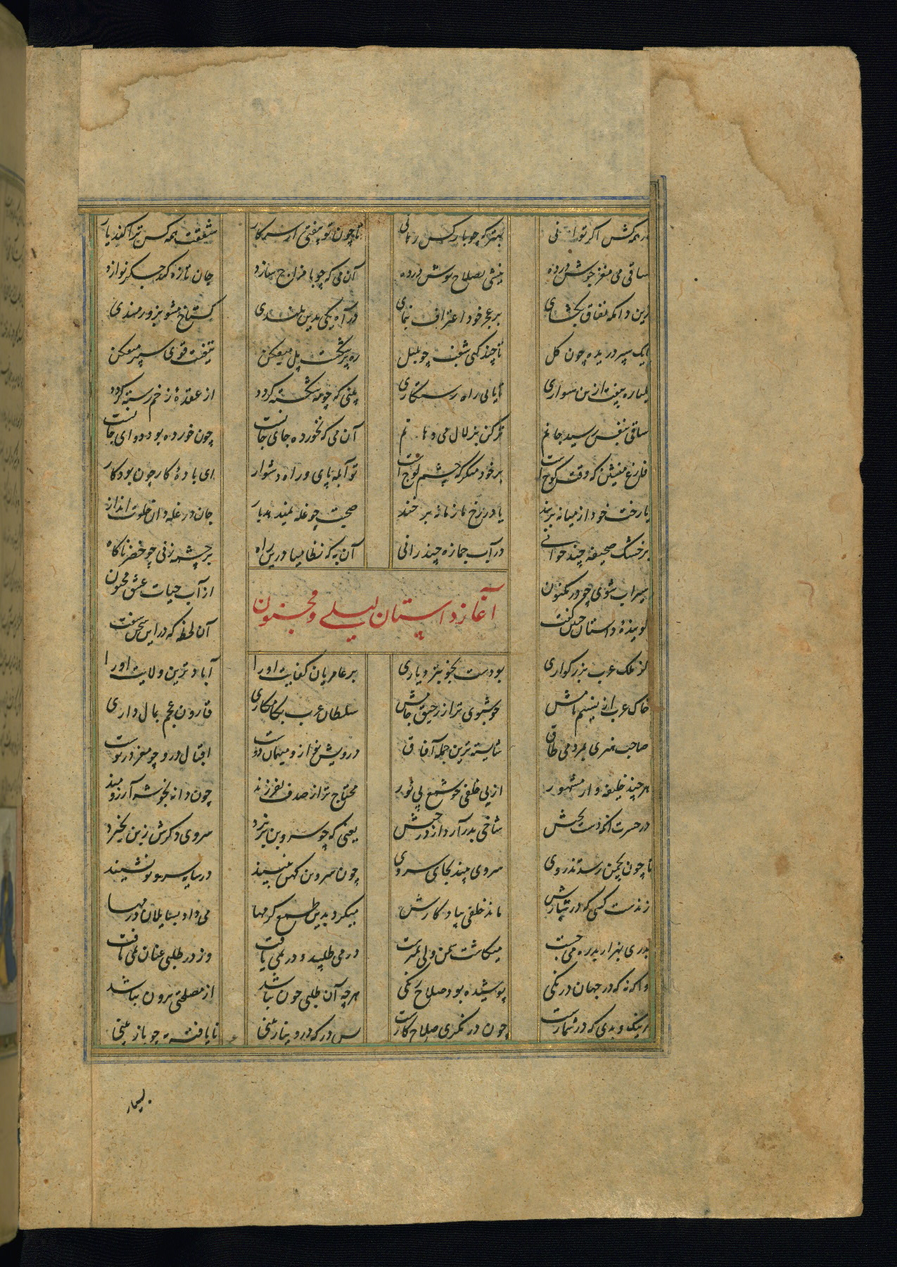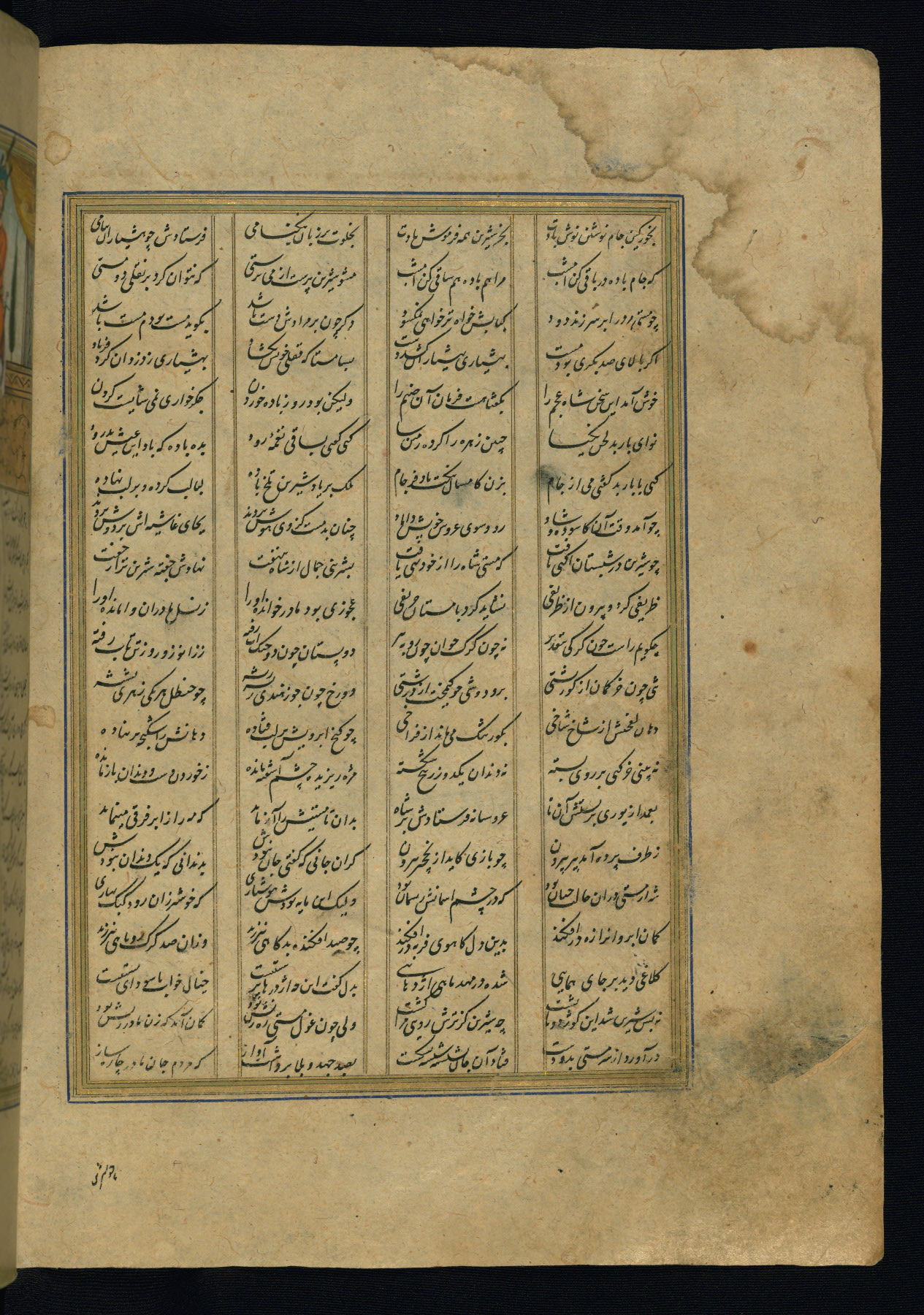 This is an illuminated and illustrated copy of the Khamsah (quintet) by Niẓāmī Ganjavī (d. 605 AH / 1209 CE), completed by Ḥabīb Allāh ibn ʿAlī ibn Ḥusām in Safavid Iran in Rabīʿ II 971 AH / 1563 CE. Illuminated titlepieces introduce the five poems, and there are thirty illustrations, the majority of which are attributable to thirteenth century AH / nineteenth CE Qajar Iran. Ownership notes and seals indicating the provenance of this manuscript are found throughout the codex (fols. 1a, 2a, 153a, 177a, 233a, 349a, and 351a). The binding is not original to the manuscript.