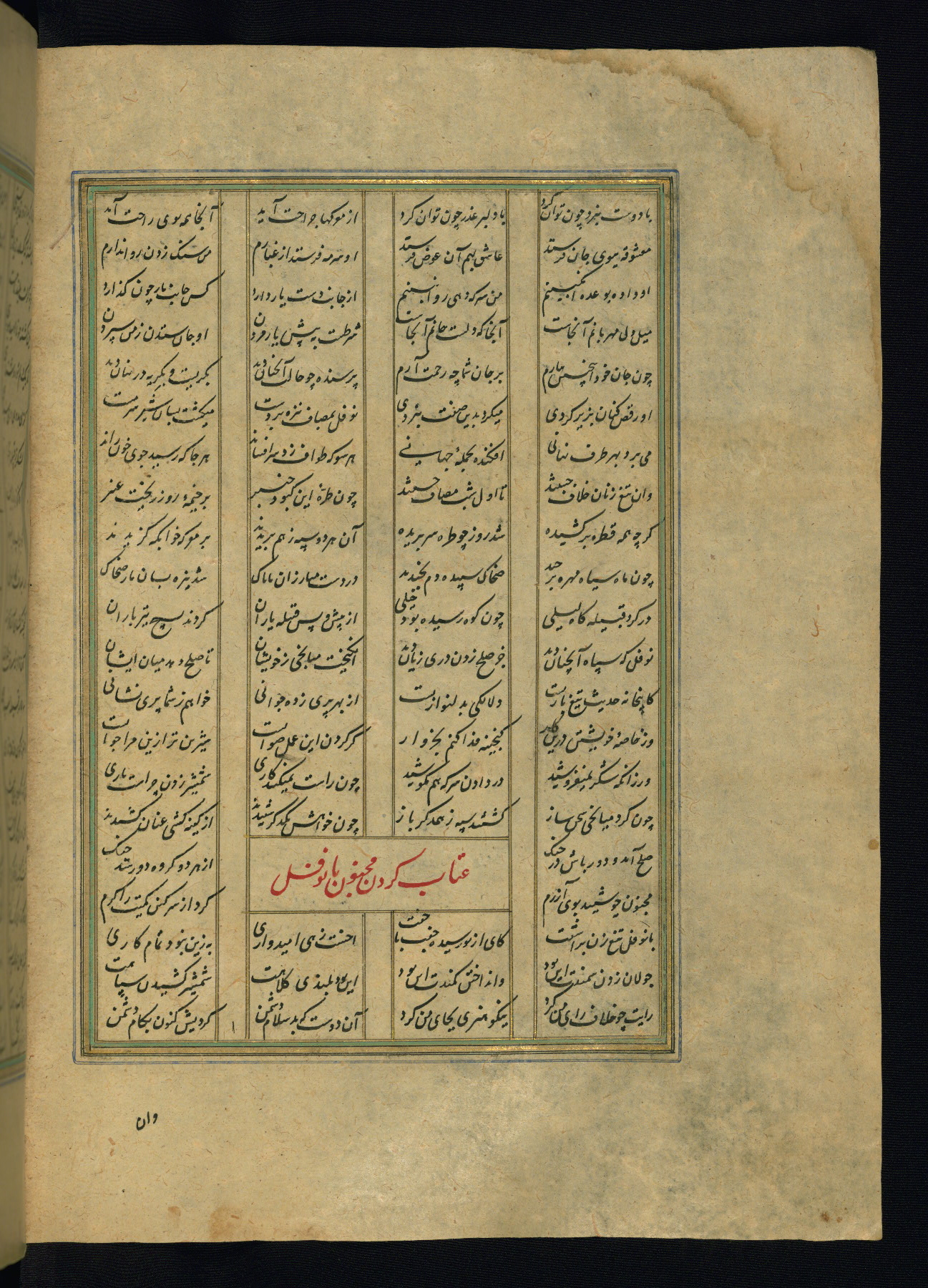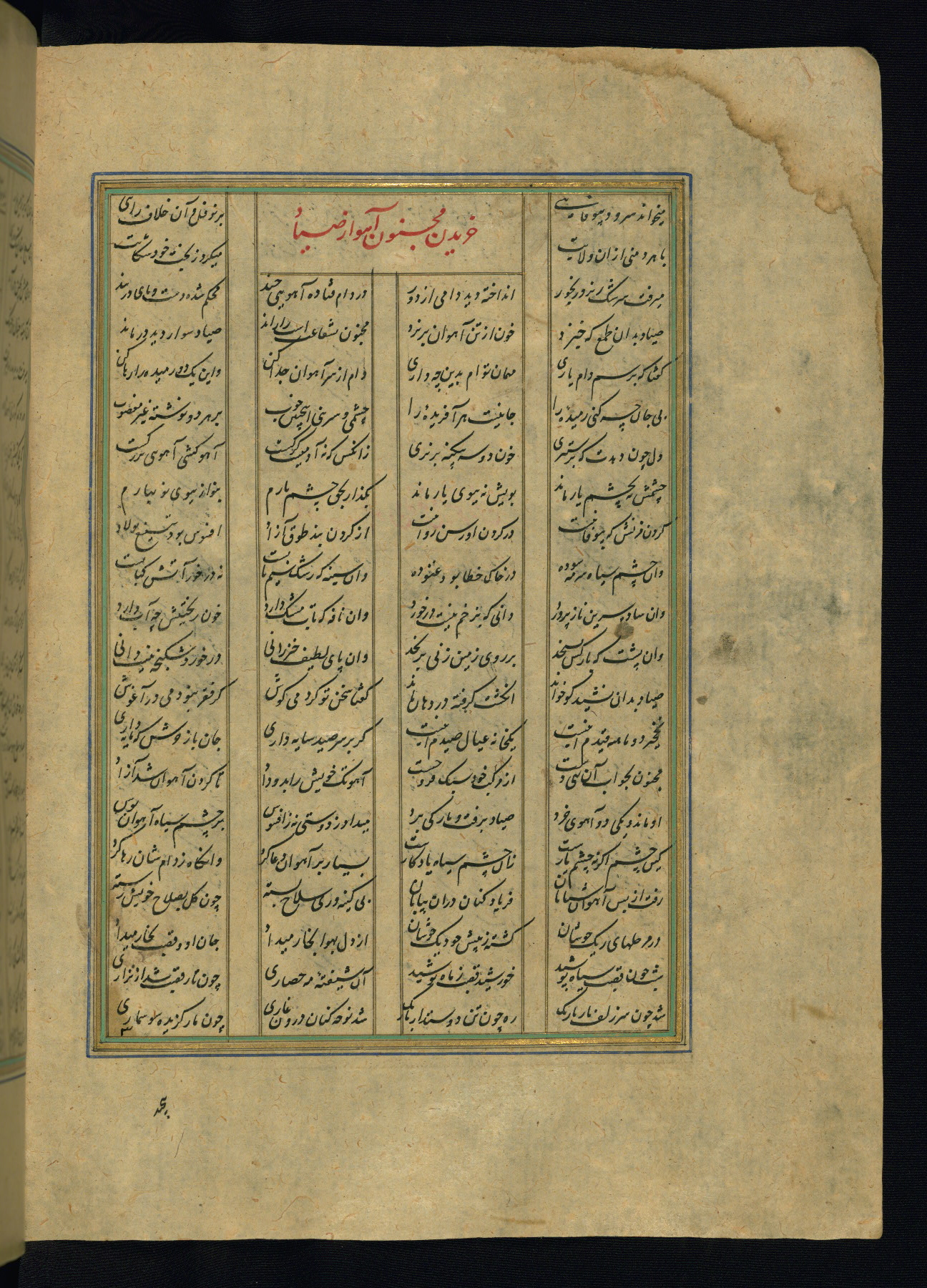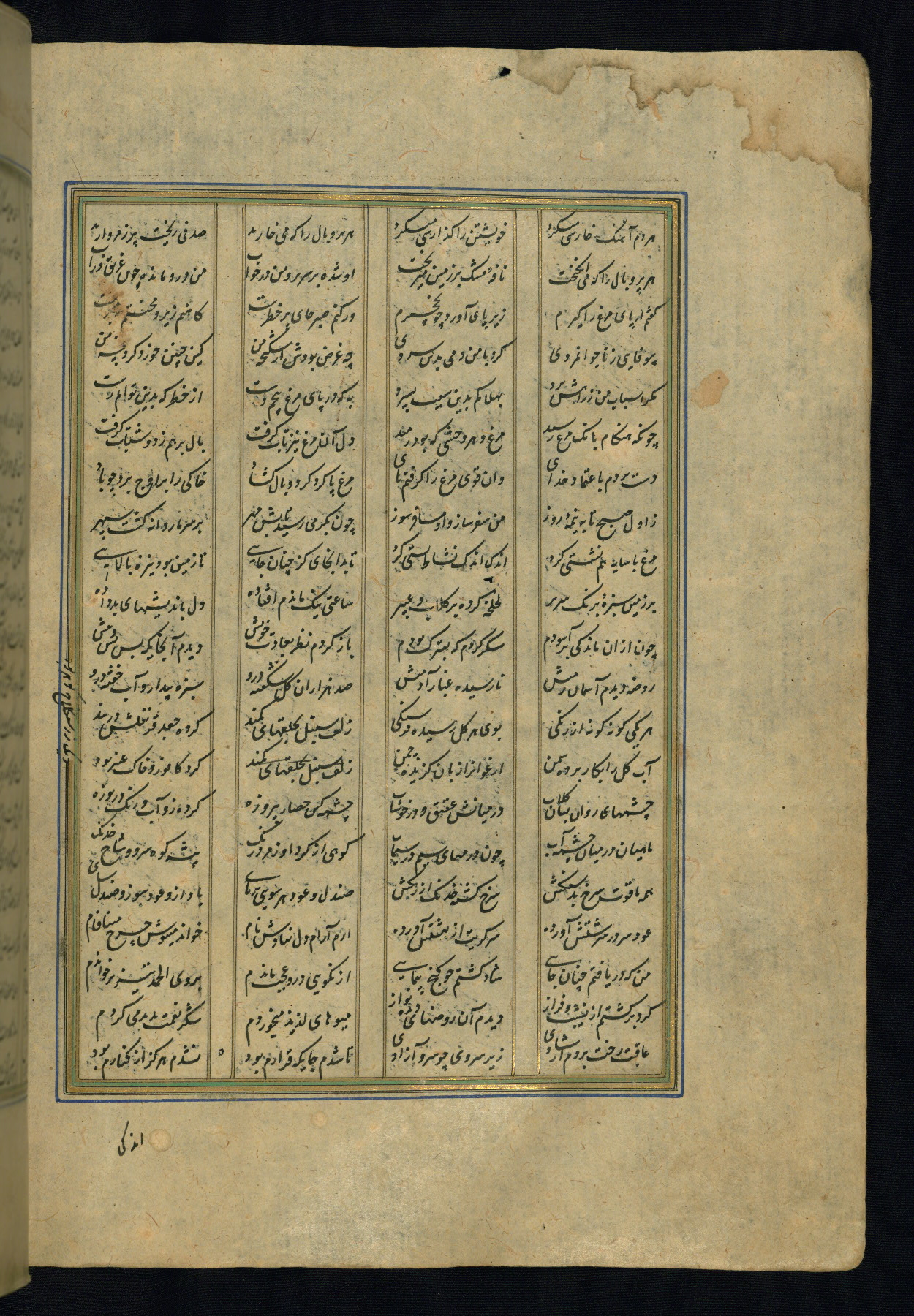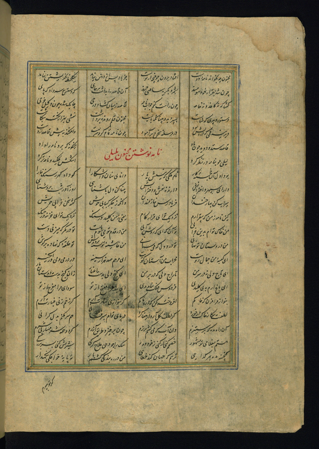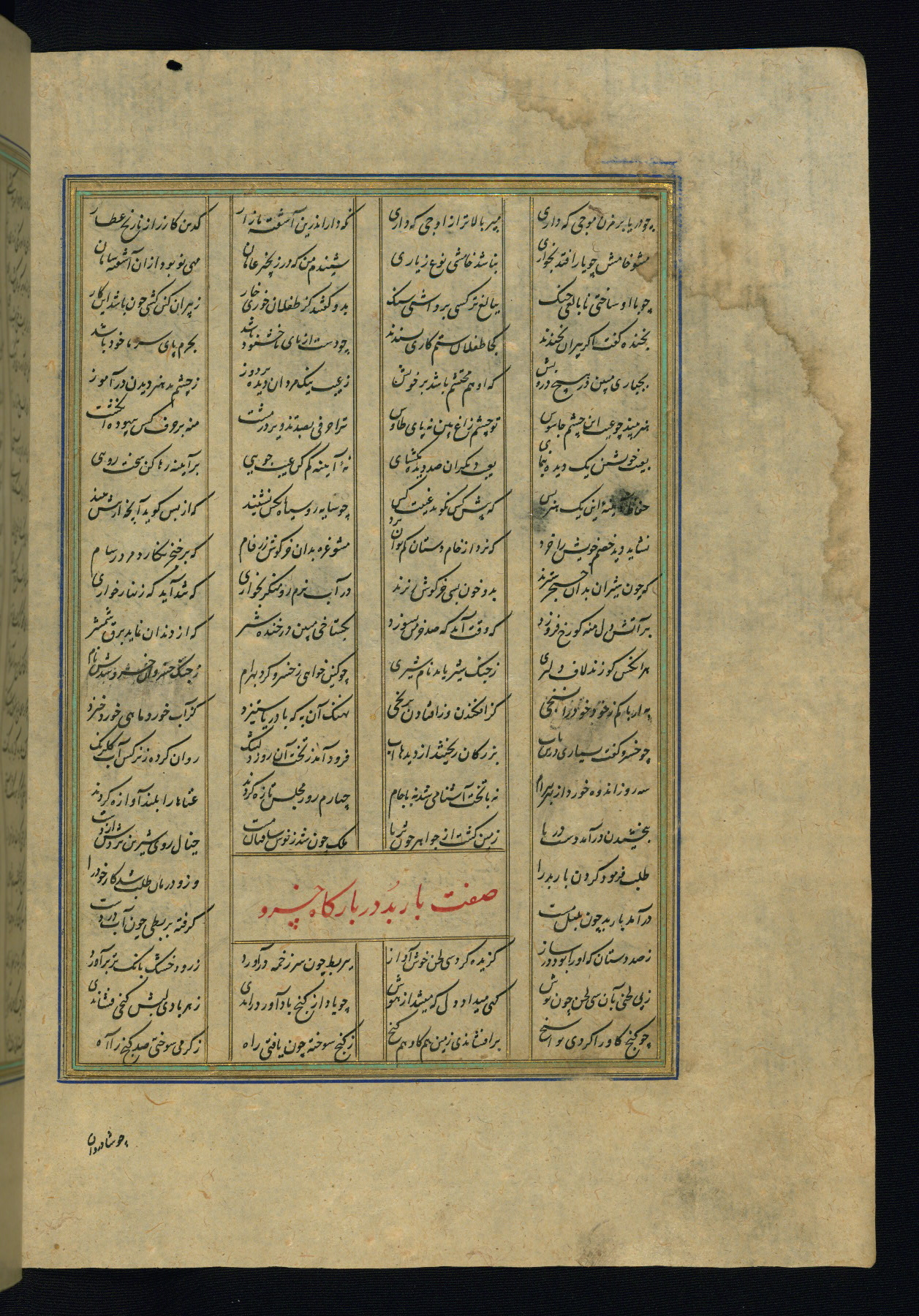 This is an illuminated and illustrated copy of the Khamsah (quintet) by Niẓāmī Ganjavī (d. 605 AH / 1209 CE), completed by Ḥabīb Allāh ibn ʿAlī ibn Ḥusām in Safavid Iran in Rabīʿ II 971 AH / 1563 CE. Illuminated titlepieces introduce the five poems, and there are thirty illustrations, the majority of which are attributable to thirteenth century AH / nineteenth CE Qajar Iran. Ownership notes and seals indicating the provenance of this manuscript are found throughout the codex (fols. 1a, 2a, 153a, 177a, 233a, 349a, and 351a). The binding is not original to the manuscript.