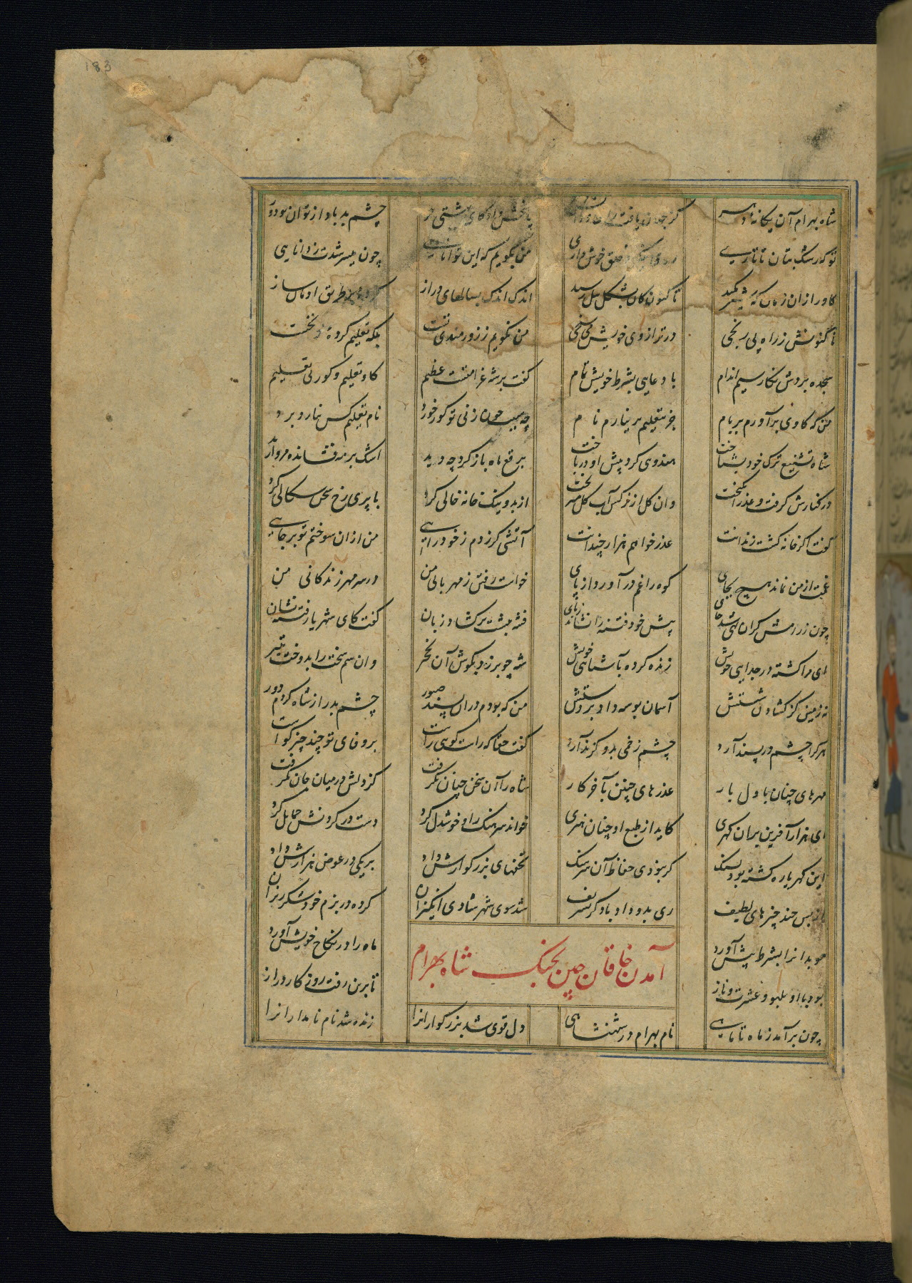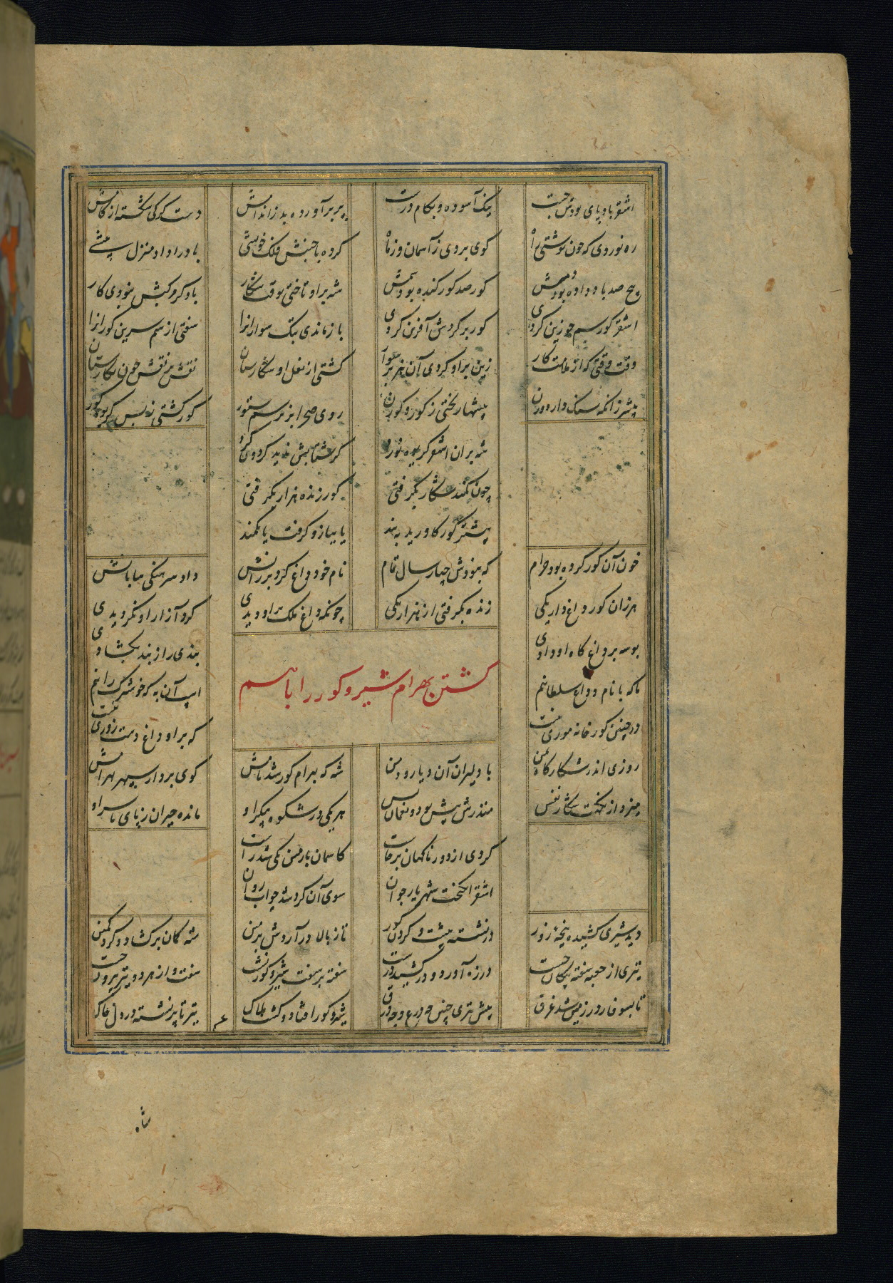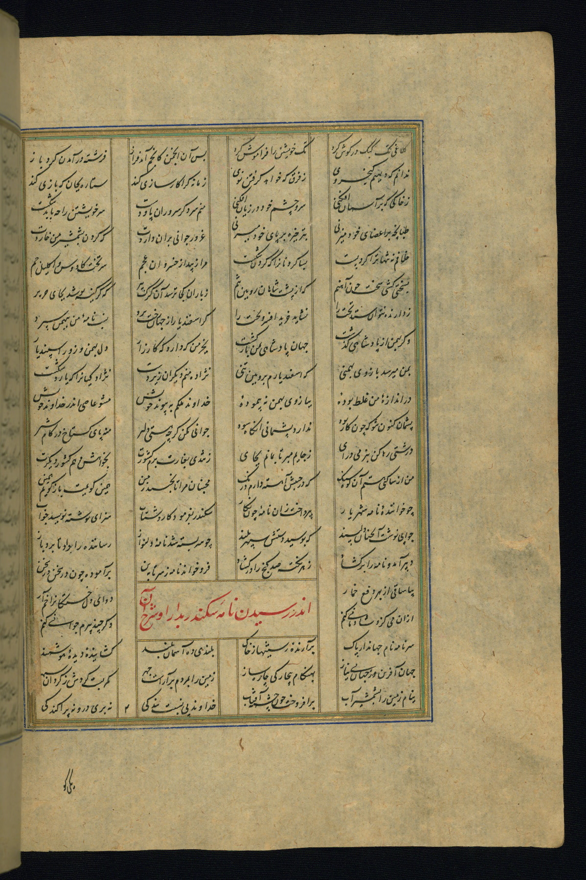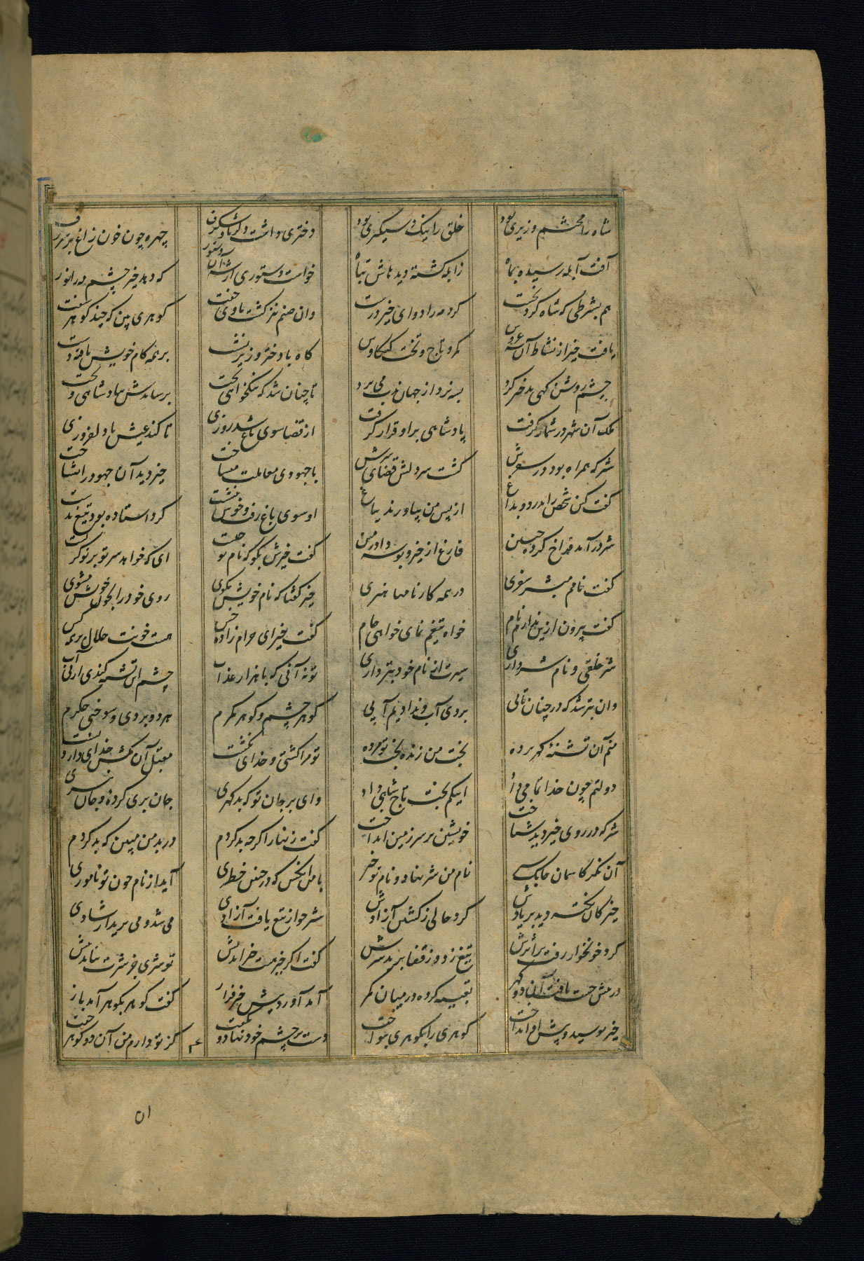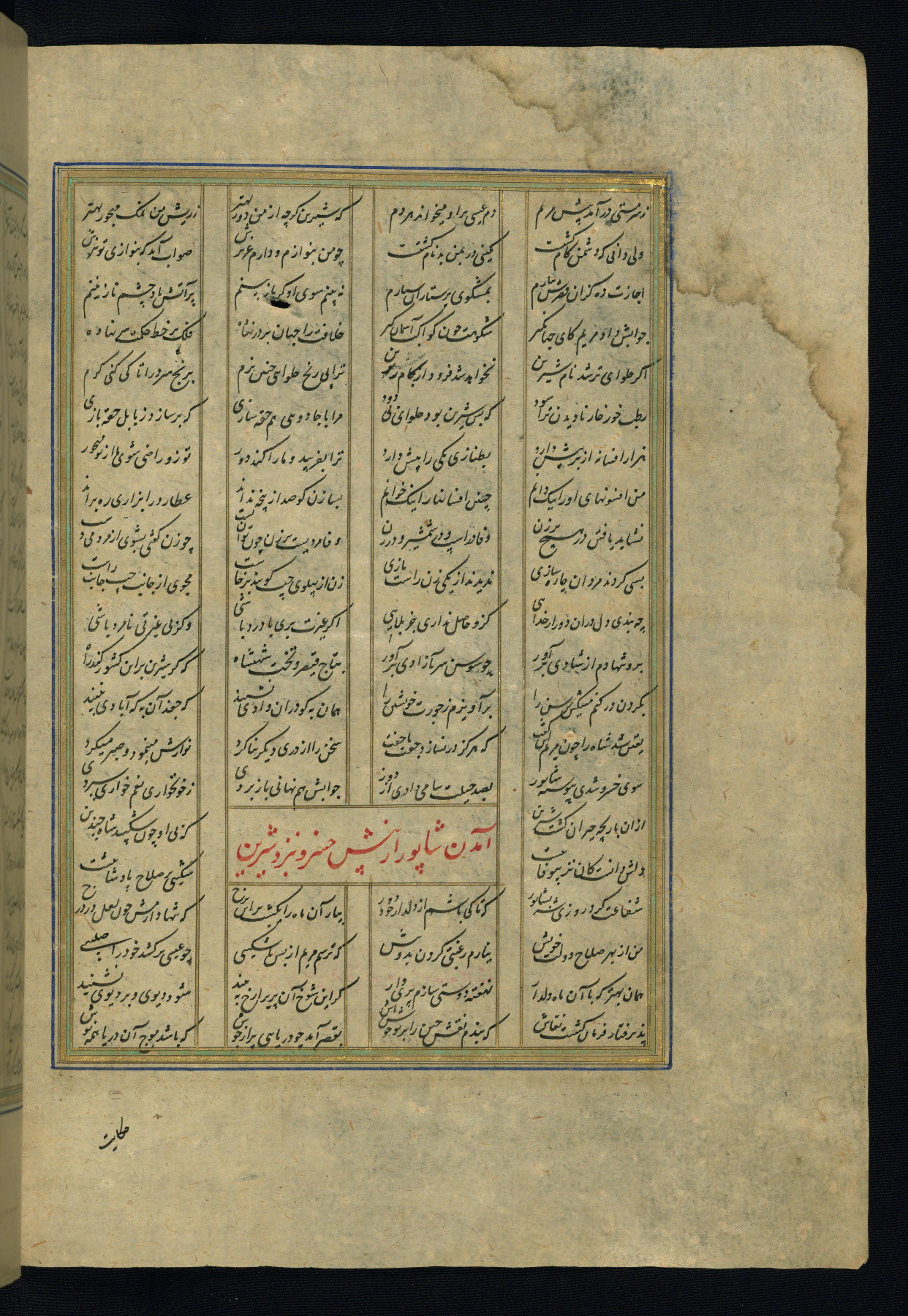This is an illuminated and illustrated copy of the Khamsah (quintet) by Niẓāmī Ganjavī (d. 605 AH / 1209 CE), completed by Ḥabīb Allāh ibn ʿAlī ibn Ḥusām in Safavid Iran in Rabīʿ II 971 AH / 1563 CE. Illuminated titlepieces introduce the five poems, and there are thirty illustrations, the majority of which are attributable to thirteenth century AH / nineteenth CE Qajar Iran. Ownership notes and seals indicating the provenance of this manuscript are found throughout the codex (fols. 1a, 2a, 153a, 177a, 233a, 349a, and 351a). The binding is not original to the manuscript.