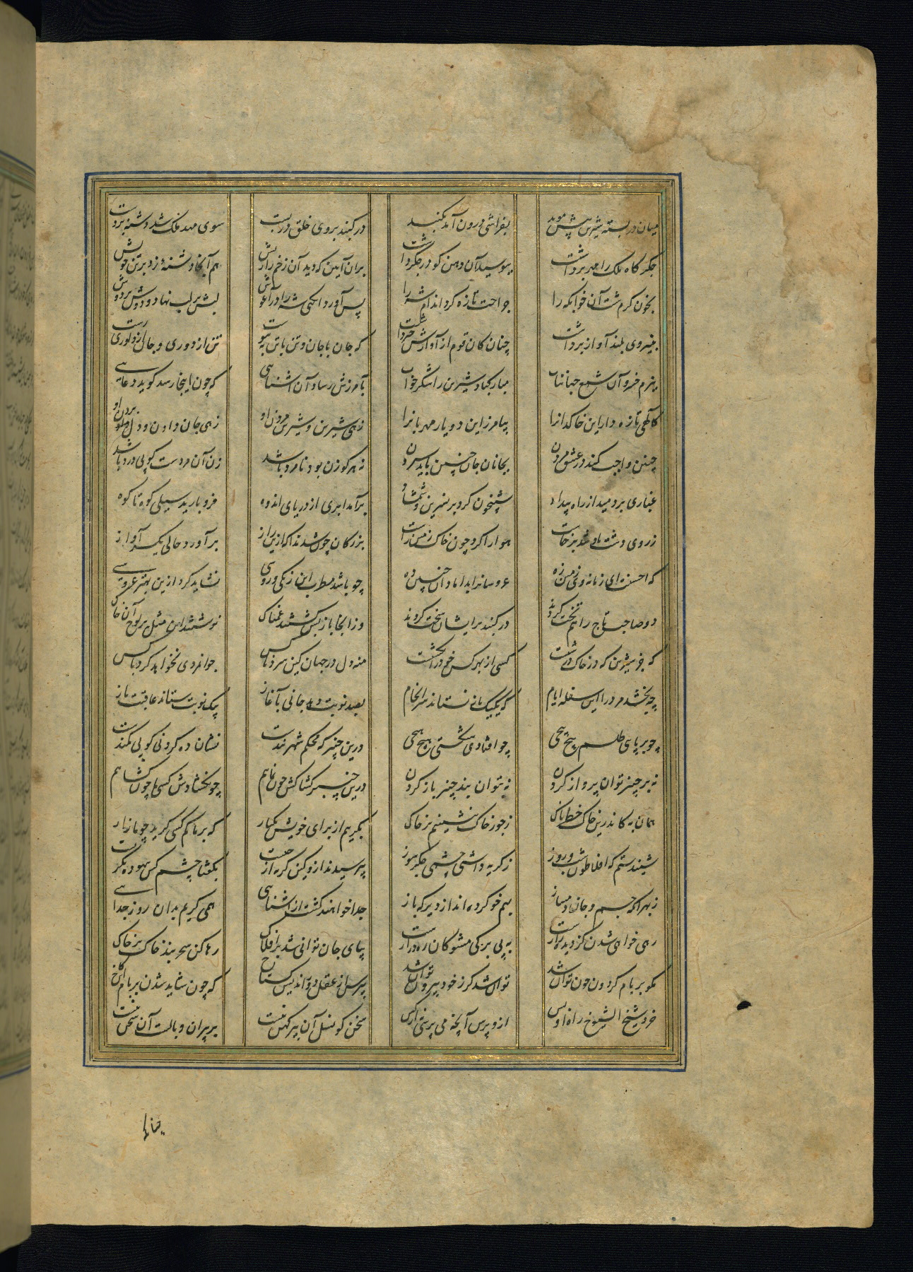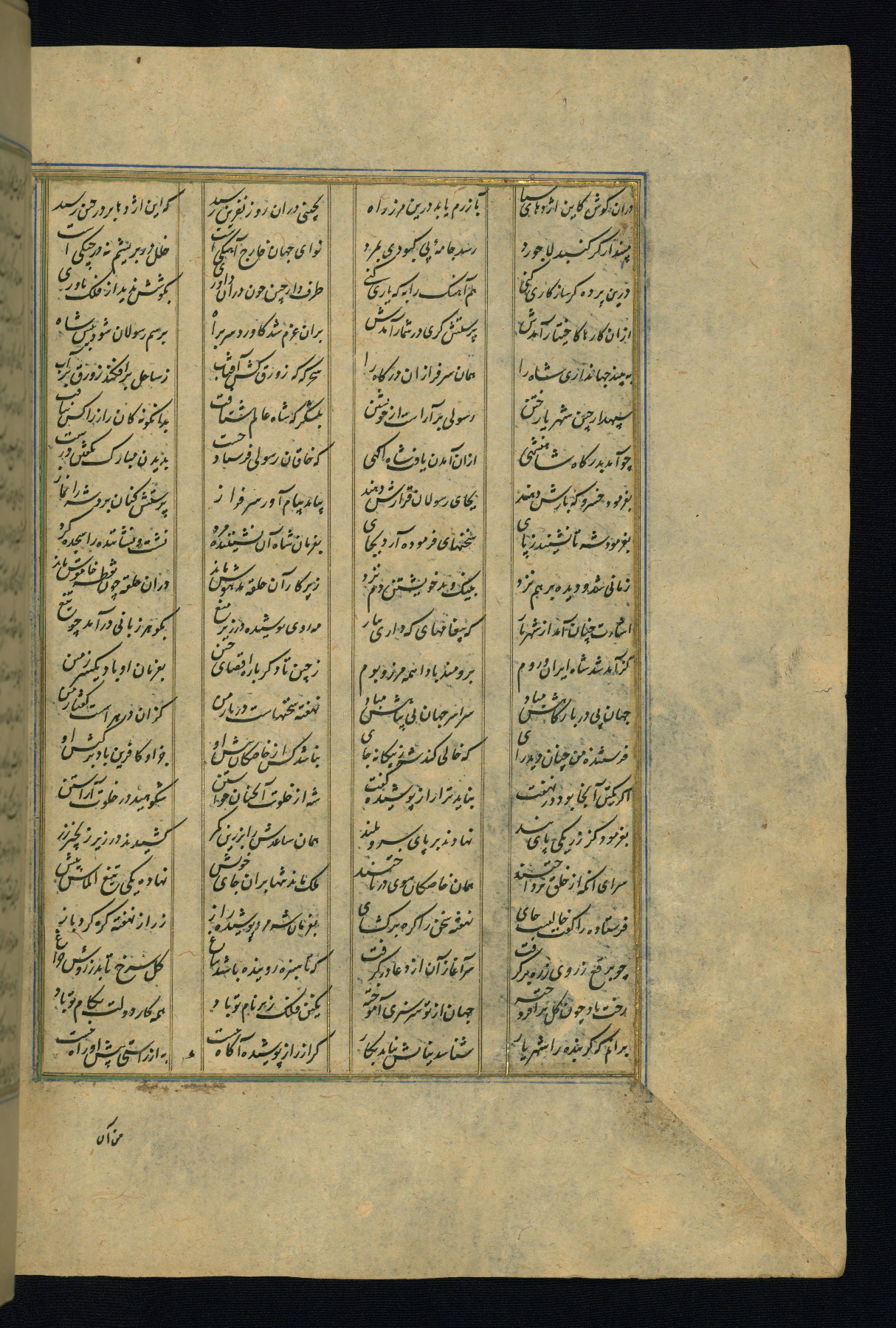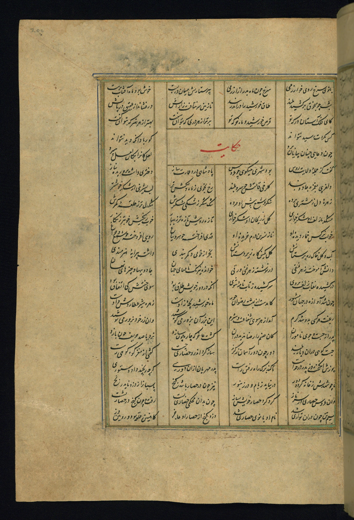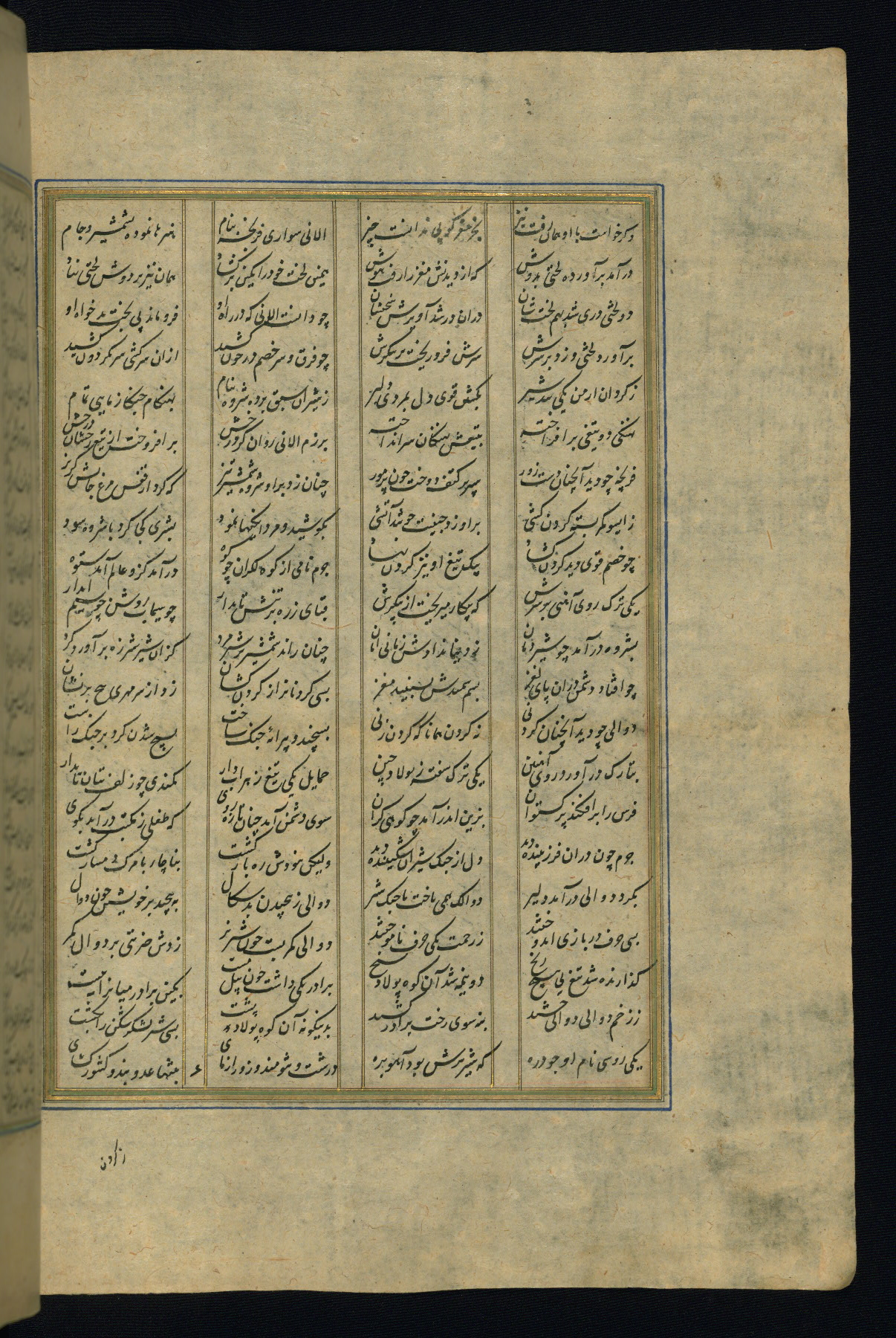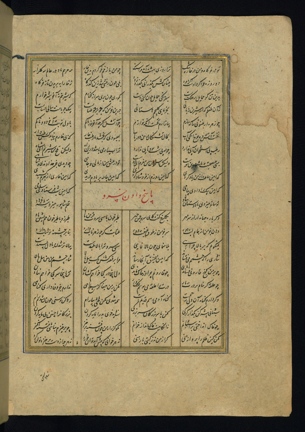 This is an illuminated and illustrated copy of the Khamsah (quintet) by Niẓāmī Ganjavī (d. 605 AH / 1209 CE), completed by Ḥabīb Allāh ibn ʿAlī ibn Ḥusām in Safavid Iran in Rabīʿ II 971 AH / 1563 CE. Illuminated titlepieces introduce the five poems, and there are thirty illustrations, the majority of which are attributable to thirteenth century AH / nineteenth CE Qajar Iran. Ownership notes and seals indicating the provenance of this manuscript are found throughout the codex (fols. 1a, 2a, 153a, 177a, 233a, 349a, and 351a). The binding is not original to the manuscript.