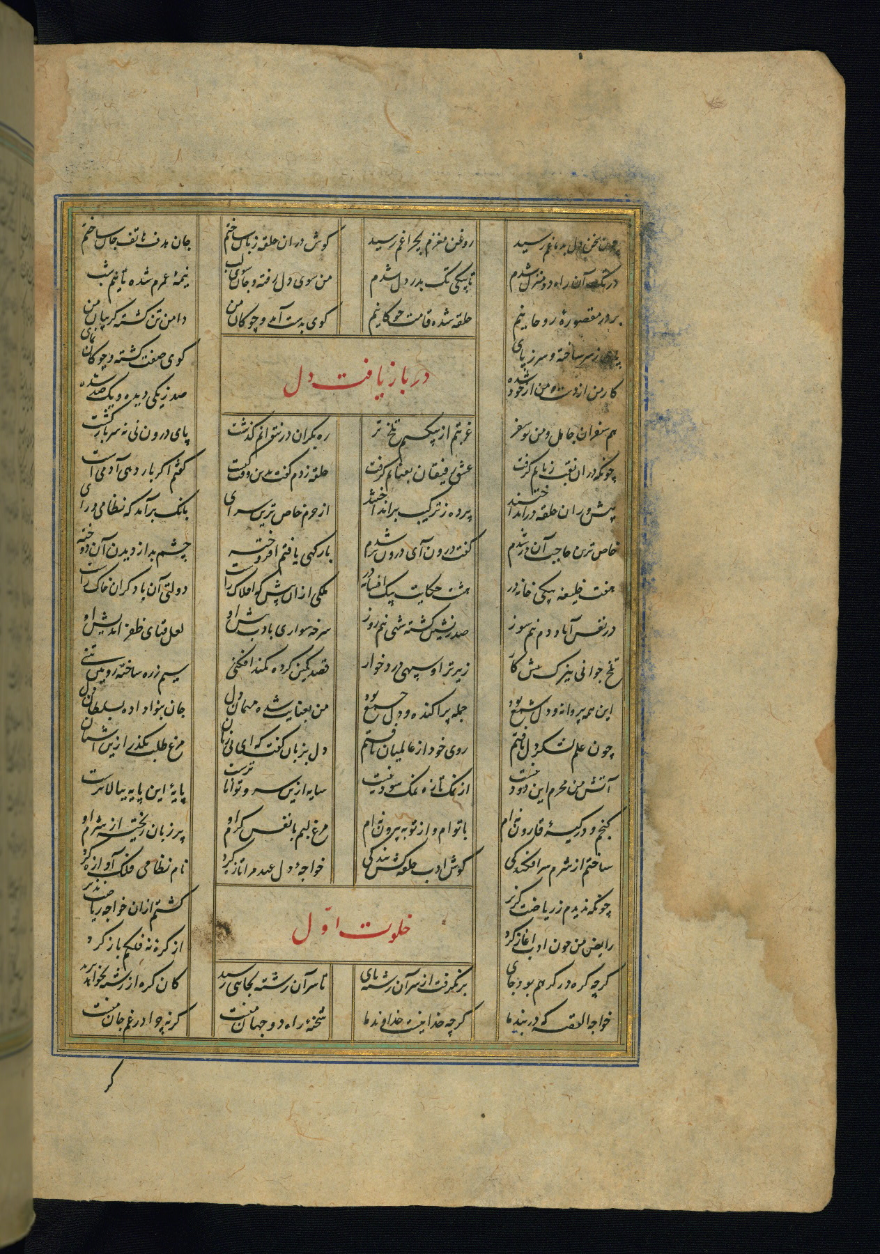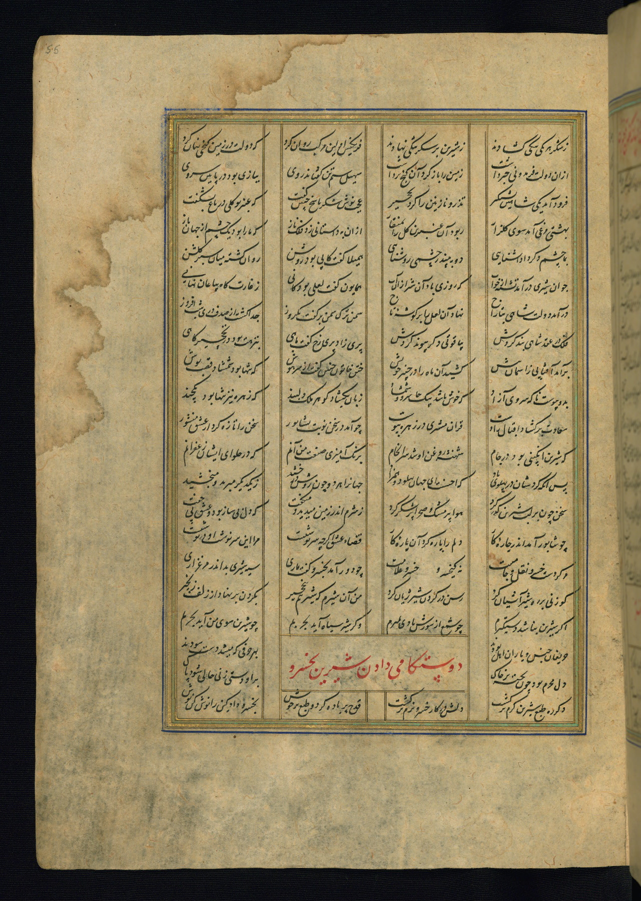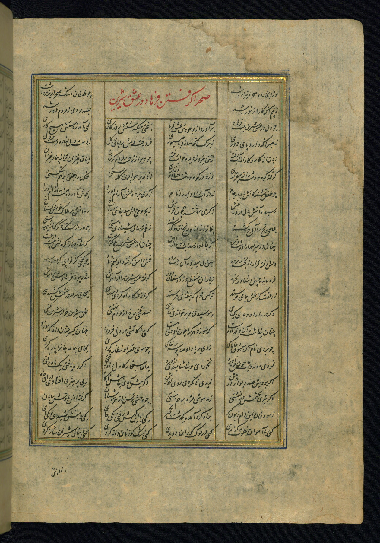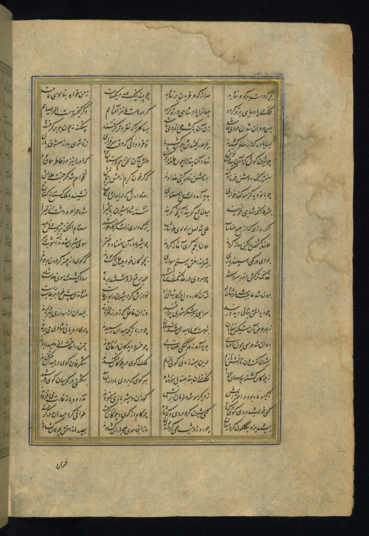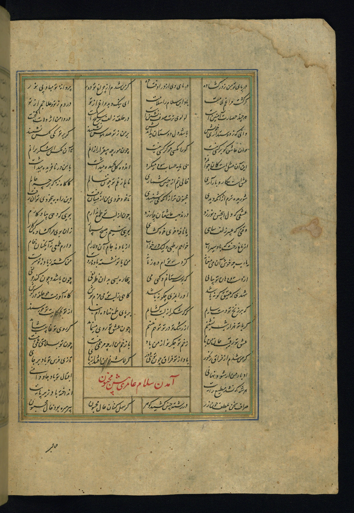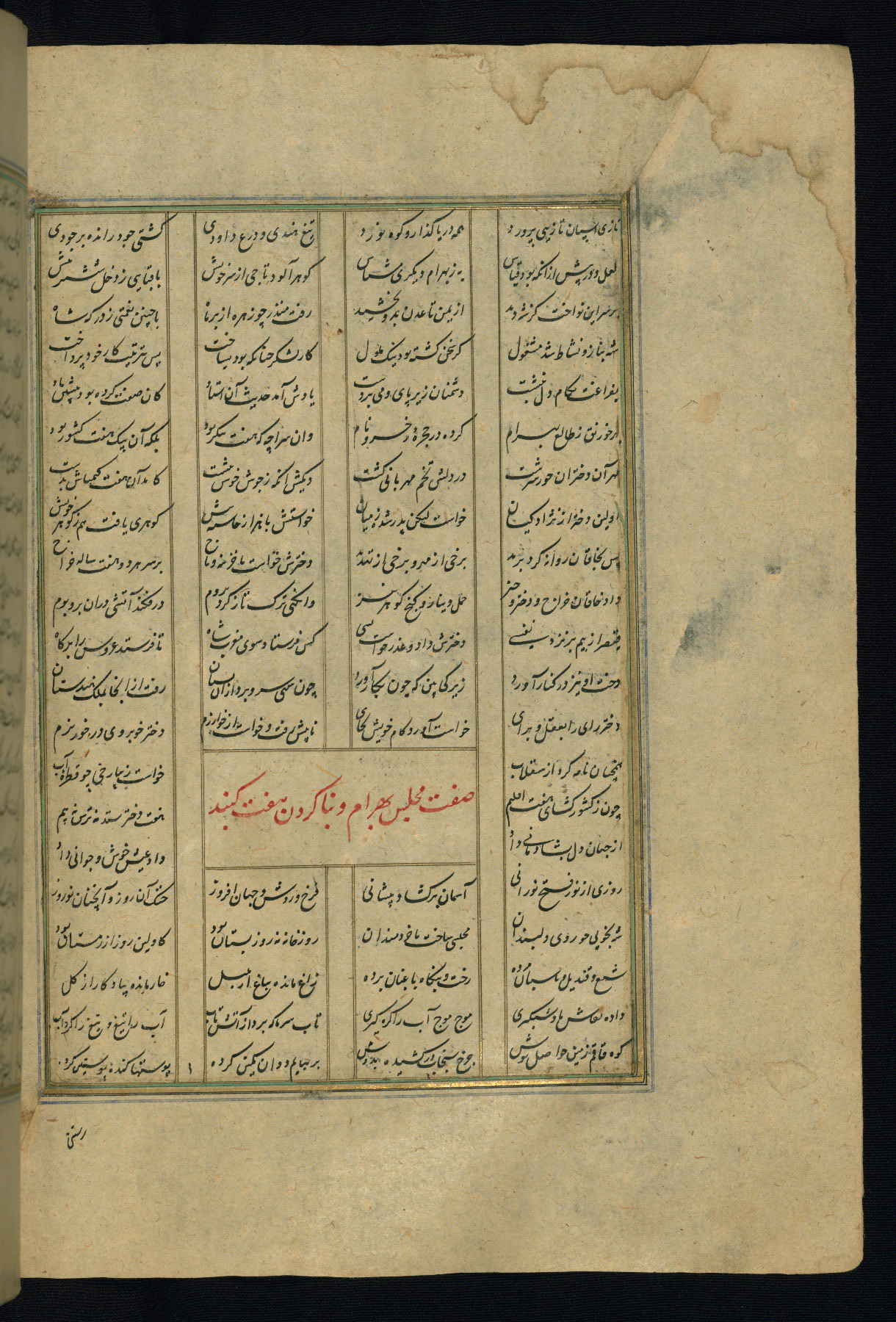 This is an illuminated and illustrated copy of the Khamsah (quintet) by Niẓāmī Ganjavī (d. 605 AH / 1209 CE), completed by Ḥabīb Allāh ibn ʿAlī ibn Ḥusām in Safavid Iran in Rabīʿ II 971 AH / 1563 CE. Illuminated titlepieces introduce the five poems, and there are thirty illustrations, the majority of which are attributable to thirteenth century AH / nineteenth CE Qajar Iran. Ownership notes and seals indicating the provenance of this manuscript are found throughout the codex (fols. 1a, 2a, 153a, 177a, 233a, 349a, and 351a). The binding is not original to the manuscript.
