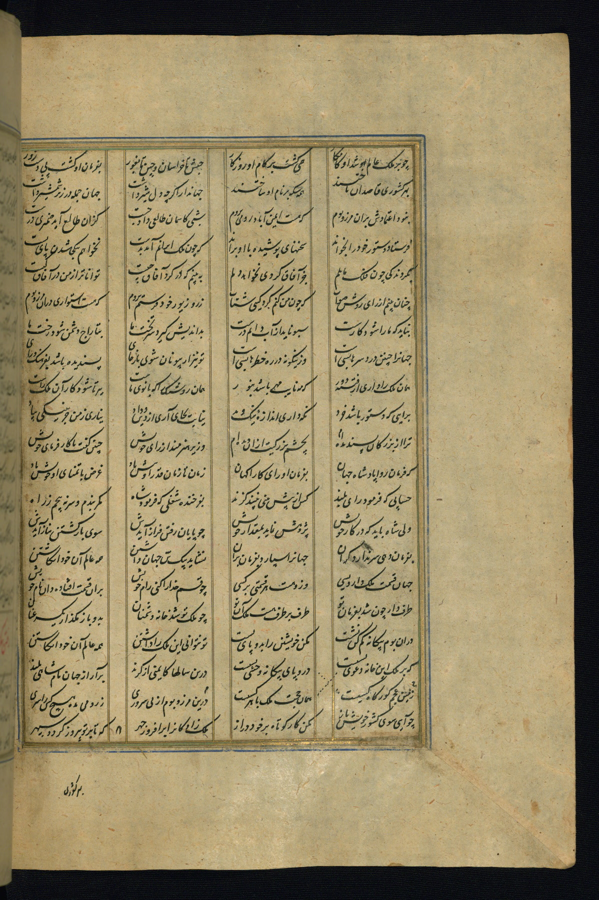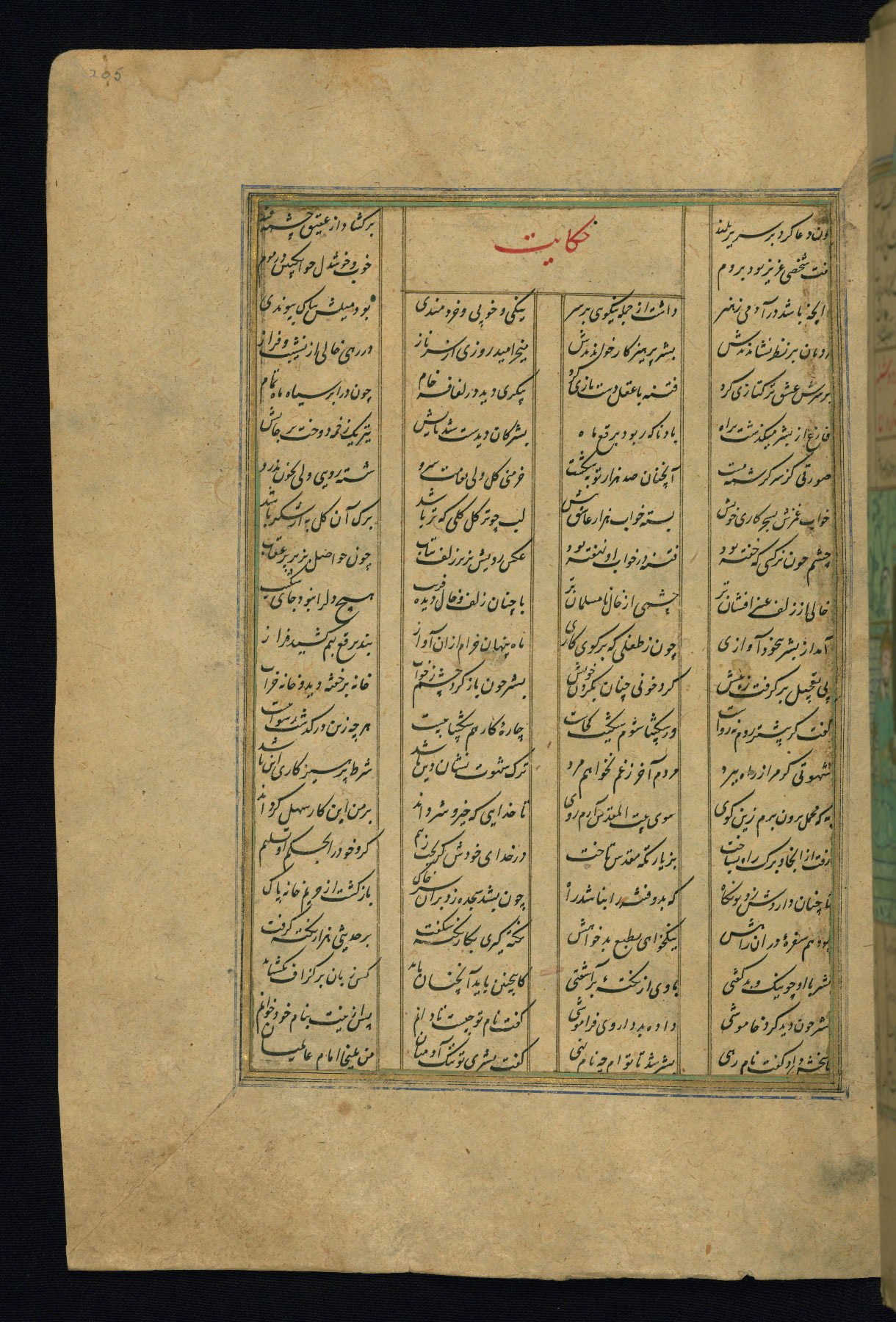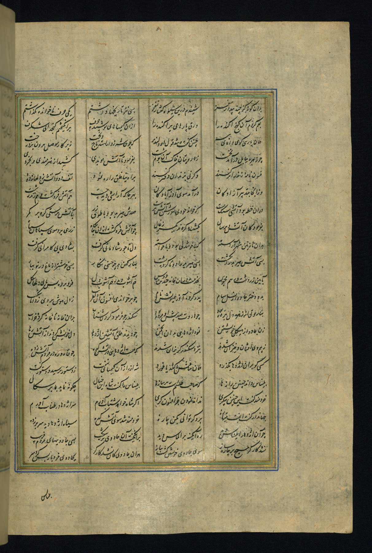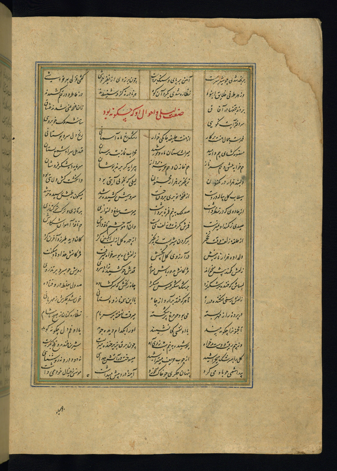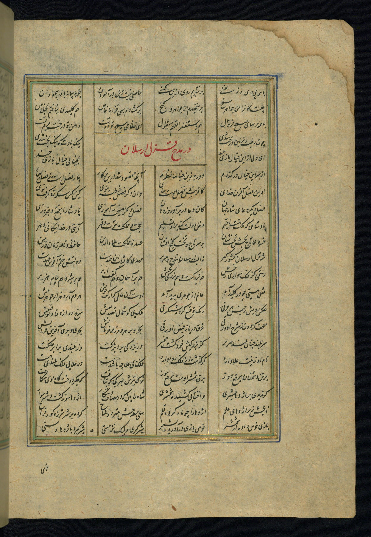 This is an illuminated and illustrated copy of the Khamsah (quintet) by Niẓāmī Ganjavī (d. 605 AH / 1209 CE), completed by Ḥabīb Allāh ibn ʿAlī ibn Ḥusām in Safavid Iran in Rabīʿ II 971 AH / 1563 CE. Illuminated titlepieces introduce the five poems, and there are thirty illustrations, the majority of which are attributable to thirteenth century AH / nineteenth CE Qajar Iran. Ownership notes and seals indicating the provenance of this manuscript are found throughout the codex (fols. 1a, 2a, 153a, 177a, 233a, 349a, and 351a). The binding is not original to the manuscript.