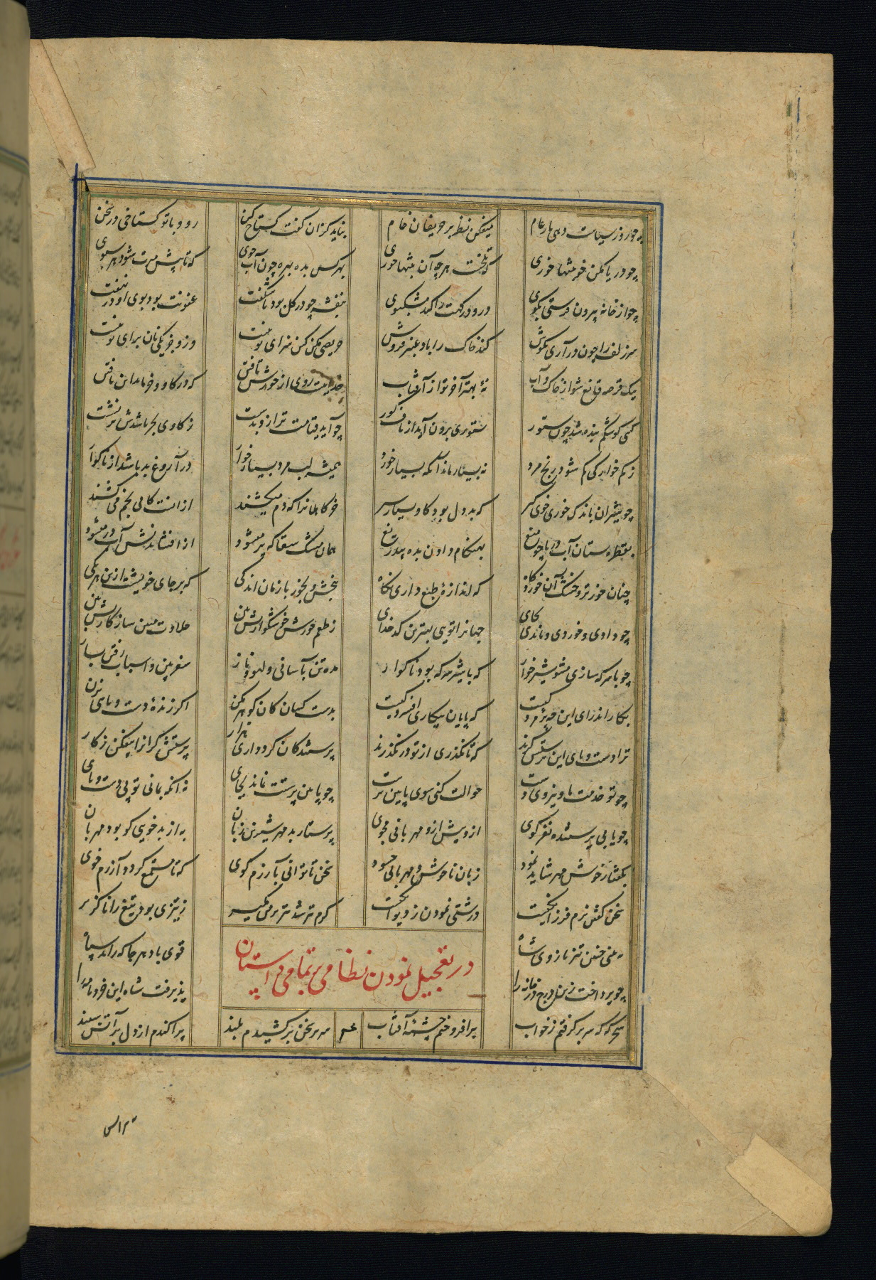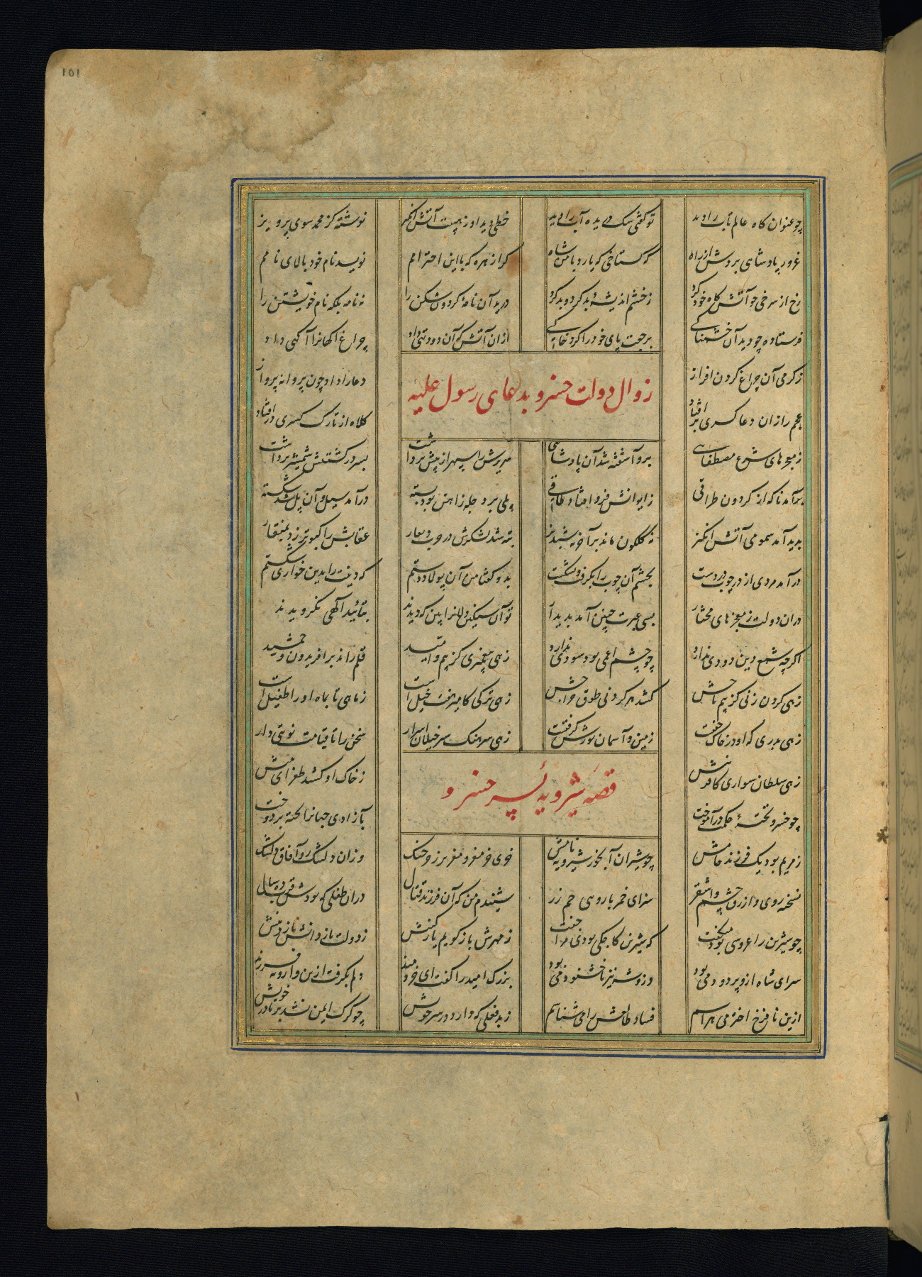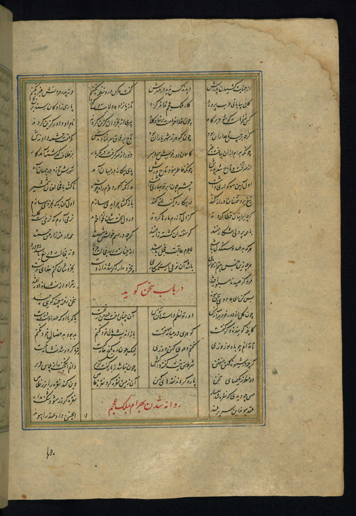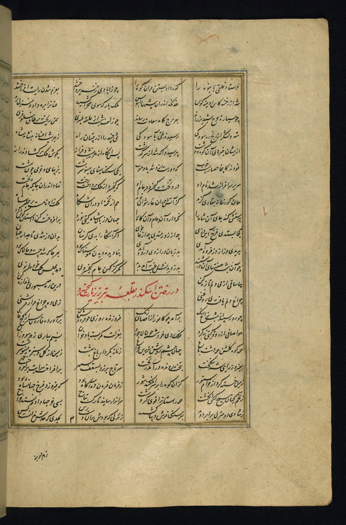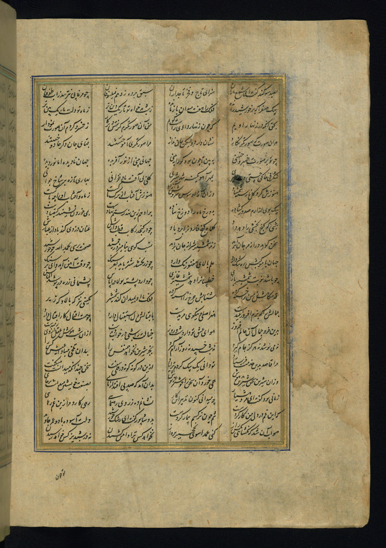 This is an illuminated and illustrated copy of the Khamsah (quintet) by Niẓāmī Ganjavī (d. 605 AH / 1209 CE), completed by Ḥabīb Allāh ibn ʿAlī ibn Ḥusām in Safavid Iran in Rabīʿ II 971 AH / 1563 CE. Illuminated titlepieces introduce the five poems, and there are thirty illustrations, the majority of which are attributable to thirteenth century AH / nineteenth CE Qajar Iran. Ownership notes and seals indicating the provenance of this manuscript are found throughout the codex (fols. 1a, 2a, 153a, 177a, 233a, 349a, and 351a). The binding is not original to the manuscript.