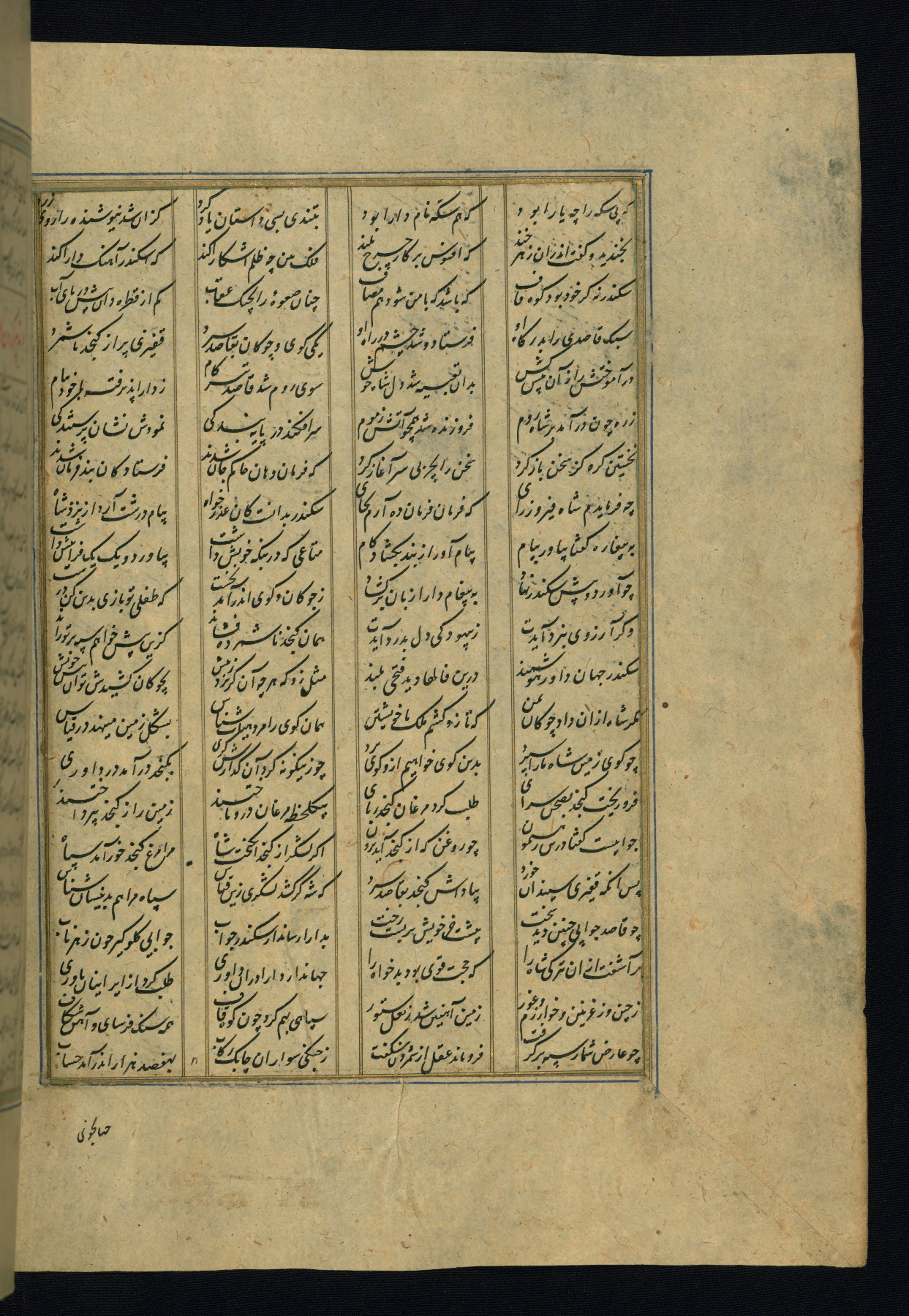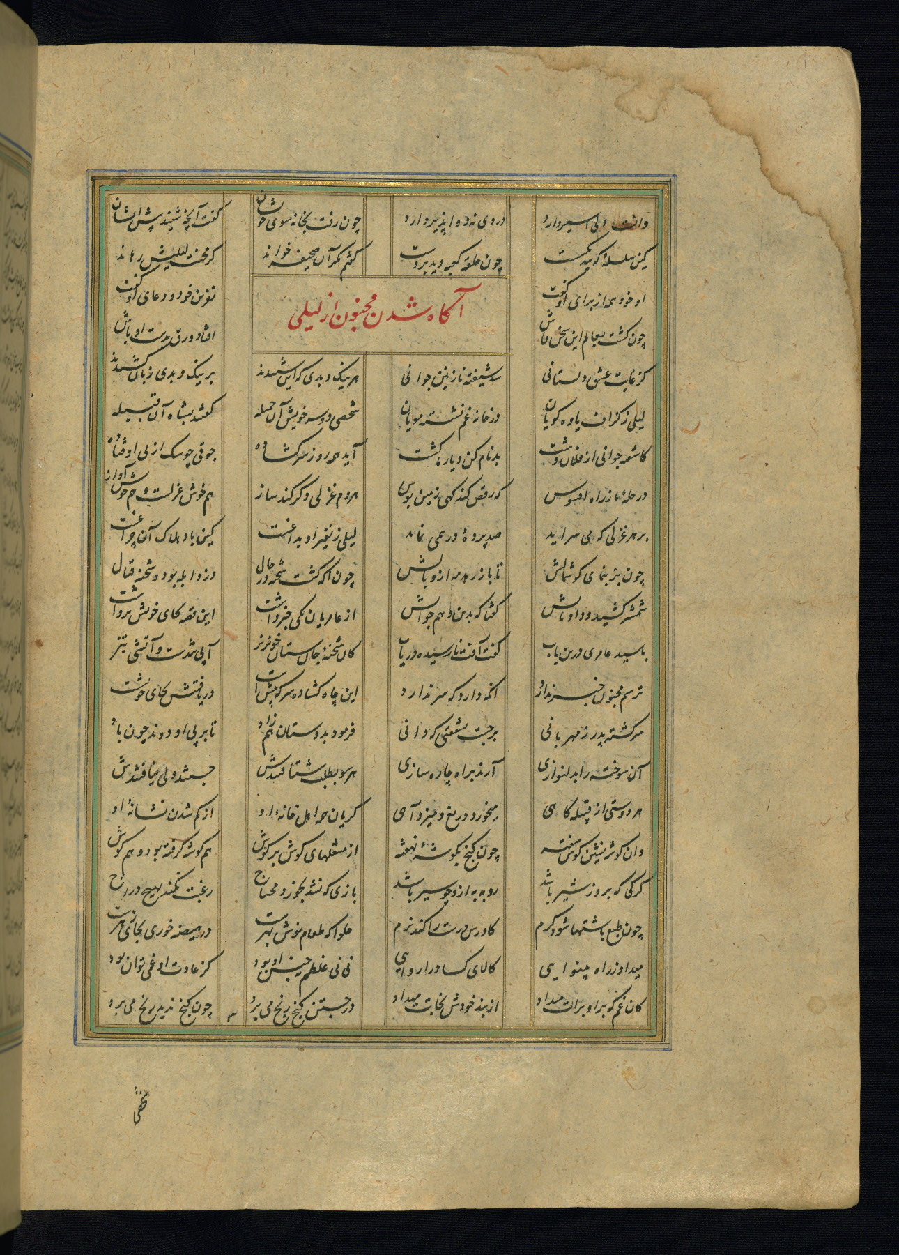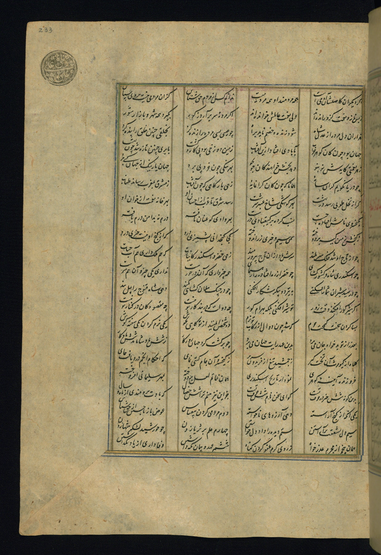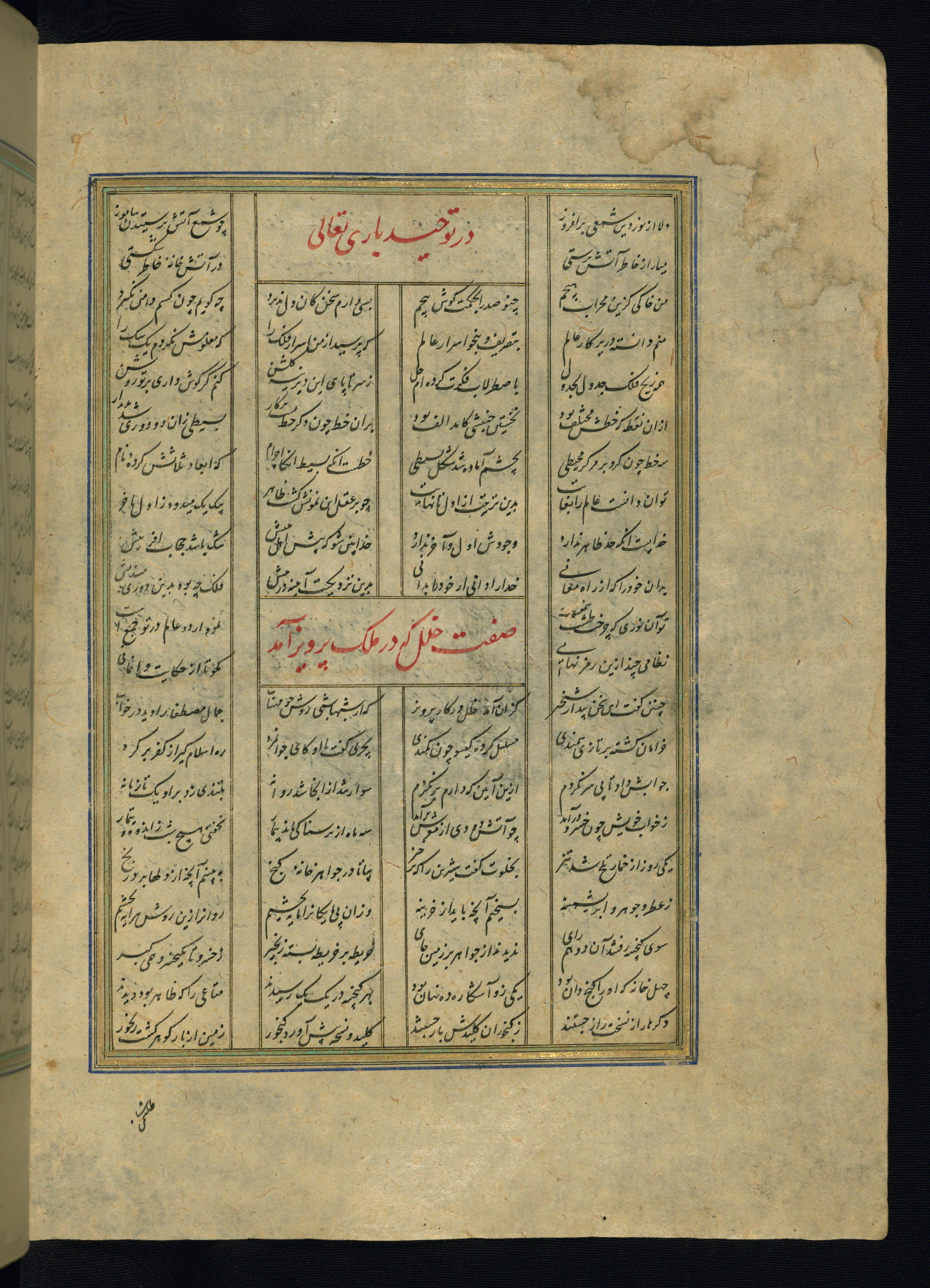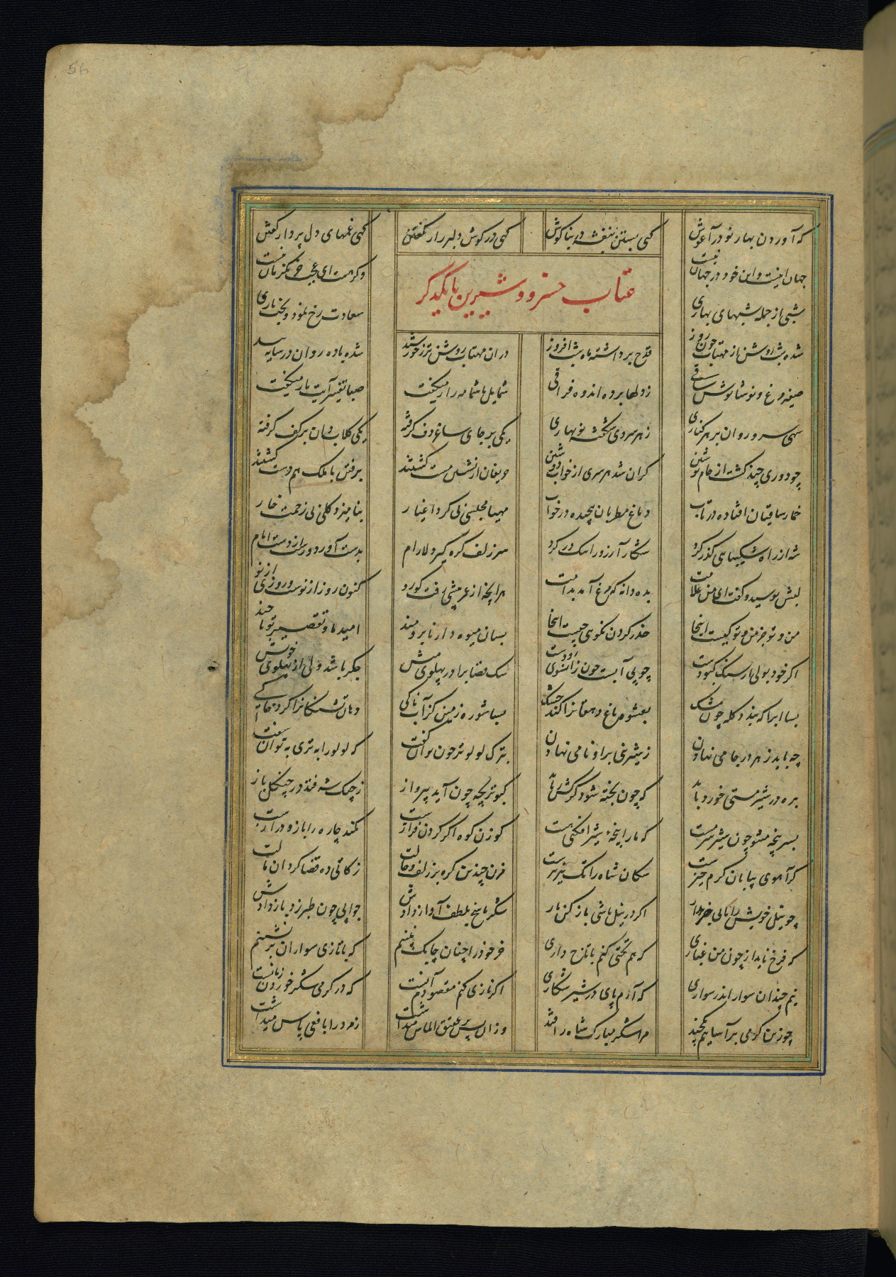 This is an illuminated and illustrated copy of the Khamsah (quintet) by Niẓāmī Ganjavī (d. 605 AH / 1209 CE), completed by Ḥabīb Allāh ibn ʿAlī ibn Ḥusām in Safavid Iran in Rabīʿ II 971 AH / 1563 CE. Illuminated titlepieces introduce the five poems, and there are thirty illustrations, the majority of which are attributable to thirteenth century AH / nineteenth CE Qajar Iran. Ownership notes and seals indicating the provenance of this manuscript are found throughout the codex (fols. 1a, 2a, 153a, 177a, 233a, 349a, and 351a). The binding is not original to the manuscript.