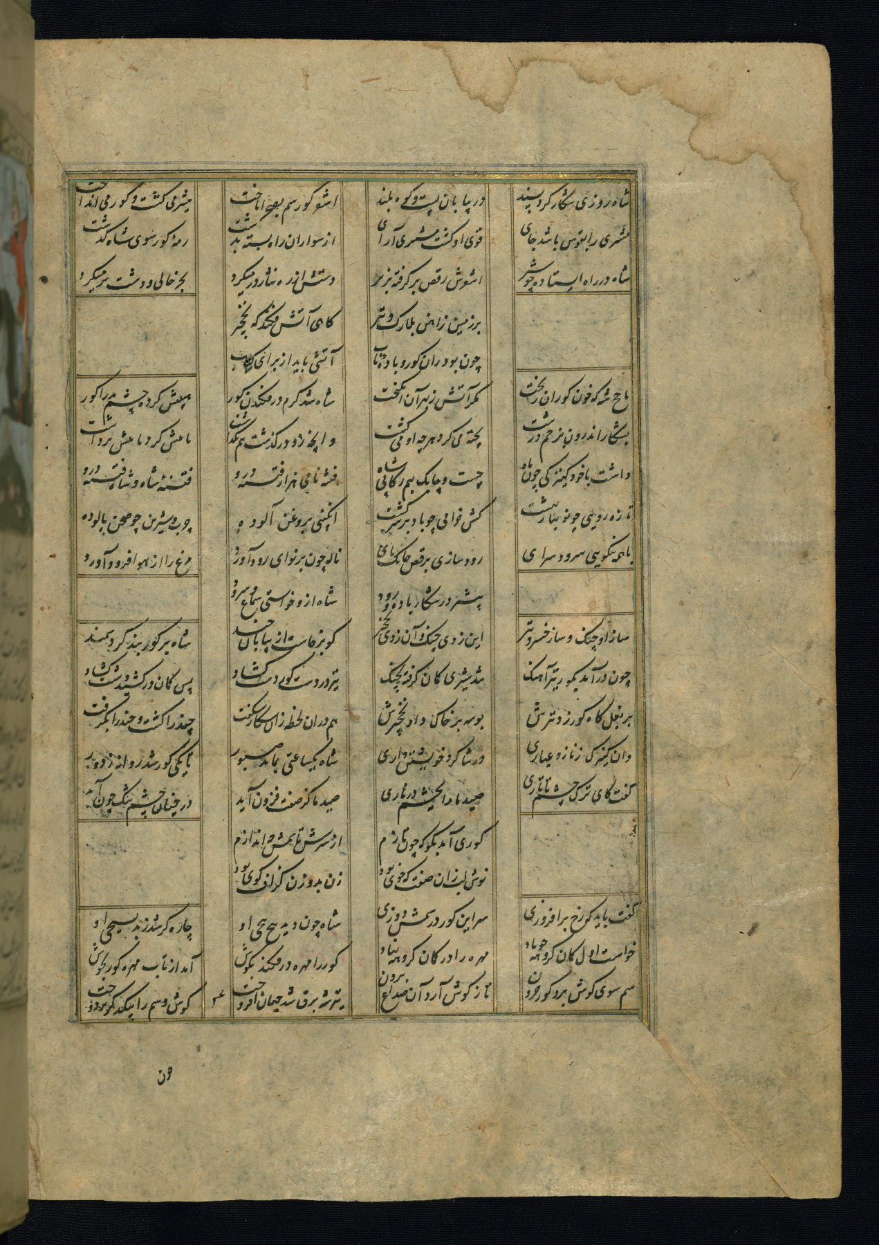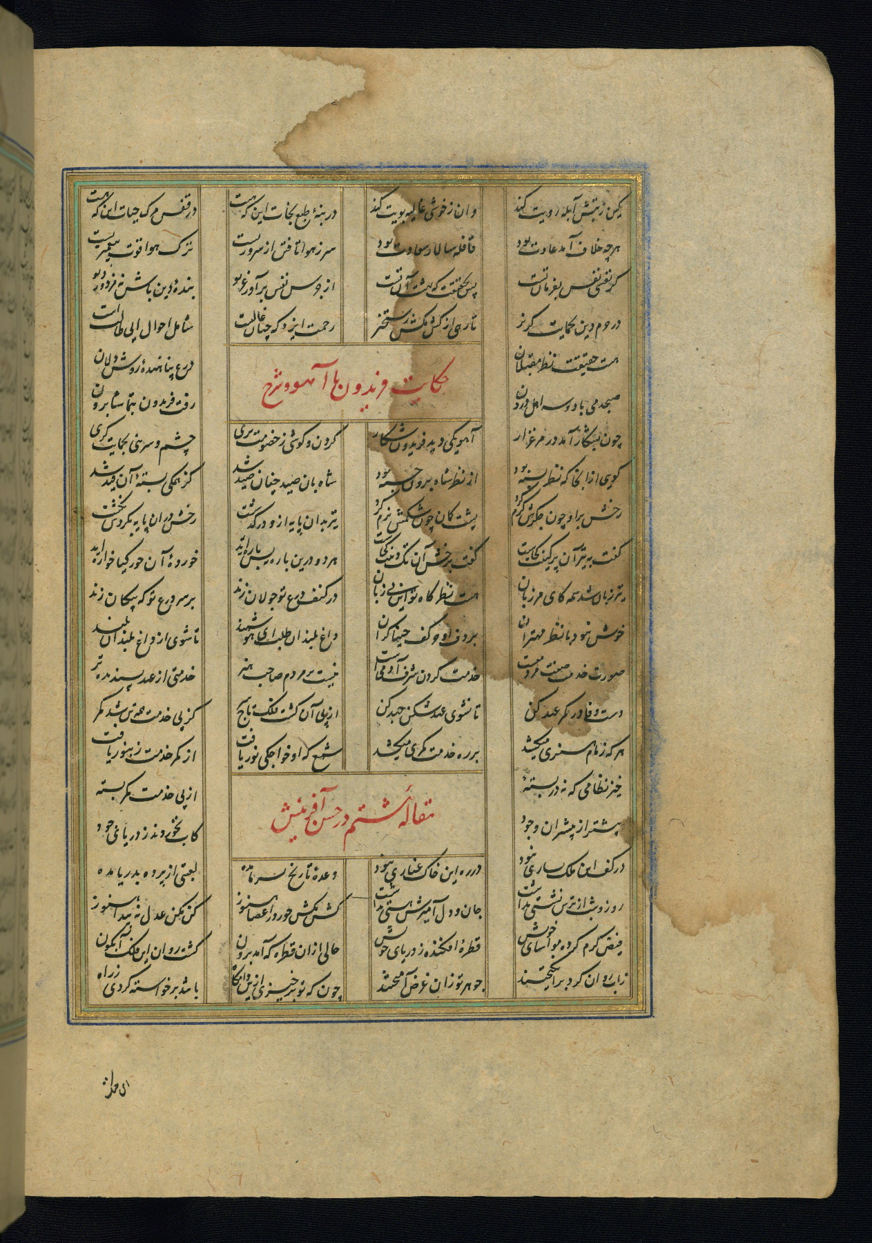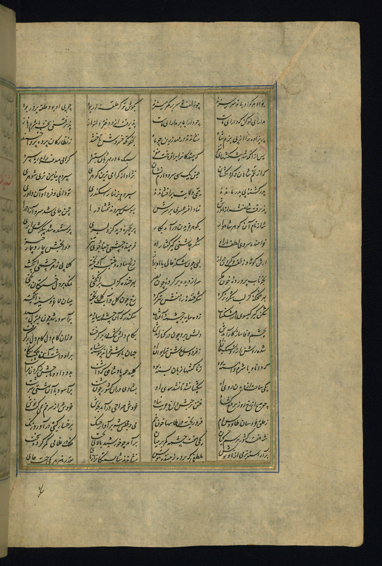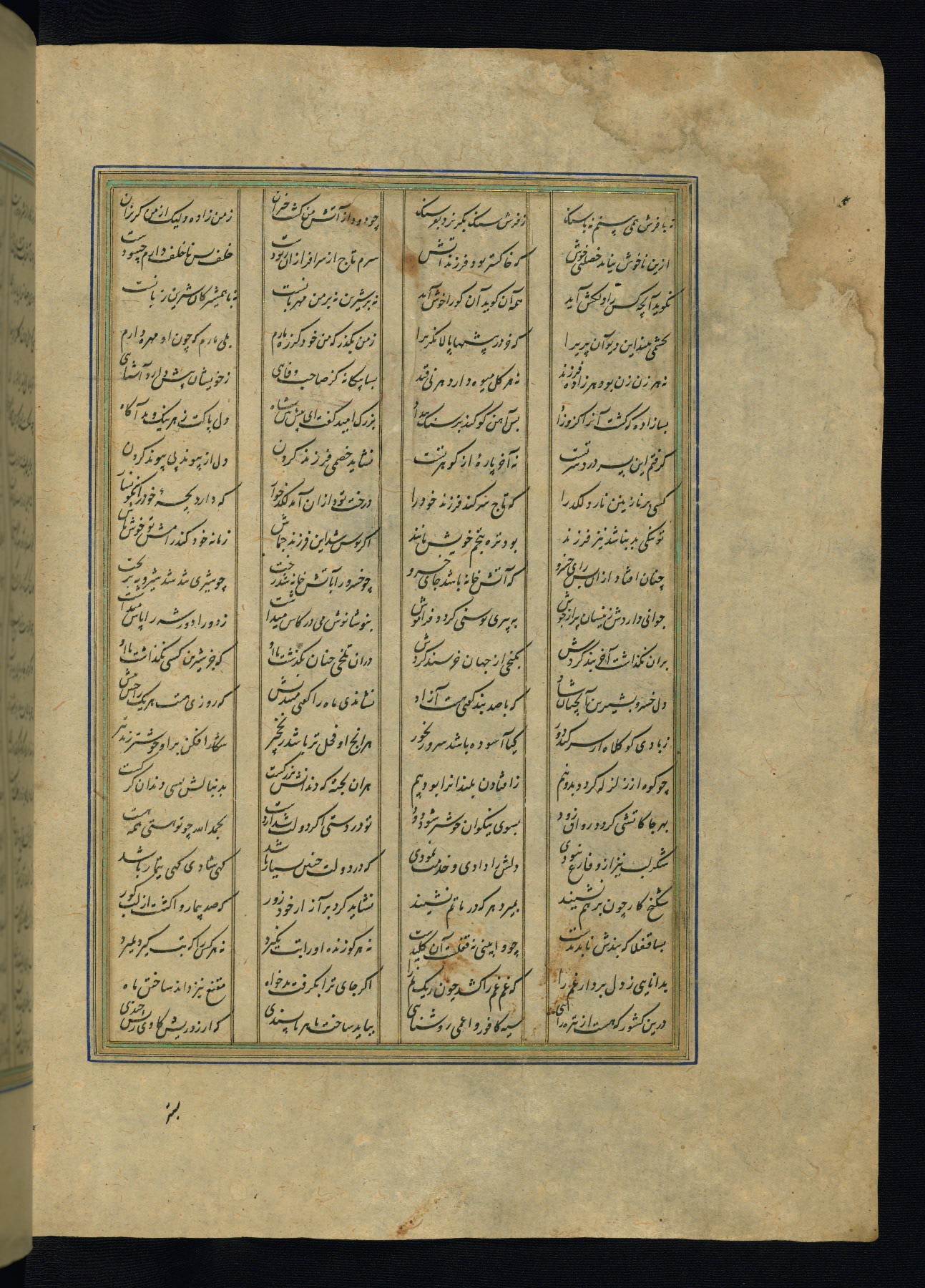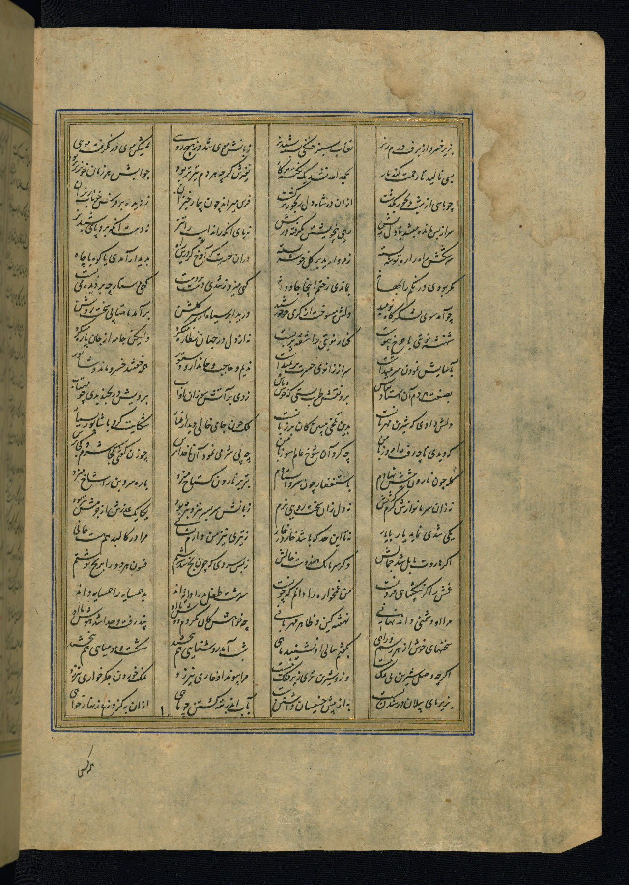 This is an illuminated and illustrated copy of the Khamsah (quintet) by Niẓāmī Ganjavī (d. 605 AH / 1209 CE), completed by Ḥabīb Allāh ibn ʿAlī ibn Ḥusām in Safavid Iran in Rabīʿ II 971 AH / 1563 CE. Illuminated titlepieces introduce the five poems, and there are thirty illustrations, the majority of which are attributable to thirteenth century AH / nineteenth CE Qajar Iran. Ownership notes and seals indicating the provenance of this manuscript are found throughout the codex (fols. 1a, 2a, 153a, 177a, 233a, 349a, and 351a). The binding is not original to the manuscript.