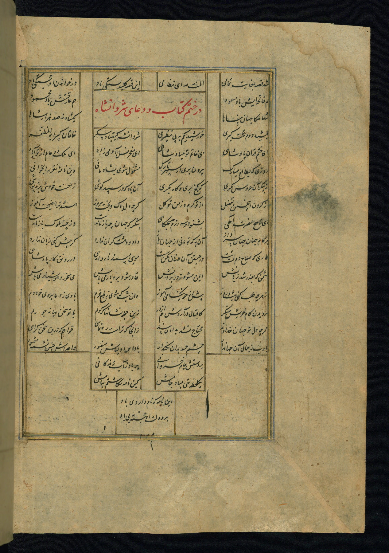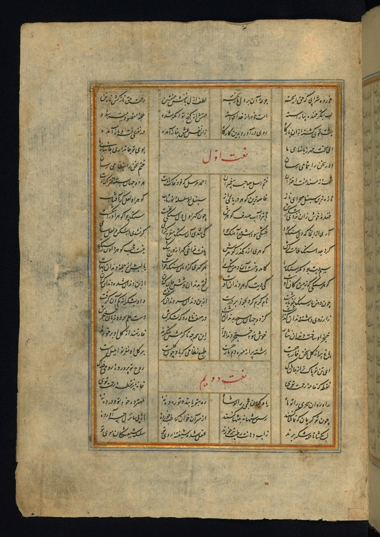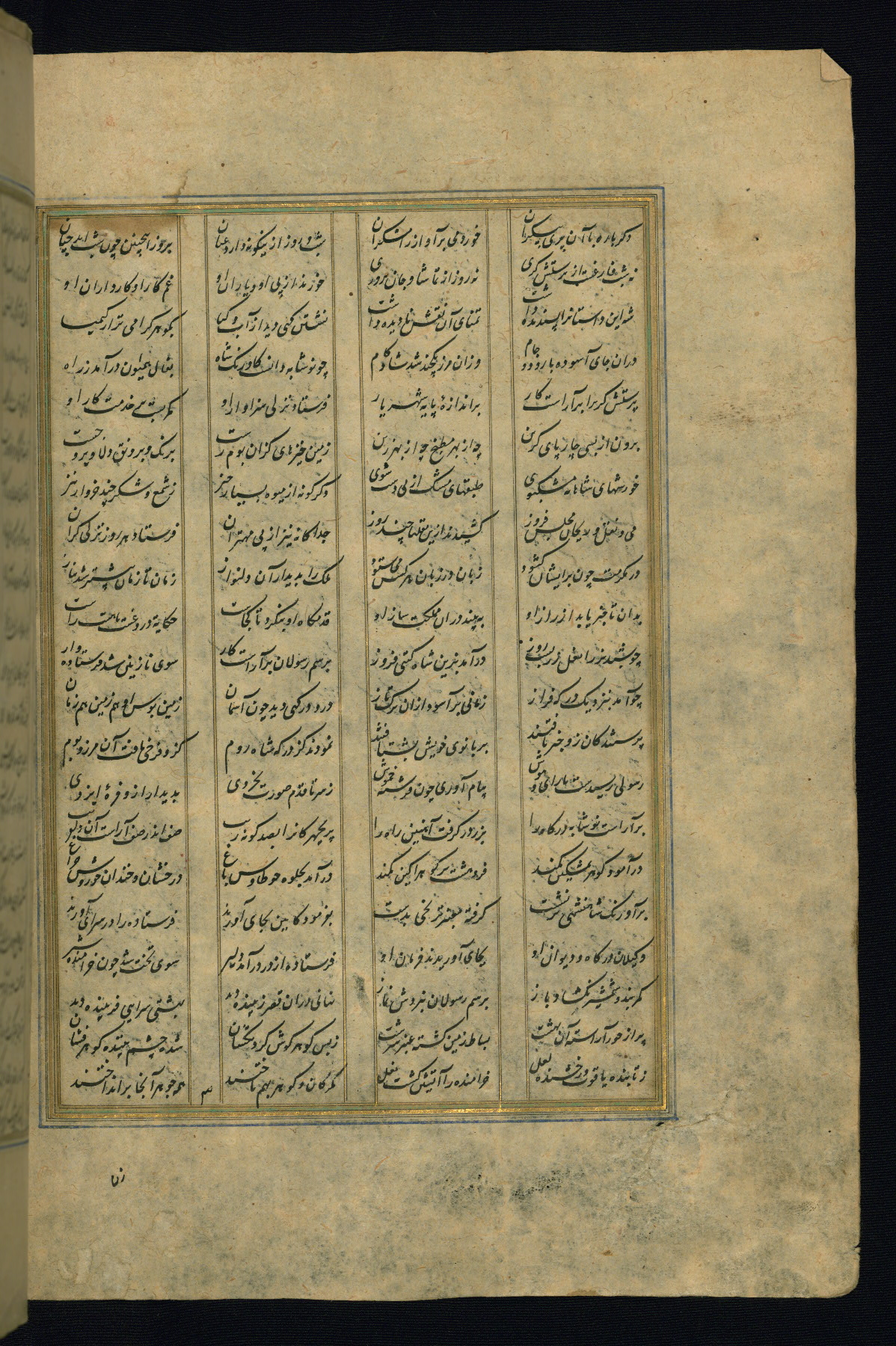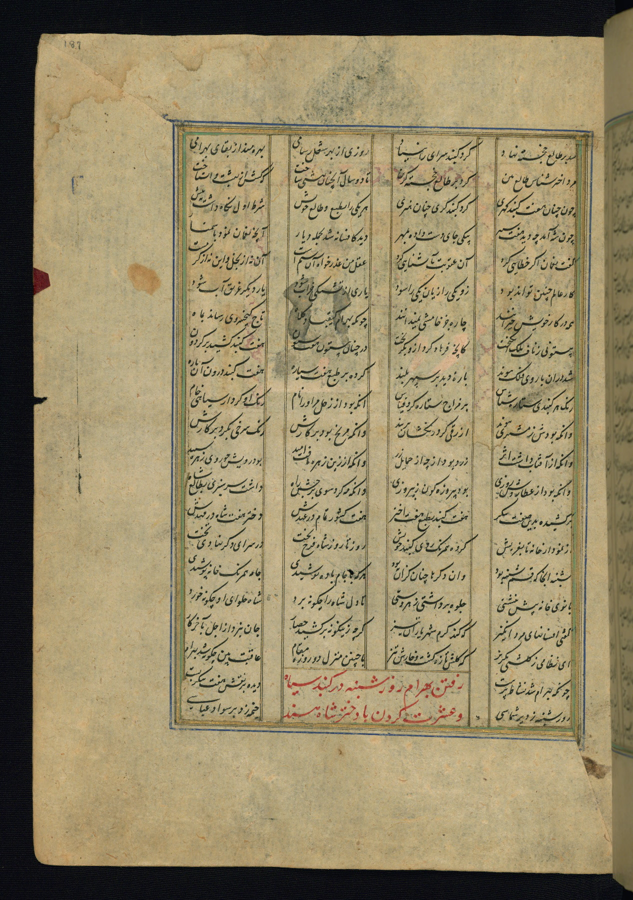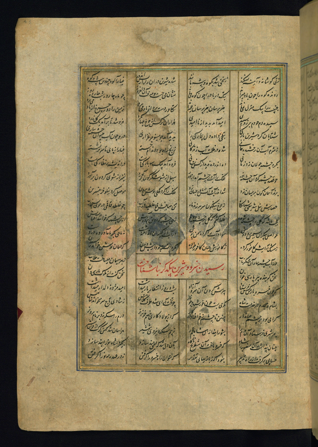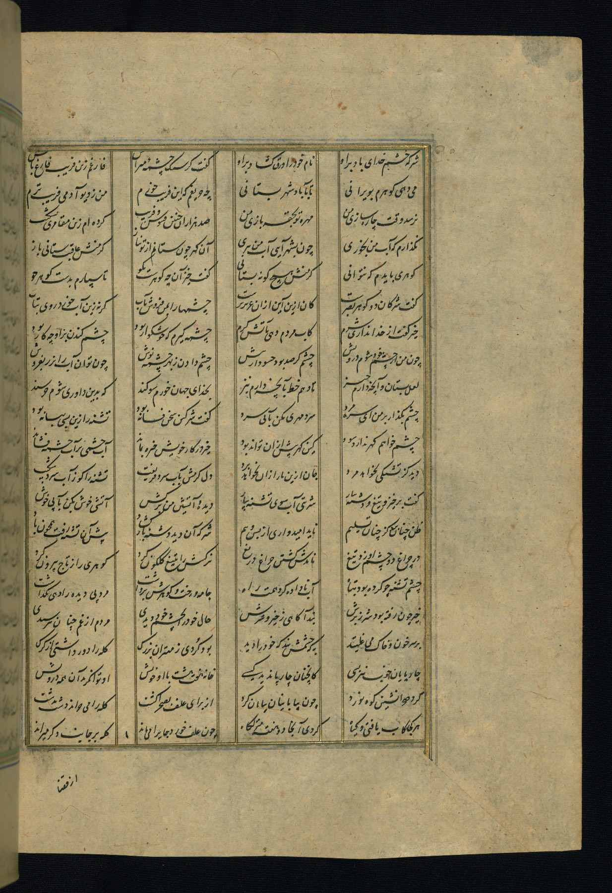 This is an illuminated and illustrated copy of the Khamsah (quintet) by Niẓāmī Ganjavī (d. 605 AH / 1209 CE), completed by Ḥabīb Allāh ibn ʿAlī ibn Ḥusām in Safavid Iran in Rabīʿ II 971 AH / 1563 CE. Illuminated titlepieces introduce the five poems, and there are thirty illustrations, the majority of which are attributable to thirteenth century AH / nineteenth CE Qajar Iran. Ownership notes and seals indicating the provenance of this manuscript are found throughout the codex (fols. 1a, 2a, 153a, 177a, 233a, 349a, and 351a). The binding is not original to the manuscript.