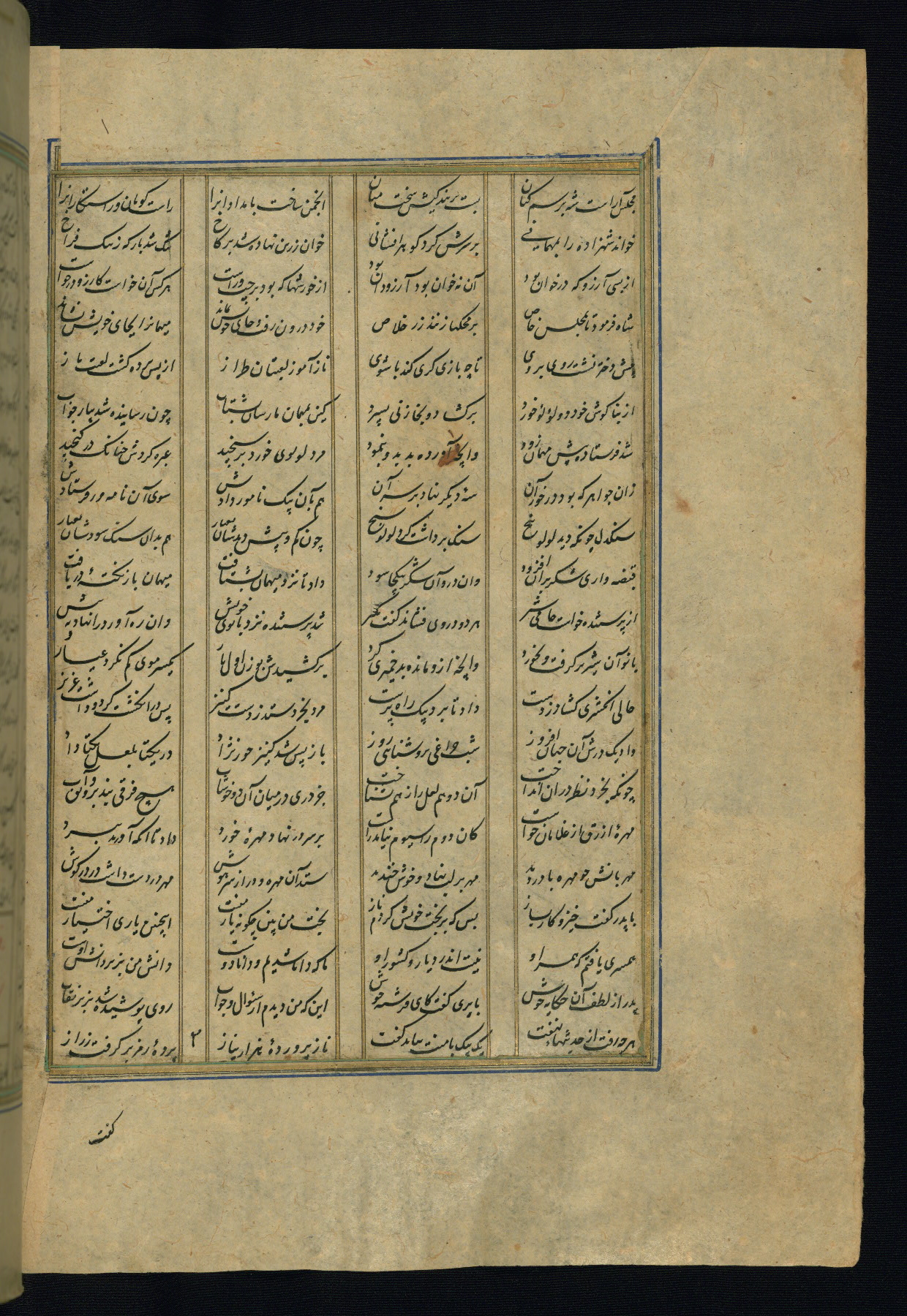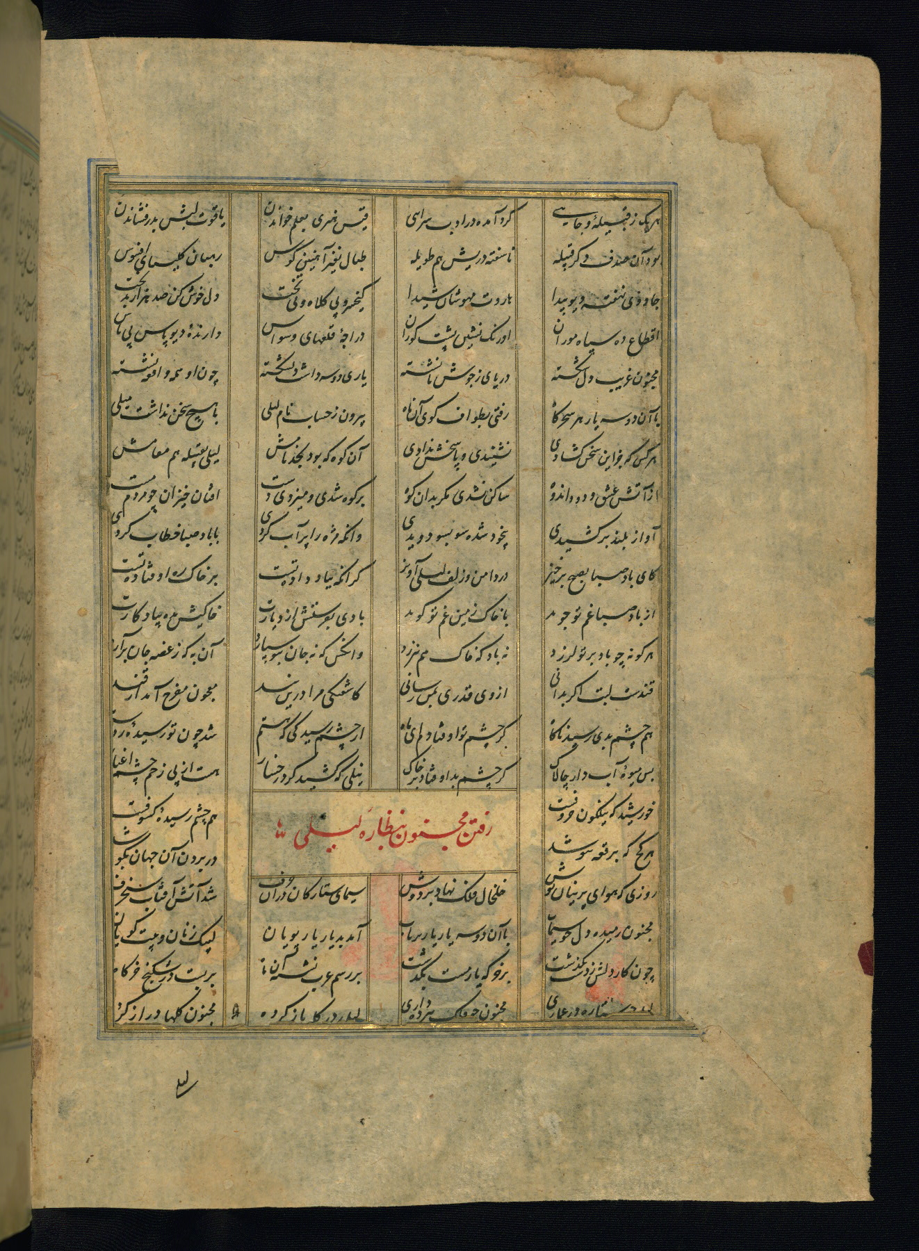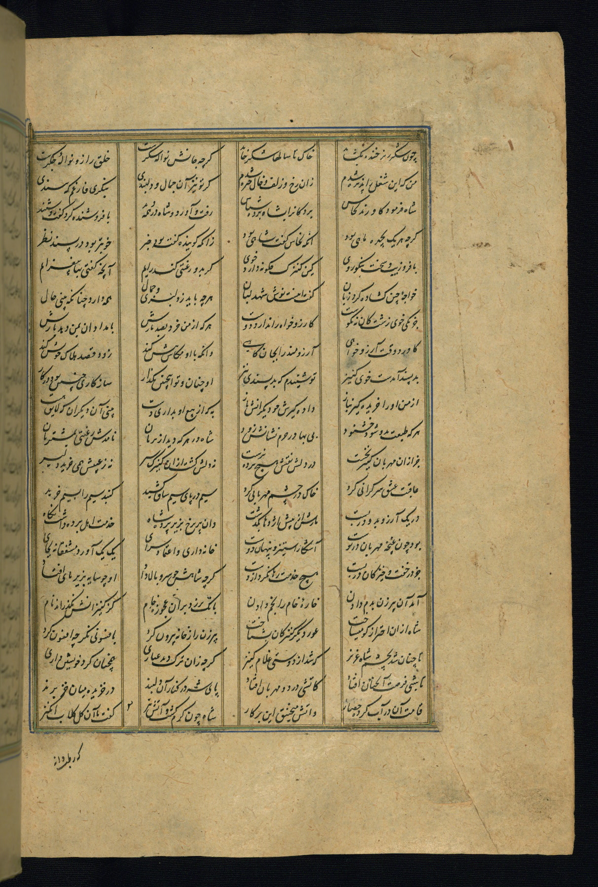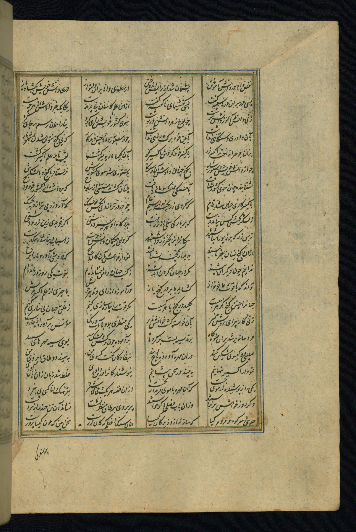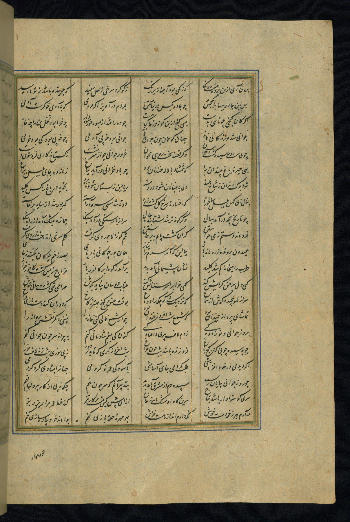This is an illuminated and illustrated copy of the Khamsah (quintet) by Niẓāmī Ganjavī (d. 605 AH / 1209 CE), completed by Ḥabīb Allāh ibn ʿAlī ibn Ḥusām in Safavid Iran in Rabīʿ II 971 AH / 1563 CE. Illuminated titlepieces introduce the five poems, and there are thirty illustrations, the majority of which are attributable to thirteenth century AH / nineteenth CE Qajar Iran. Ownership notes and seals indicating the provenance of this manuscript are found throughout the codex (fols. 1a, 2a, 153a, 177a, 233a, 349a, and 351a). The binding is not original to the manuscript.