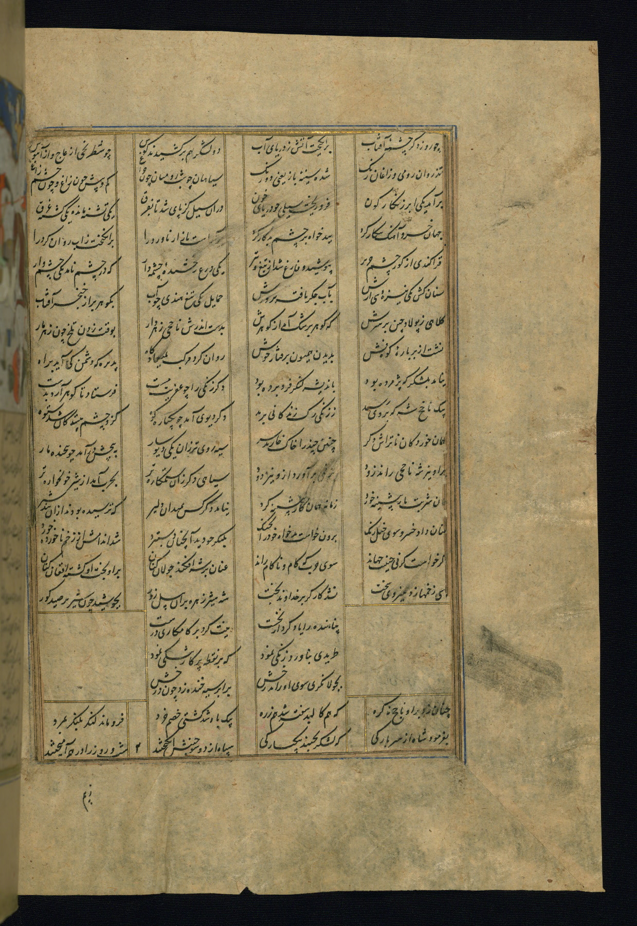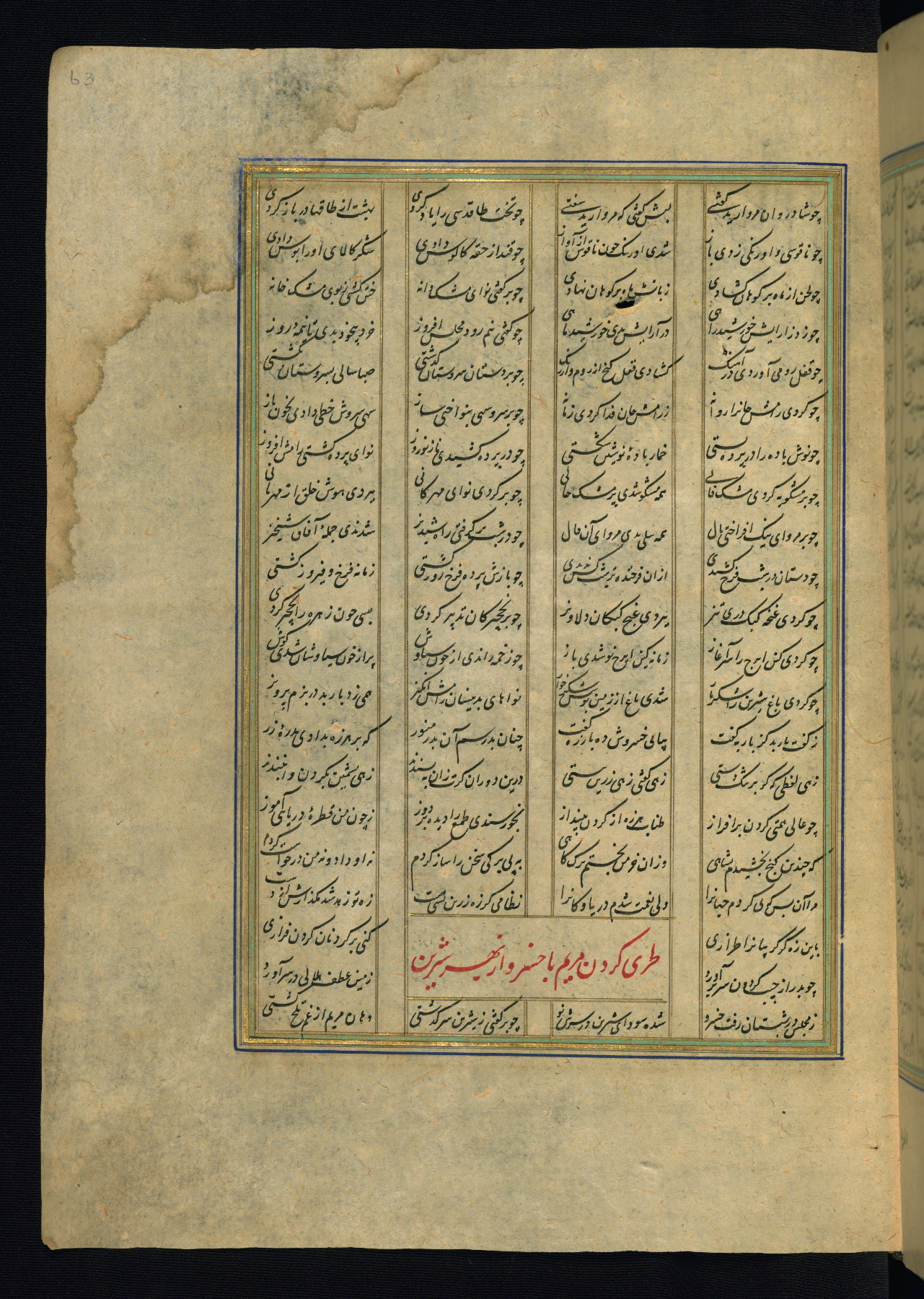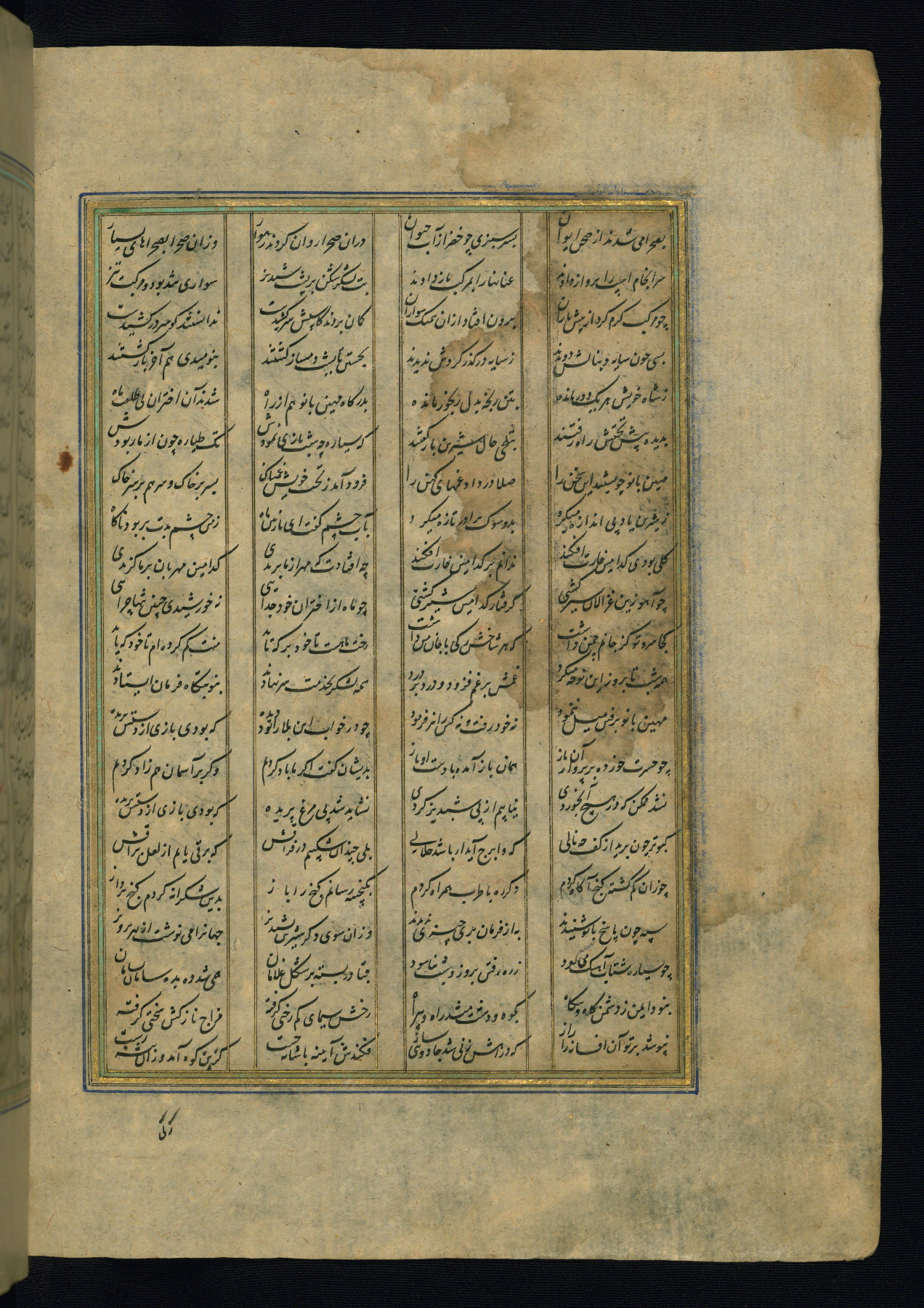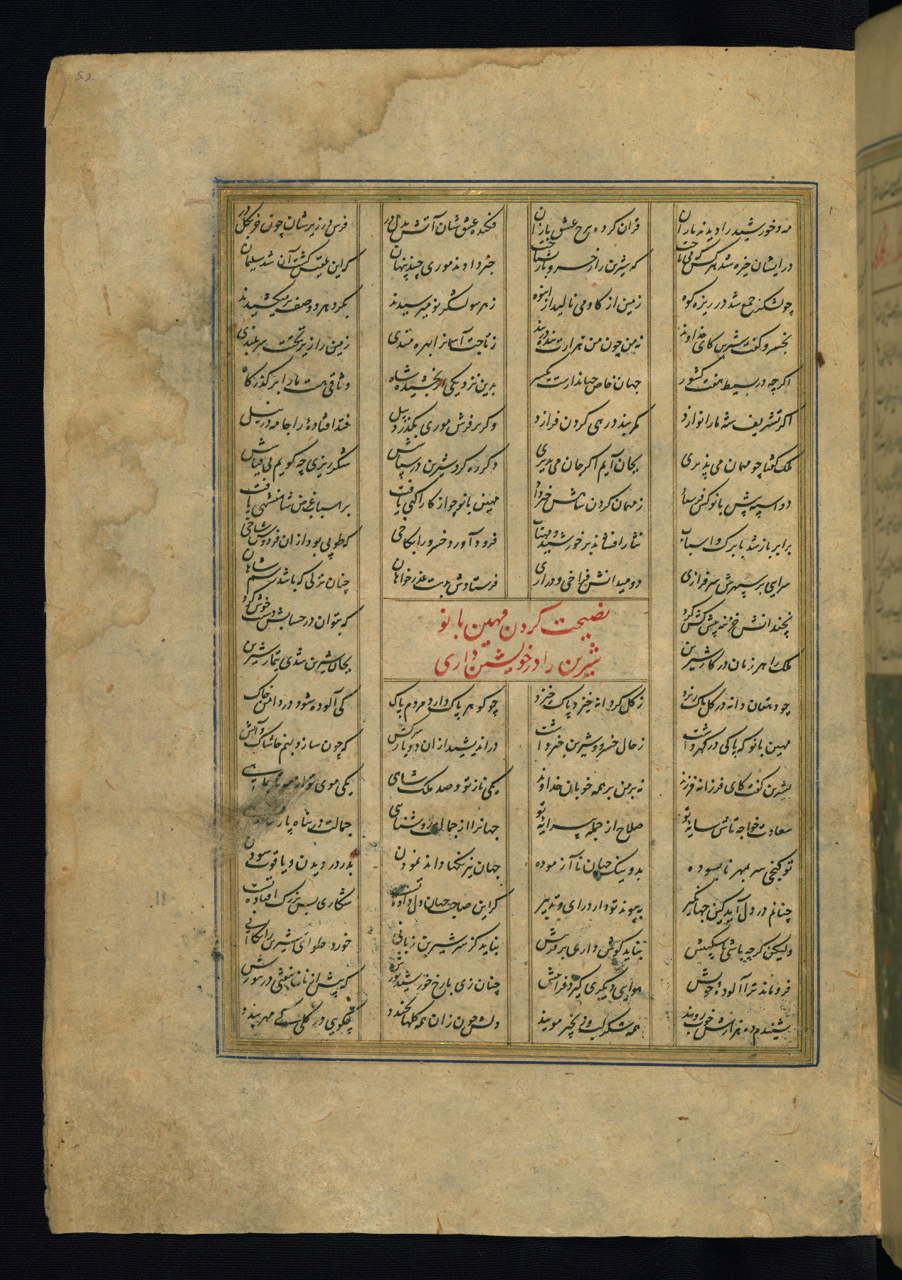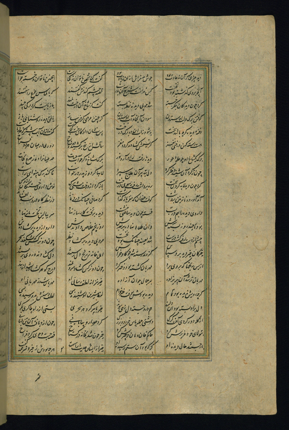 This is an illuminated and illustrated copy of the Khamsah (quintet) by Niẓāmī Ganjavī (d. 605 AH / 1209 CE), completed by Ḥabīb Allāh ibn ʿAlī ibn Ḥusām in Safavid Iran in Rabīʿ II 971 AH / 1563 CE. Illuminated titlepieces introduce the five poems, and there are thirty illustrations, the majority of which are attributable to thirteenth century AH / nineteenth CE Qajar Iran. Ownership notes and seals indicating the provenance of this manuscript are found throughout the codex (fols. 1a, 2a, 153a, 177a, 233a, 349a, and 351a). The binding is not original to the manuscript.