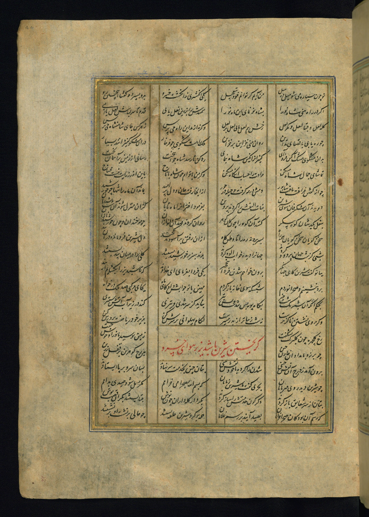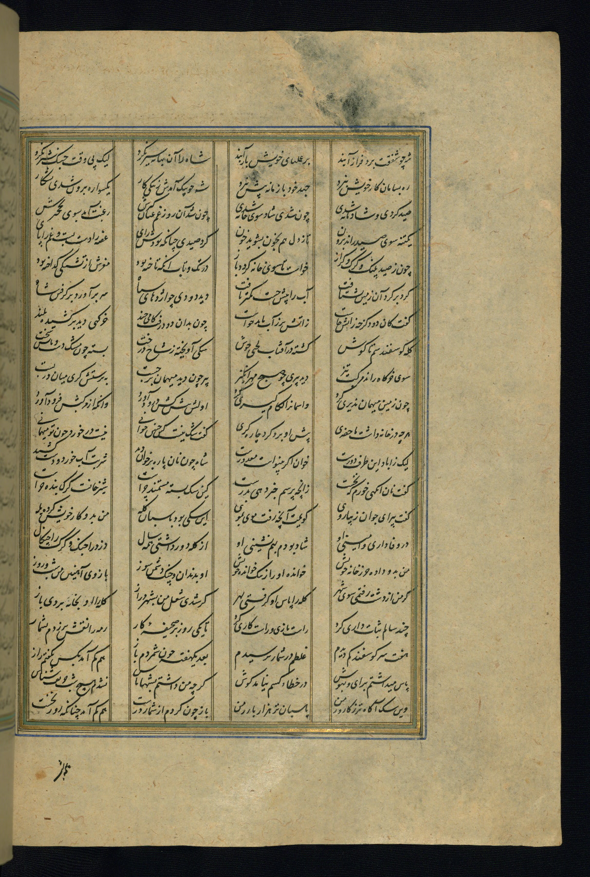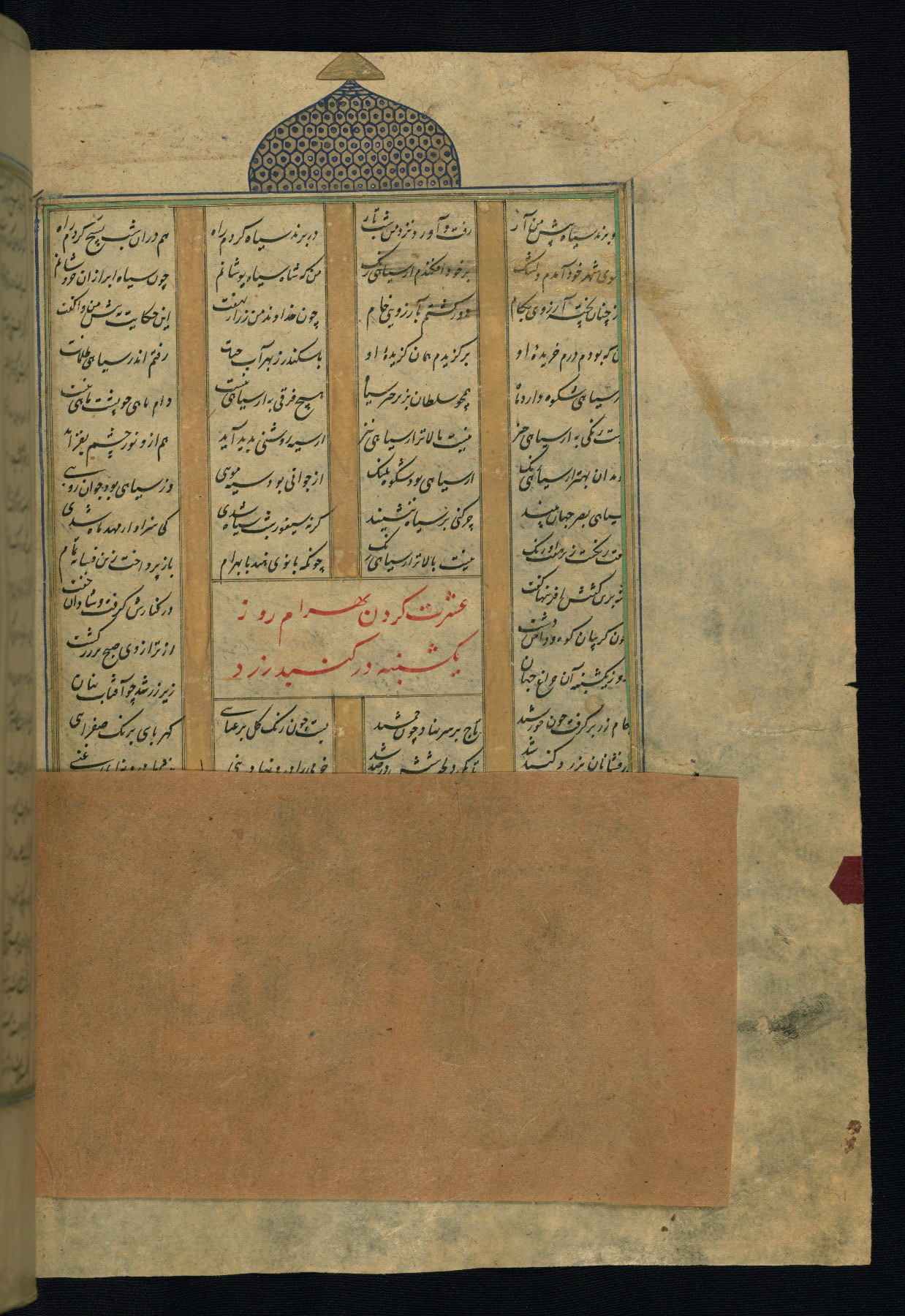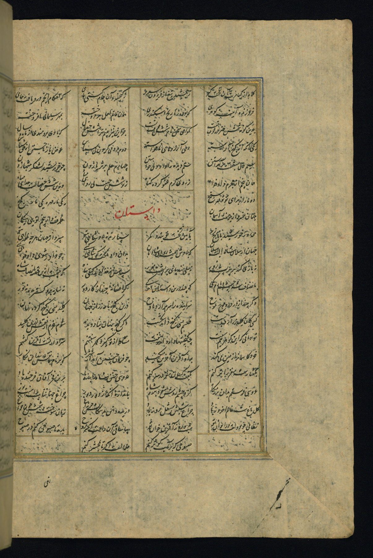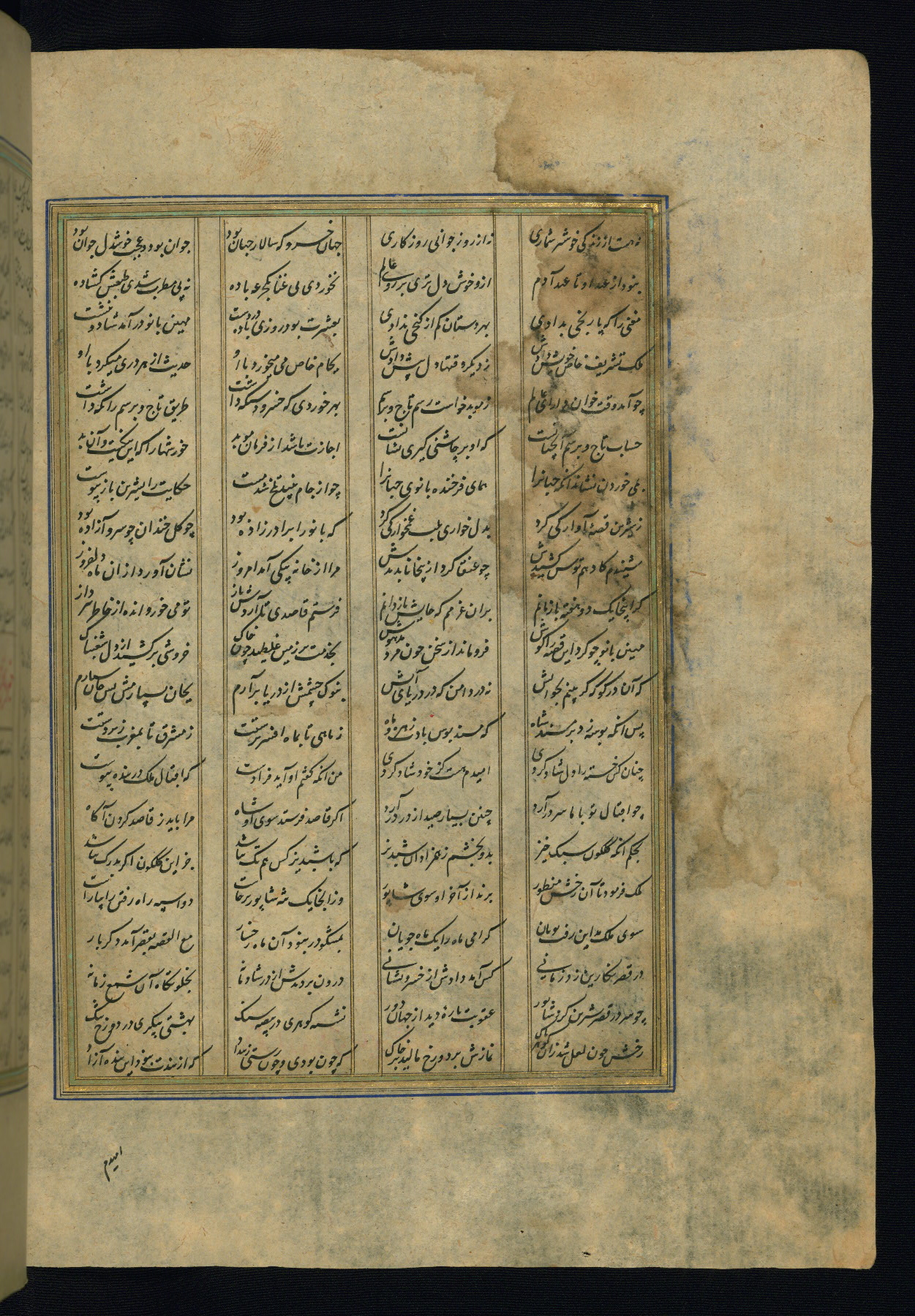 This is an illuminated and illustrated copy of the Khamsah (quintet) by Niẓāmī Ganjavī (d. 605 AH / 1209 CE), completed by Ḥabīb Allāh ibn ʿAlī ibn Ḥusām in Safavid Iran in Rabīʿ II 971 AH / 1563 CE. Illuminated titlepieces introduce the five poems, and there are thirty illustrations, the majority of which are attributable to thirteenth century AH / nineteenth CE Qajar Iran. Ownership notes and seals indicating the provenance of this manuscript are found throughout the codex (fols. 1a, 2a, 153a, 177a, 233a, 349a, and 351a). The binding is not original to the manuscript.