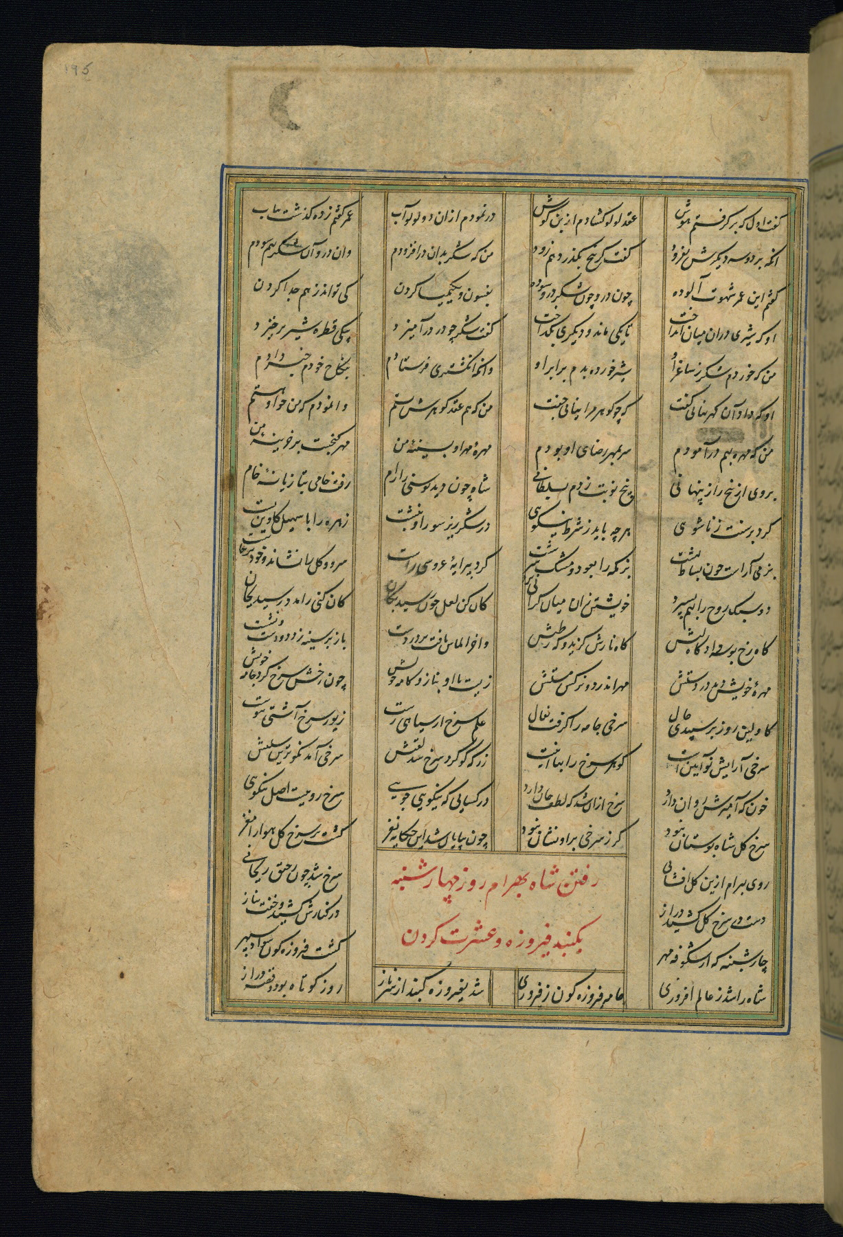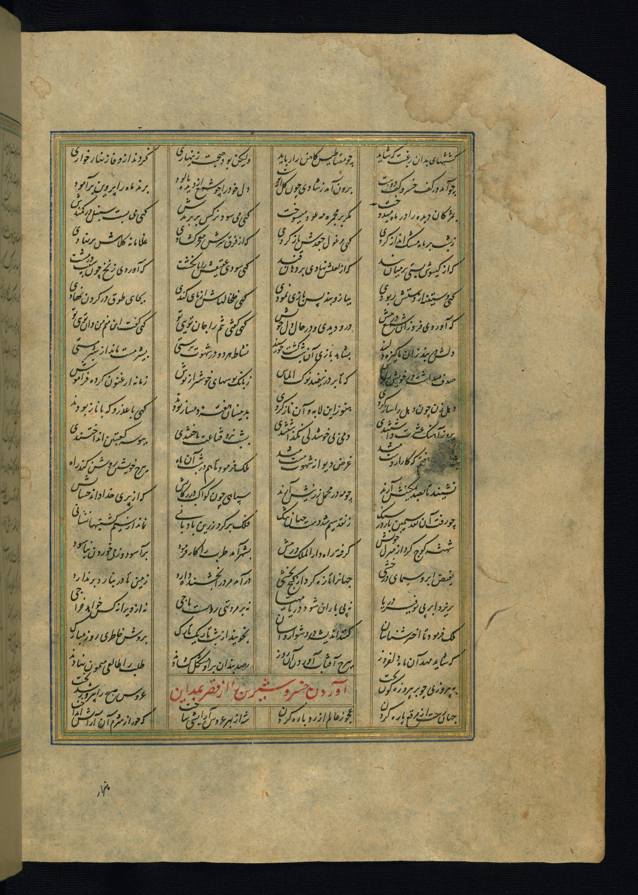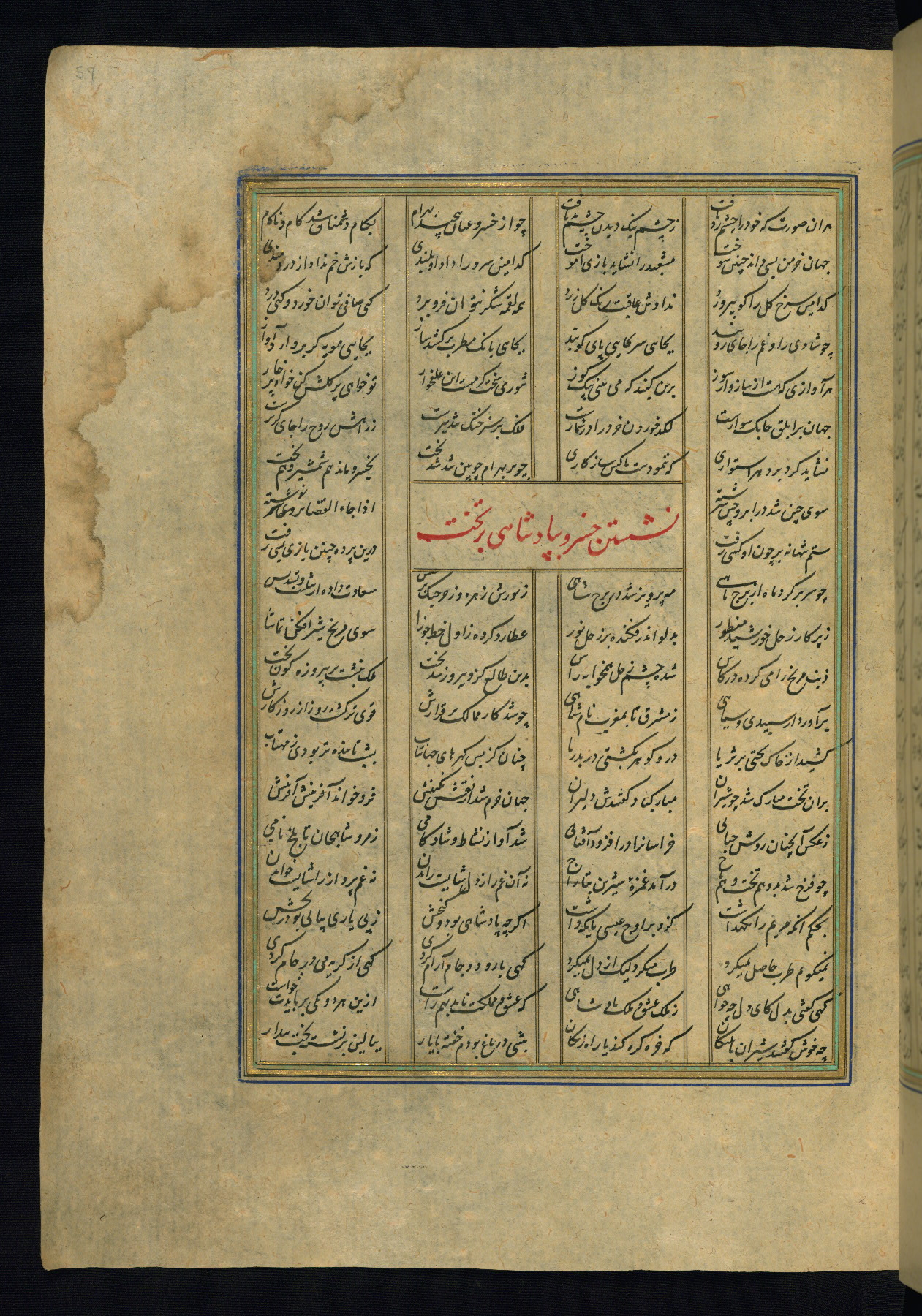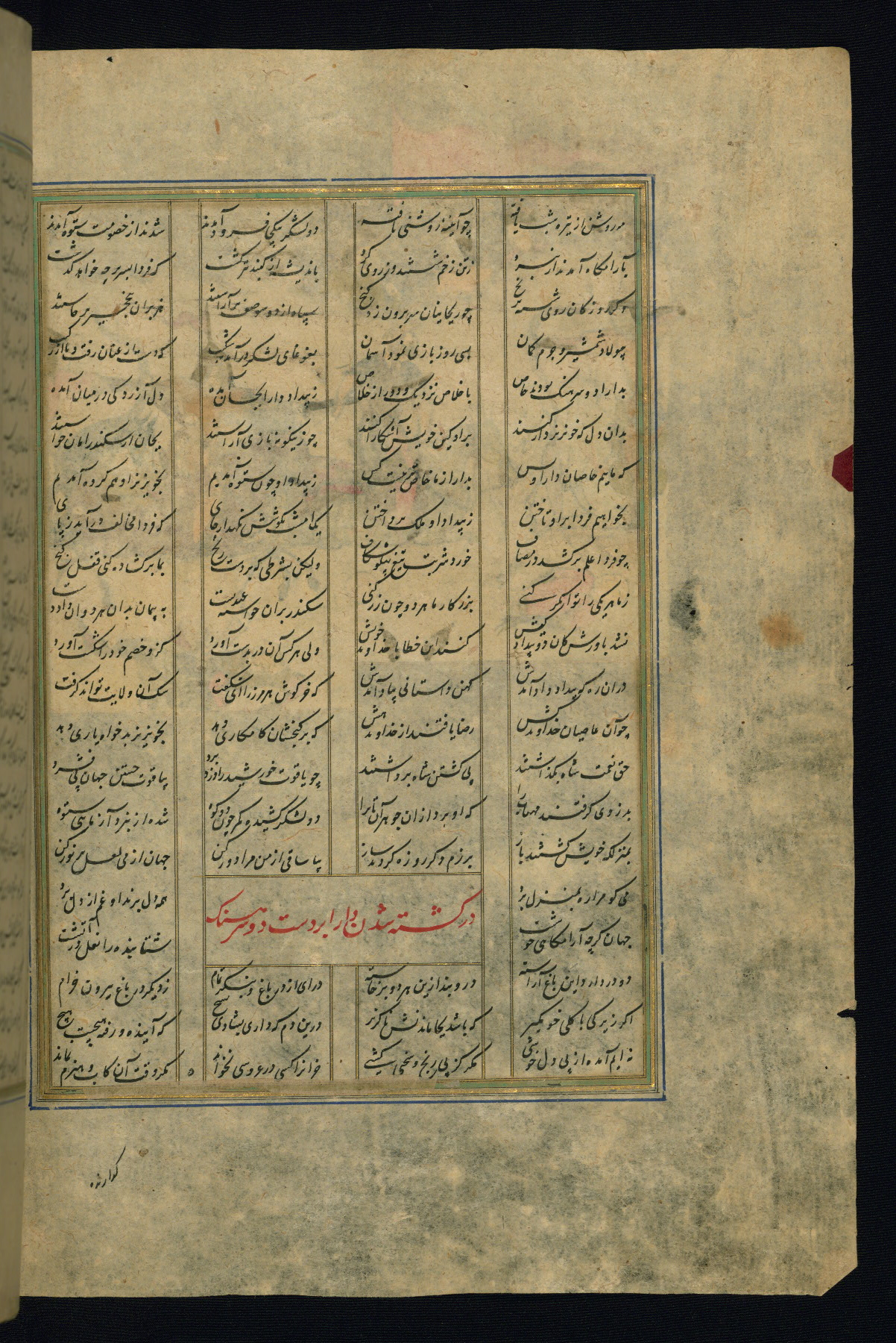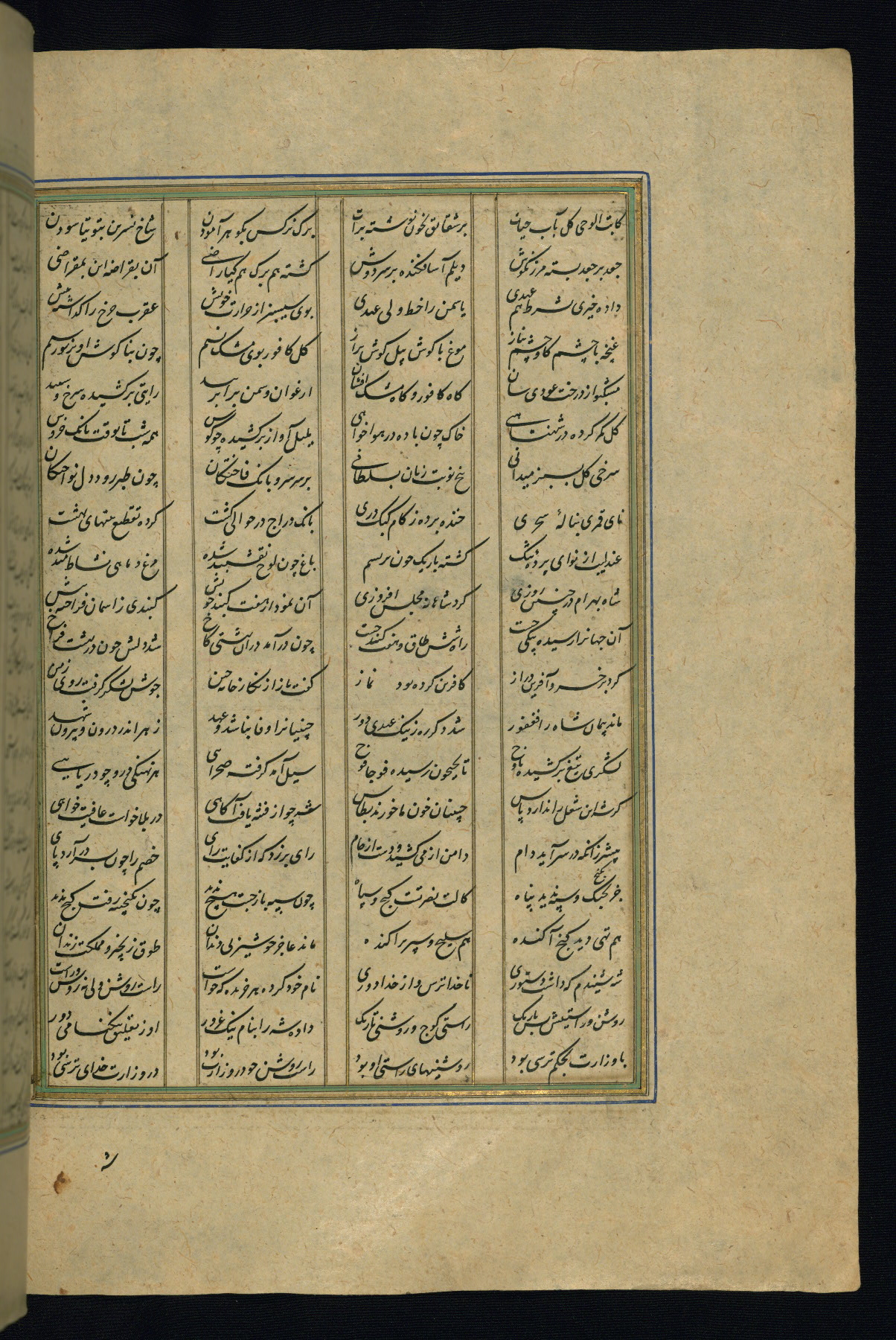 This is an illuminated and illustrated copy of the Khamsah (quintet) by Niẓāmī Ganjavī (d. 605 AH / 1209 CE), completed by Ḥabīb Allāh ibn ʿAlī ibn Ḥusām in Safavid Iran in Rabīʿ II 971 AH / 1563 CE. Illuminated titlepieces introduce the five poems, and there are thirty illustrations, the majority of which are attributable to thirteenth century AH / nineteenth CE Qajar Iran. Ownership notes and seals indicating the provenance of this manuscript are found throughout the codex (fols. 1a, 2a, 153a, 177a, 233a, 349a, and 351a). The binding is not original to the manuscript.