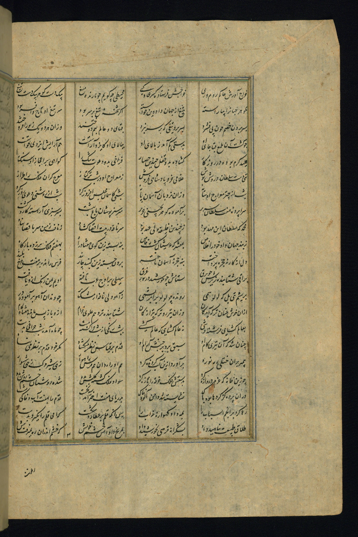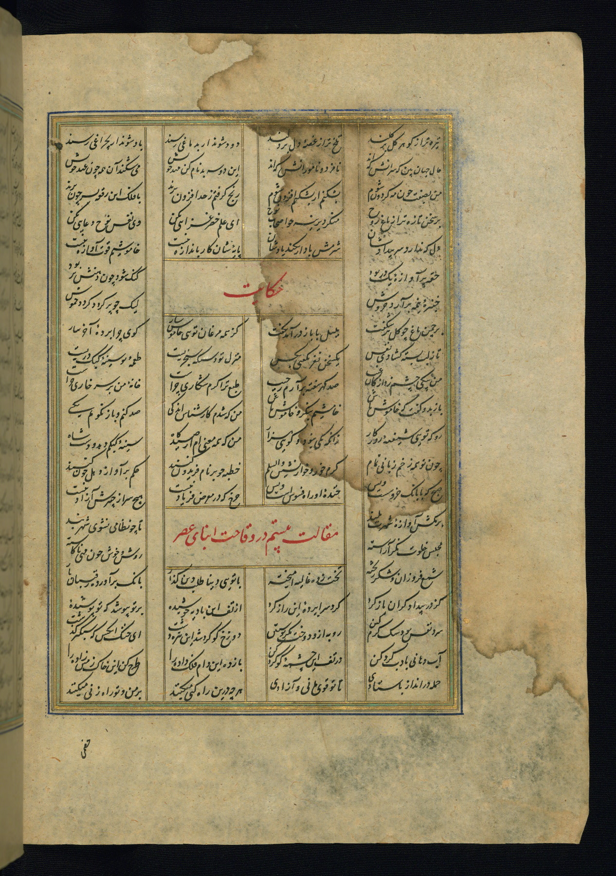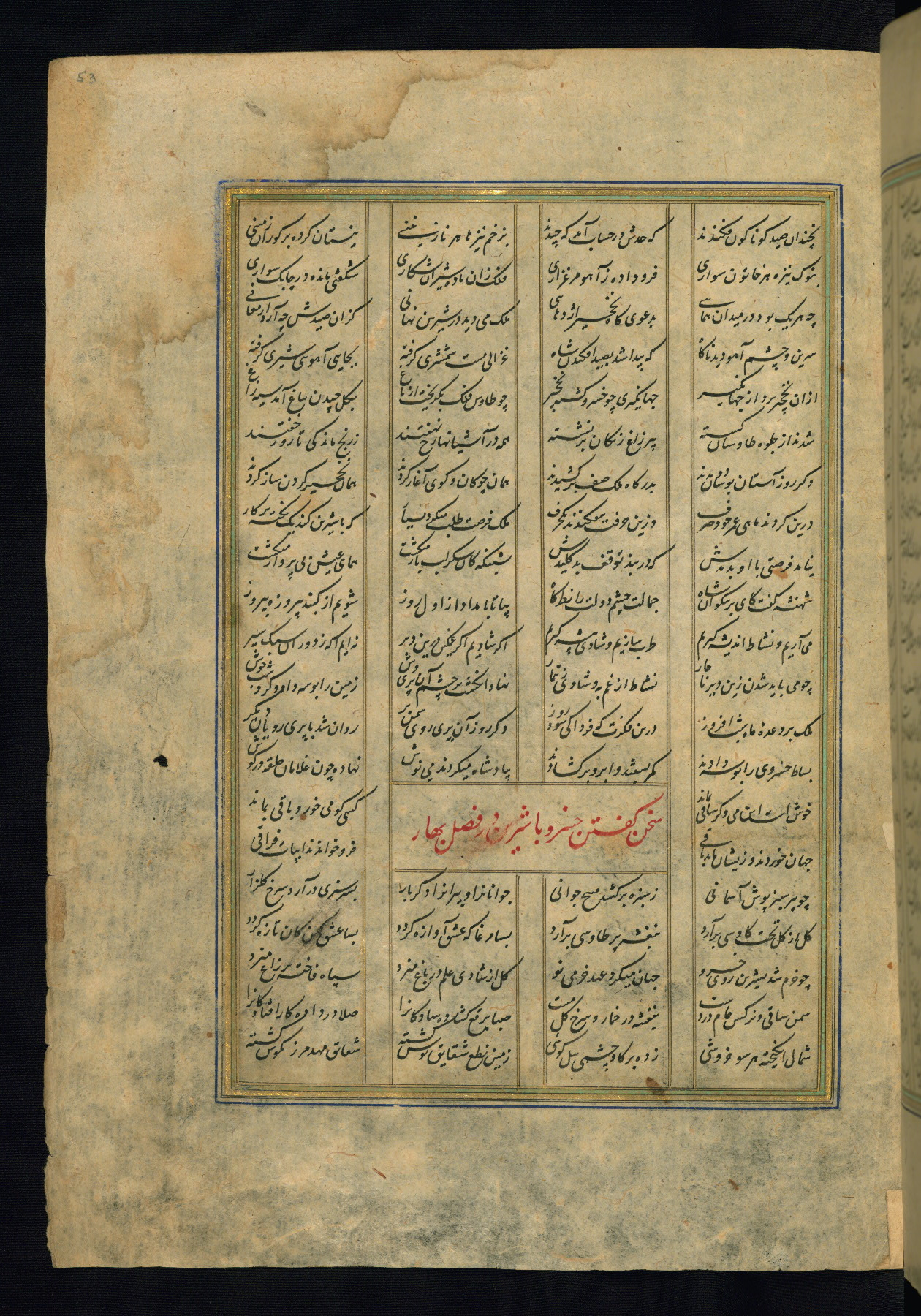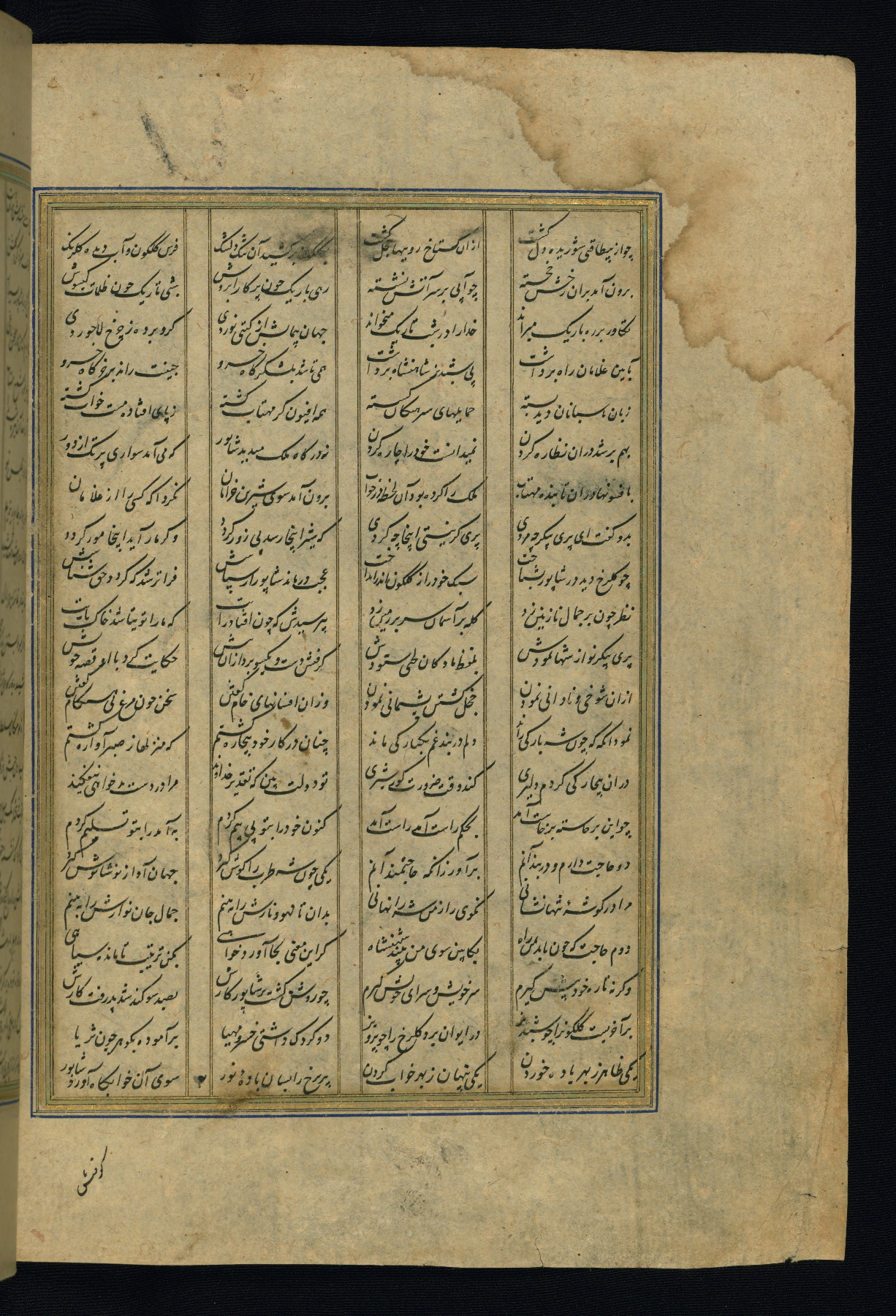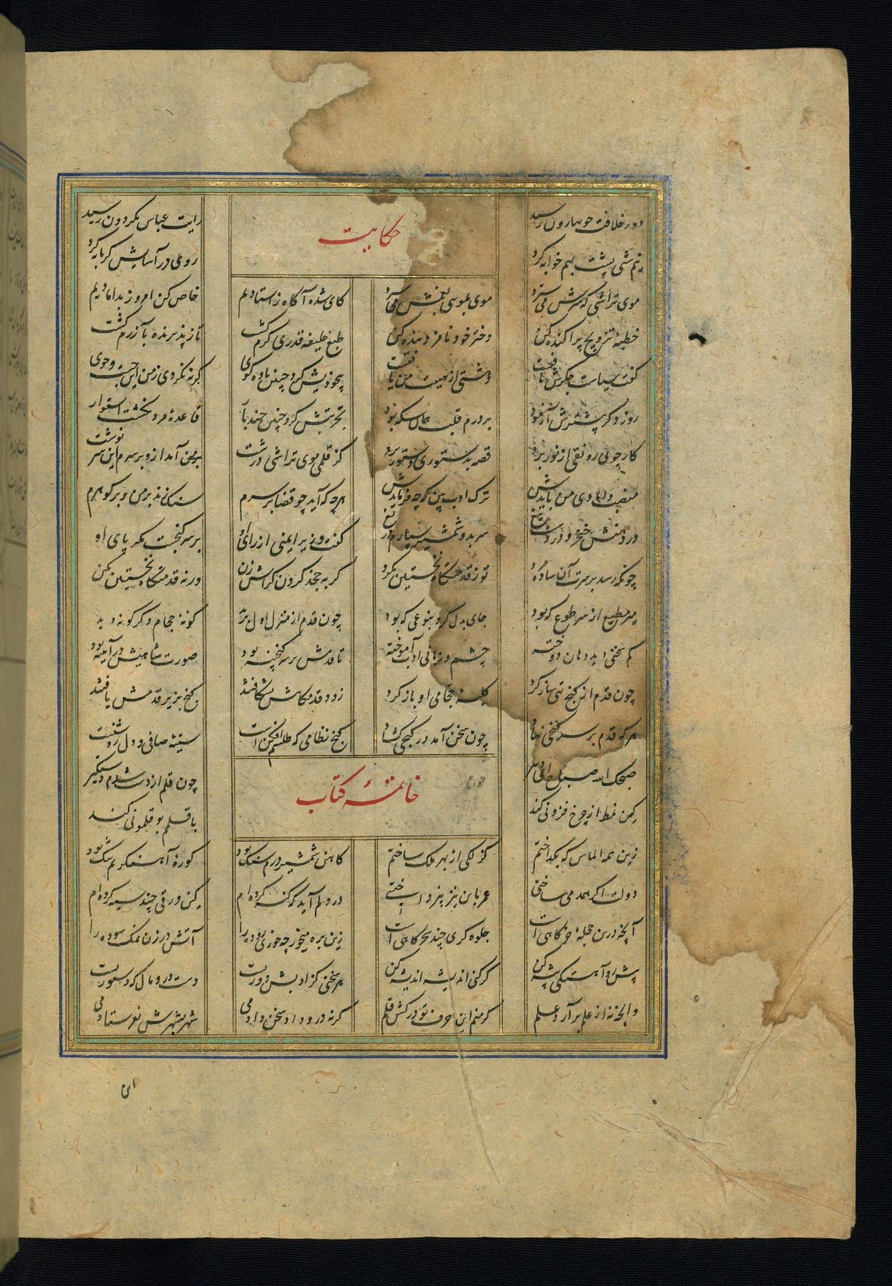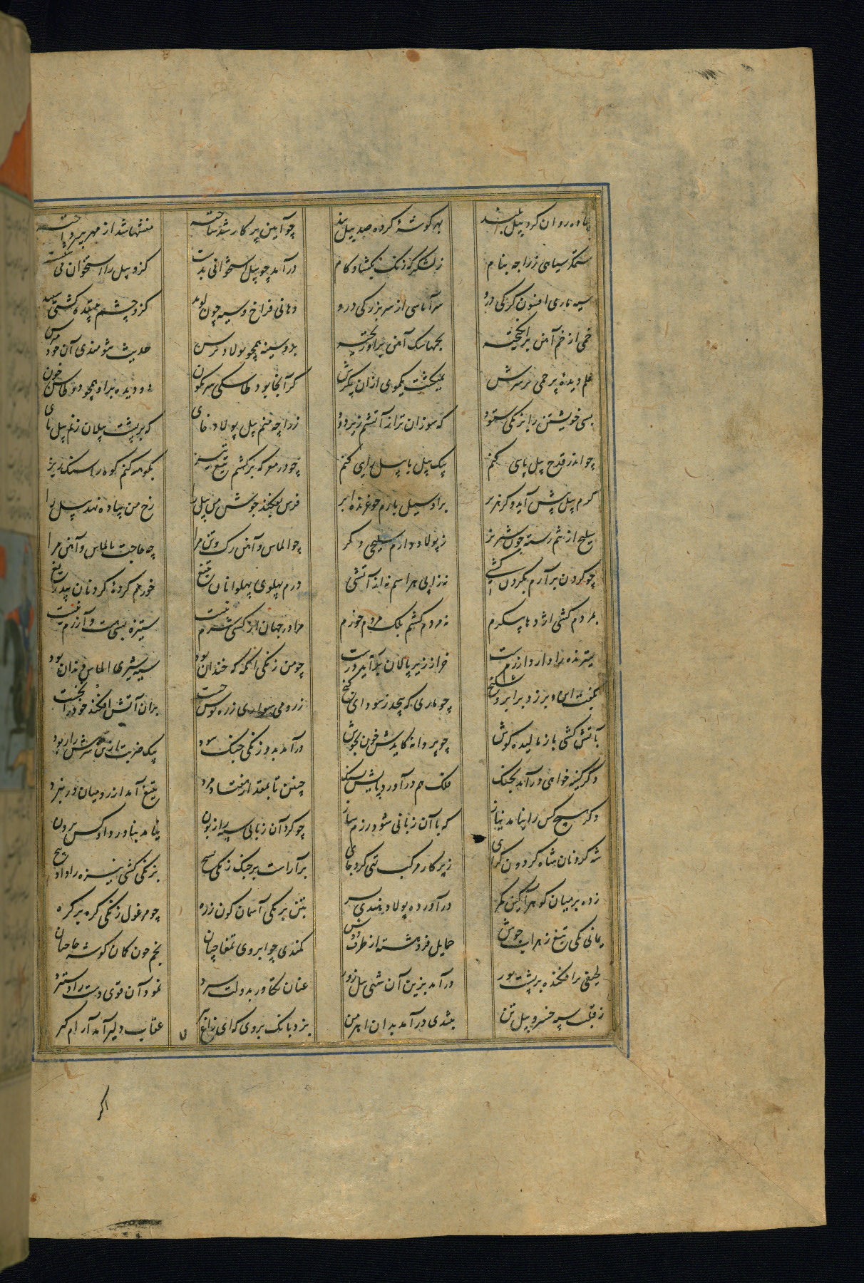 This is an illuminated and illustrated copy of the Khamsah (quintet) by Niẓāmī Ganjavī (d. 605 AH / 1209 CE), completed by Ḥabīb Allāh ibn ʿAlī ibn Ḥusām in Safavid Iran in Rabīʿ II 971 AH / 1563 CE. Illuminated titlepieces introduce the five poems, and there are thirty illustrations, the majority of which are attributable to thirteenth century AH / nineteenth CE Qajar Iran. Ownership notes and seals indicating the provenance of this manuscript are found throughout the codex (fols. 1a, 2a, 153a, 177a, 233a, 349a, and 351a). The binding is not original to the manuscript.