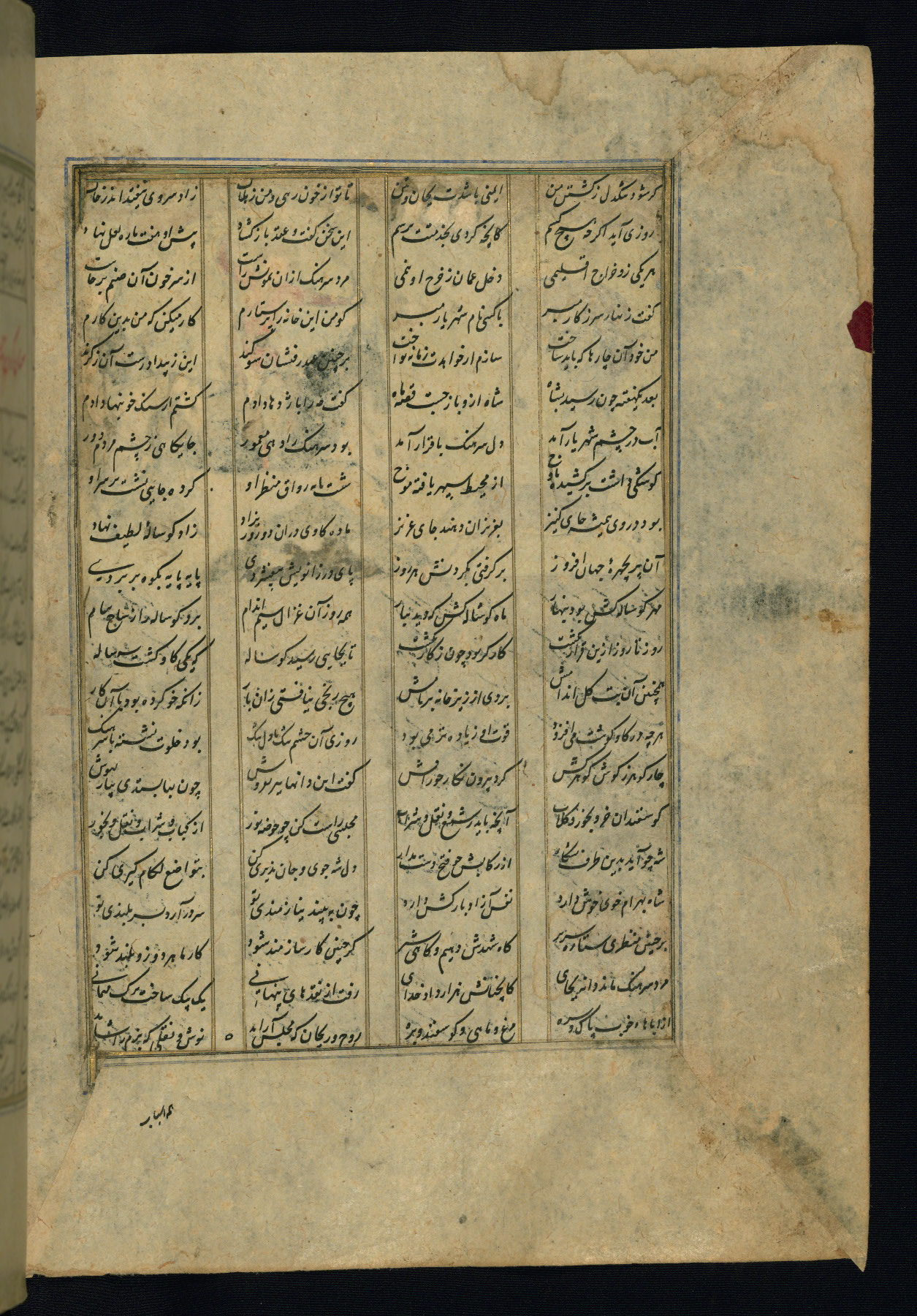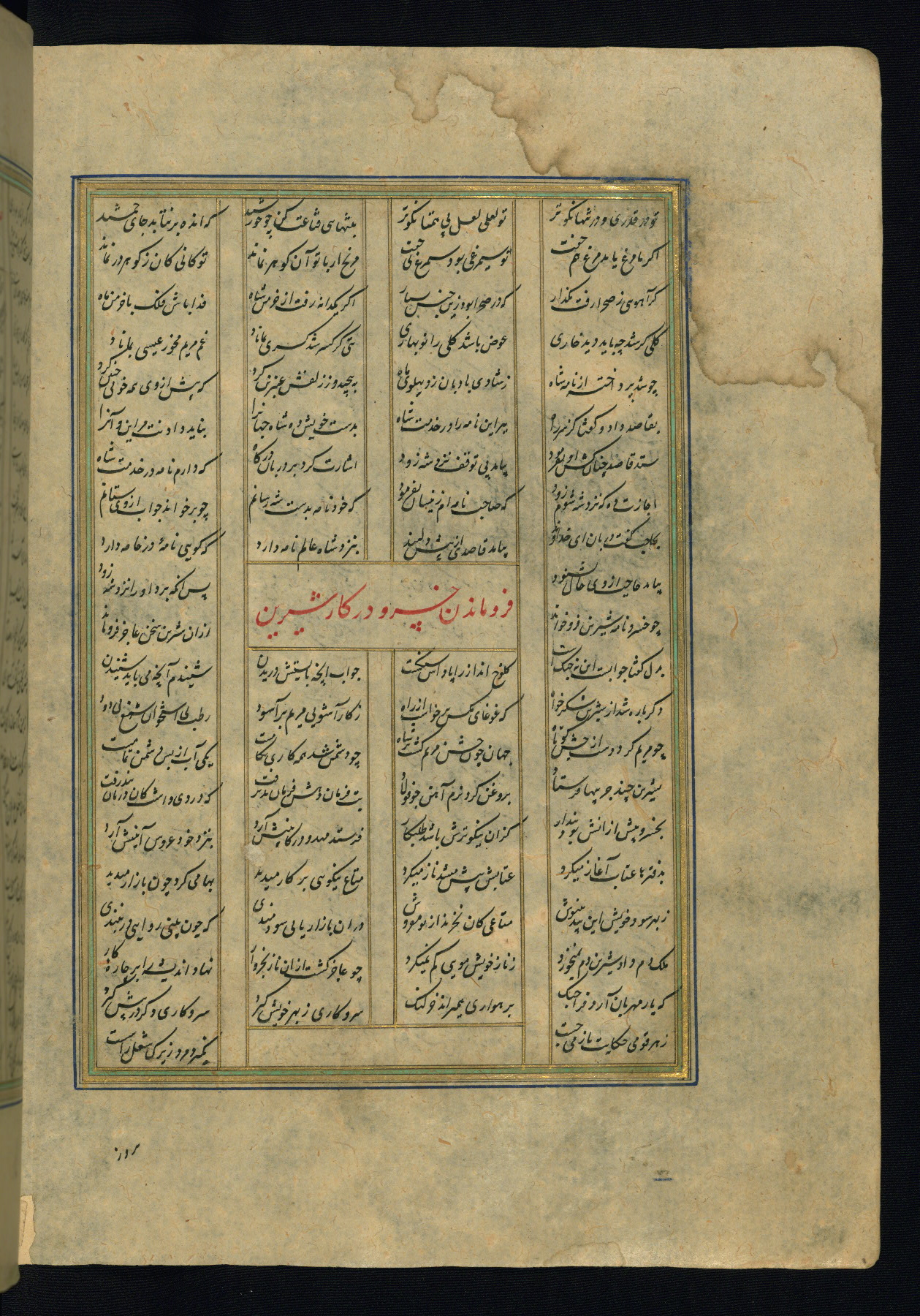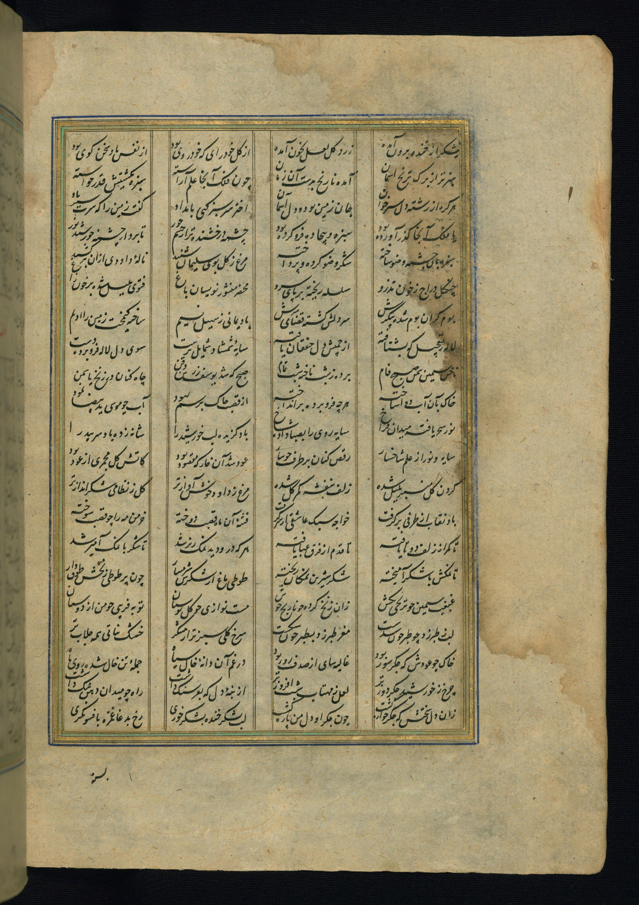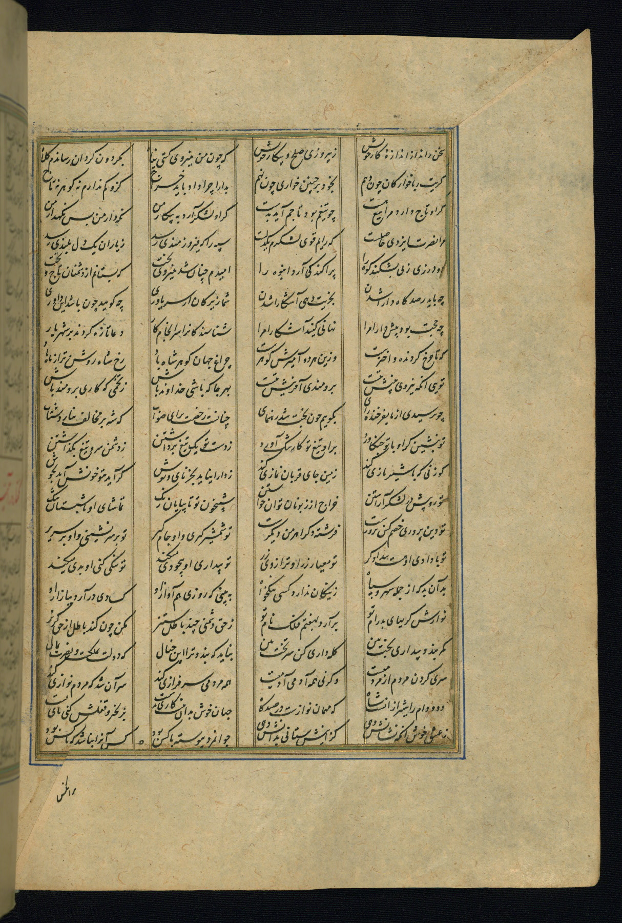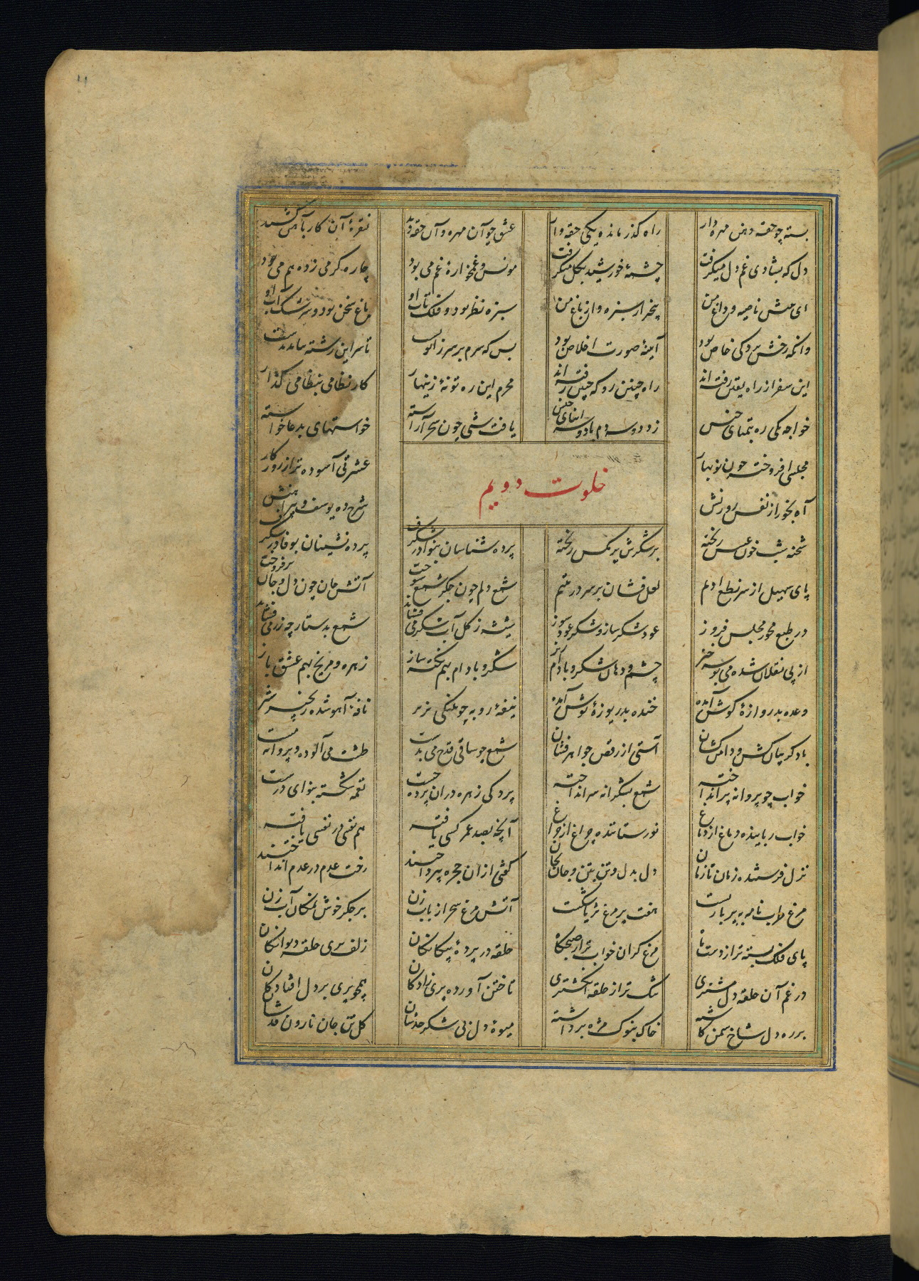 This is an illuminated and illustrated copy of the Khamsah (quintet) by Niẓāmī Ganjavī (d. 605 AH / 1209 CE), completed by Ḥabīb Allāh ibn ʿAlī ibn Ḥusām in Safavid Iran in Rabīʿ II 971 AH / 1563 CE. Illuminated titlepieces introduce the five poems, and there are thirty illustrations, the majority of which are attributable to thirteenth century AH / nineteenth CE Qajar Iran. Ownership notes and seals indicating the provenance of this manuscript are found throughout the codex (fols. 1a, 2a, 153a, 177a, 233a, 349a, and 351a). The binding is not original to the manuscript.