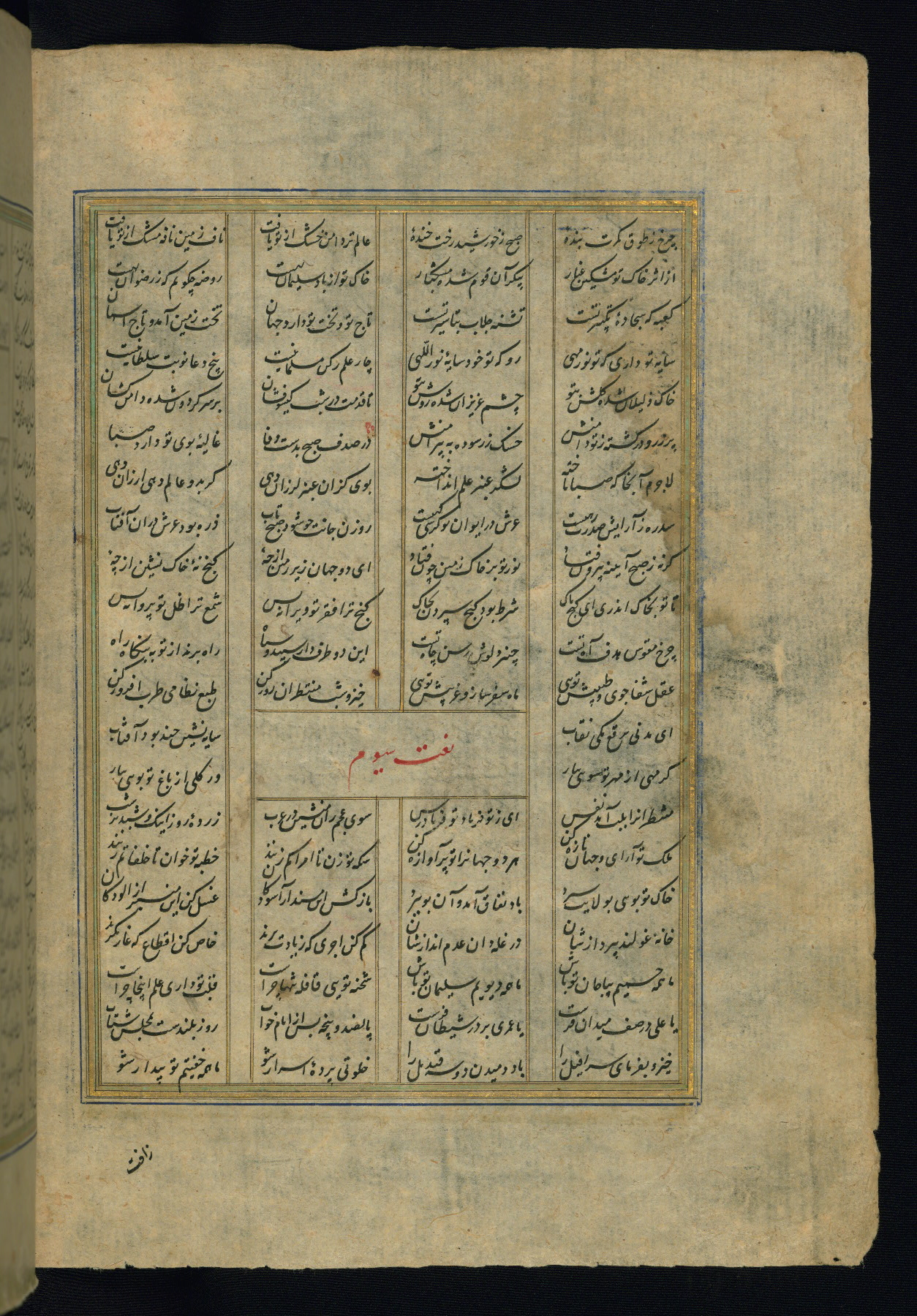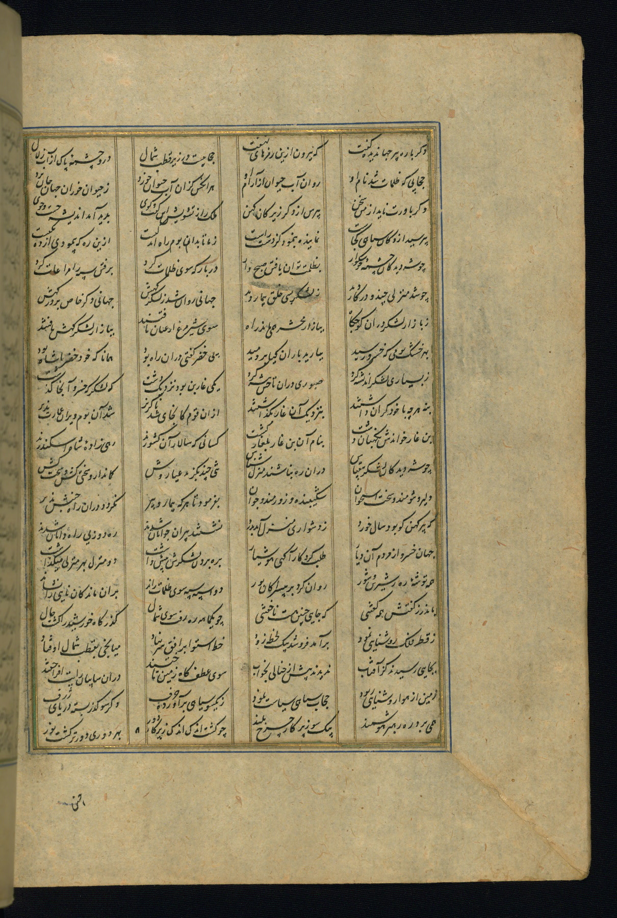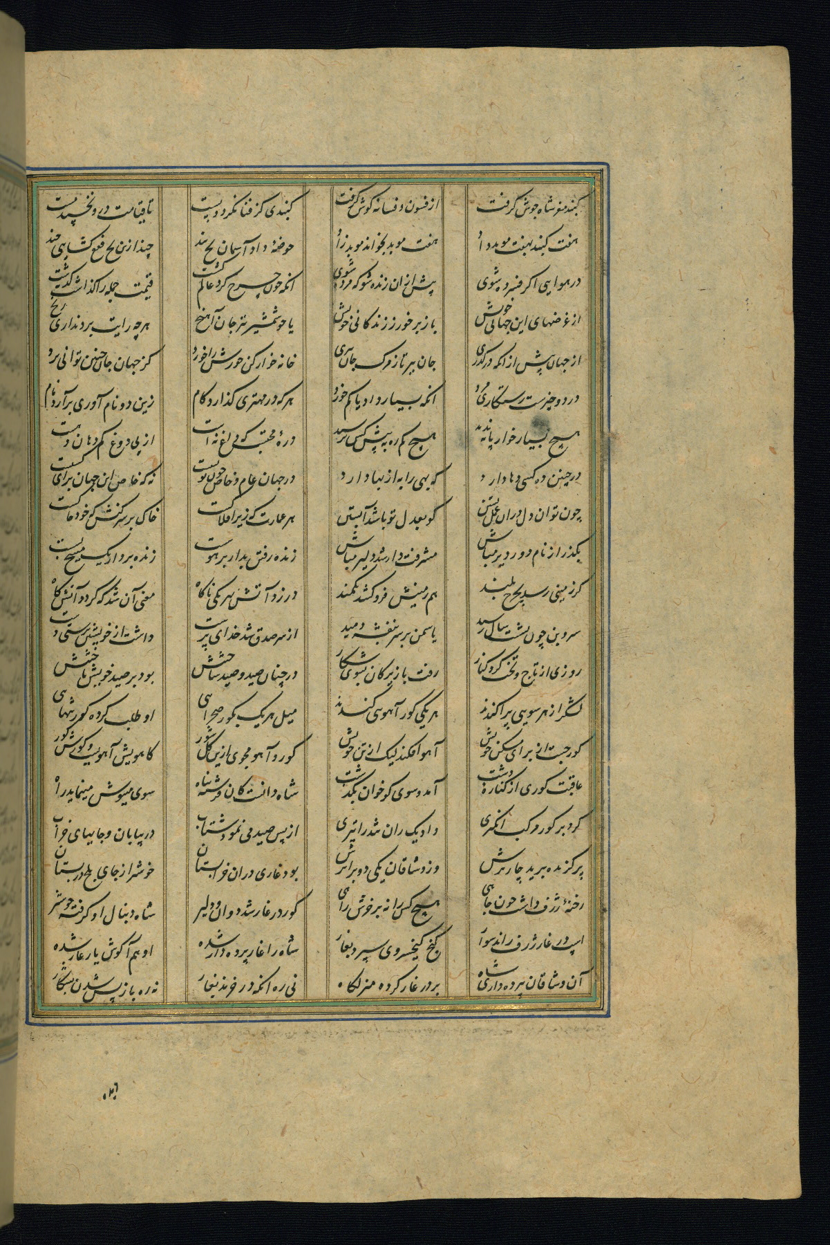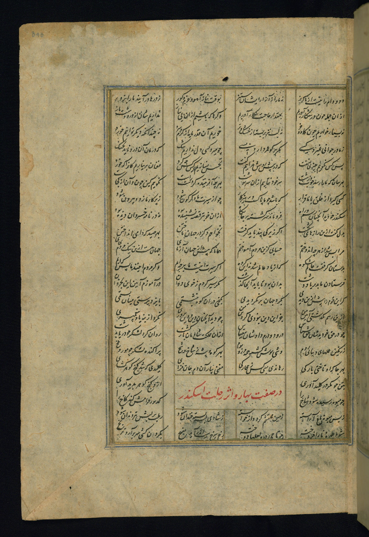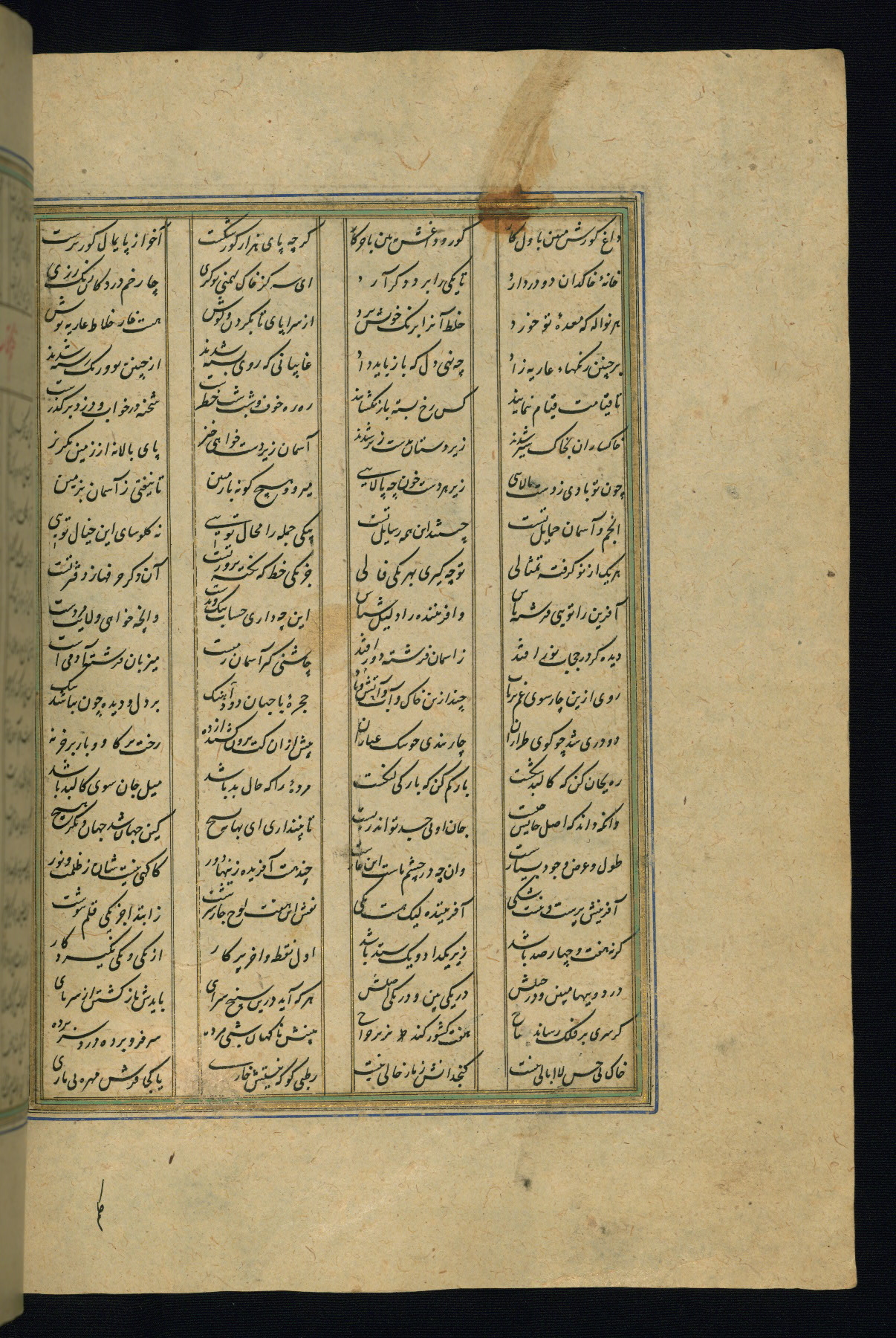 This is an illuminated and illustrated copy of the Khamsah (quintet) by Niẓāmī Ganjavī (d. 605 AH / 1209 CE), completed by Ḥabīb Allāh ibn ʿAlī ibn Ḥusām in Safavid Iran in Rabīʿ II 971 AH / 1563 CE. Illuminated titlepieces introduce the five poems, and there are thirty illustrations, the majority of which are attributable to thirteenth century AH / nineteenth CE Qajar Iran. Ownership notes and seals indicating the provenance of this manuscript are found throughout the codex (fols. 1a, 2a, 153a, 177a, 233a, 349a, and 351a). The binding is not original to the manuscript.