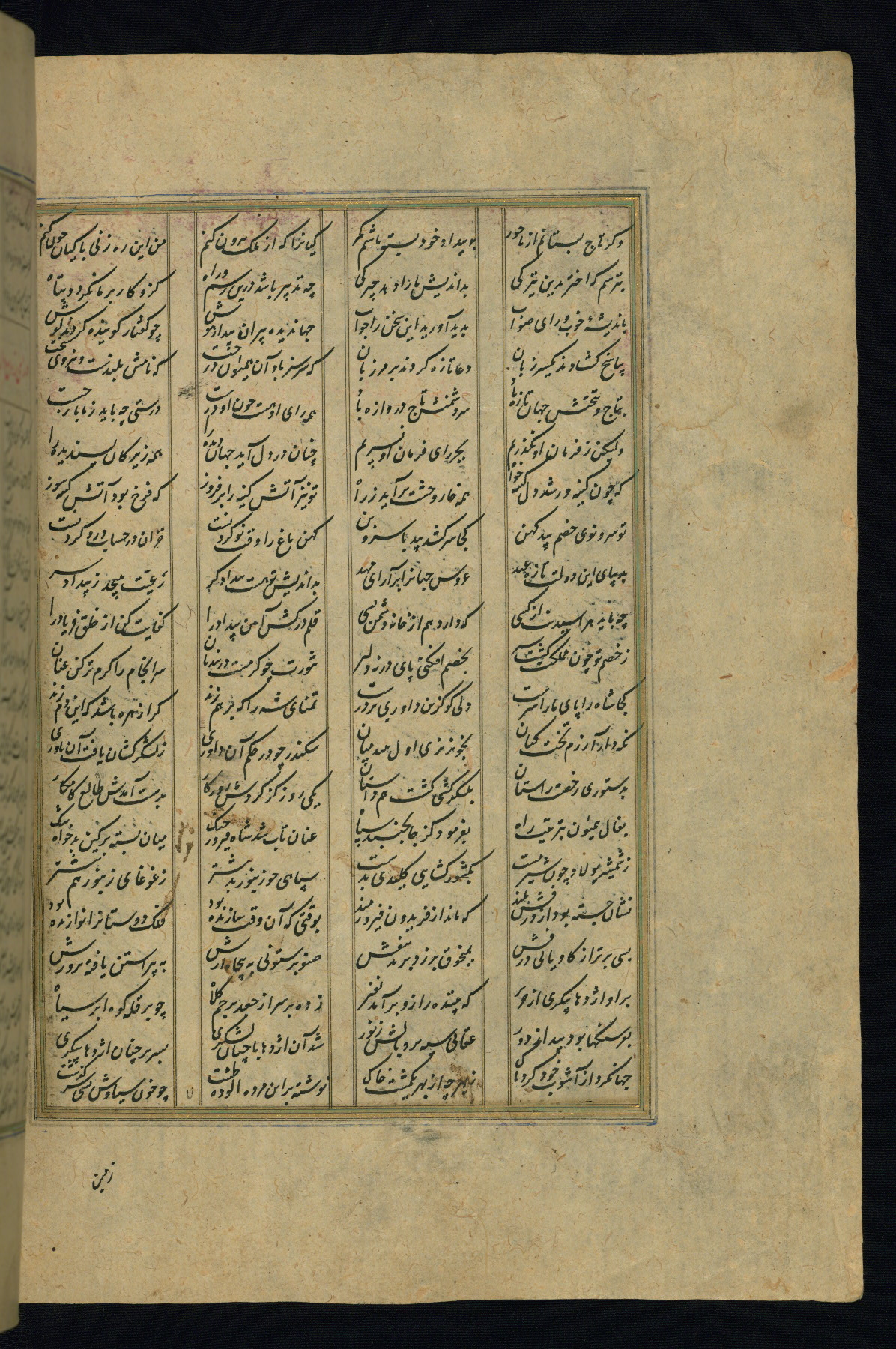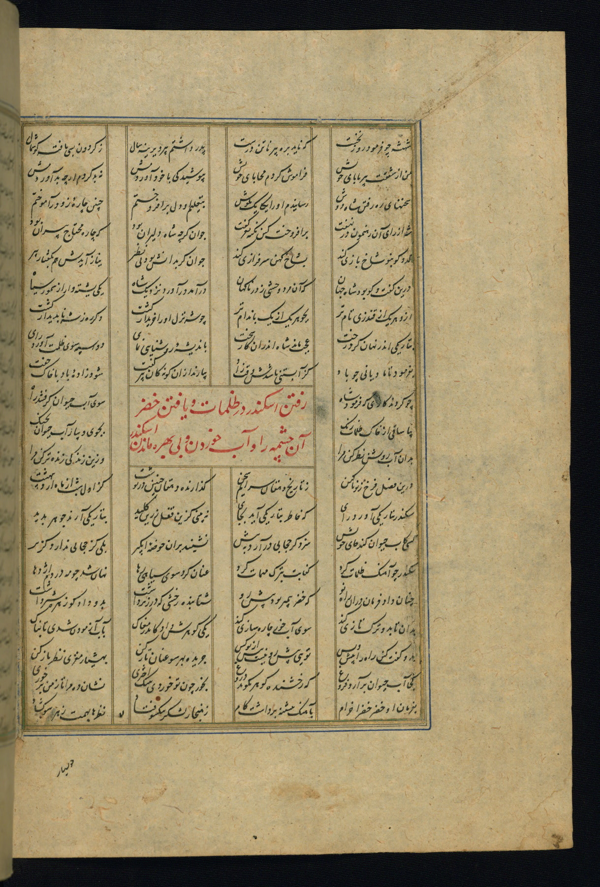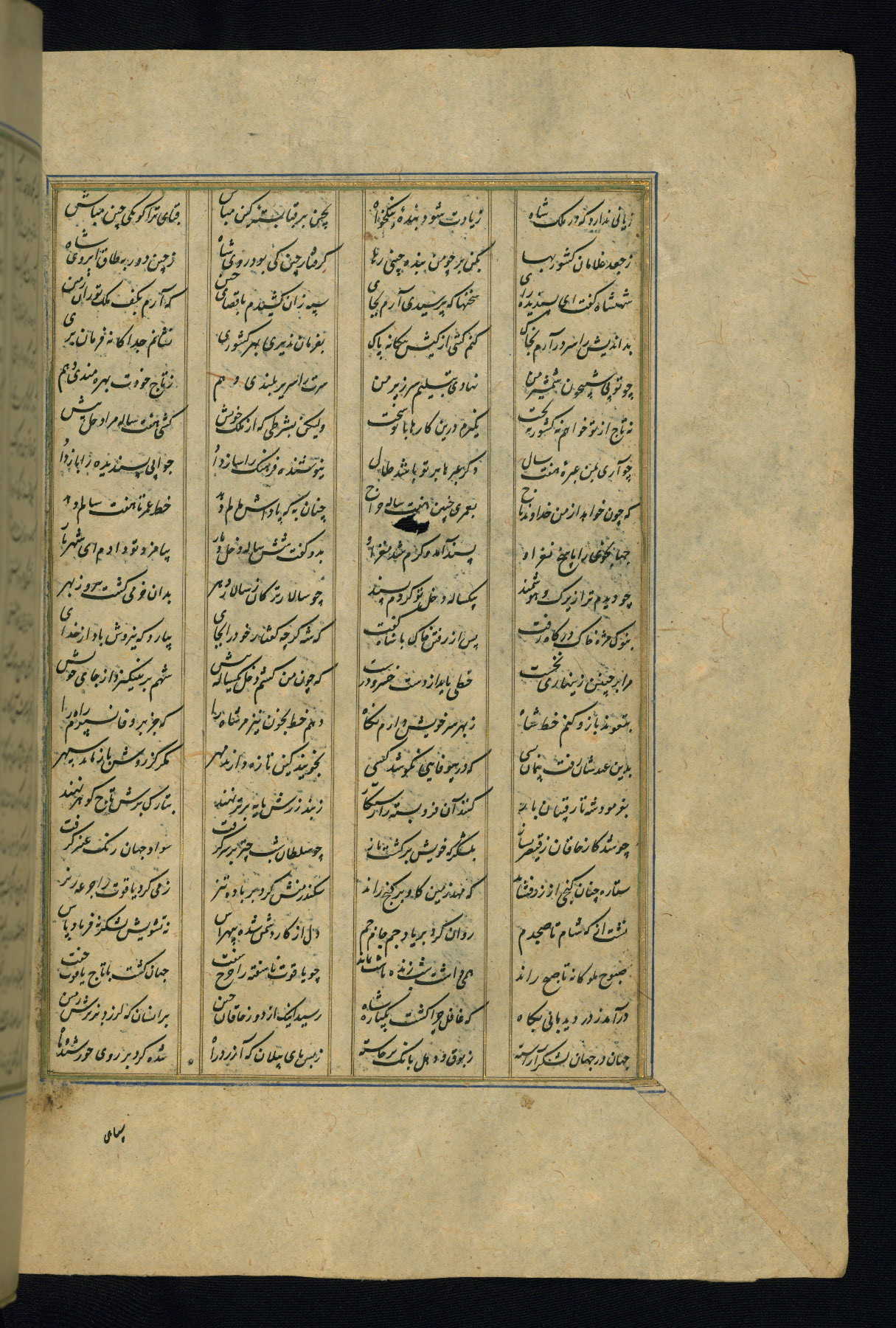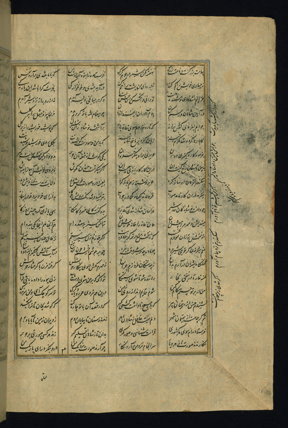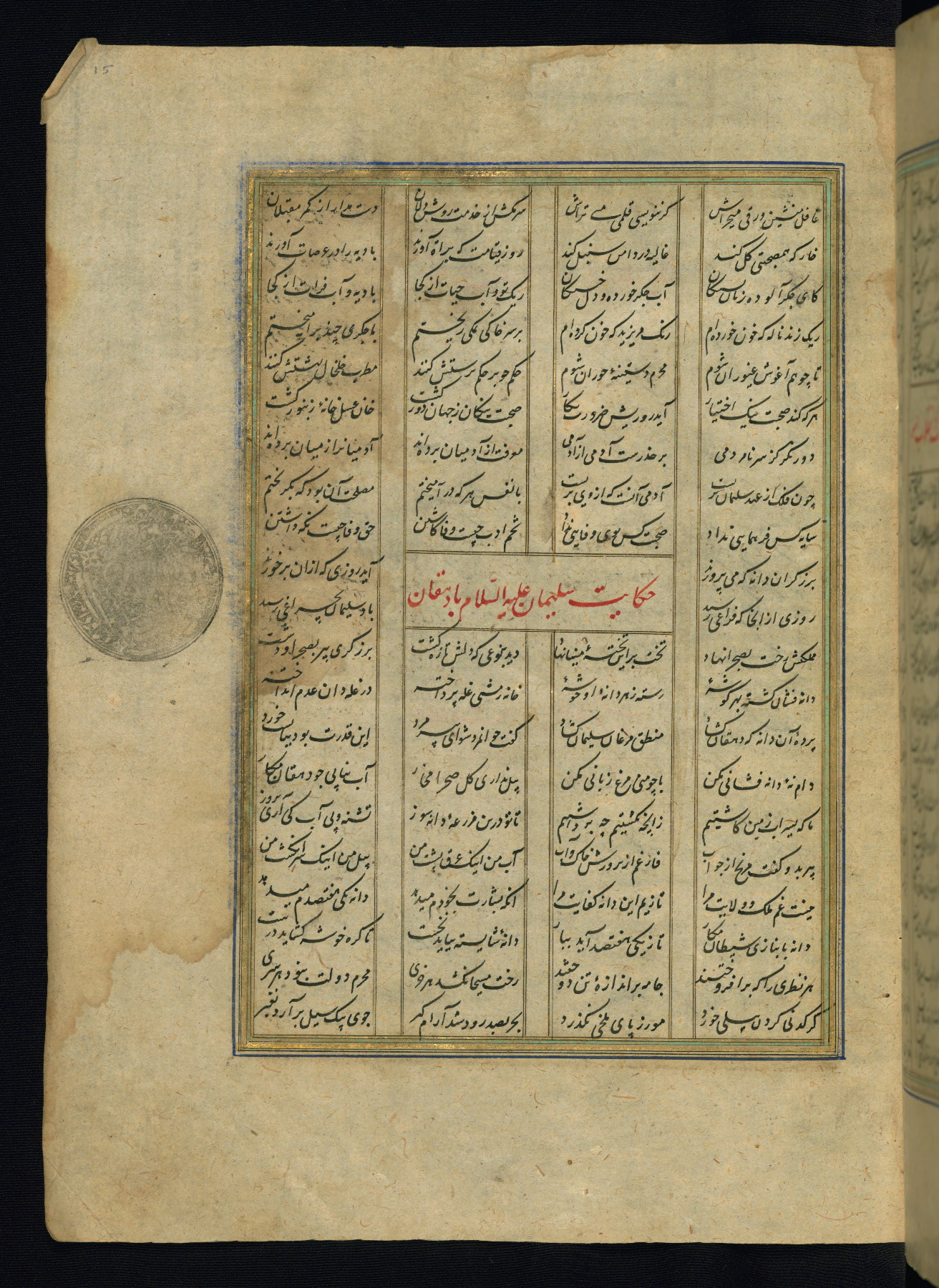 This is an illuminated and illustrated copy of the Khamsah (quintet) by Niẓāmī Ganjavī (d. 605 AH / 1209 CE), completed by Ḥabīb Allāh ibn ʿAlī ibn Ḥusām in Safavid Iran in Rabīʿ II 971 AH / 1563 CE. Illuminated titlepieces introduce the five poems, and there are thirty illustrations, the majority of which are attributable to thirteenth century AH / nineteenth CE Qajar Iran. Ownership notes and seals indicating the provenance of this manuscript are found throughout the codex (fols. 1a, 2a, 153a, 177a, 233a, 349a, and 351a). The binding is not original to the manuscript.