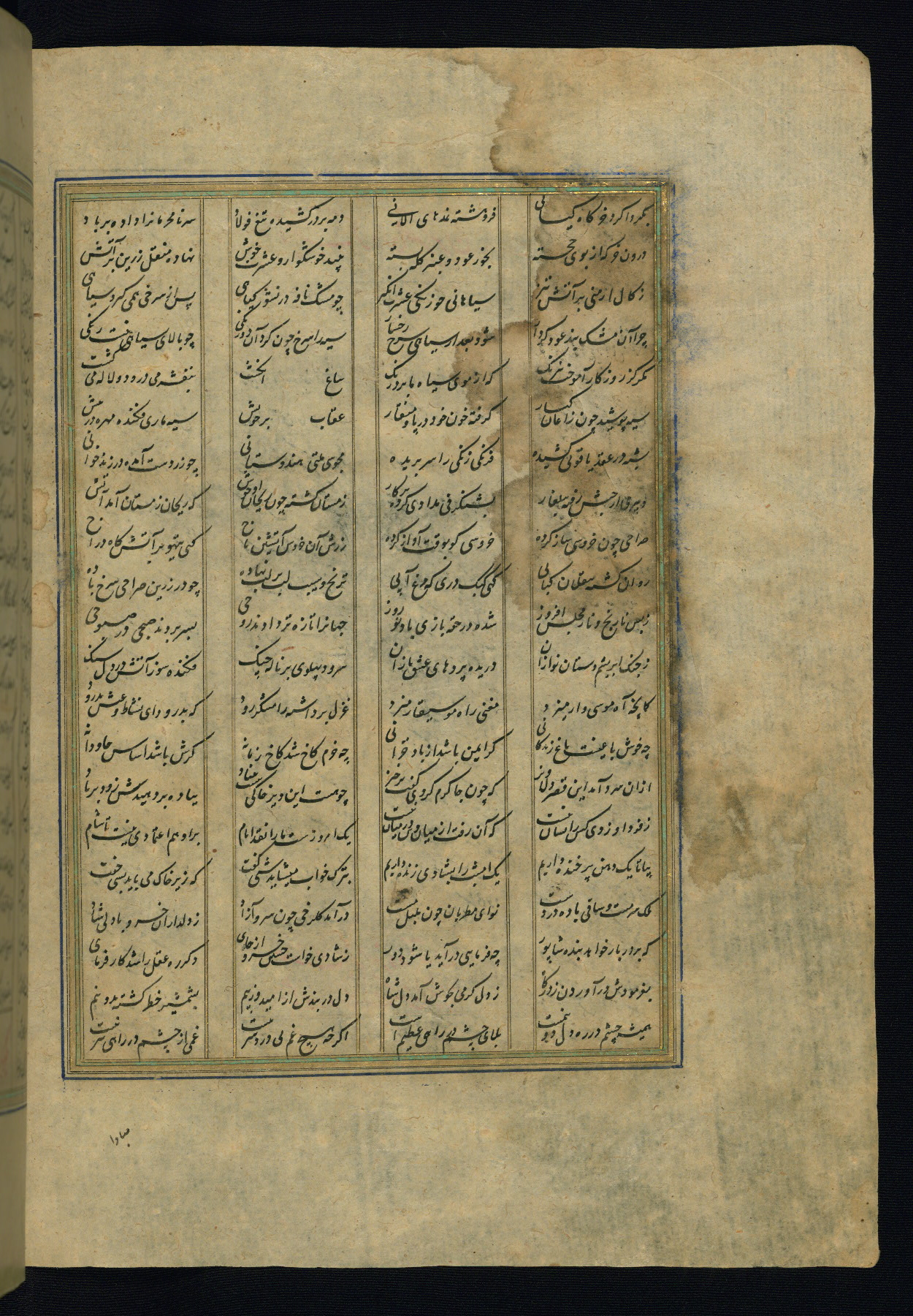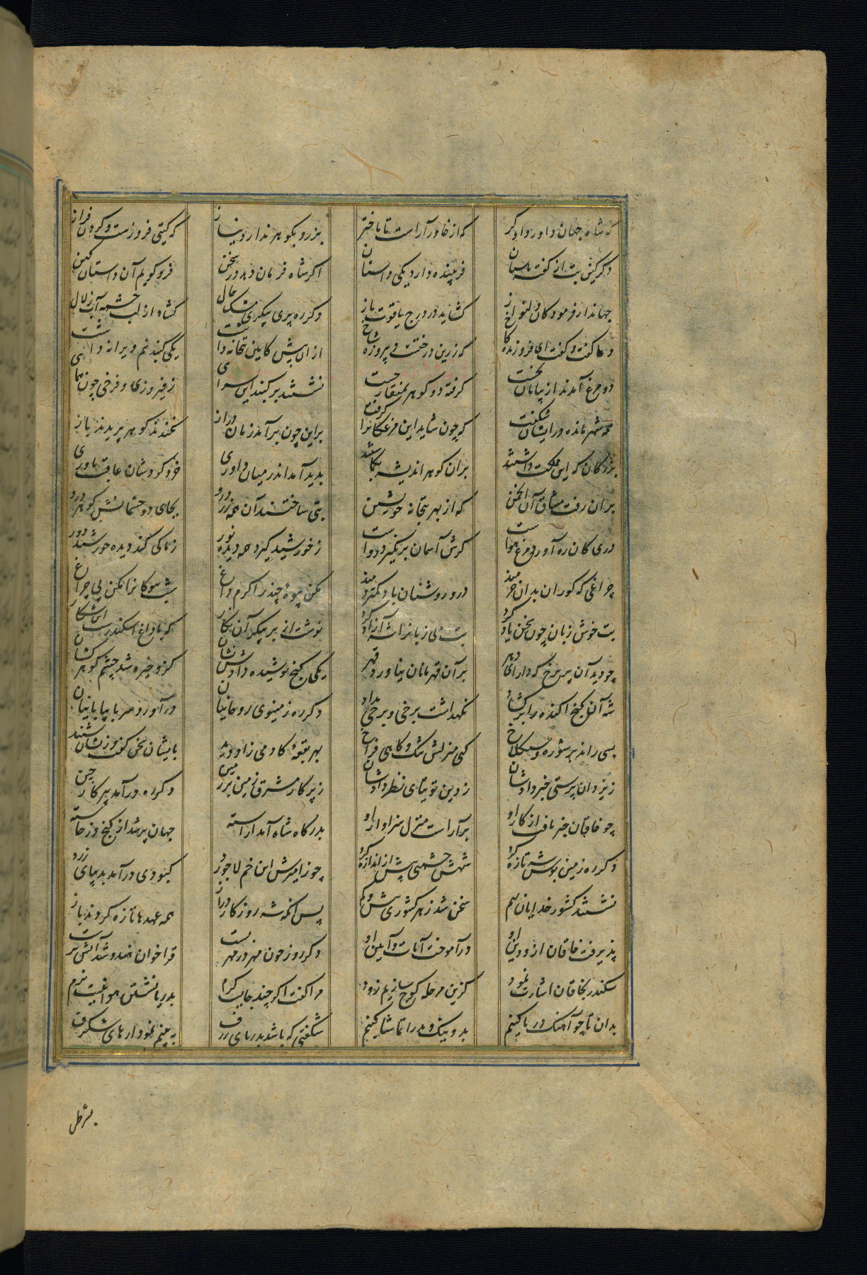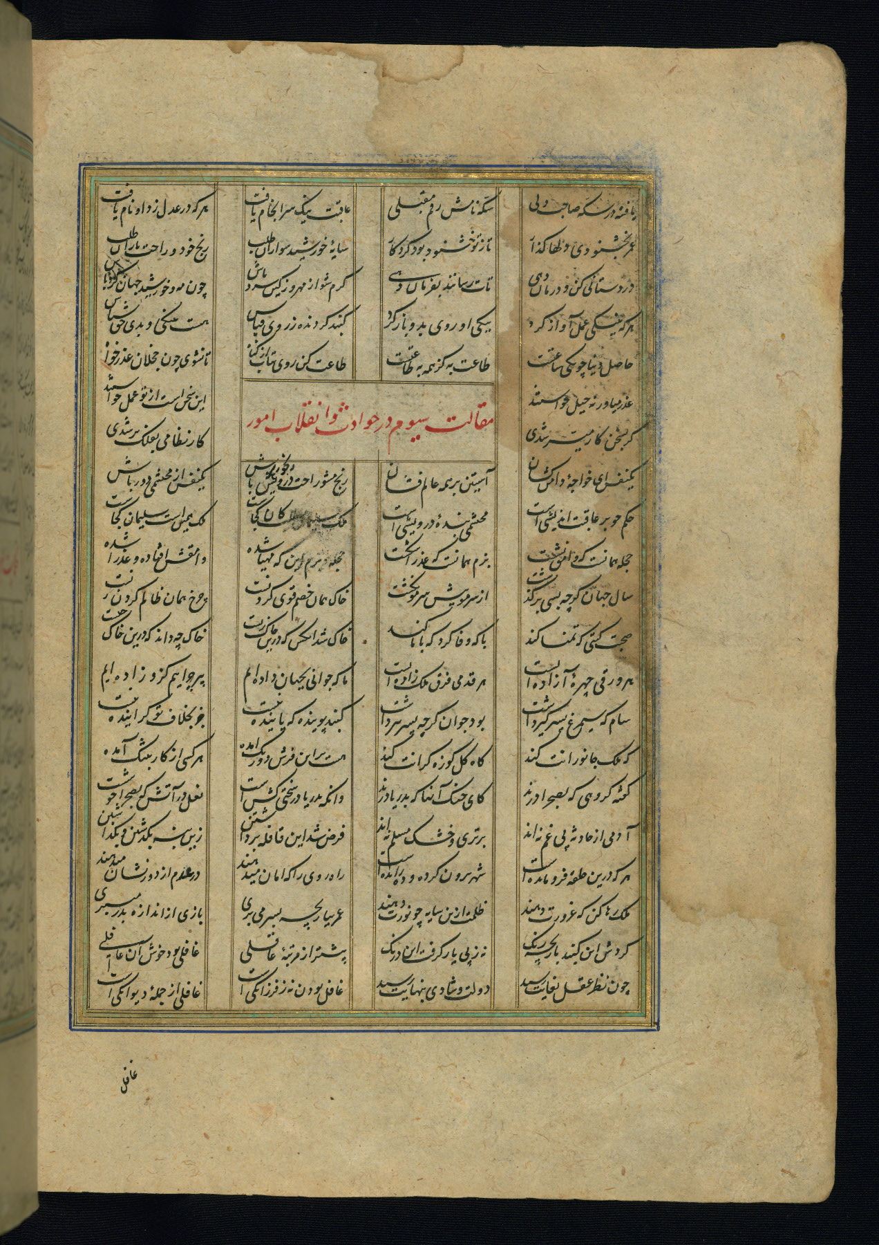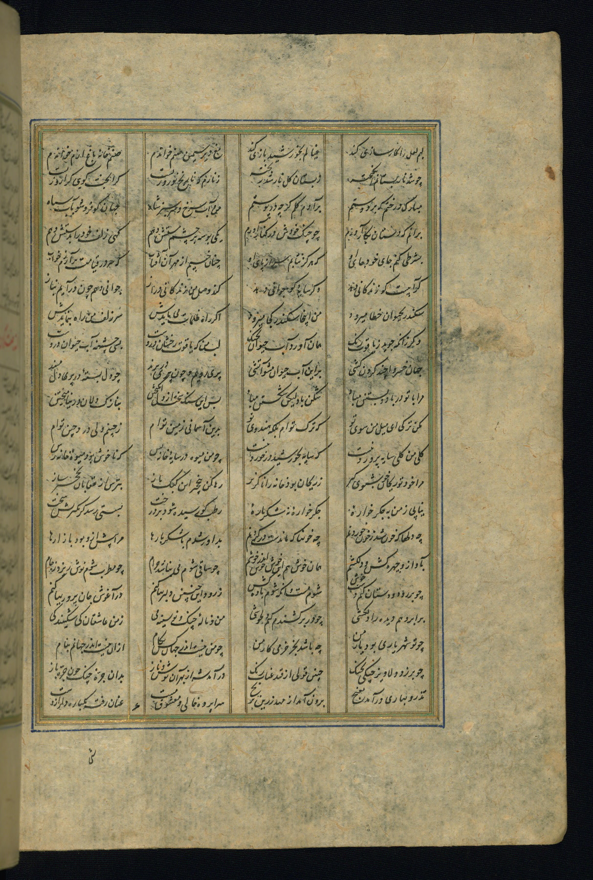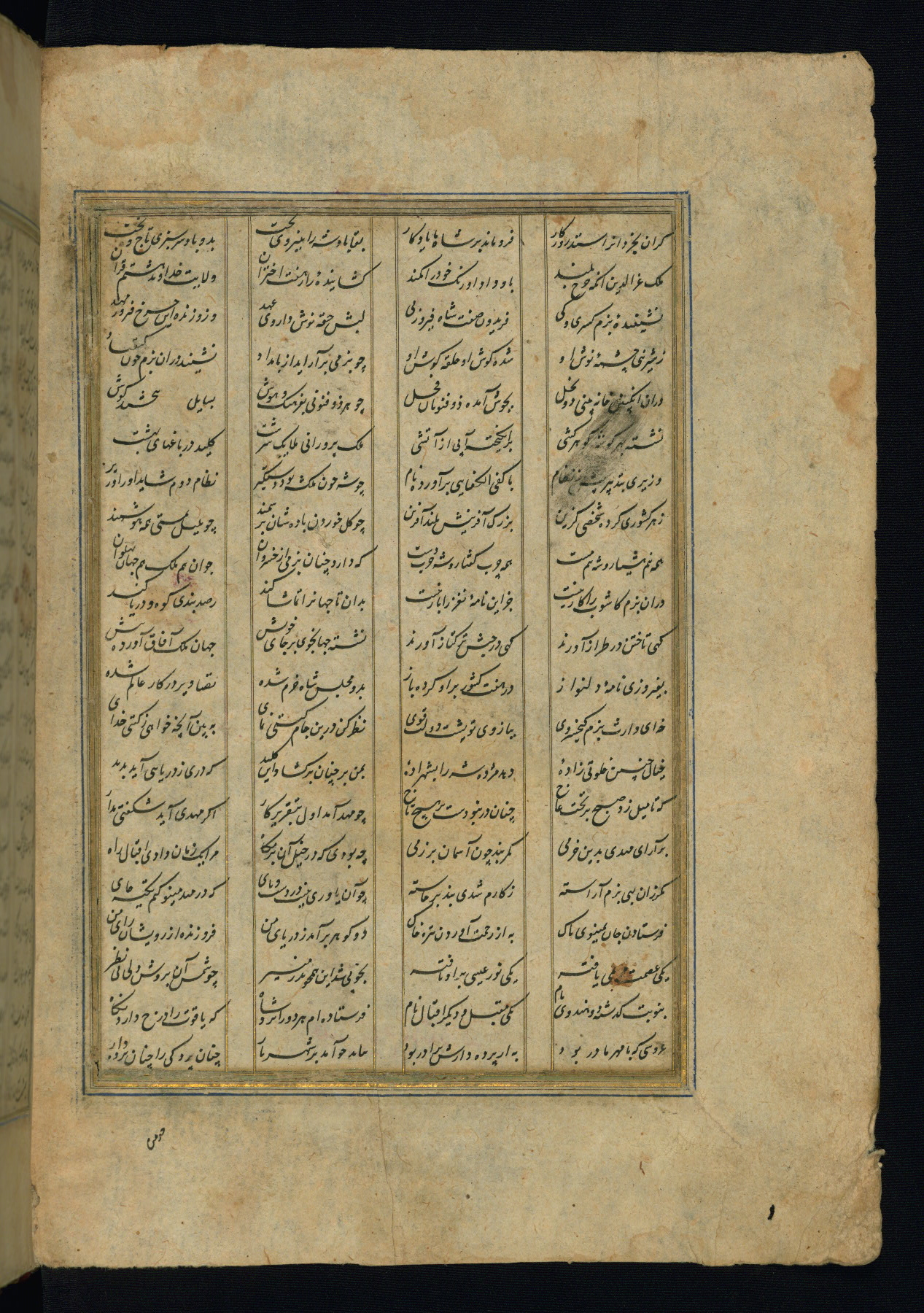 This is an illuminated and illustrated copy of the Khamsah (quintet) by Niẓāmī Ganjavī (d. 605 AH / 1209 CE), completed by Ḥabīb Allāh ibn ʿAlī ibn Ḥusām in Safavid Iran in Rabīʿ II 971 AH / 1563 CE. Illuminated titlepieces introduce the five poems, and there are thirty illustrations, the majority of which are attributable to thirteenth century AH / nineteenth CE Qajar Iran. Ownership notes and seals indicating the provenance of this manuscript are found throughout the codex (fols. 1a, 2a, 153a, 177a, 233a, 349a, and 351a). The binding is not original to the manuscript.