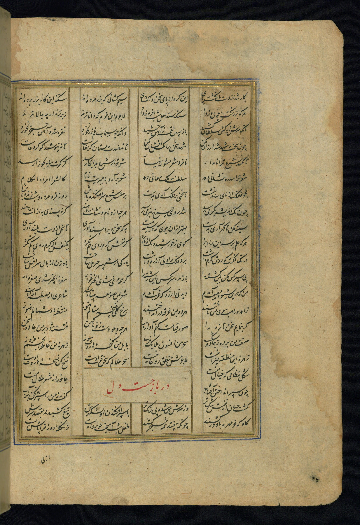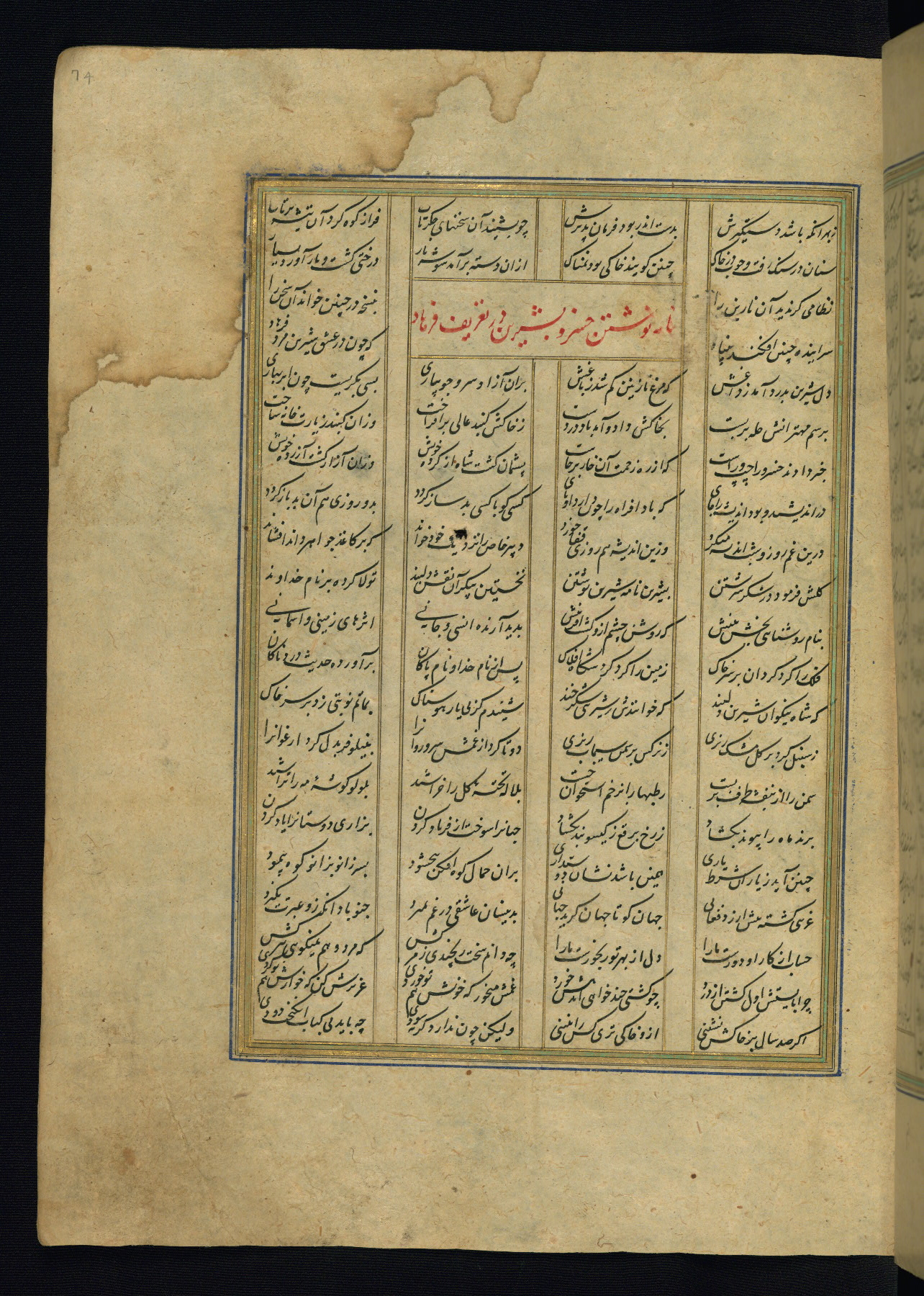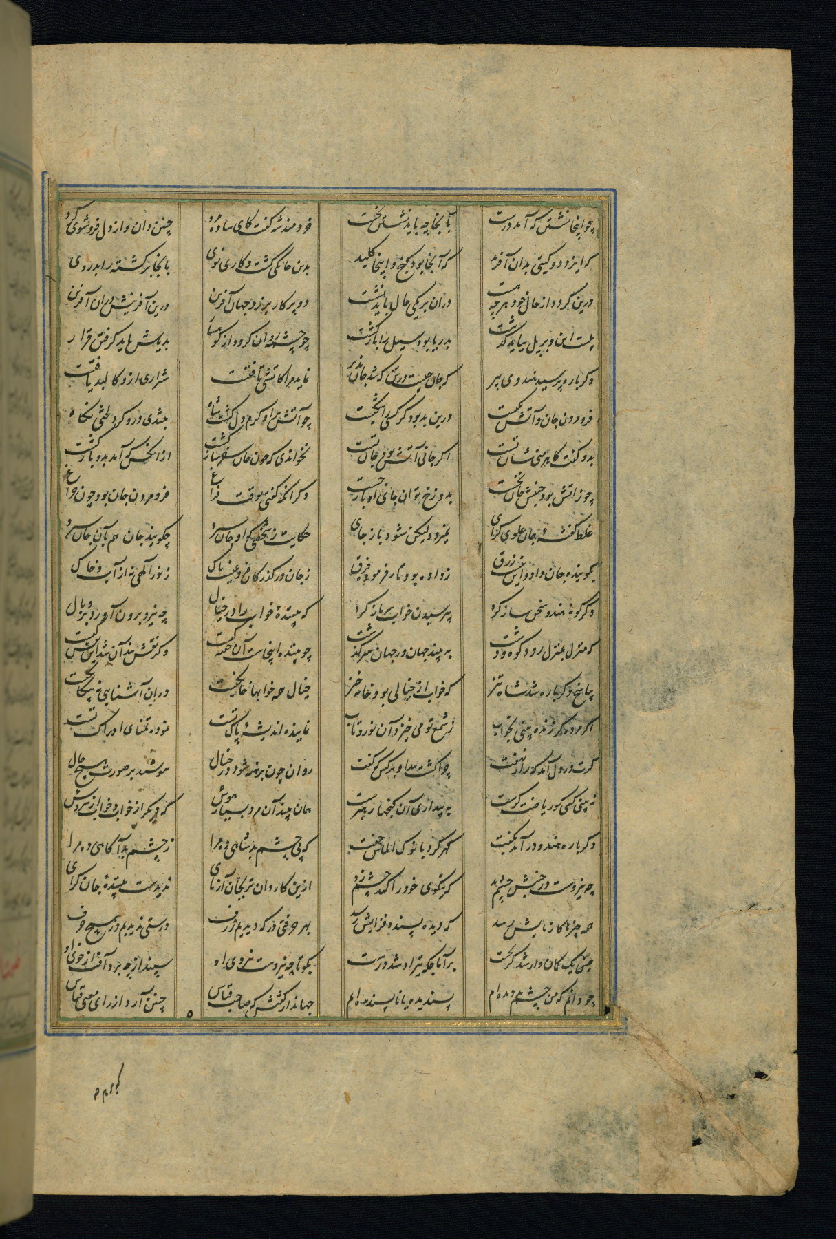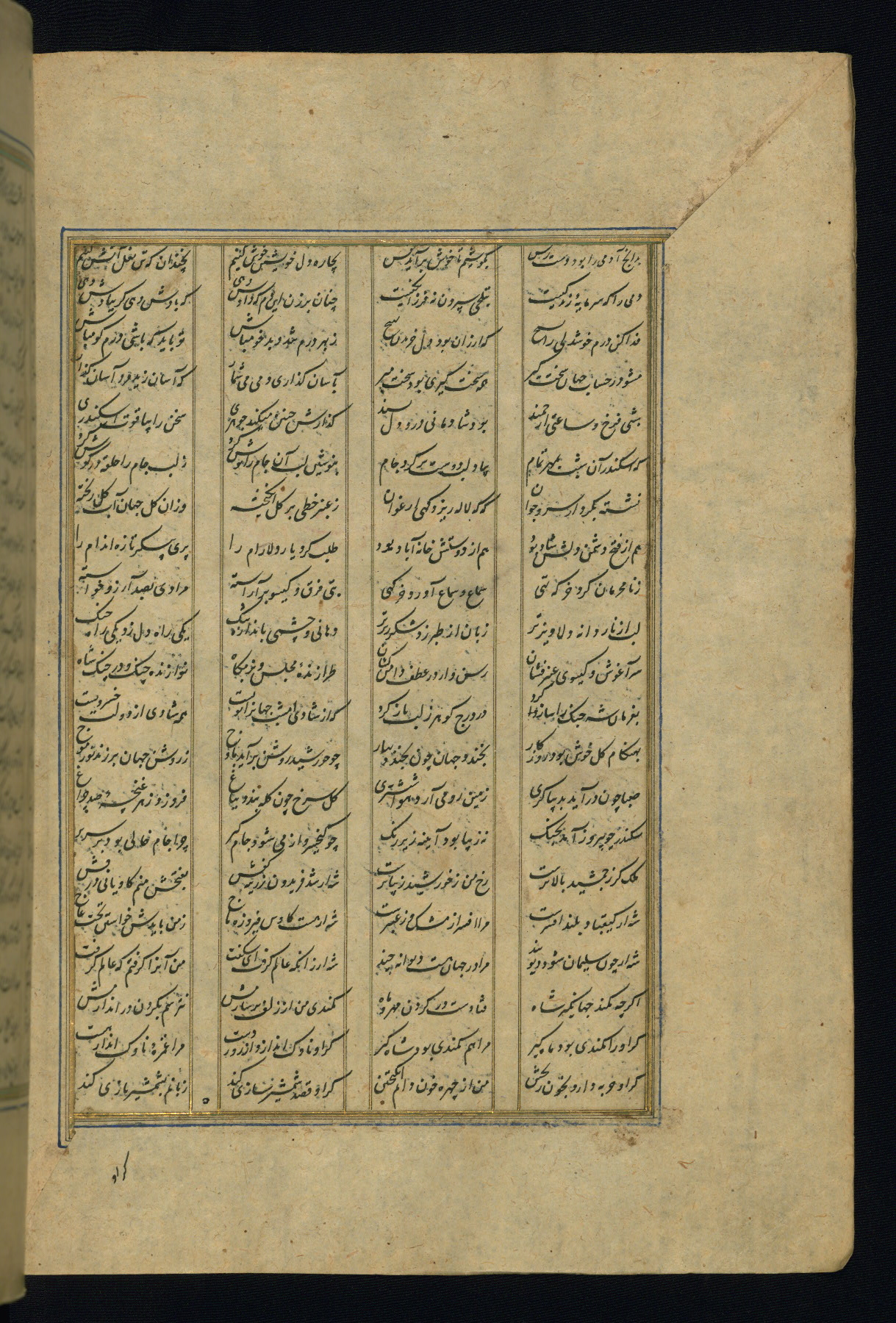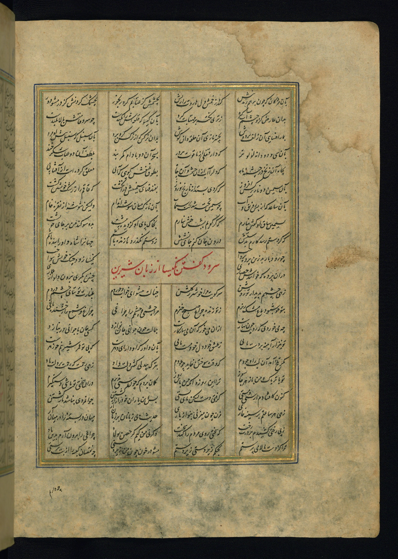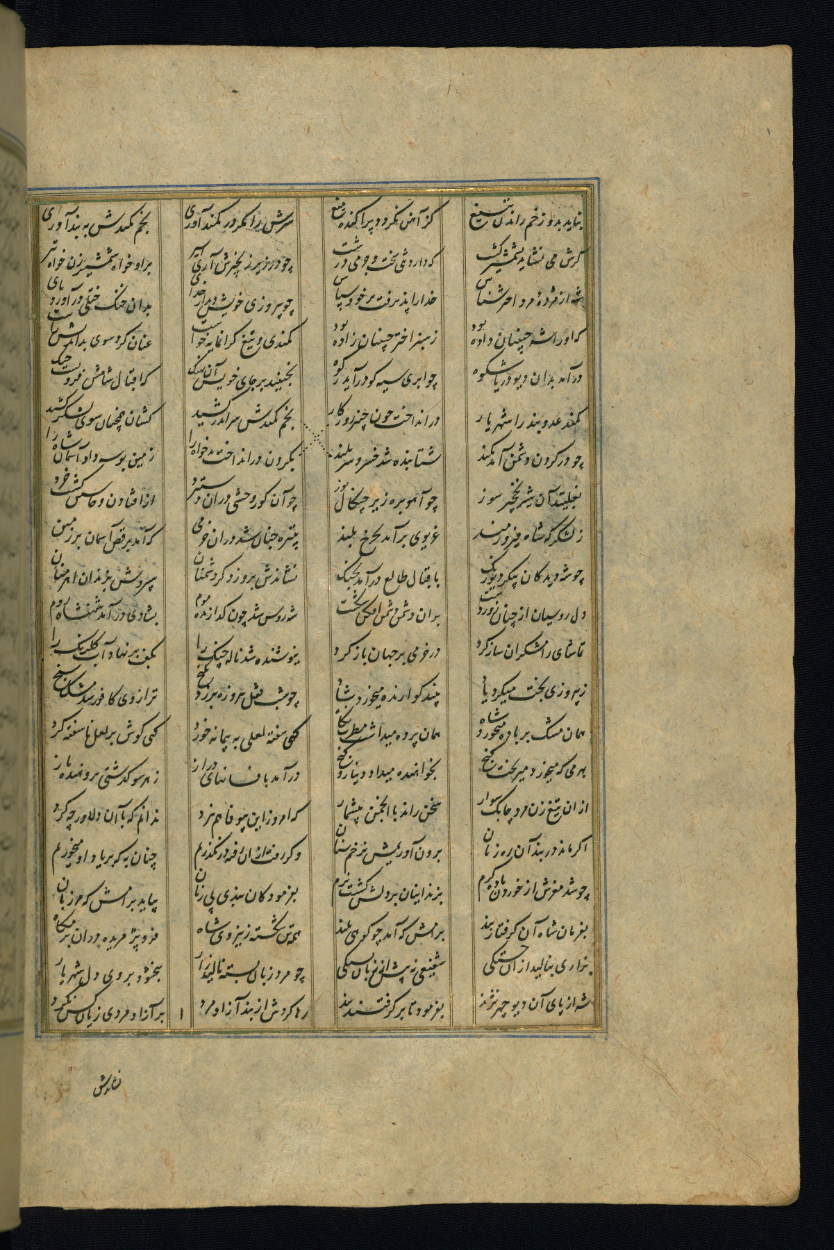 This is an illuminated and illustrated copy of the Khamsah (quintet) by Niẓāmī Ganjavī (d. 605 AH / 1209 CE), completed by Ḥabīb Allāh ibn ʿAlī ibn Ḥusām in Safavid Iran in Rabīʿ II 971 AH / 1563 CE. Illuminated titlepieces introduce the five poems, and there are thirty illustrations, the majority of which are attributable to thirteenth century AH / nineteenth CE Qajar Iran. Ownership notes and seals indicating the provenance of this manuscript are found throughout the codex (fols. 1a, 2a, 153a, 177a, 233a, 349a, and 351a). The binding is not original to the manuscript.