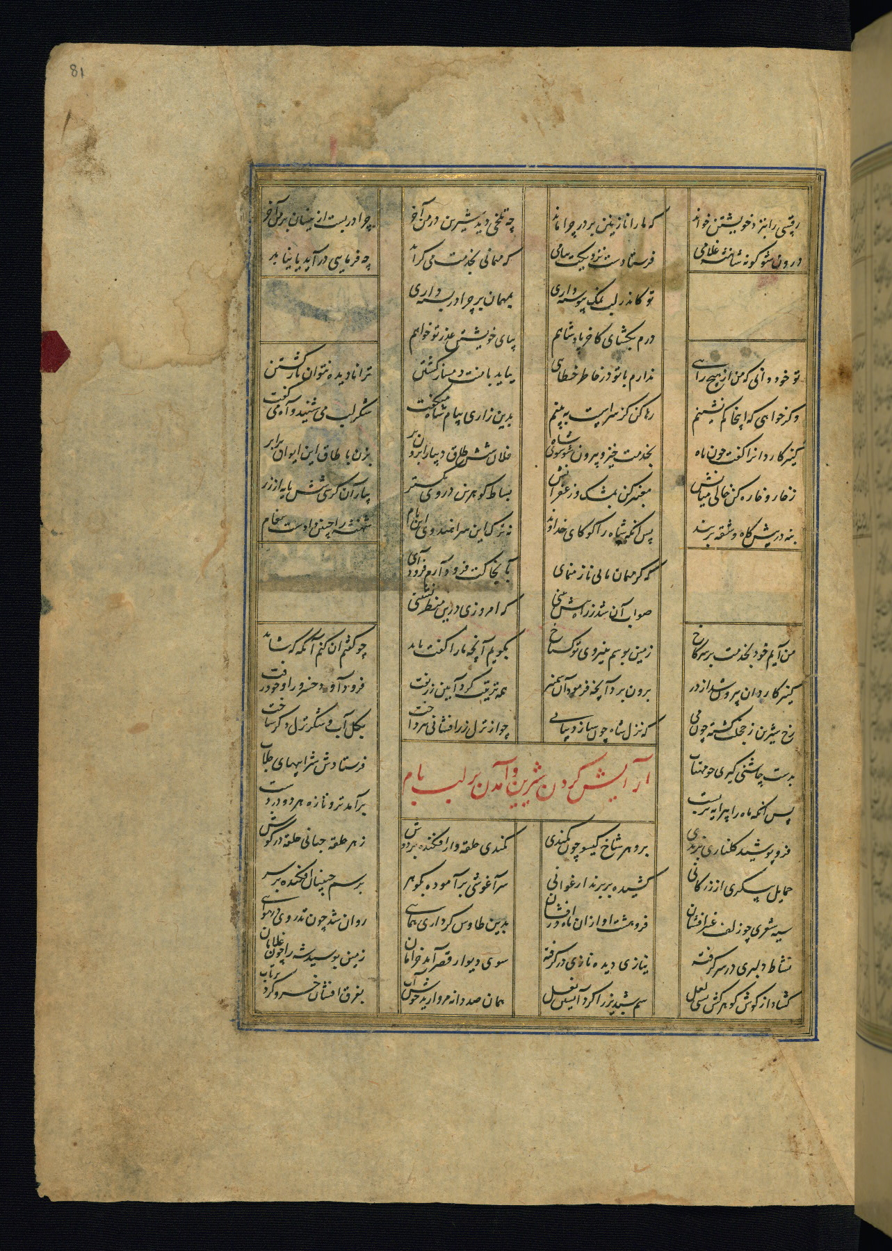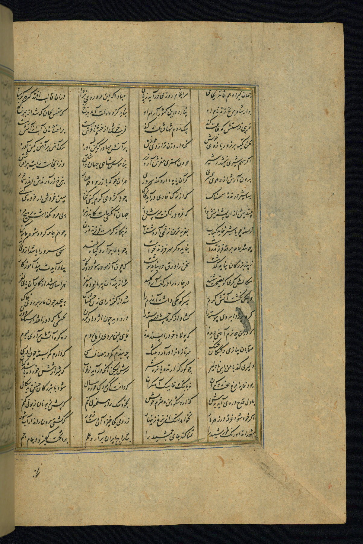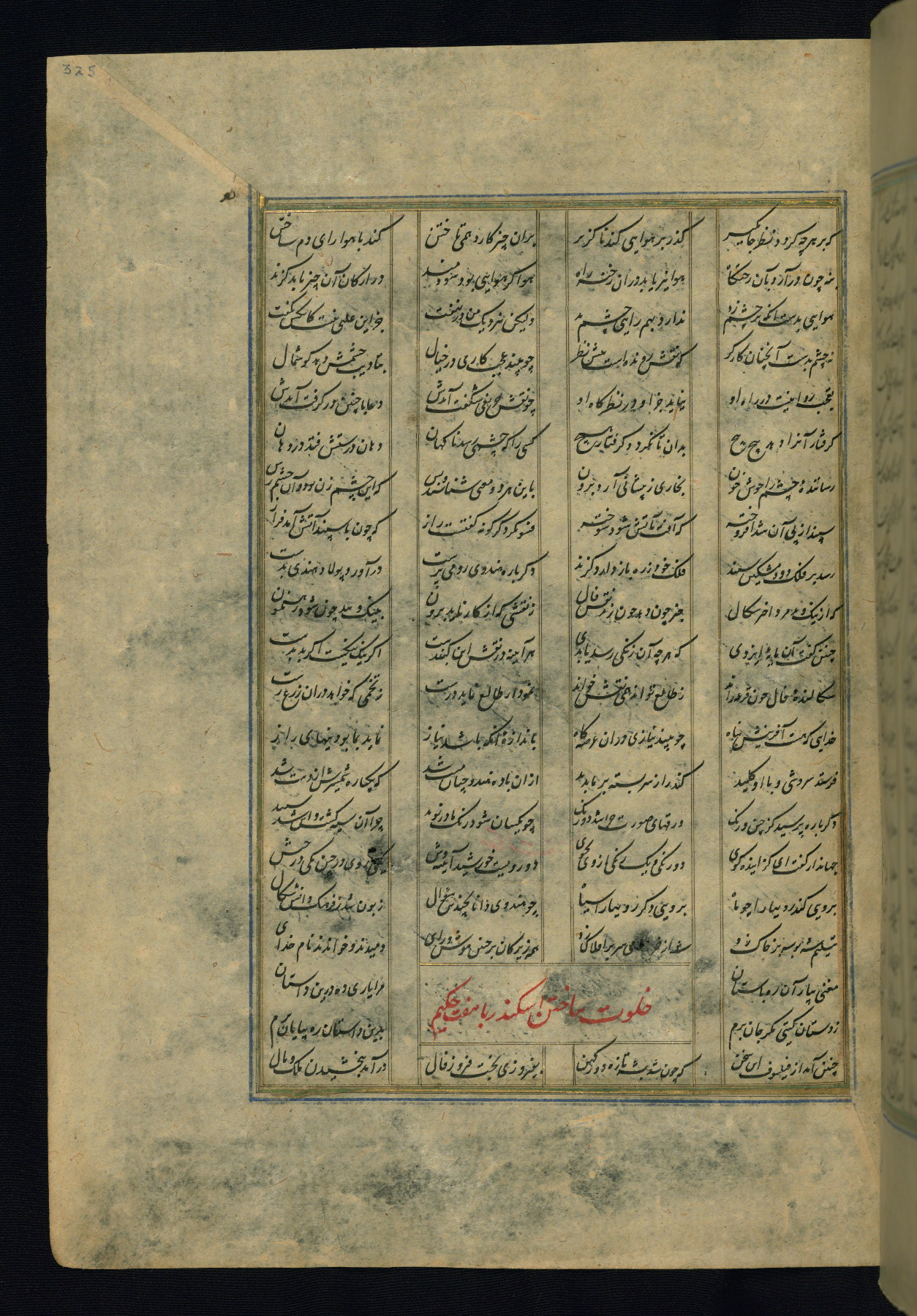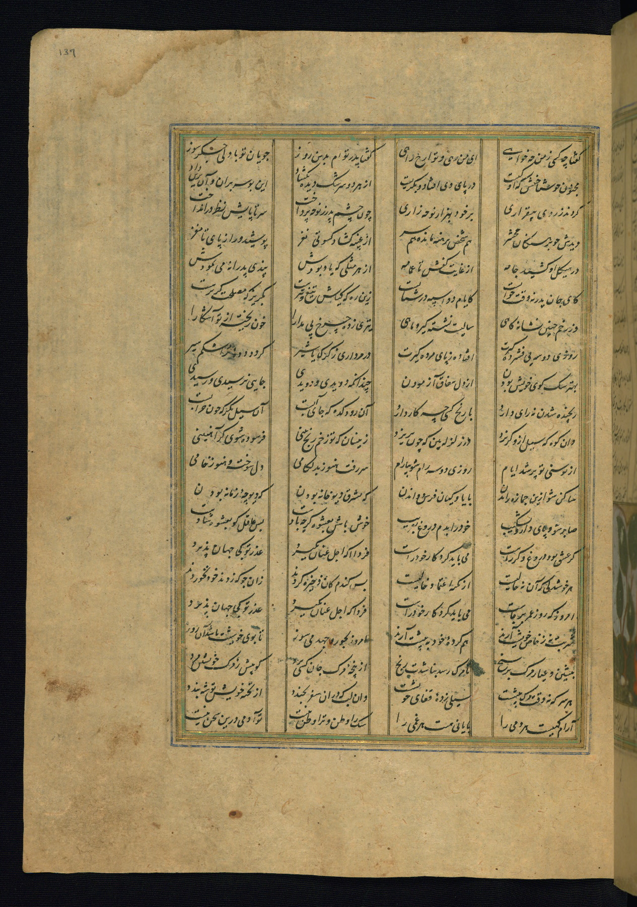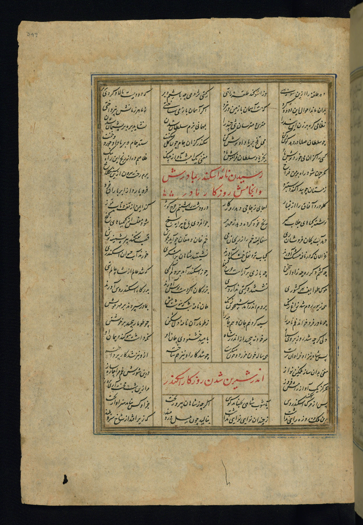 This is an illuminated and illustrated copy of the Khamsah (quintet) by Niẓāmī Ganjavī (d. 605 AH / 1209 CE), completed by Ḥabīb Allāh ibn ʿAlī ibn Ḥusām in Safavid Iran in Rabīʿ II 971 AH / 1563 CE. Illuminated titlepieces introduce the five poems, and there are thirty illustrations, the majority of which are attributable to thirteenth century AH / nineteenth CE Qajar Iran. Ownership notes and seals indicating the provenance of this manuscript are found throughout the codex (fols. 1a, 2a, 153a, 177a, 233a, 349a, and 351a). The binding is not original to the manuscript.