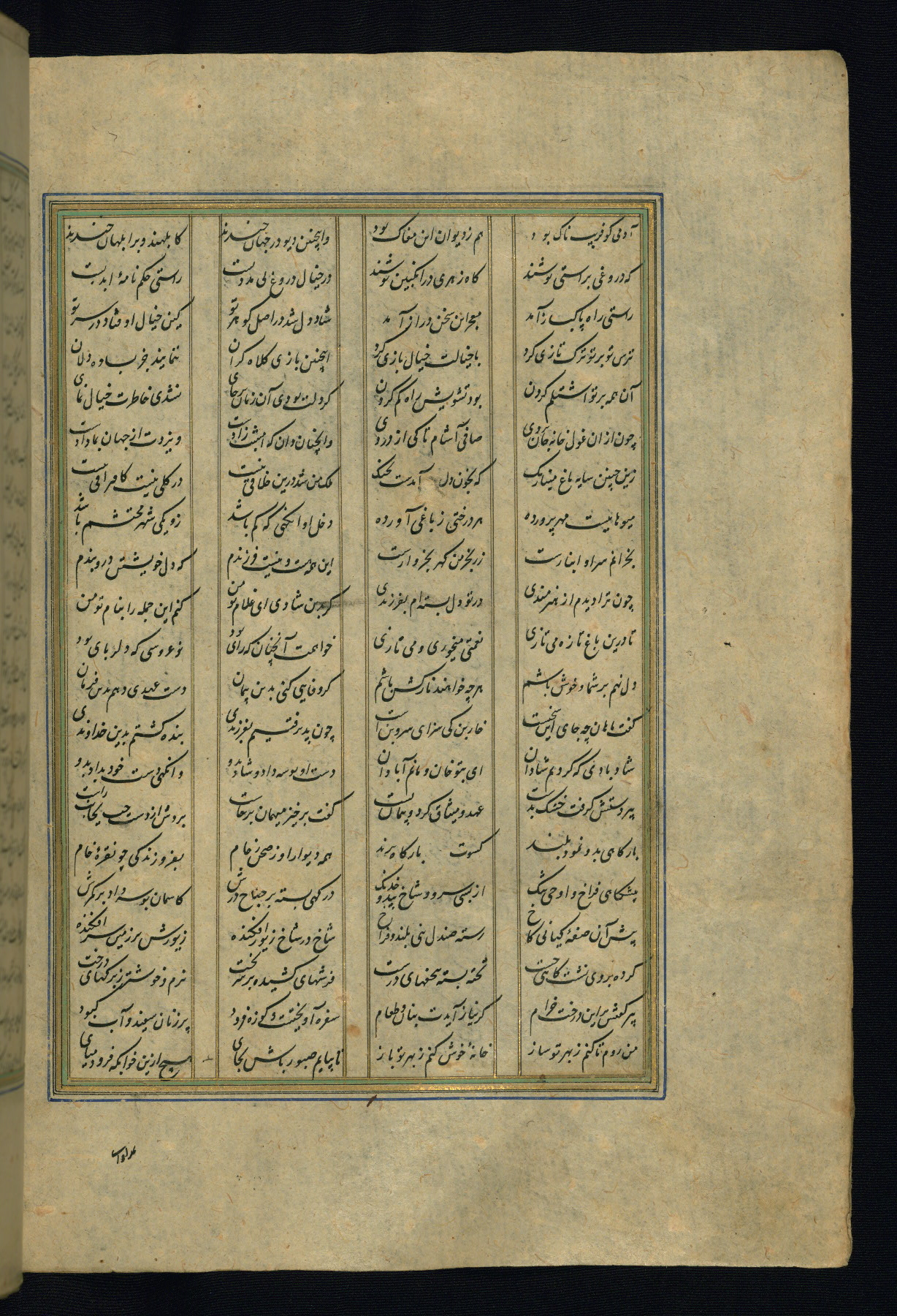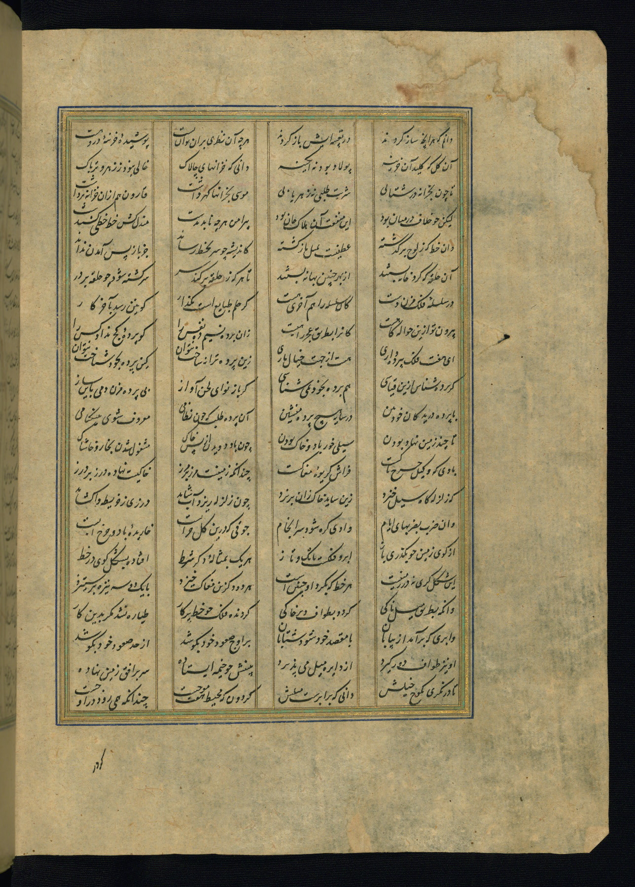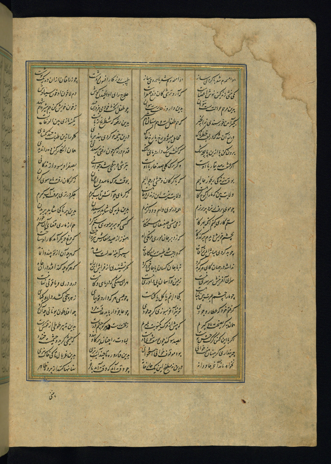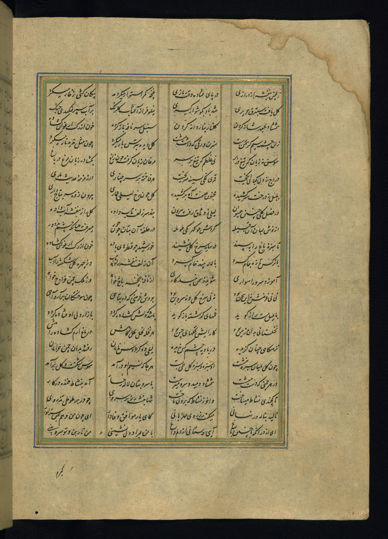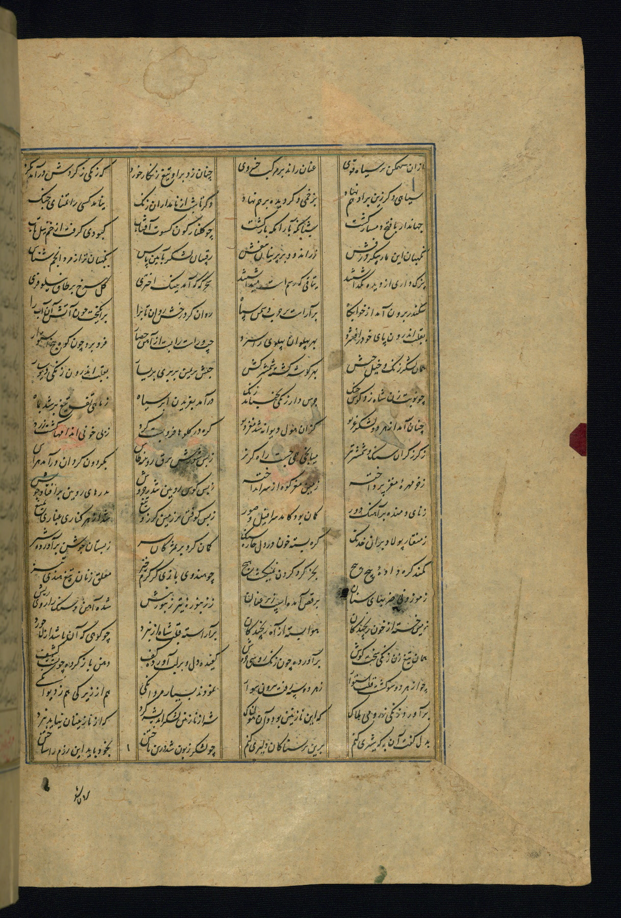 This is an illuminated and illustrated copy of the Khamsah (quintet) by Niẓāmī Ganjavī (d. 605 AH / 1209 CE), completed by Ḥabīb Allāh ibn ʿAlī ibn Ḥusām in Safavid Iran in Rabīʿ II 971 AH / 1563 CE. Illuminated titlepieces introduce the five poems, and there are thirty illustrations, the majority of which are attributable to thirteenth century AH / nineteenth CE Qajar Iran. Ownership notes and seals indicating the provenance of this manuscript are found throughout the codex (fols. 1a, 2a, 153a, 177a, 233a, 349a, and 351a). The binding is not original to the manuscript.