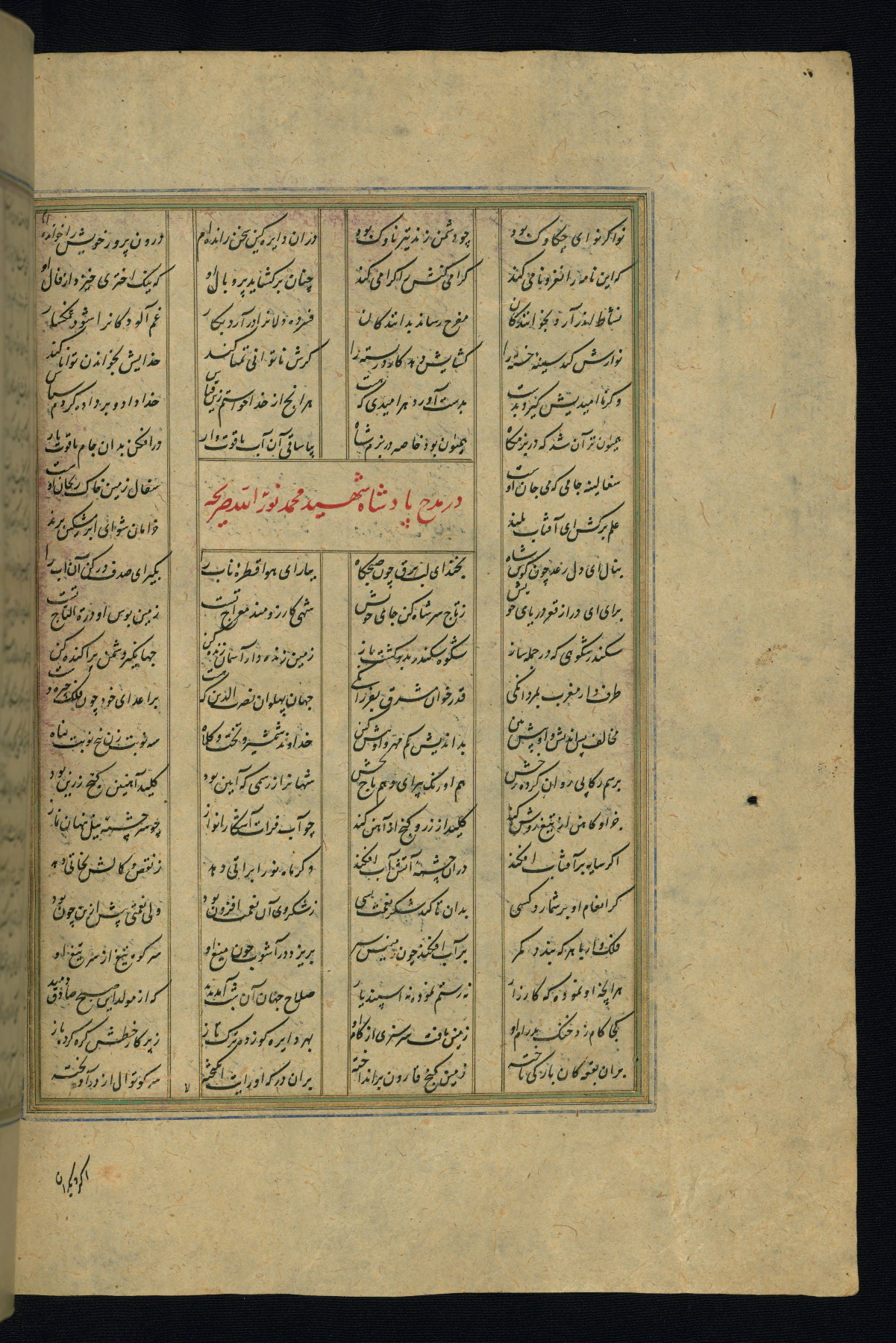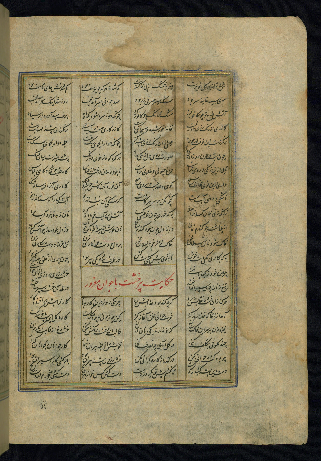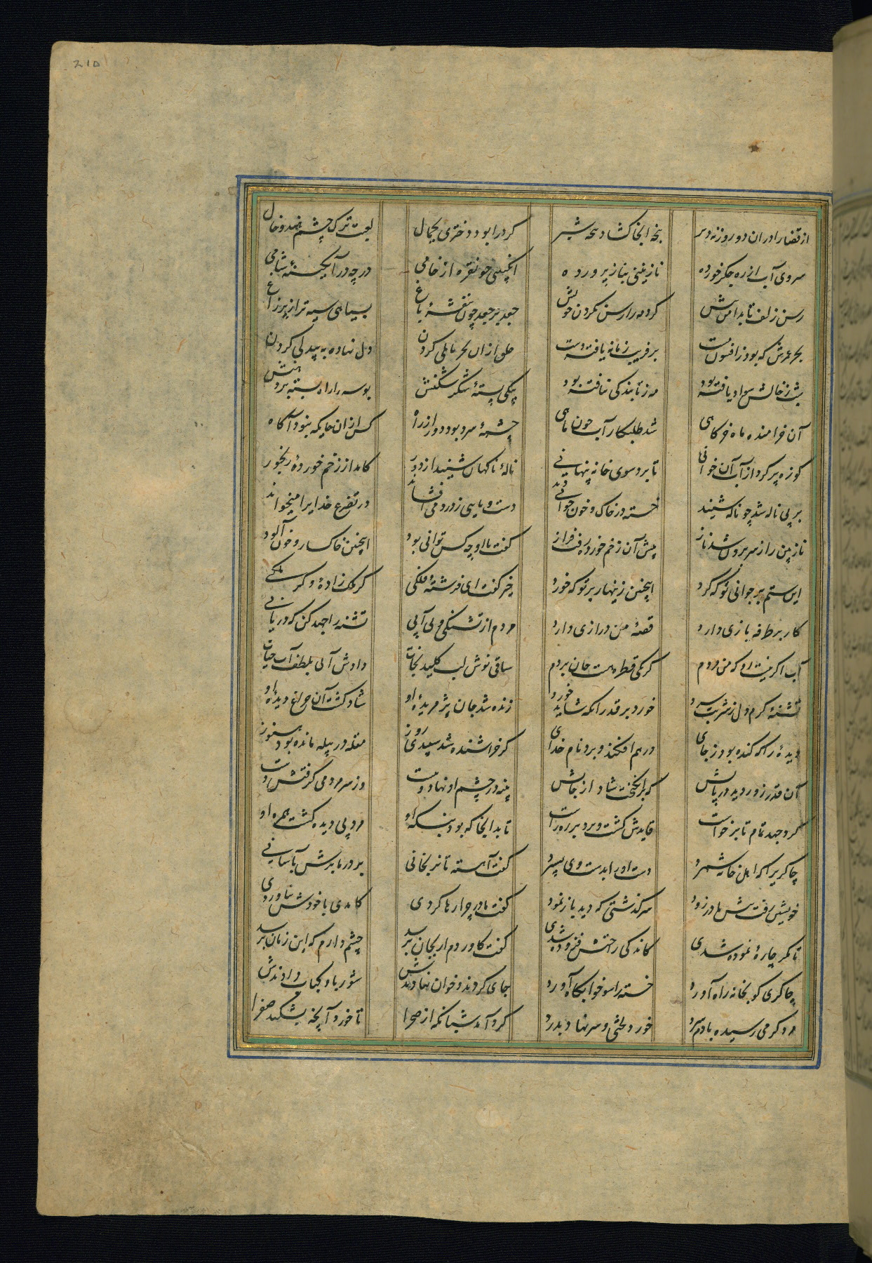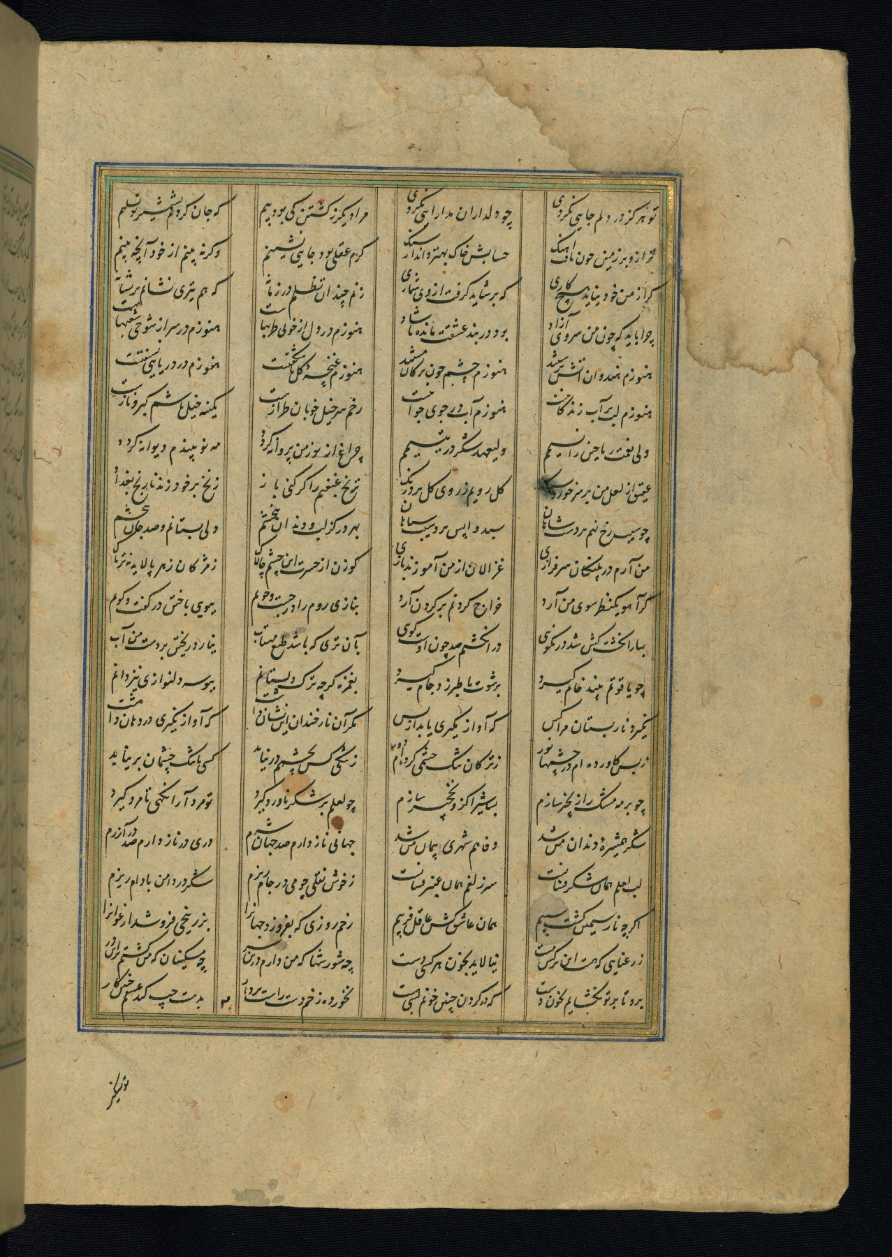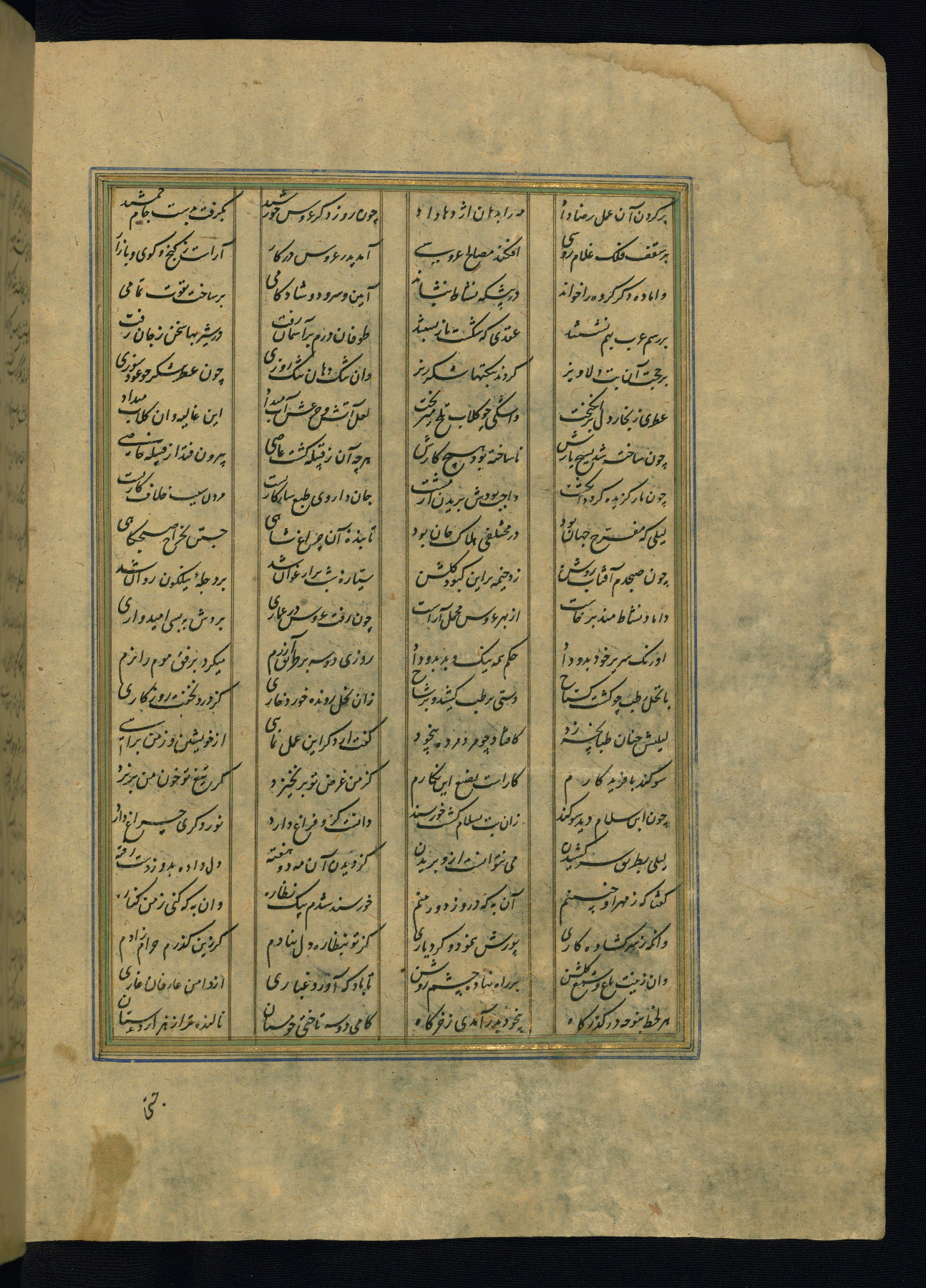 This is an illuminated and illustrated copy of the Khamsah (quintet) by Niẓāmī Ganjavī (d. 605 AH / 1209 CE), completed by Ḥabīb Allāh ibn ʿAlī ibn Ḥusām in Safavid Iran in Rabīʿ II 971 AH / 1563 CE. Illuminated titlepieces introduce the five poems, and there are thirty illustrations, the majority of which are attributable to thirteenth century AH / nineteenth CE Qajar Iran. Ownership notes and seals indicating the provenance of this manuscript are found throughout the codex (fols. 1a, 2a, 153a, 177a, 233a, 349a, and 351a). The binding is not original to the manuscript.
