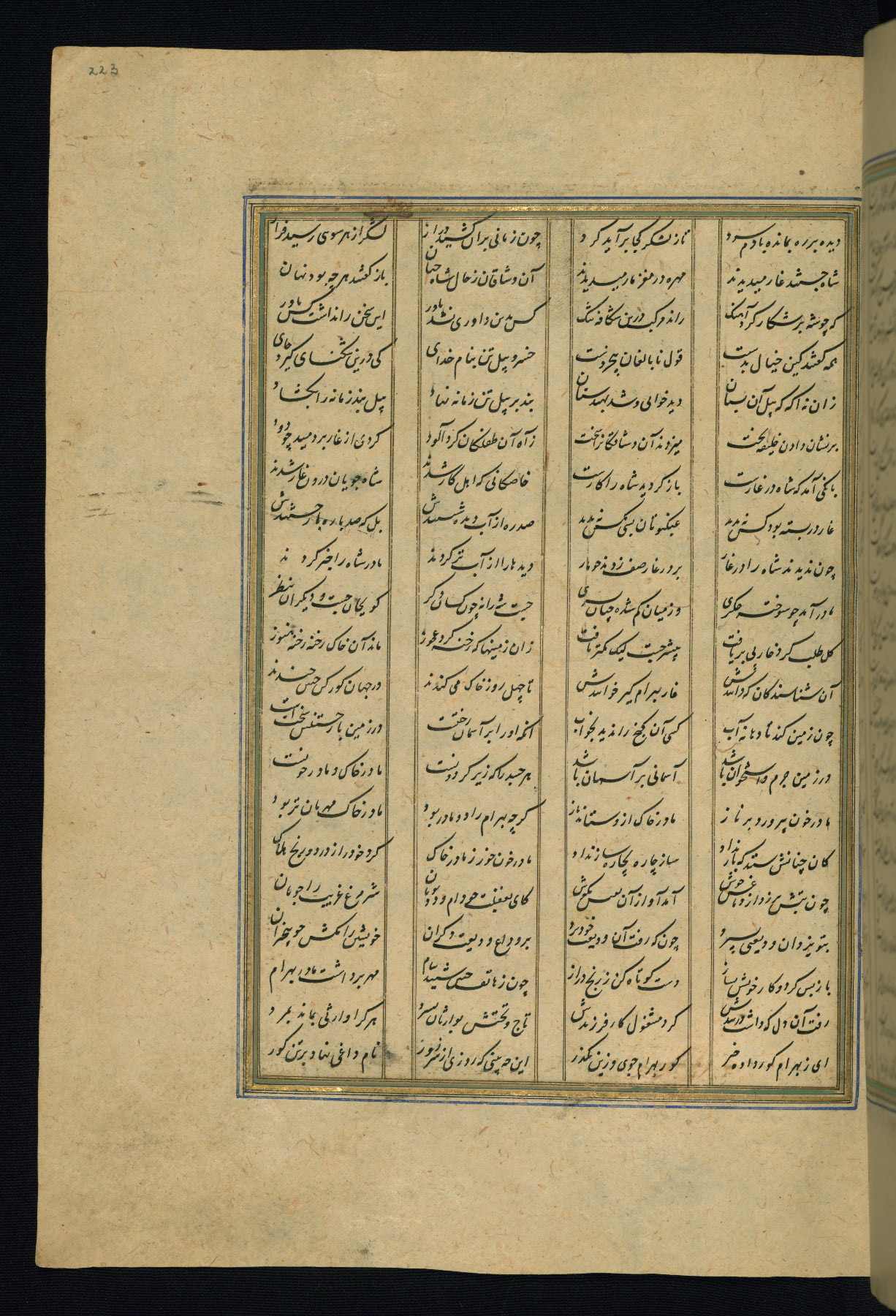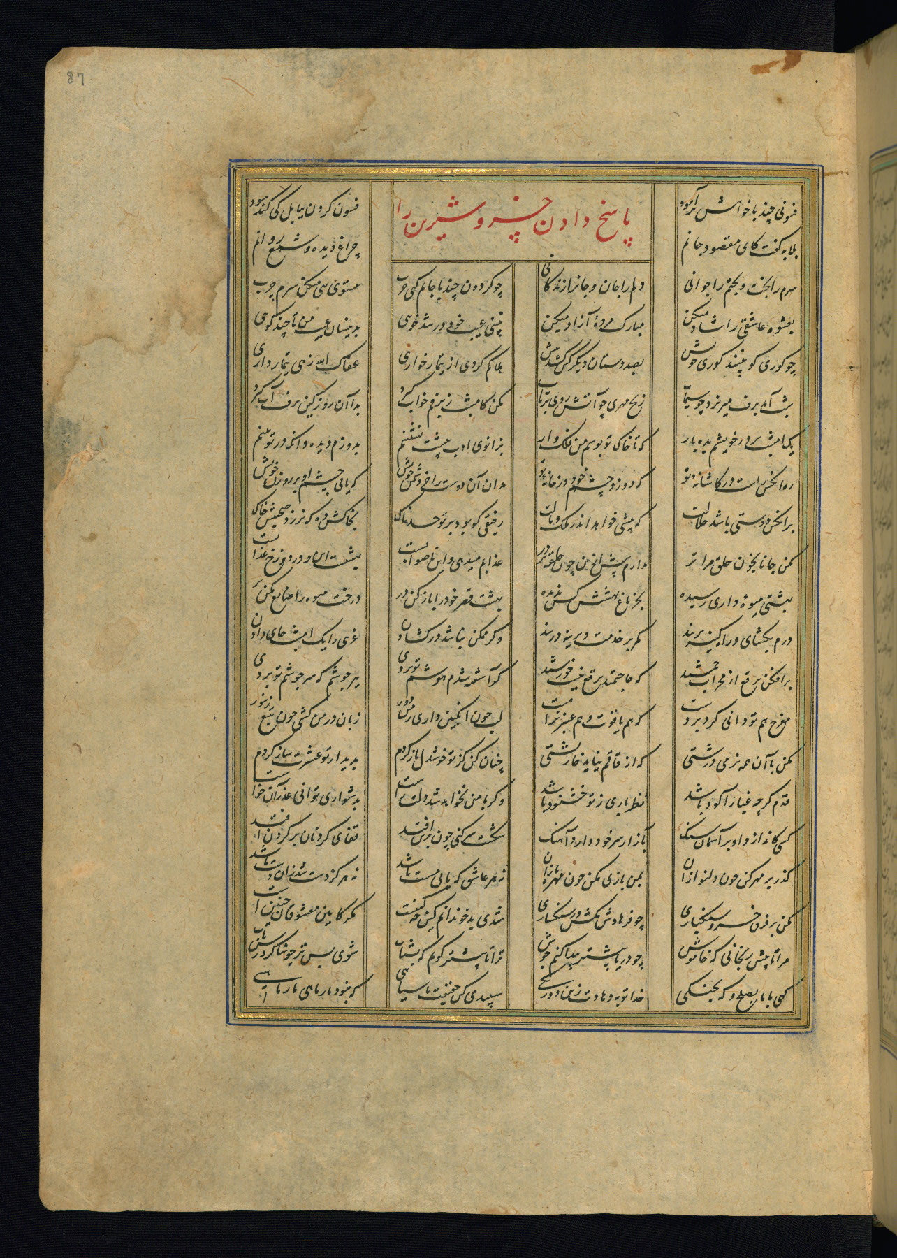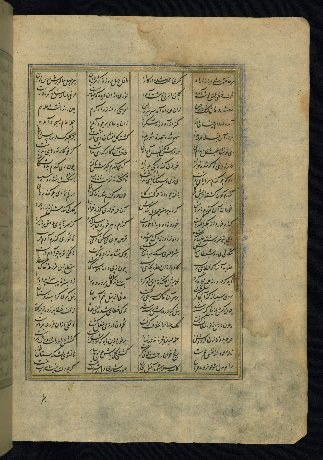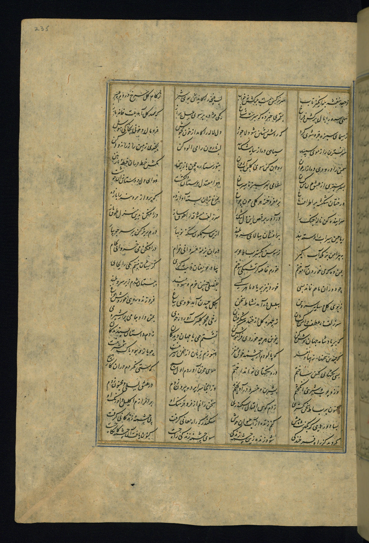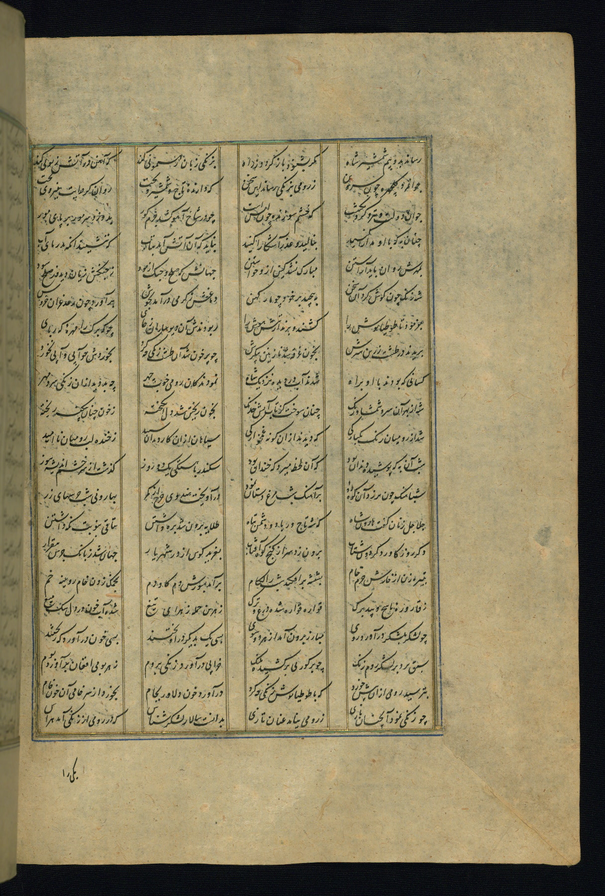 This is an illuminated and illustrated copy of the Khamsah (quintet) by Niẓāmī Ganjavī (d. 605 AH / 1209 CE), completed by Ḥabīb Allāh ibn ʿAlī ibn Ḥusām in Safavid Iran in Rabīʿ II 971 AH / 1563 CE. Illuminated titlepieces introduce the five poems, and there are thirty illustrations, the majority of which are attributable to thirteenth century AH / nineteenth CE Qajar Iran. Ownership notes and seals indicating the provenance of this manuscript are found throughout the codex (fols. 1a, 2a, 153a, 177a, 233a, 349a, and 351a). The binding is not original to the manuscript.