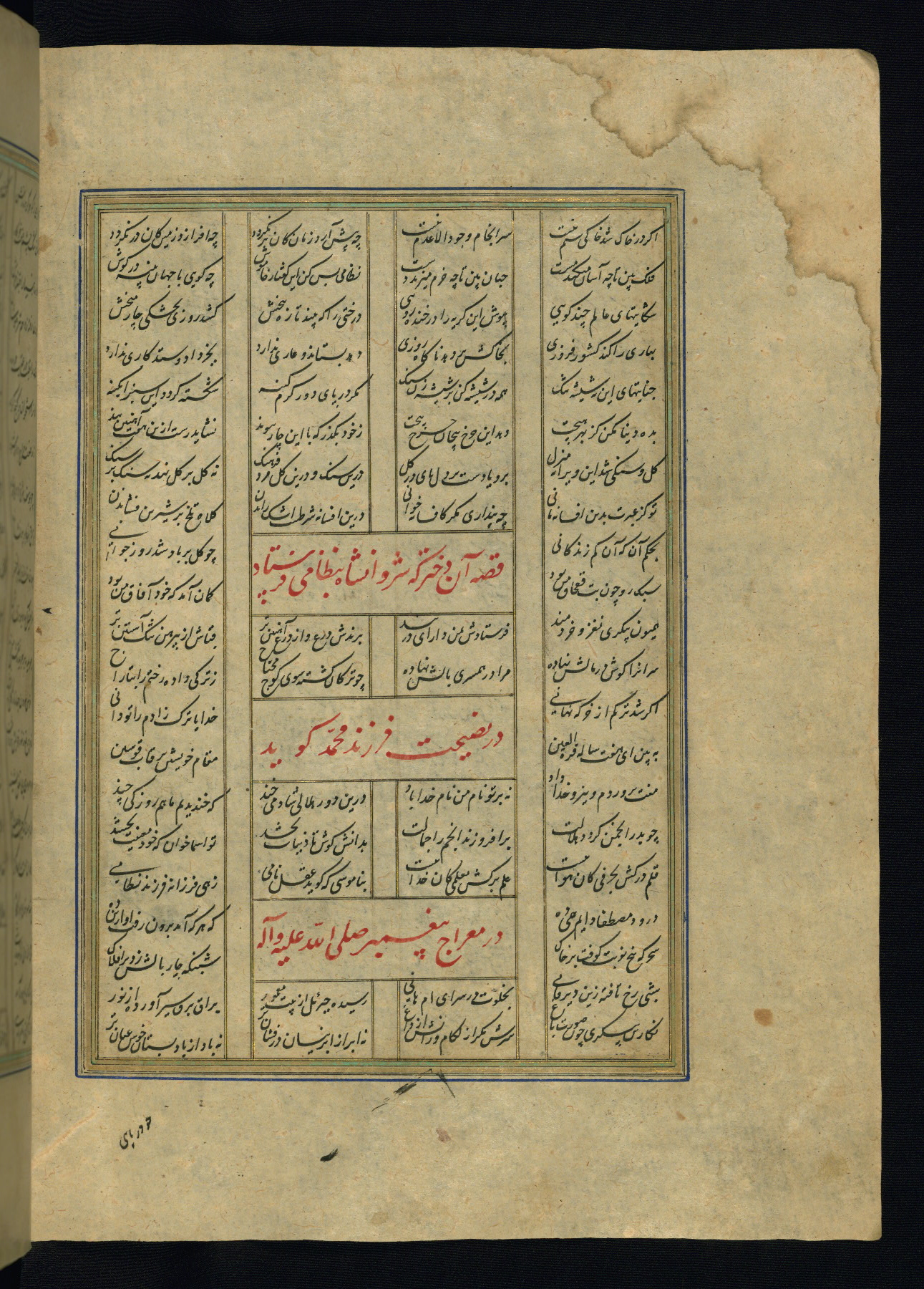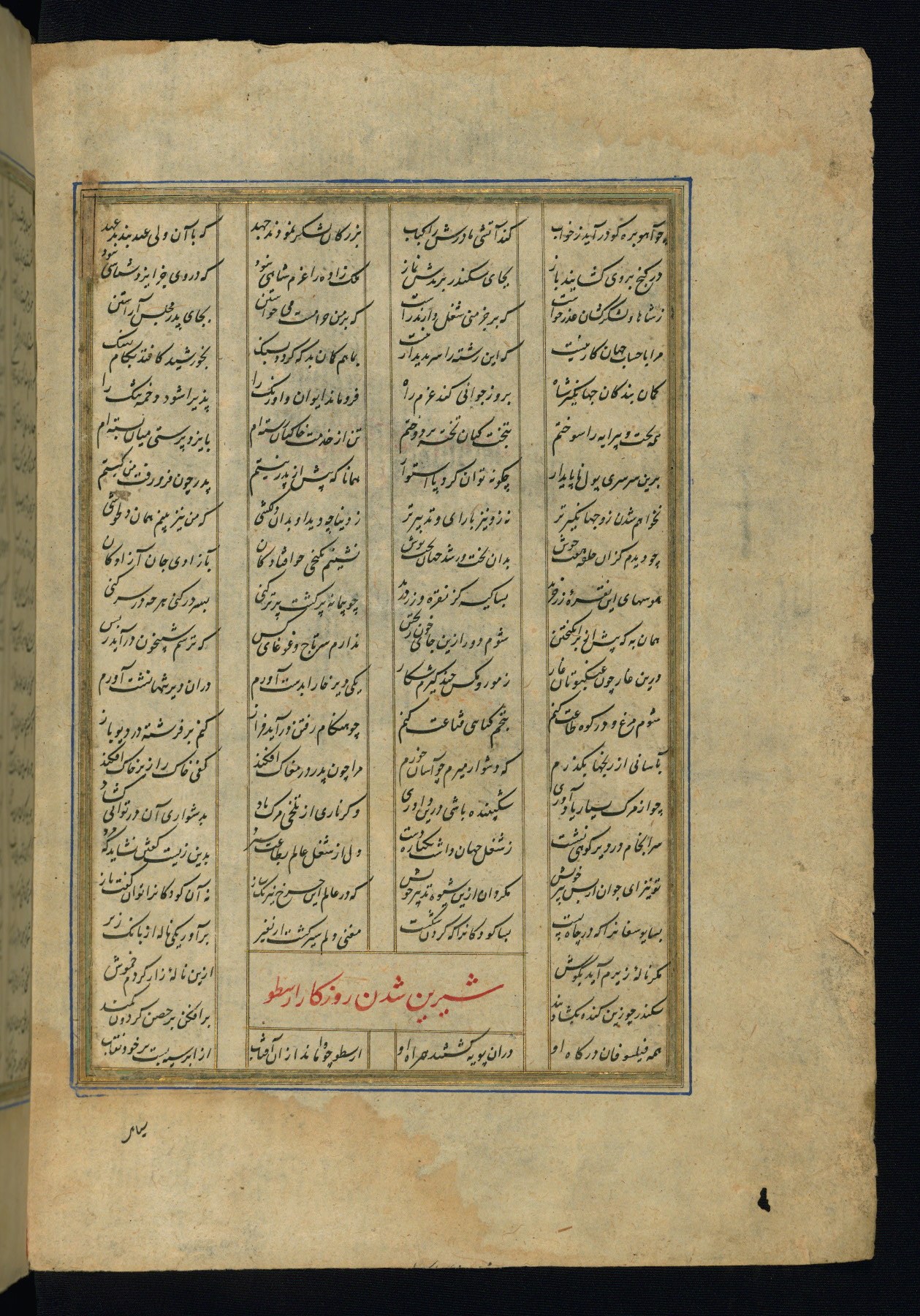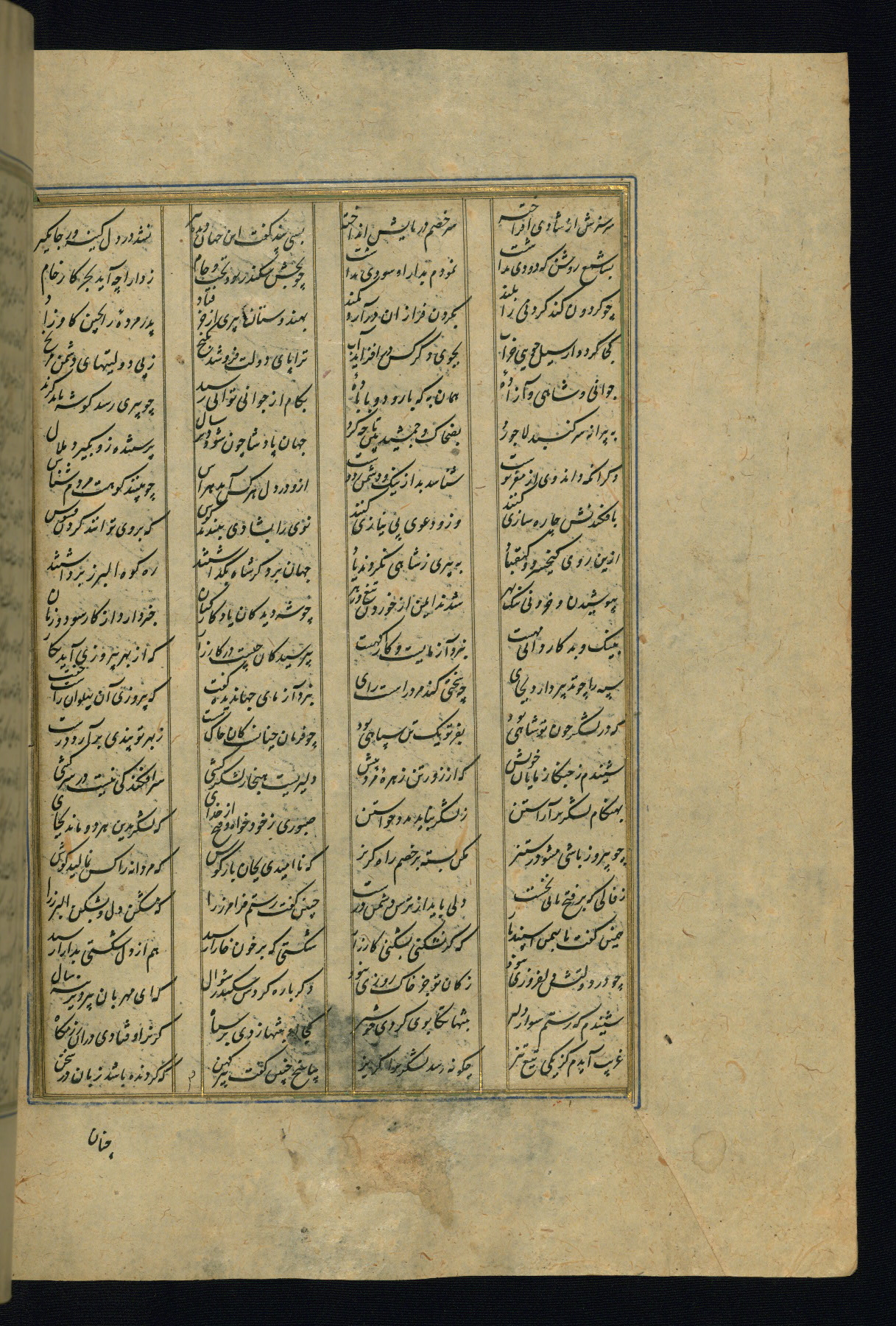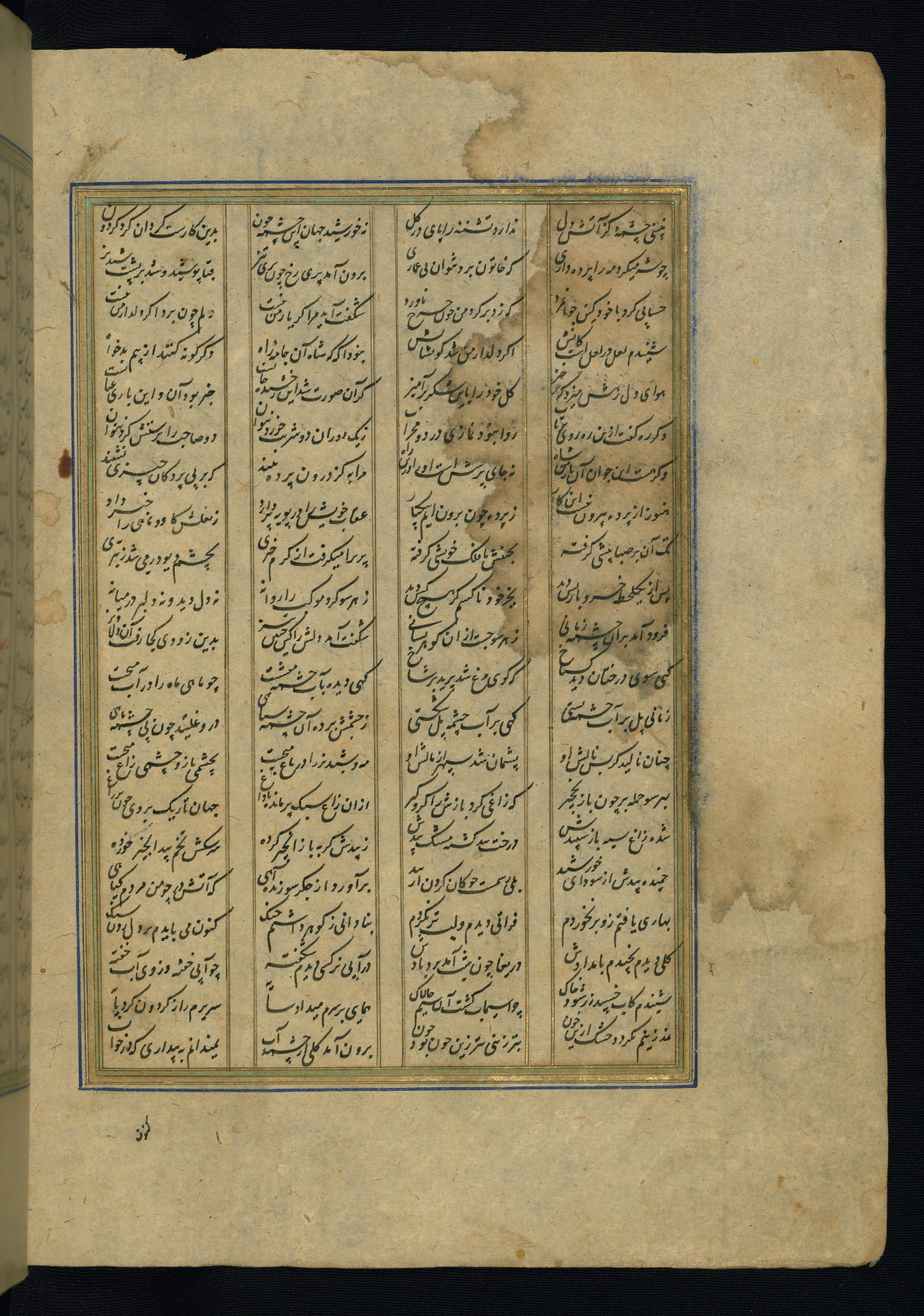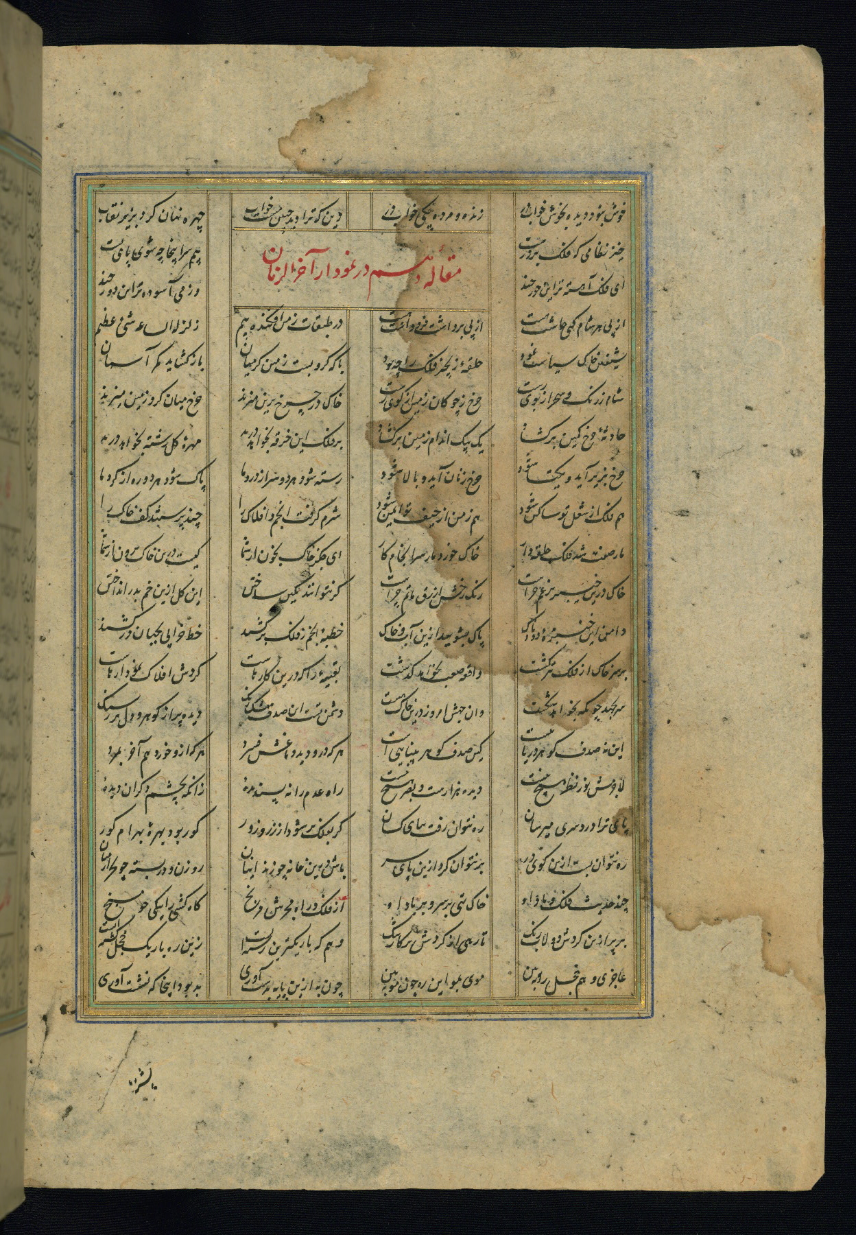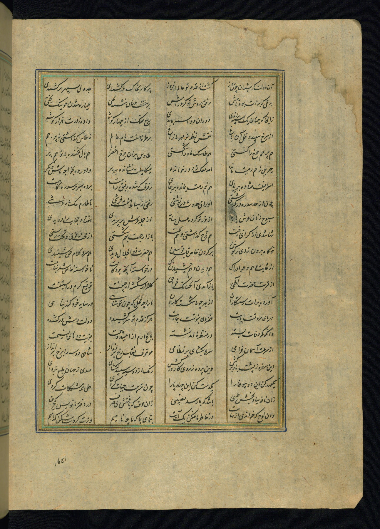 This is an illuminated and illustrated copy of the Khamsah (quintet) by Niẓāmī Ganjavī (d. 605 AH / 1209 CE), completed by Ḥabīb Allāh ibn ʿAlī ibn Ḥusām in Safavid Iran in Rabīʿ II 971 AH / 1563 CE. Illuminated titlepieces introduce the five poems, and there are thirty illustrations, the majority of which are attributable to thirteenth century AH / nineteenth CE Qajar Iran. Ownership notes and seals indicating the provenance of this manuscript are found throughout the codex (fols. 1a, 2a, 153a, 177a, 233a, 349a, and 351a). The binding is not original to the manuscript.