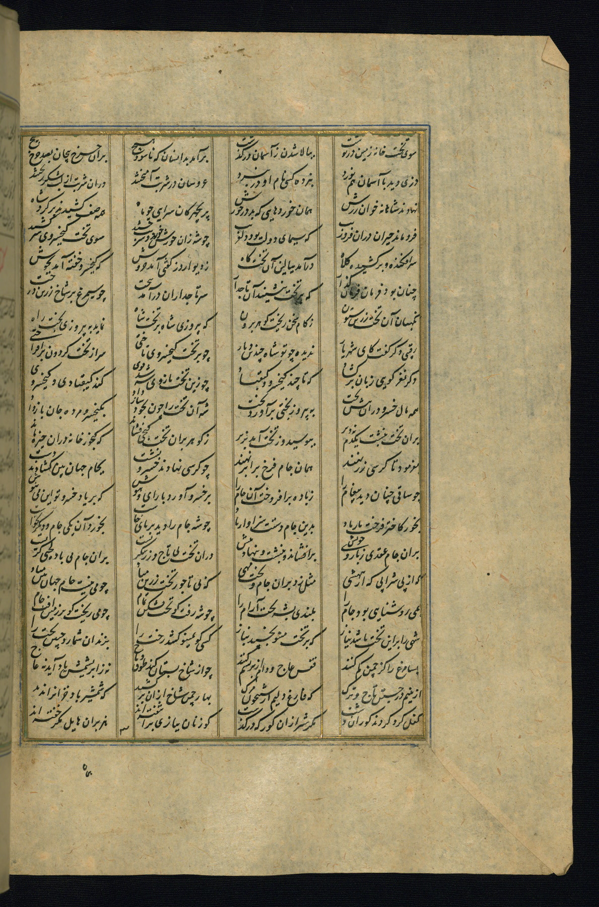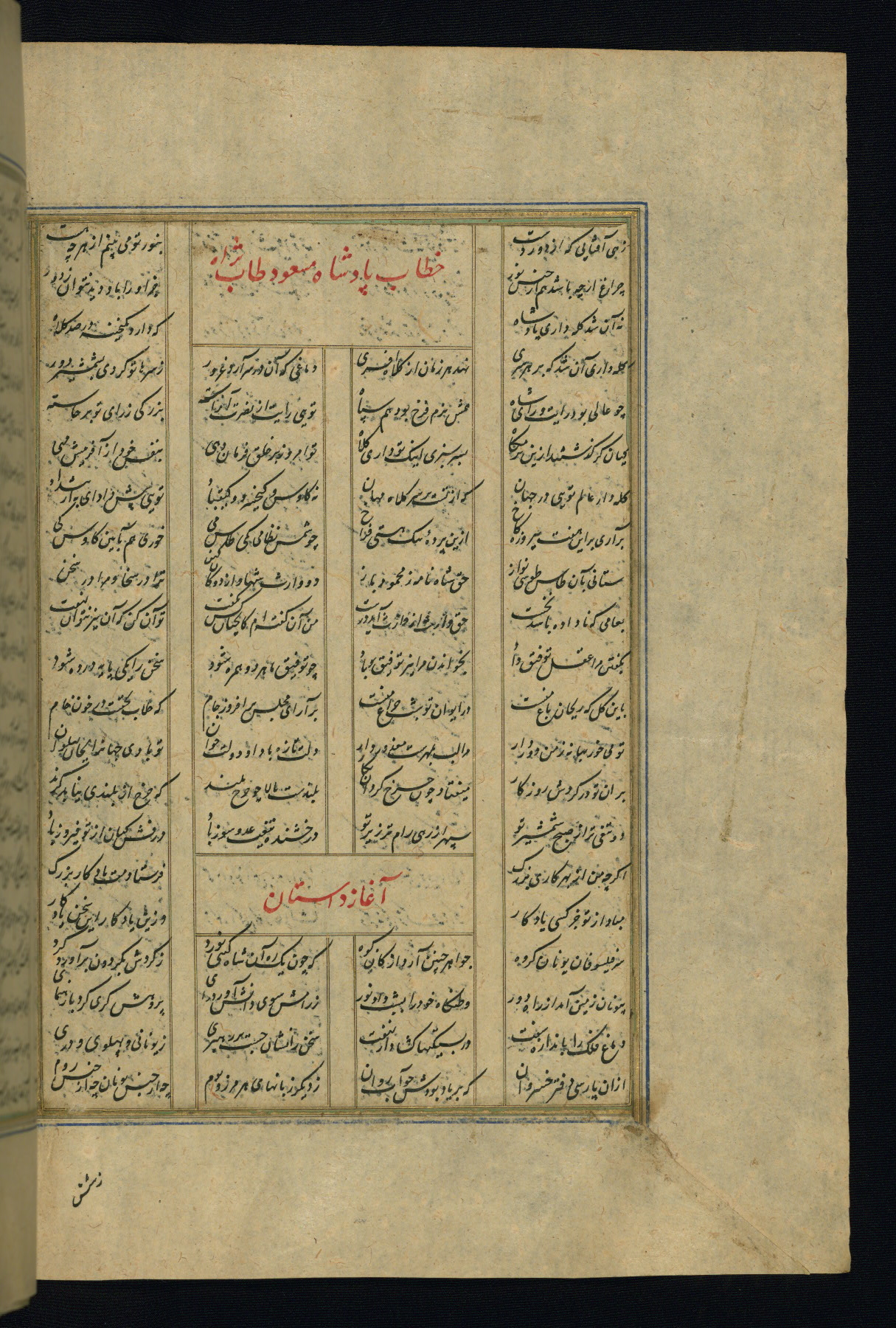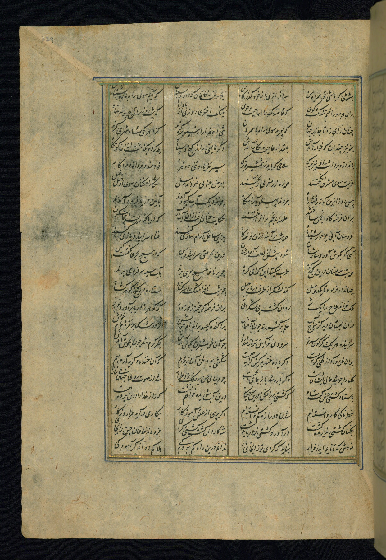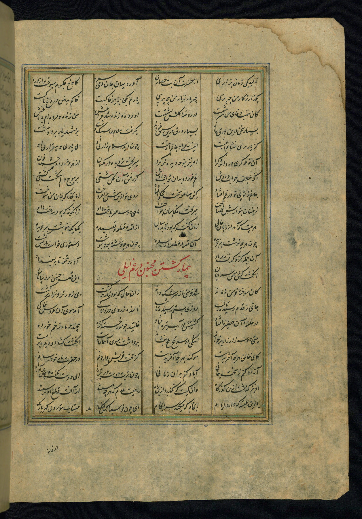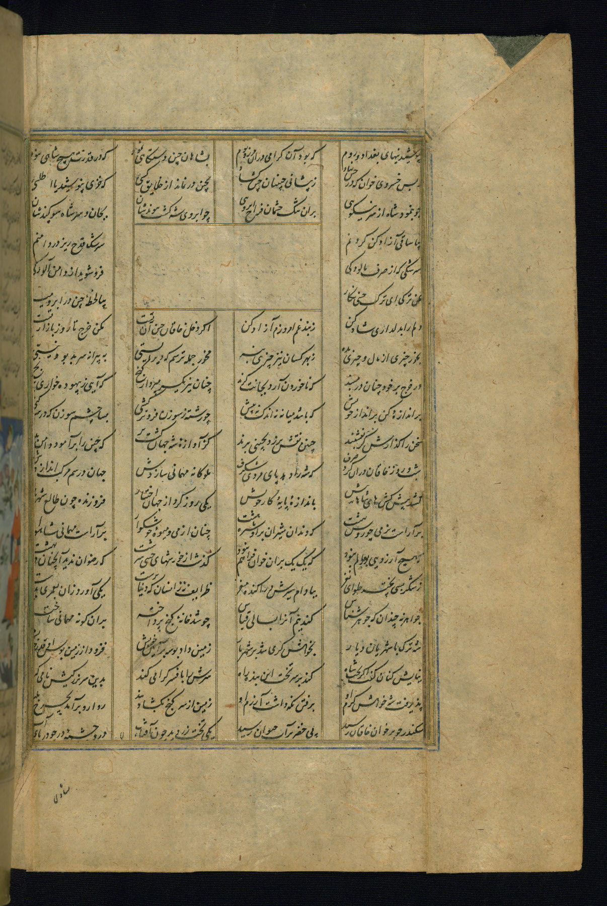 This is an illuminated and illustrated copy of the Khamsah (quintet) by Niẓāmī Ganjavī (d. 605 AH / 1209 CE), completed by Ḥabīb Allāh ibn ʿAlī ibn Ḥusām in Safavid Iran in Rabīʿ II 971 AH / 1563 CE. Illuminated titlepieces introduce the five poems, and there are thirty illustrations, the majority of which are attributable to thirteenth century AH / nineteenth CE Qajar Iran. Ownership notes and seals indicating the provenance of this manuscript are found throughout the codex (fols. 1a, 2a, 153a, 177a, 233a, 349a, and 351a). The binding is not original to the manuscript.