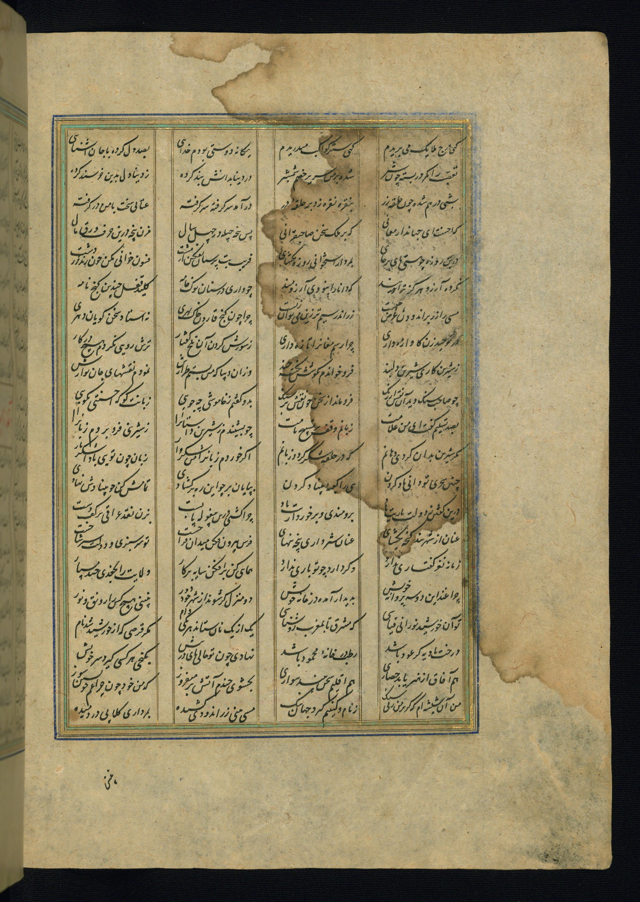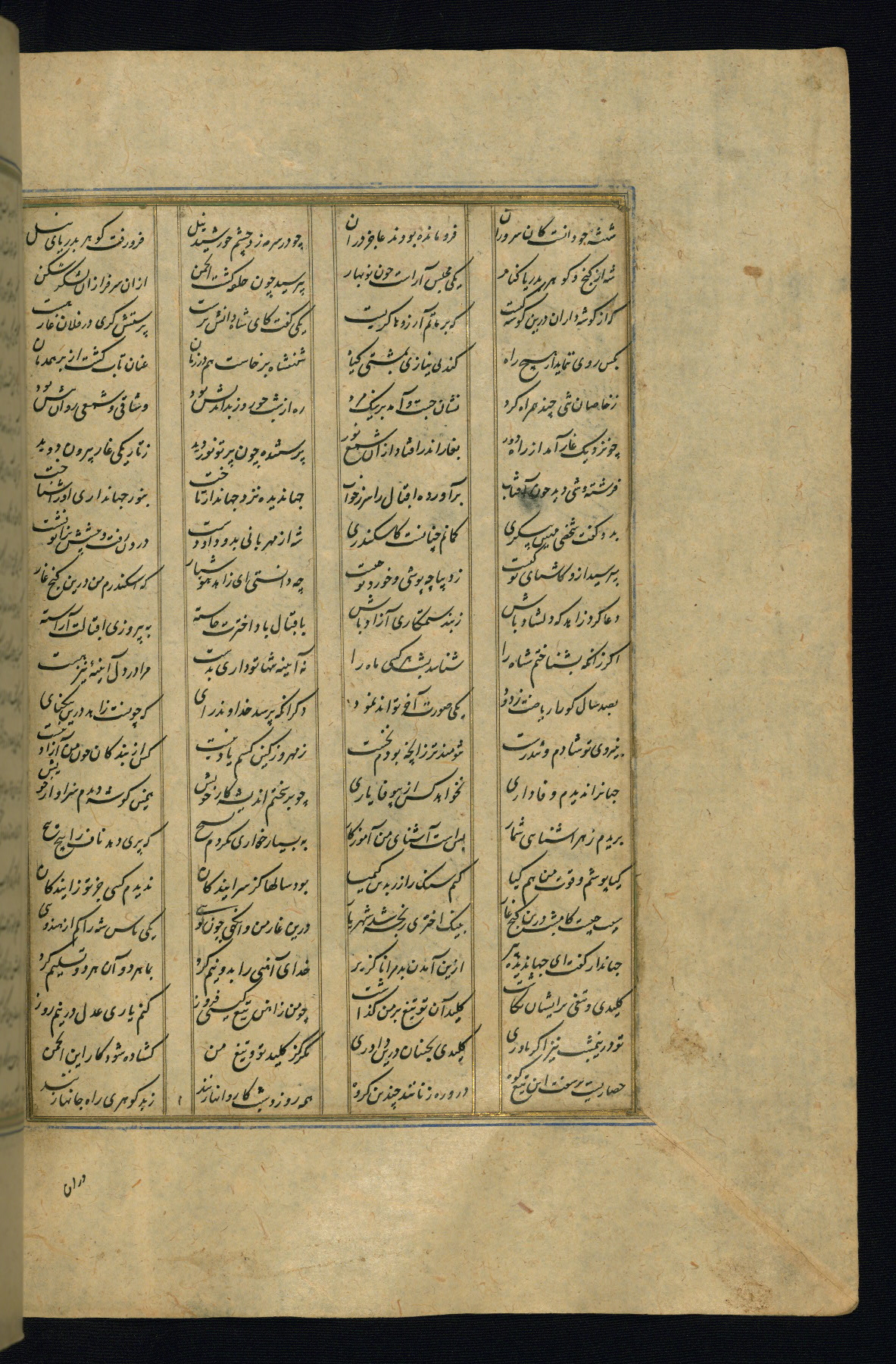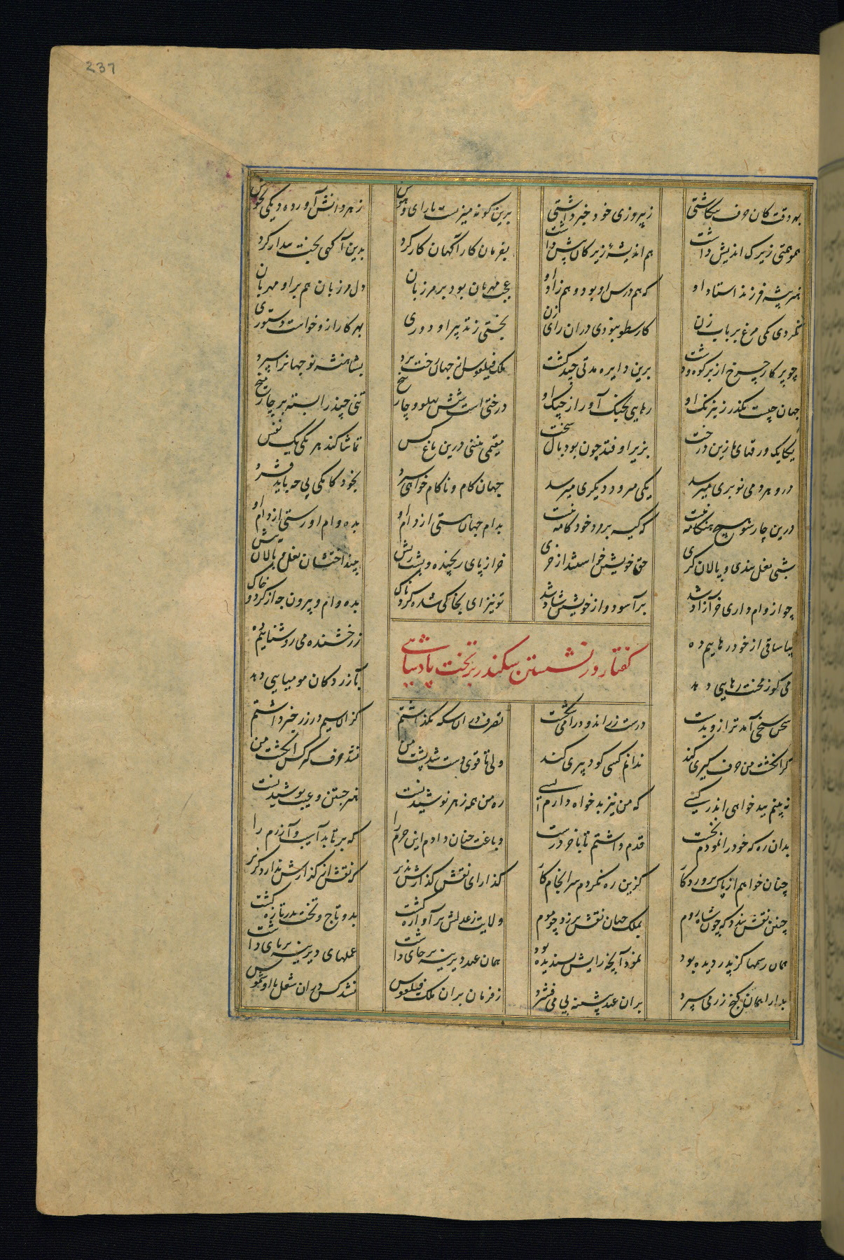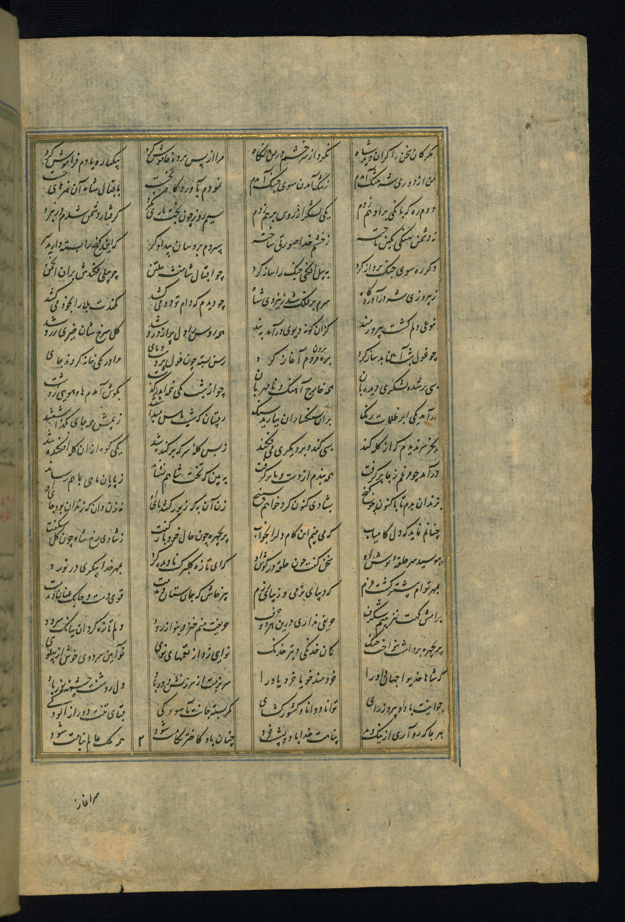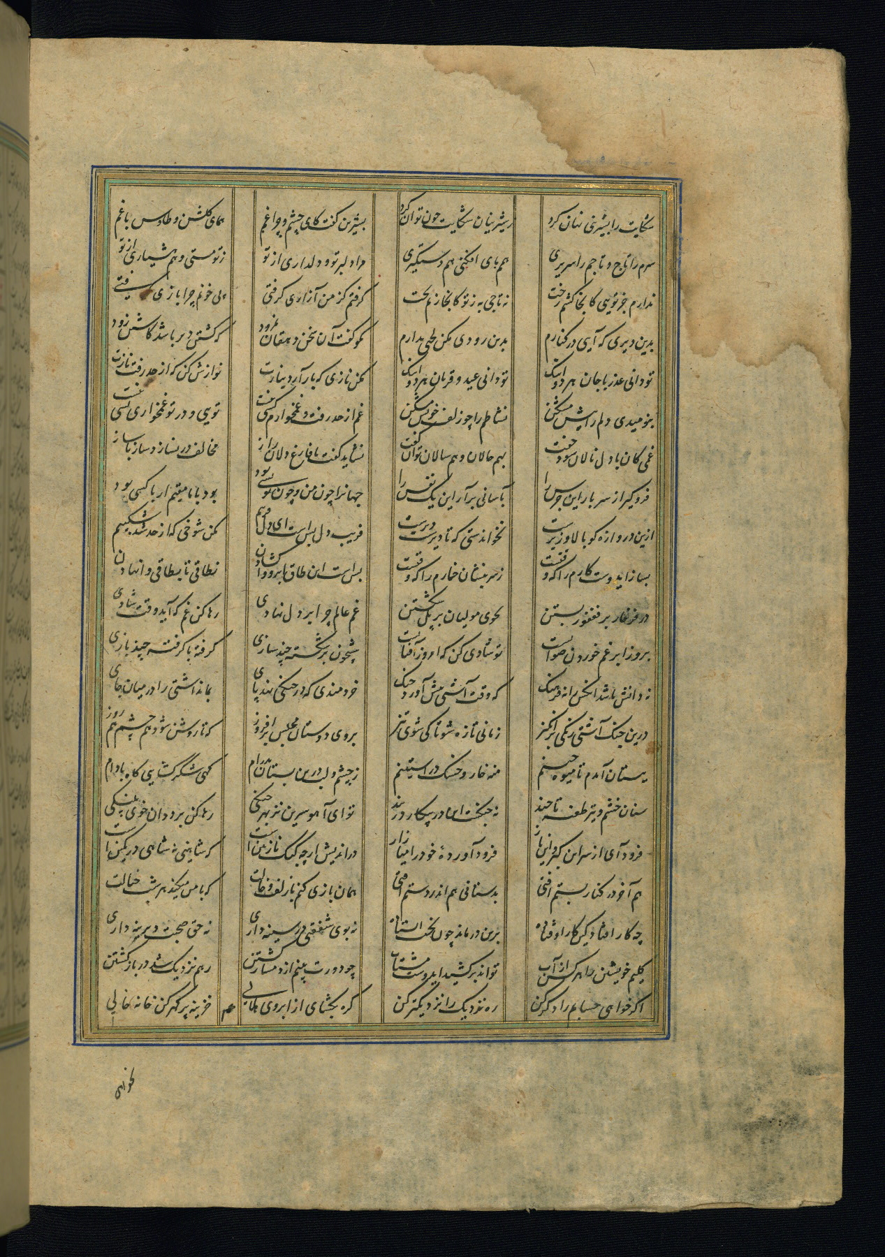 This is an illuminated and illustrated copy of the Khamsah (quintet) by Niẓāmī Ganjavī (d. 605 AH / 1209 CE), completed by Ḥabīb Allāh ibn ʿAlī ibn Ḥusām in Safavid Iran in Rabīʿ II 971 AH / 1563 CE. Illuminated titlepieces introduce the five poems, and there are thirty illustrations, the majority of which are attributable to thirteenth century AH / nineteenth CE Qajar Iran. Ownership notes and seals indicating the provenance of this manuscript are found throughout the codex (fols. 1a, 2a, 153a, 177a, 233a, 349a, and 351a). The binding is not original to the manuscript.