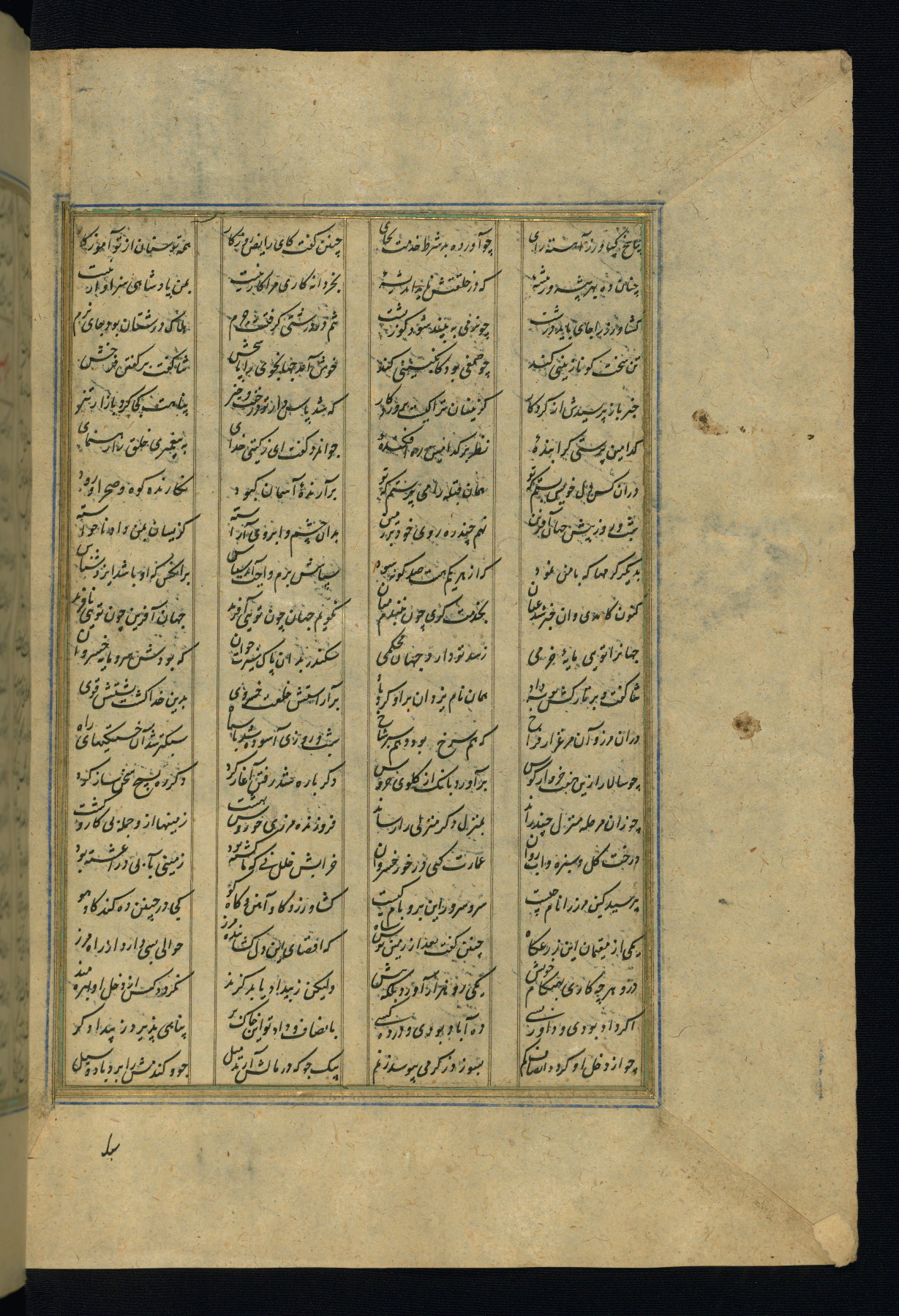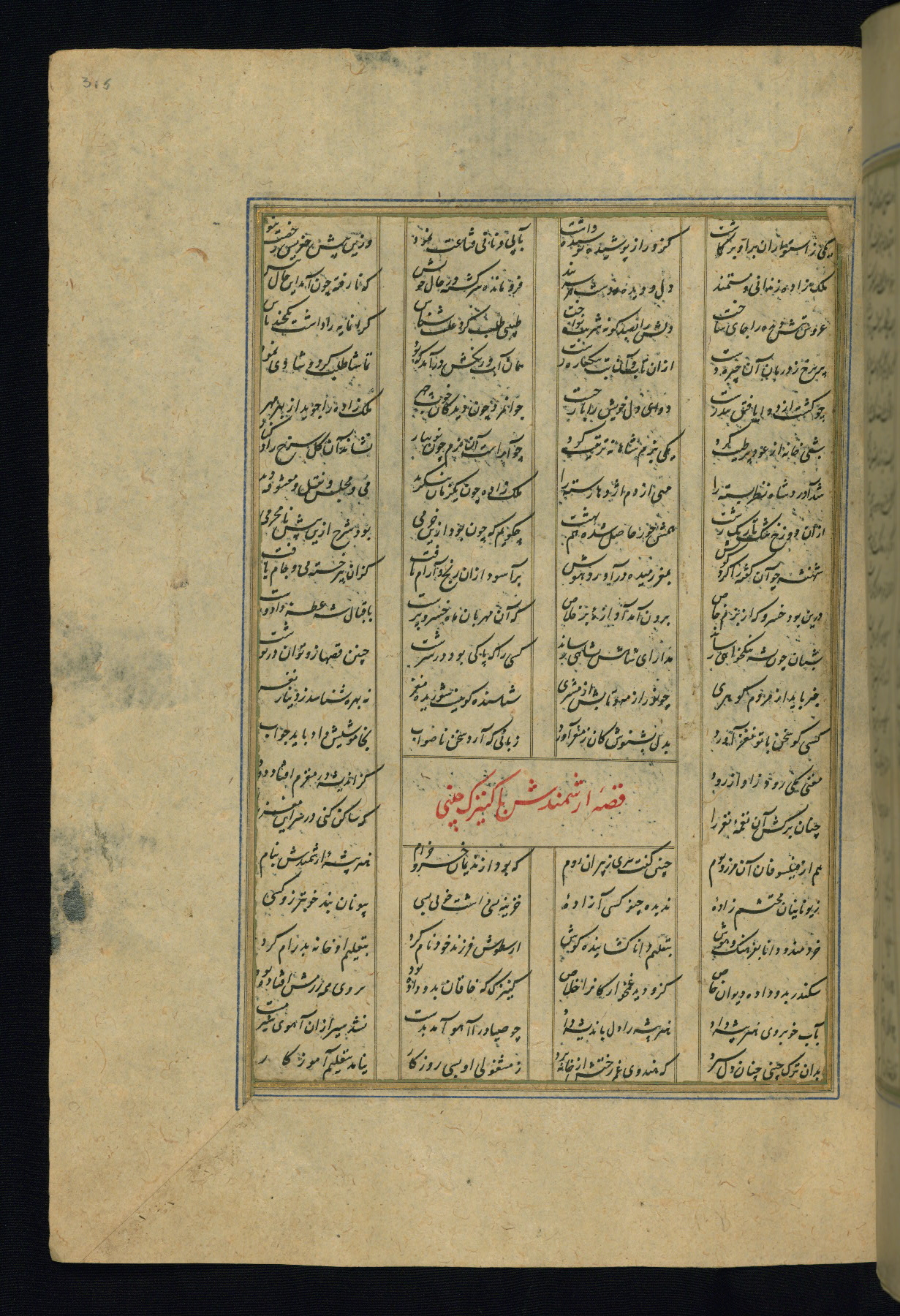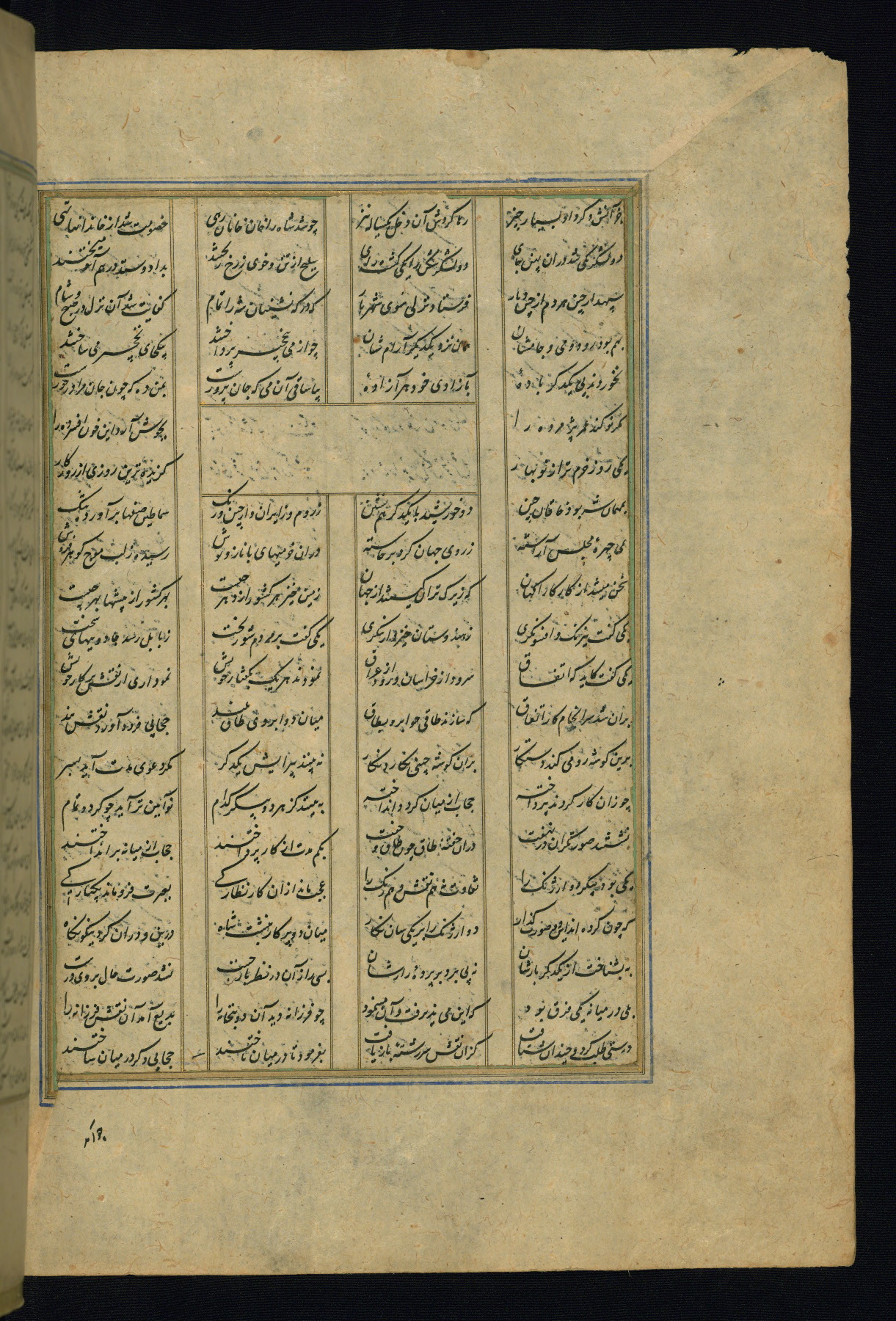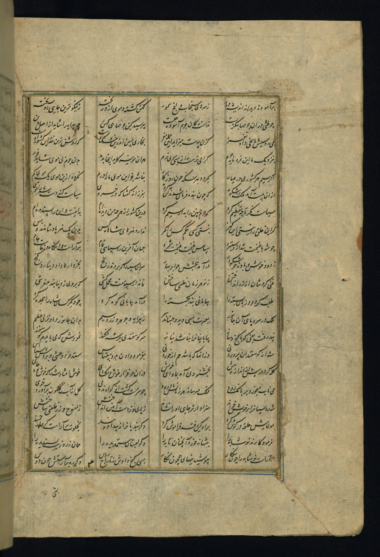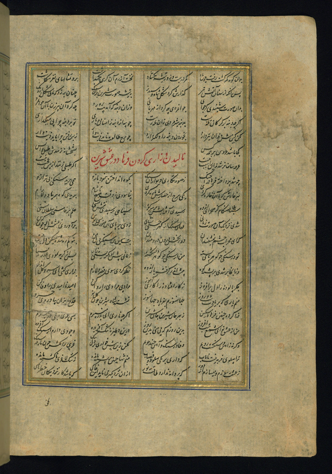 This is an illuminated and illustrated copy of the Khamsah (quintet) by Niẓāmī Ganjavī (d. 605 AH / 1209 CE), completed by Ḥabīb Allāh ibn ʿAlī ibn Ḥusām in Safavid Iran in Rabīʿ II 971 AH / 1563 CE. Illuminated titlepieces introduce the five poems, and there are thirty illustrations, the majority of which are attributable to thirteenth century AH / nineteenth CE Qajar Iran. Ownership notes and seals indicating the provenance of this manuscript are found throughout the codex (fols. 1a, 2a, 153a, 177a, 233a, 349a, and 351a). The binding is not original to the manuscript.