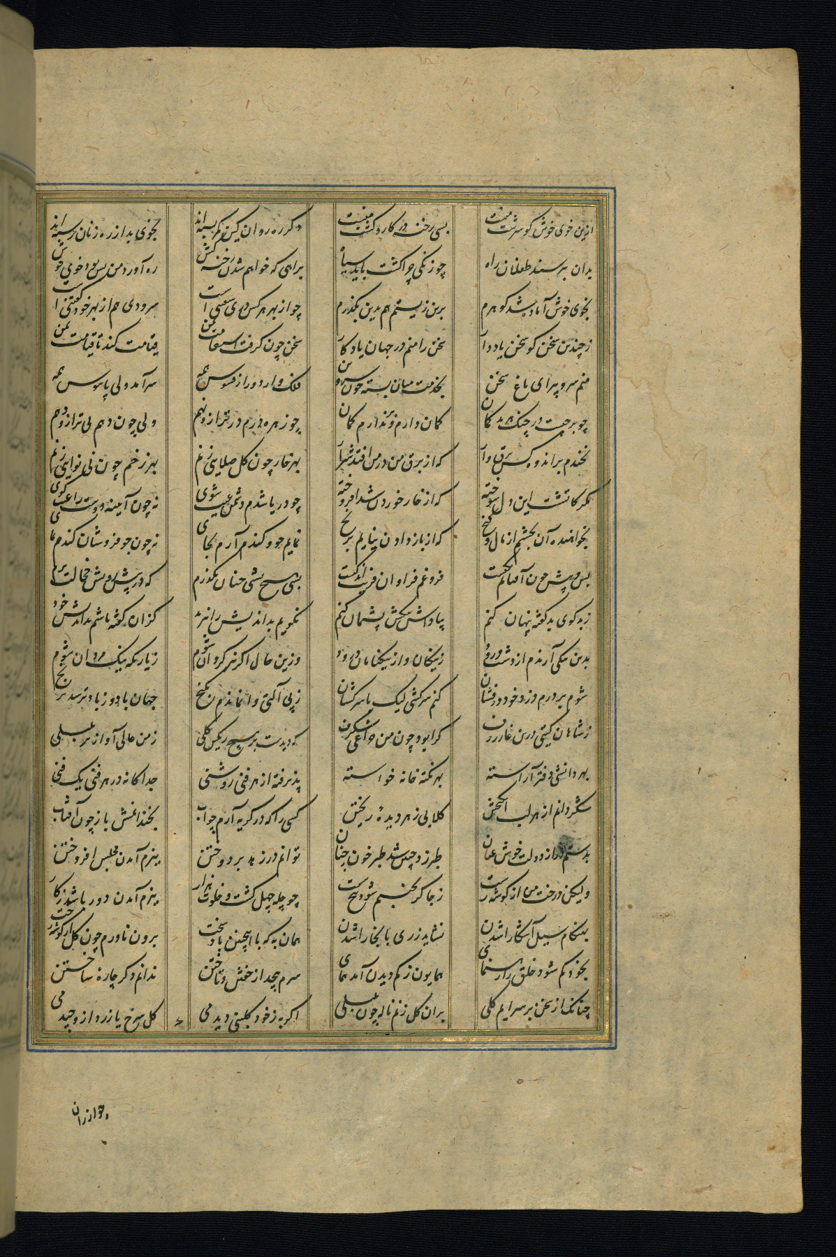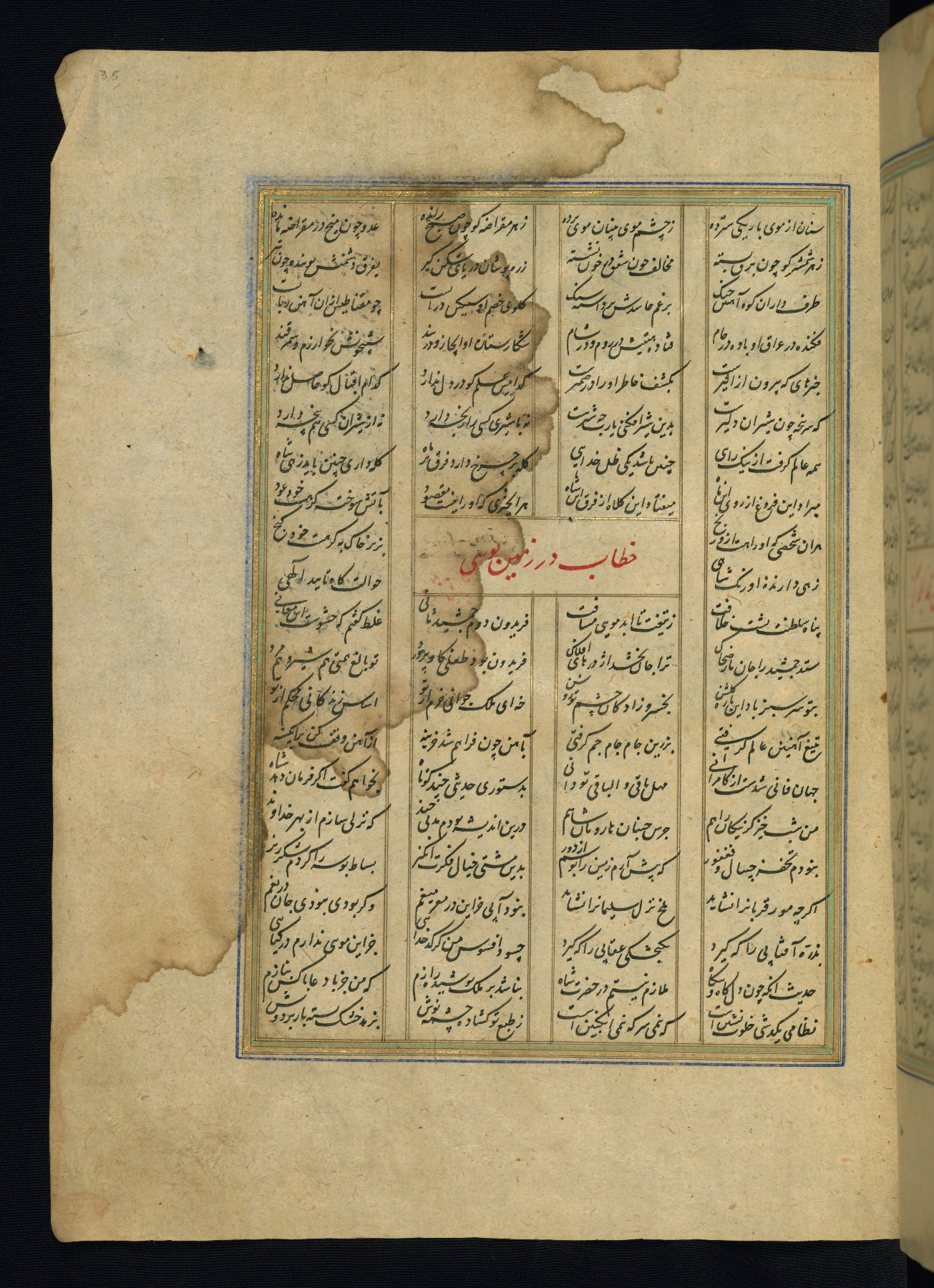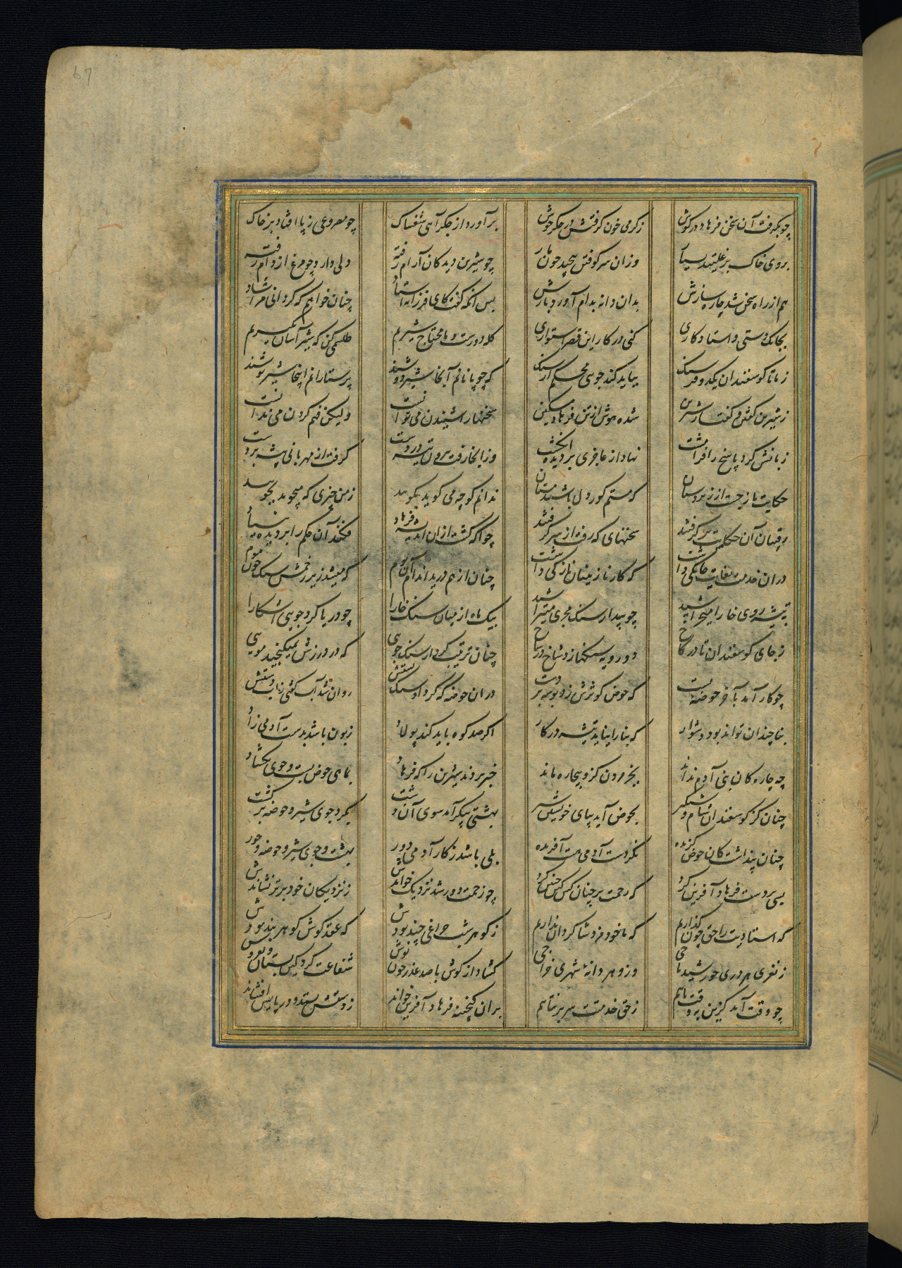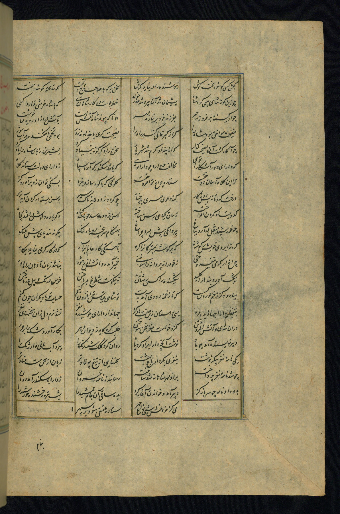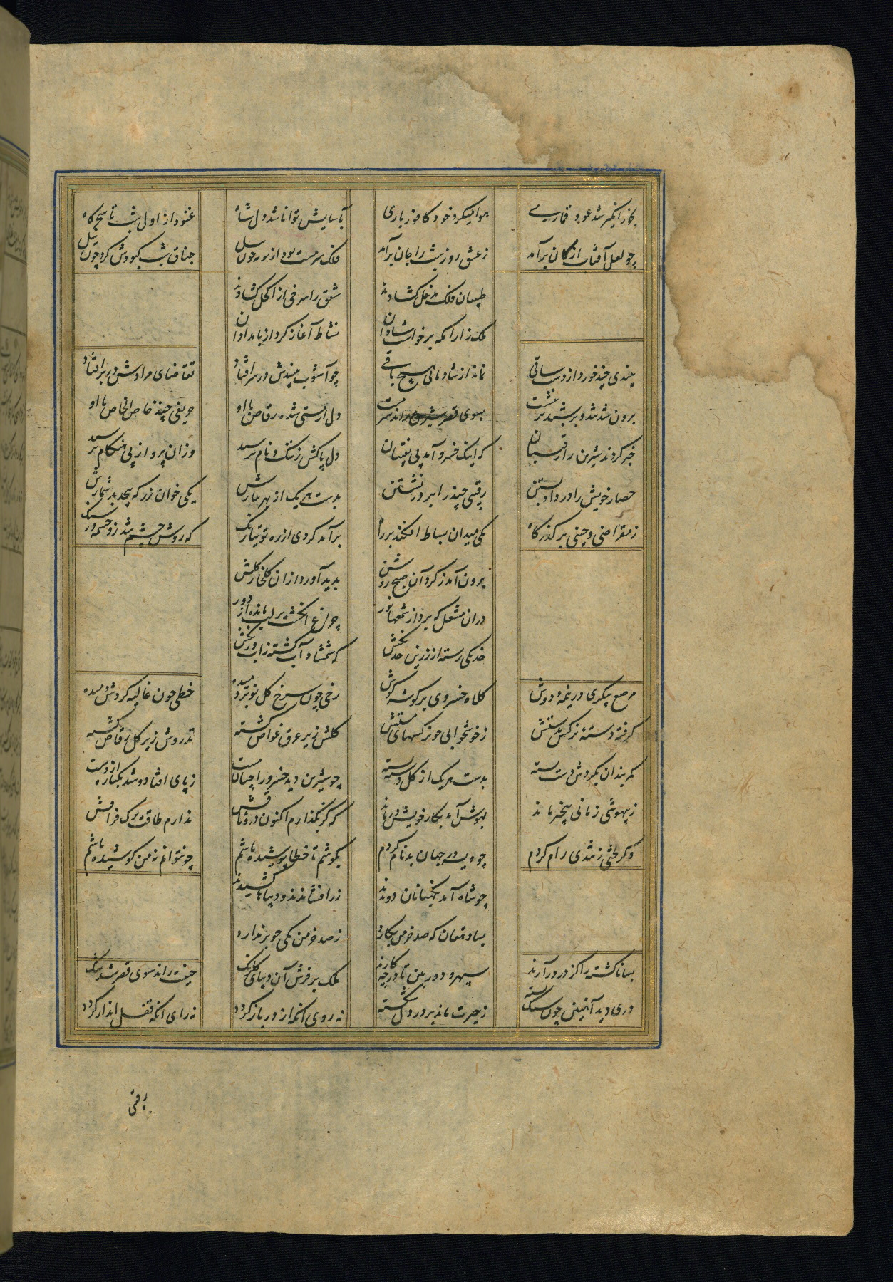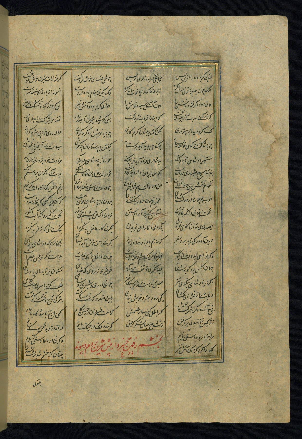 This is an illuminated and illustrated copy of the Khamsah (quintet) by Niẓāmī Ganjavī (d. 605 AH / 1209 CE), completed by Ḥabīb Allāh ibn ʿAlī ibn Ḥusām in Safavid Iran in Rabīʿ II 971 AH / 1563 CE. Illuminated titlepieces introduce the five poems, and there are thirty illustrations, the majority of which are attributable to thirteenth century AH / nineteenth CE Qajar Iran. Ownership notes and seals indicating the provenance of this manuscript are found throughout the codex (fols. 1a, 2a, 153a, 177a, 233a, 349a, and 351a). The binding is not original to the manuscript.