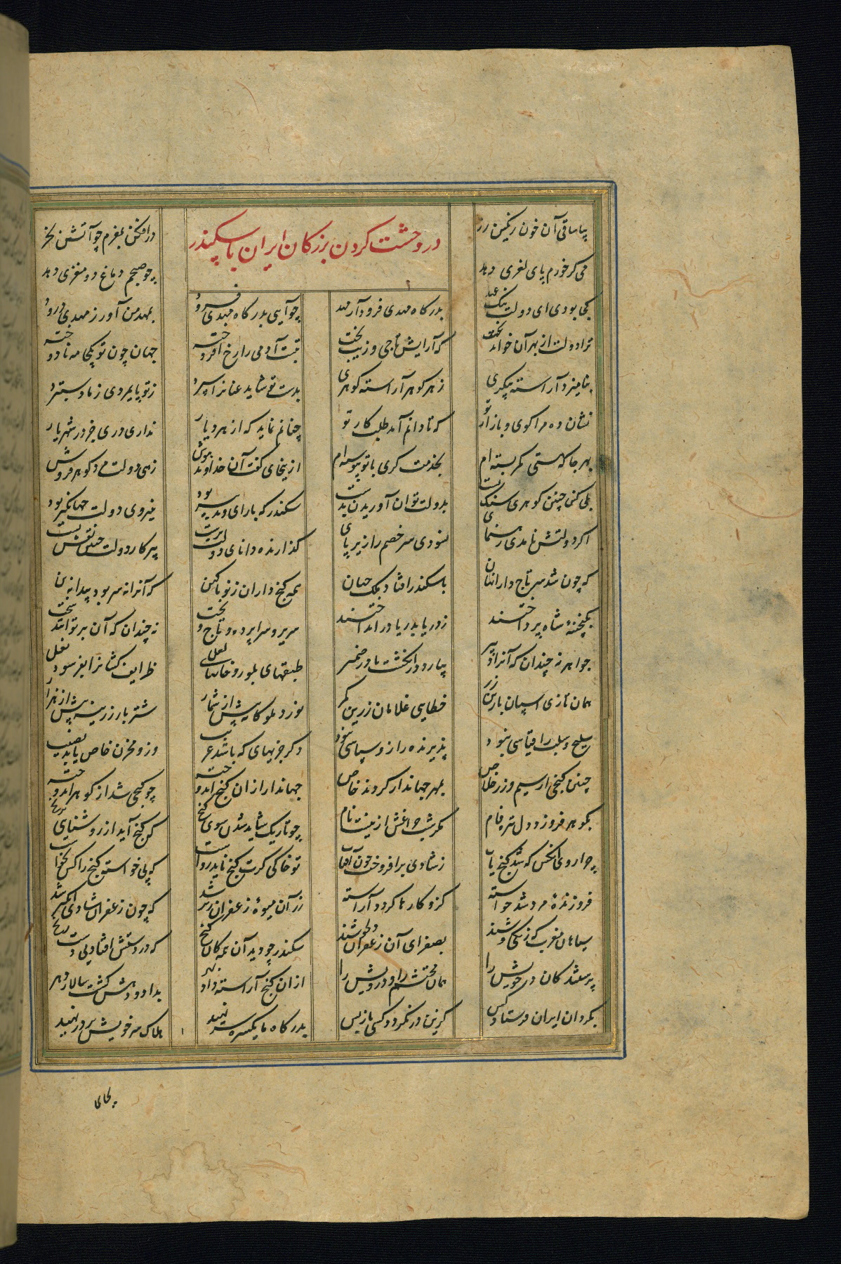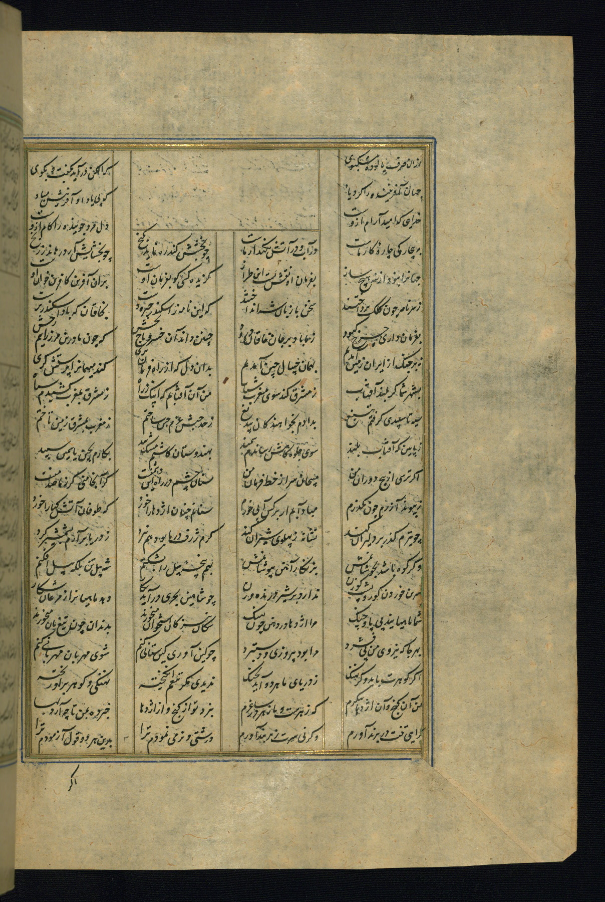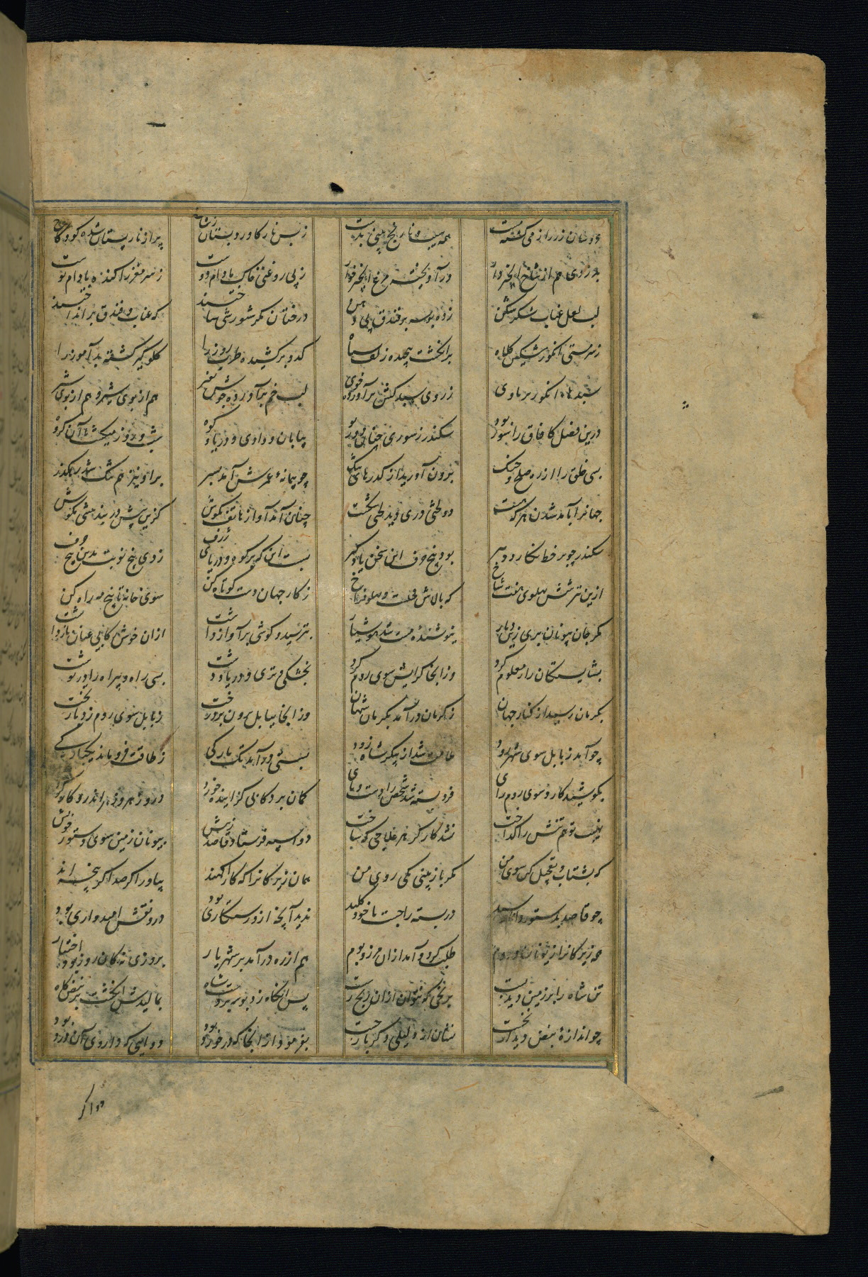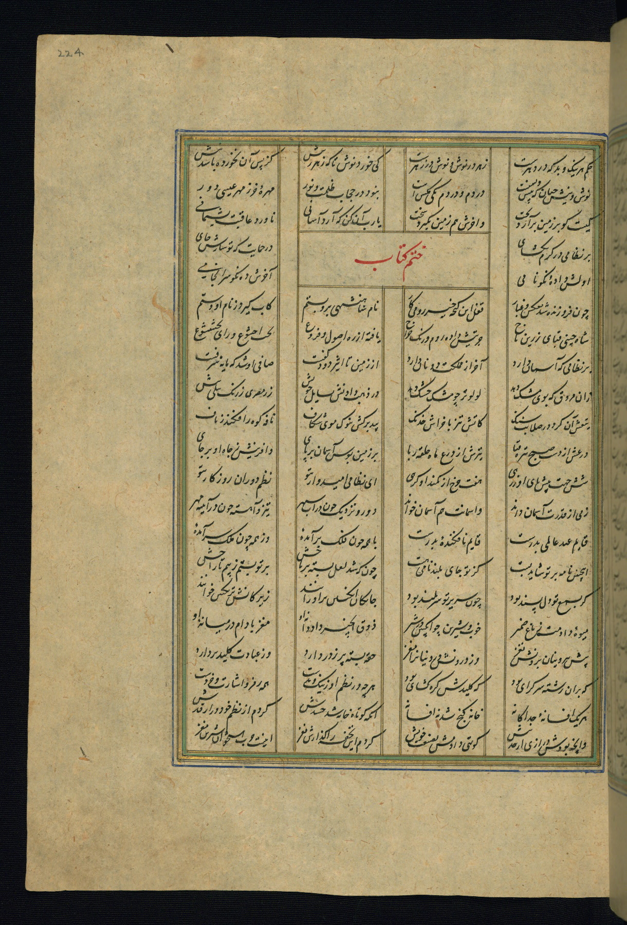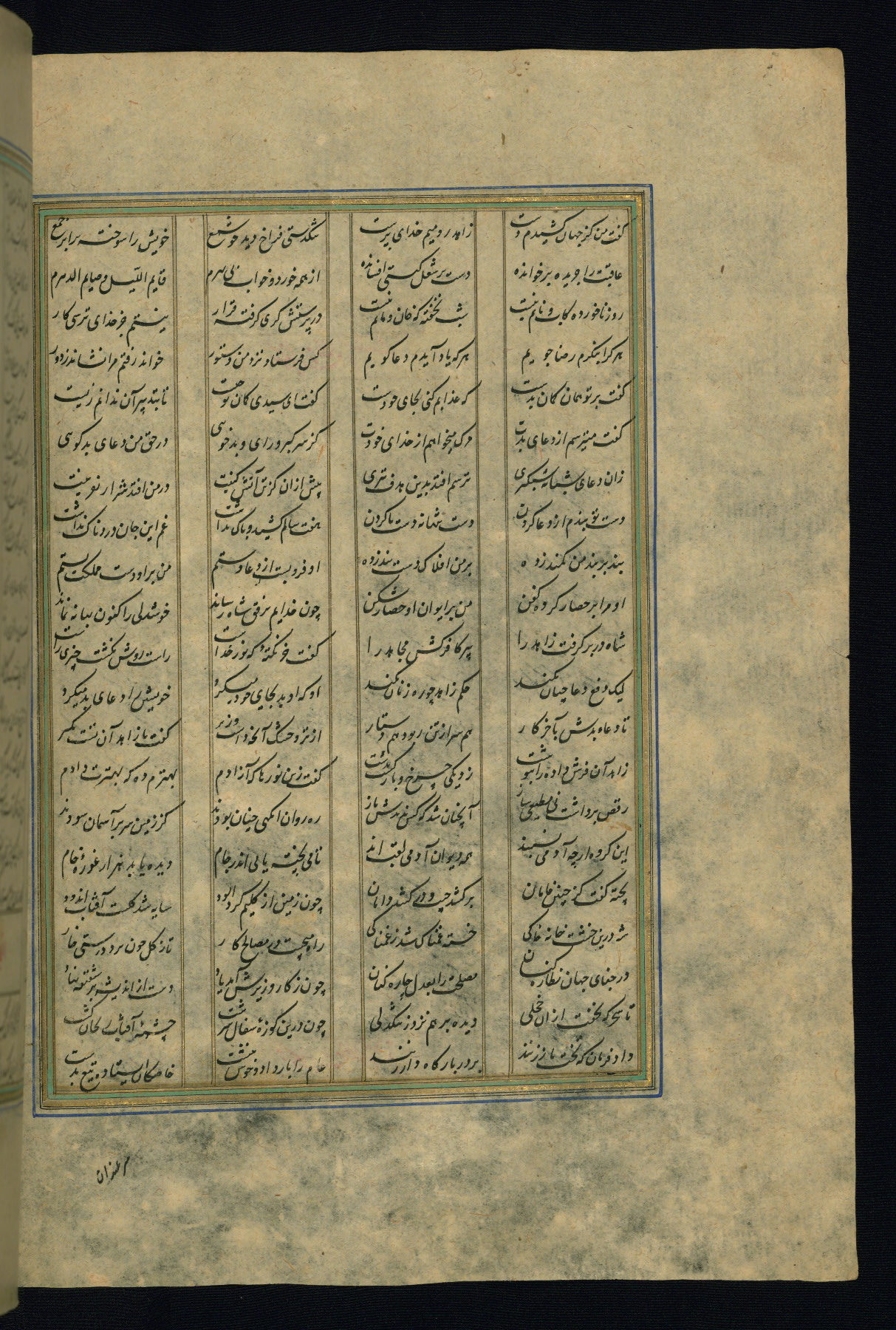 This is an illuminated and illustrated copy of the Khamsah (quintet) by Niẓāmī Ganjavī (d. 605 AH / 1209 CE), completed by Ḥabīb Allāh ibn ʿAlī ibn Ḥusām in Safavid Iran in Rabīʿ II 971 AH / 1563 CE. Illuminated titlepieces introduce the five poems, and there are thirty illustrations, the majority of which are attributable to thirteenth century AH / nineteenth CE Qajar Iran. Ownership notes and seals indicating the provenance of this manuscript are found throughout the codex (fols. 1a, 2a, 153a, 177a, 233a, 349a, and 351a). The binding is not original to the manuscript.