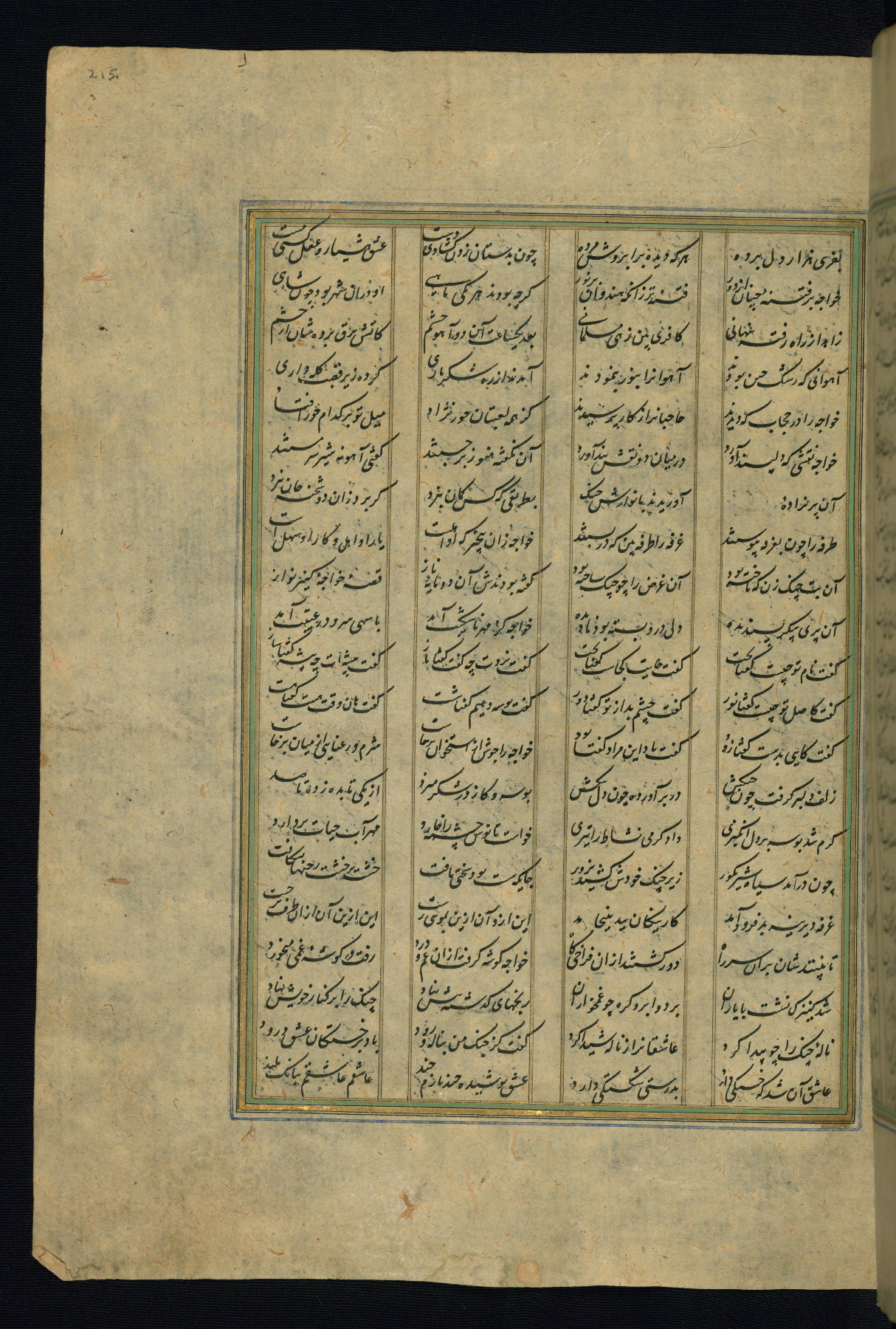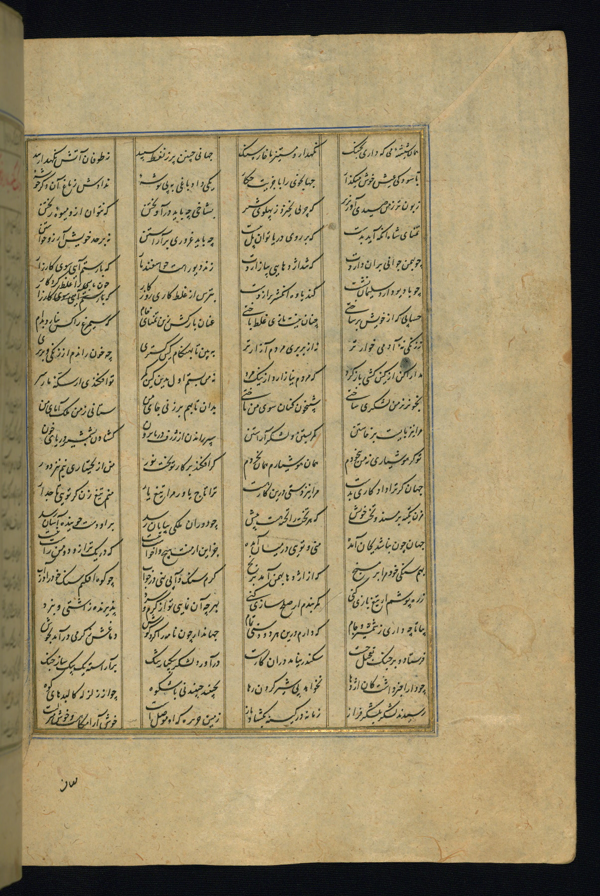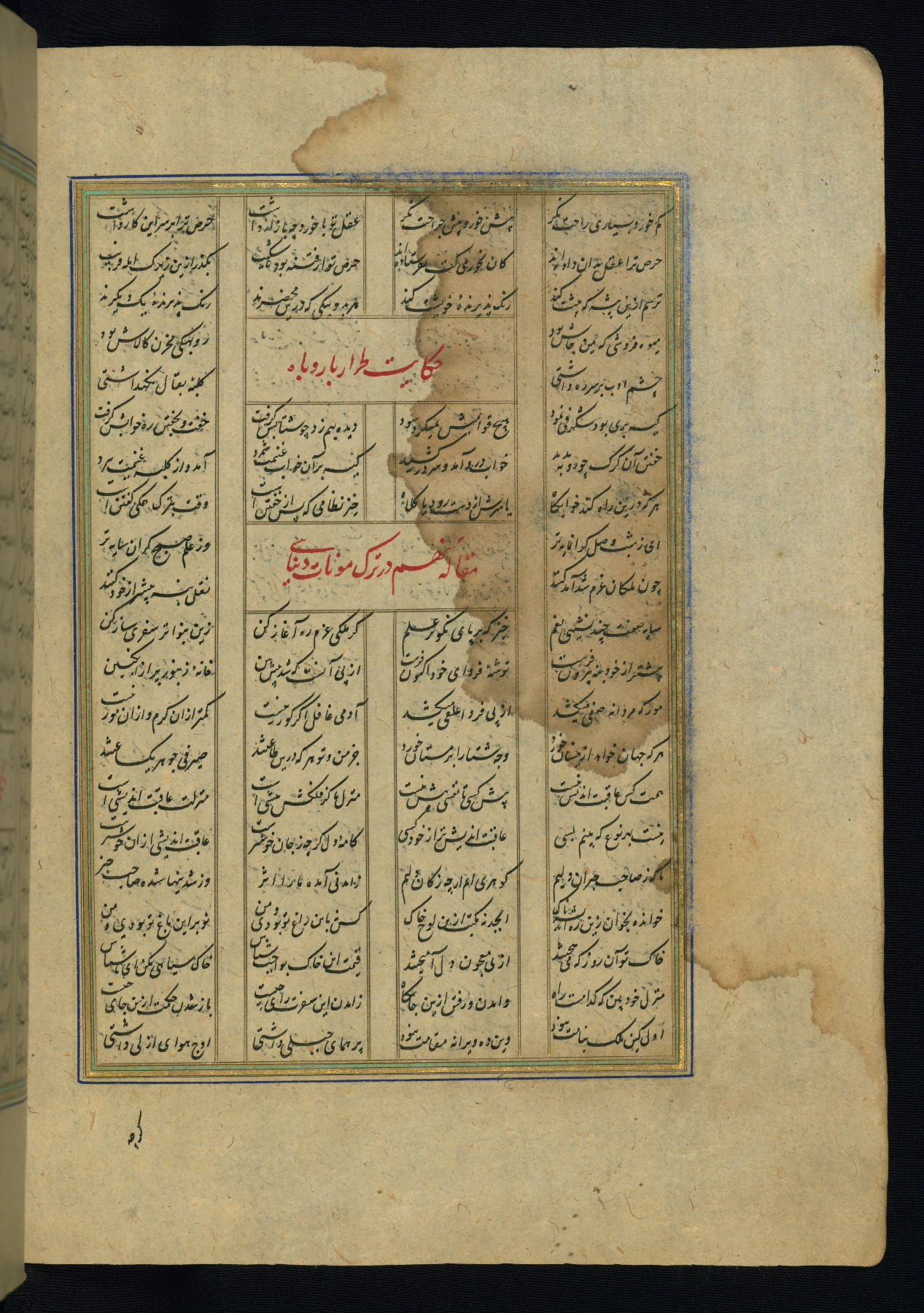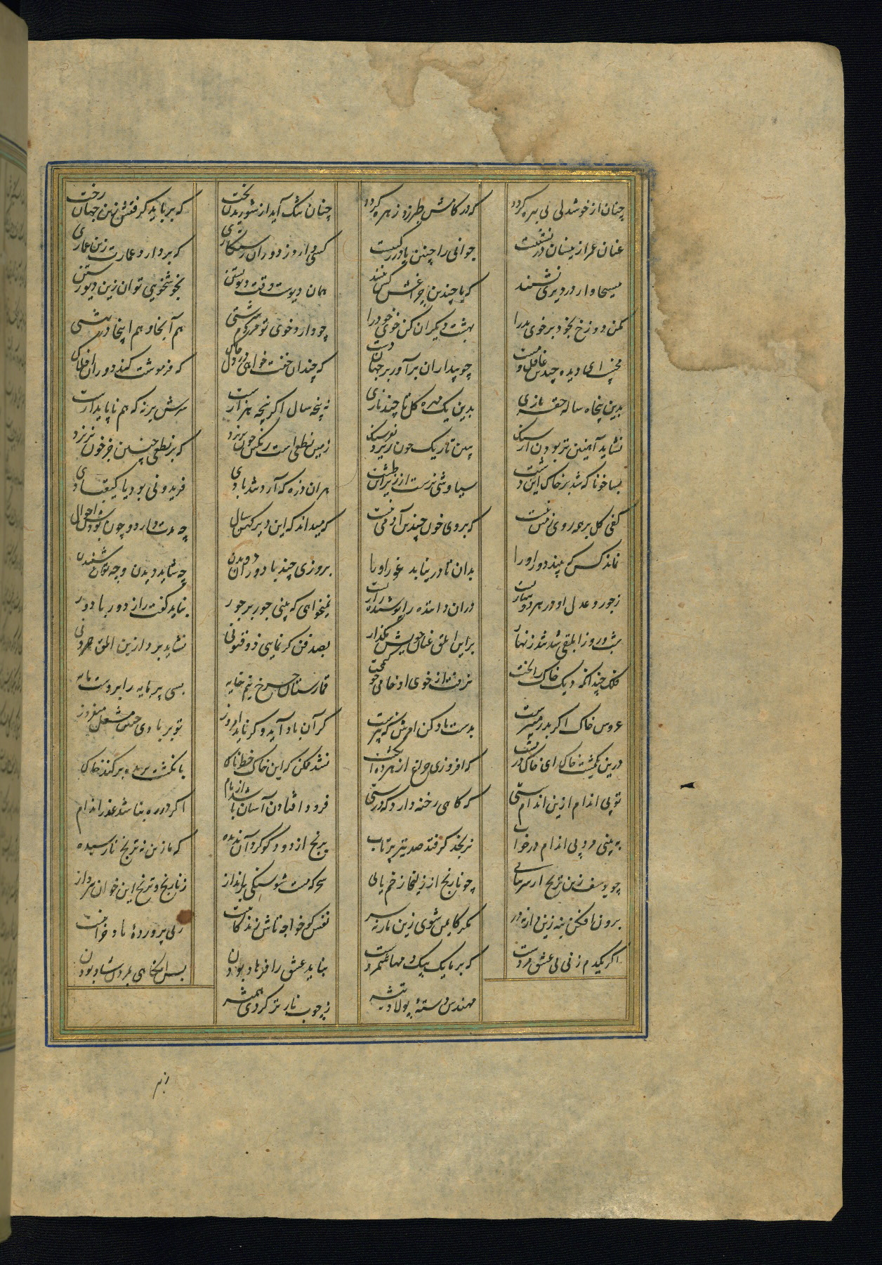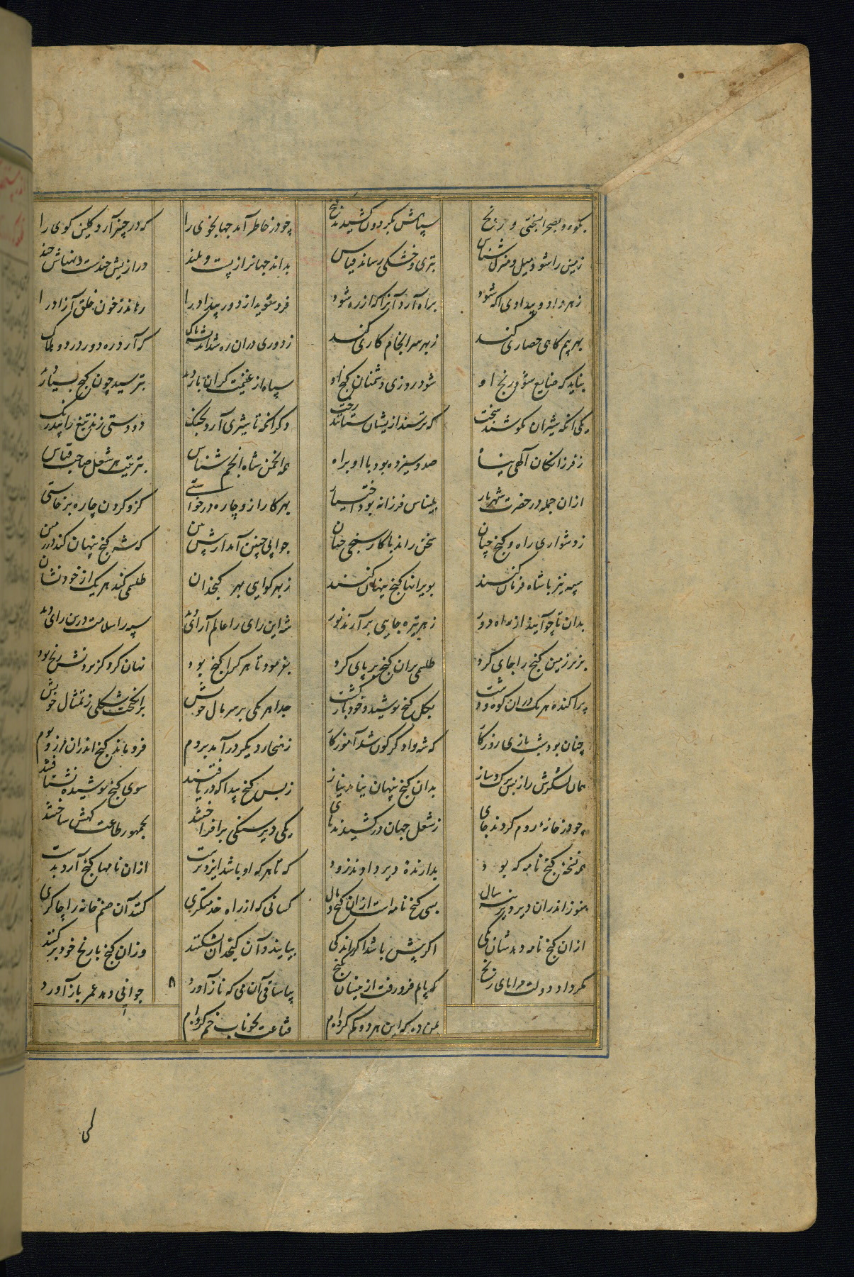 This is an illuminated and illustrated copy of the Khamsah (quintet) by Niẓāmī Ganjavī (d. 605 AH / 1209 CE), completed by Ḥabīb Allāh ibn ʿAlī ibn Ḥusām in Safavid Iran in Rabīʿ II 971 AH / 1563 CE. Illuminated titlepieces introduce the five poems, and there are thirty illustrations, the majority of which are attributable to thirteenth century AH / nineteenth CE Qajar Iran. Ownership notes and seals indicating the provenance of this manuscript are found throughout the codex (fols. 1a, 2a, 153a, 177a, 233a, 349a, and 351a). The binding is not original to the manuscript.