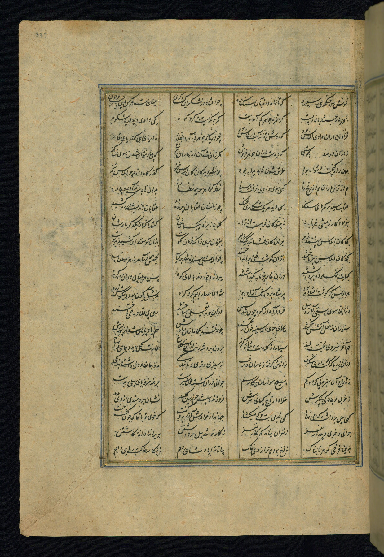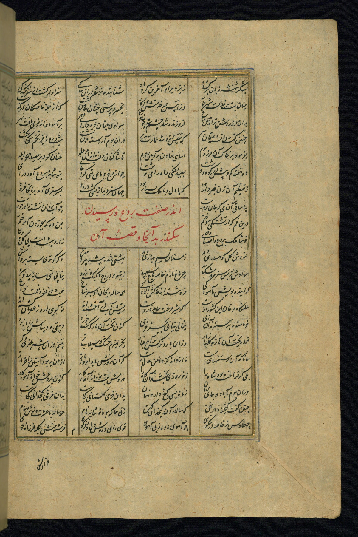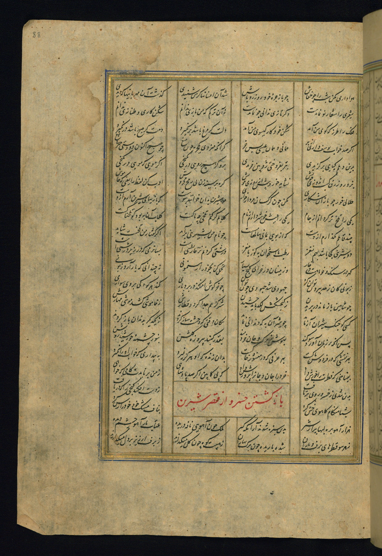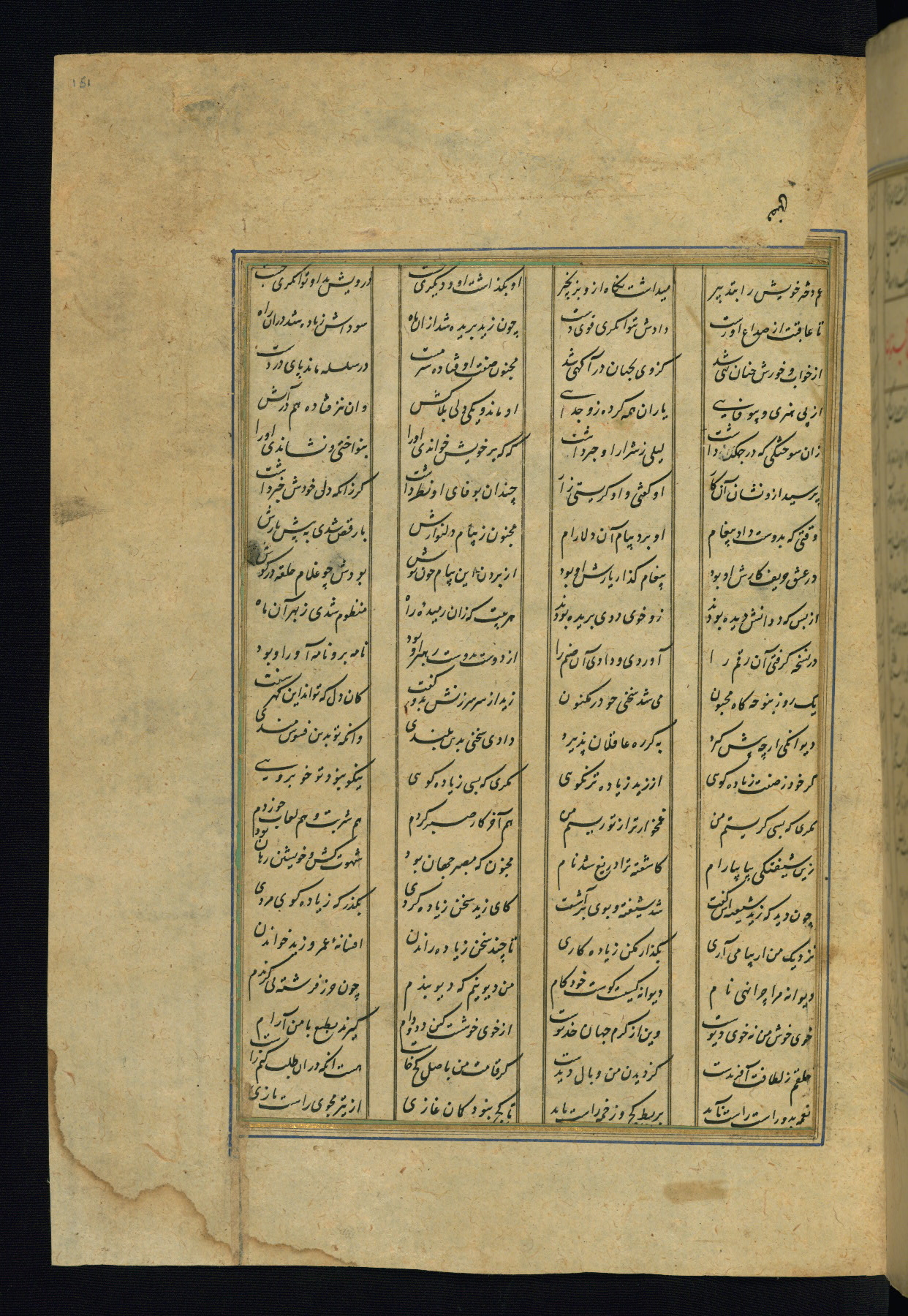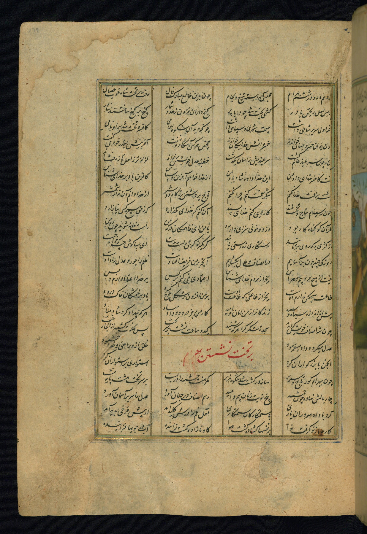 This is an illuminated and illustrated copy of the Khamsah (quintet) by Niẓāmī Ganjavī (d. 605 AH / 1209 CE), completed by Ḥabīb Allāh ibn ʿAlī ibn Ḥusām in Safavid Iran in Rabīʿ II 971 AH / 1563 CE. Illuminated titlepieces introduce the five poems, and there are thirty illustrations, the majority of which are attributable to thirteenth century AH / nineteenth CE Qajar Iran. Ownership notes and seals indicating the provenance of this manuscript are found throughout the codex (fols. 1a, 2a, 153a, 177a, 233a, 349a, and 351a). The binding is not original to the manuscript.