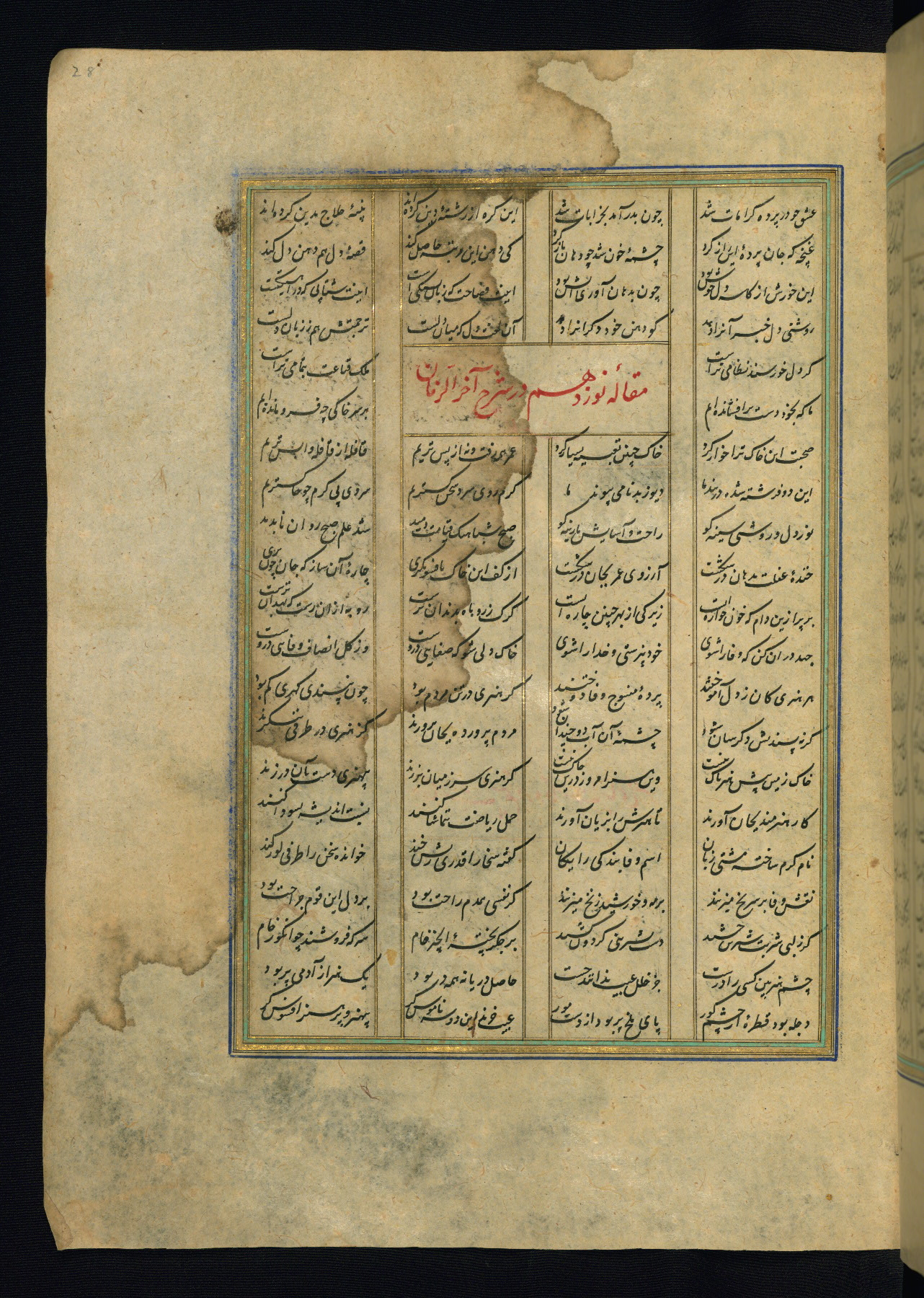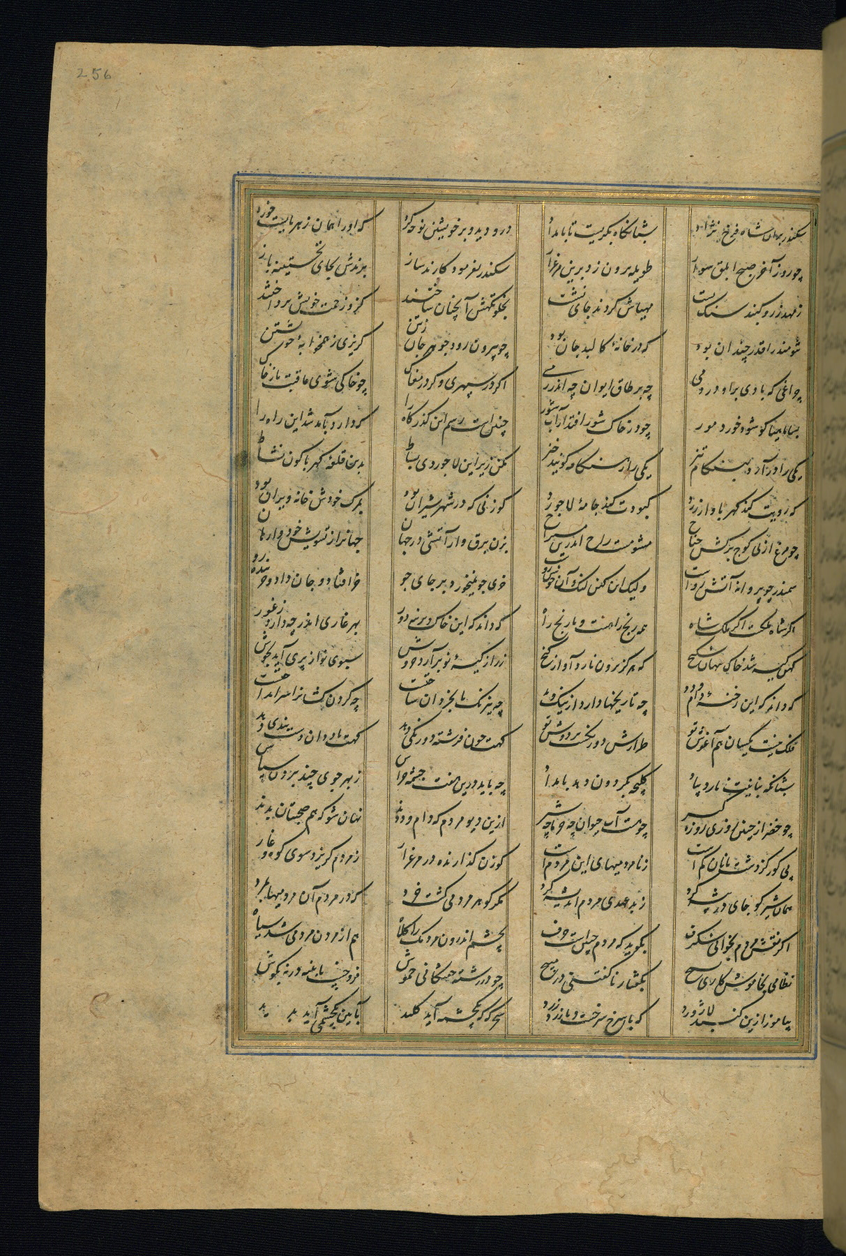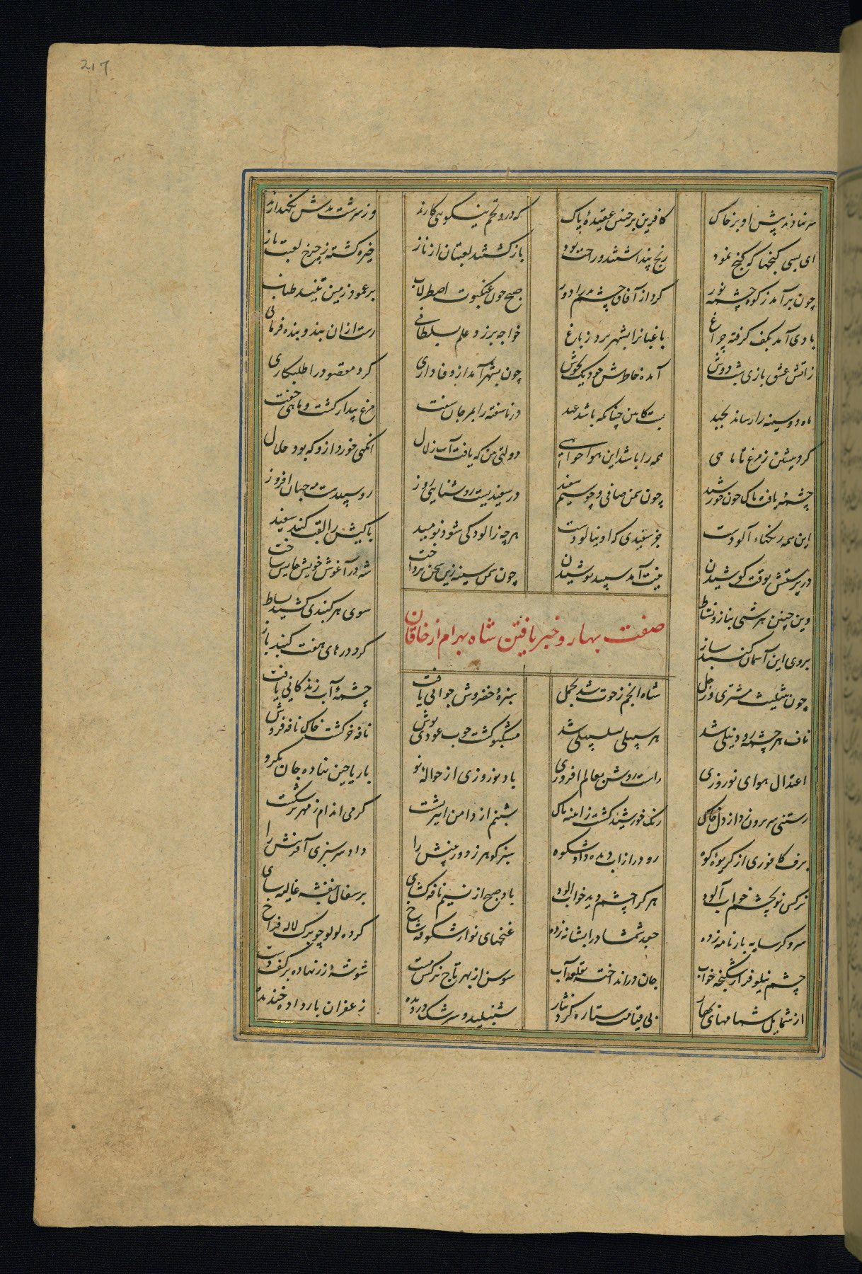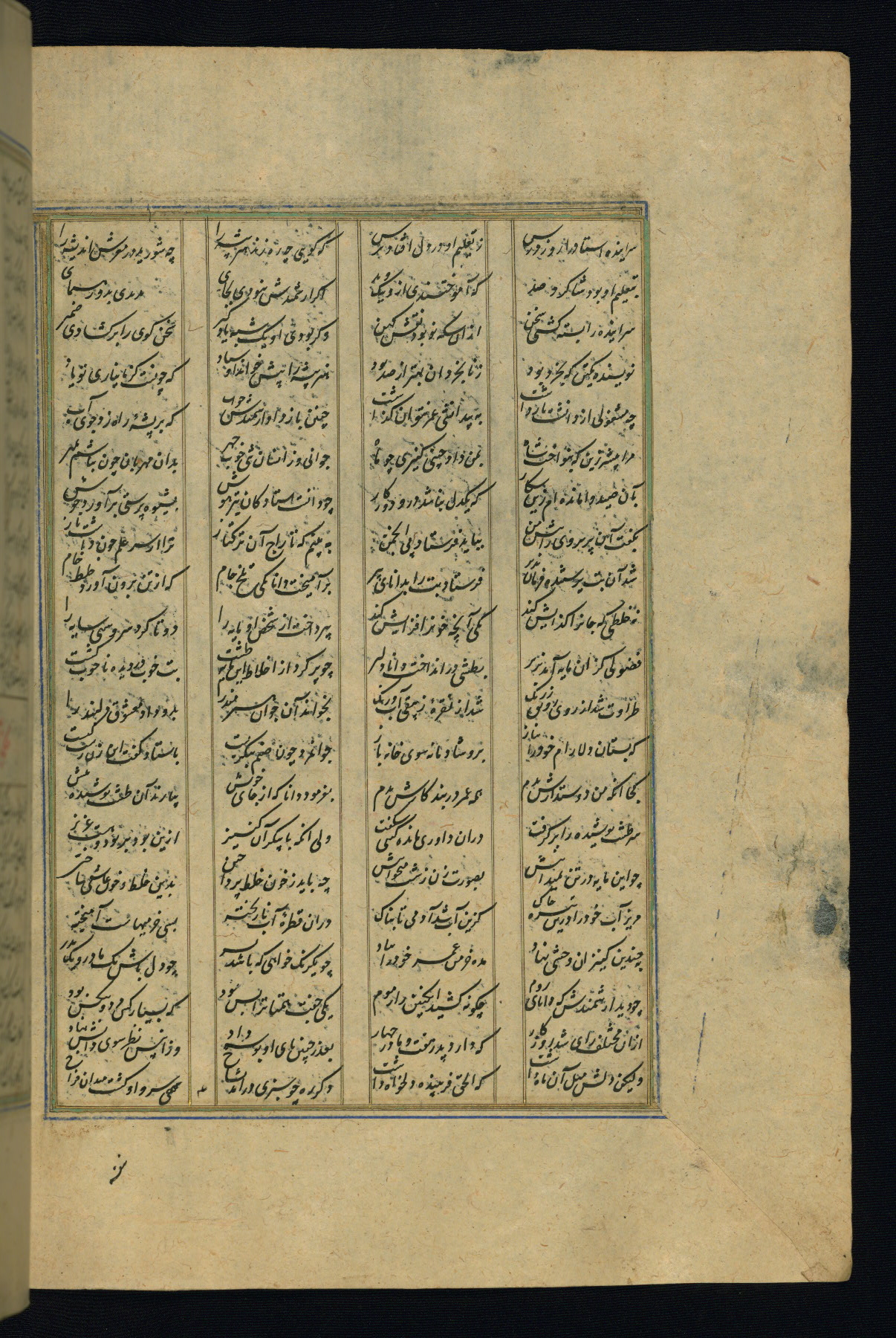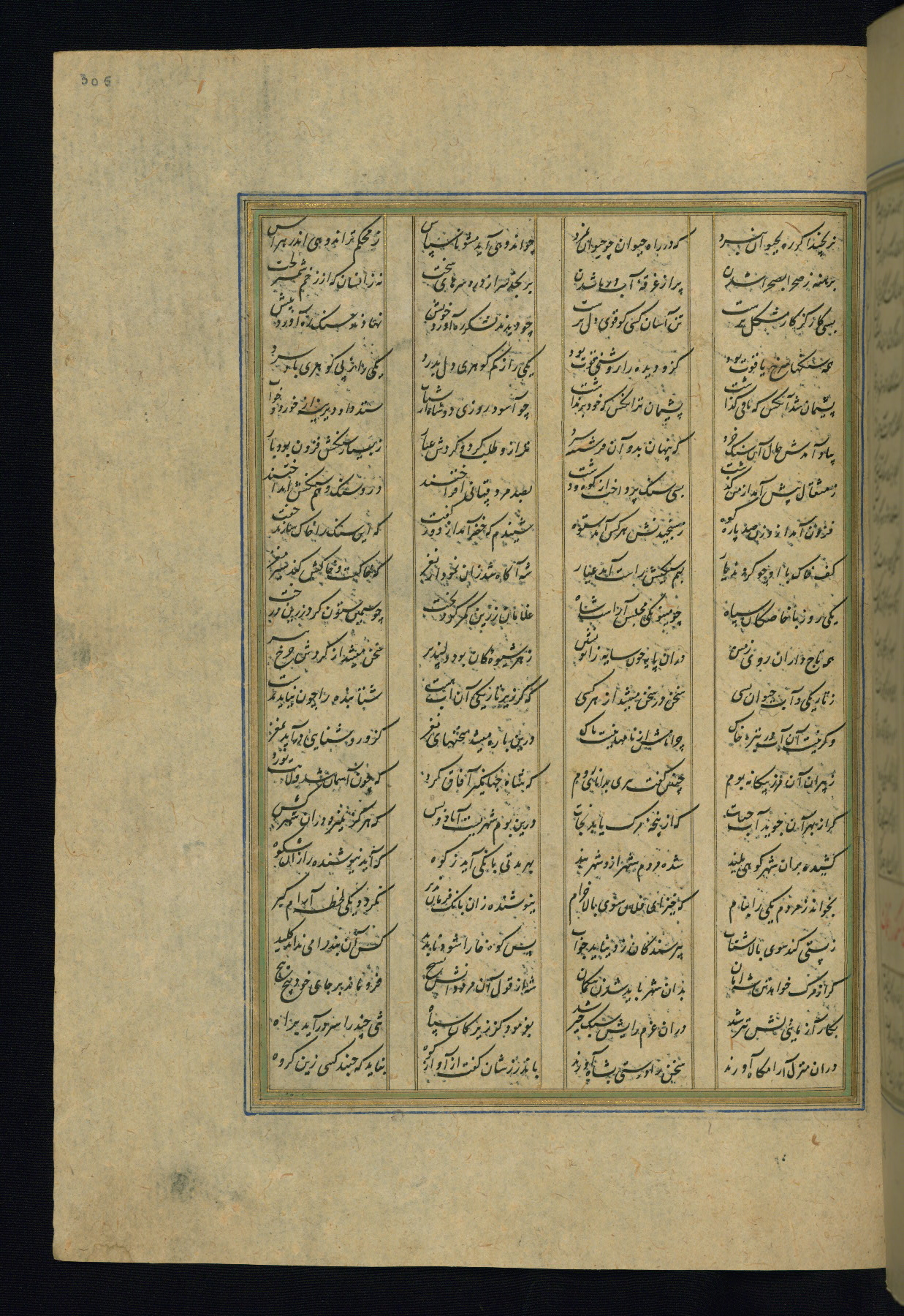 This is an illuminated and illustrated copy of the Khamsah (quintet) by Niẓāmī Ganjavī (d. 605 AH / 1209 CE), completed by Ḥabīb Allāh ibn ʿAlī ibn Ḥusām in Safavid Iran in Rabīʿ II 971 AH / 1563 CE. Illuminated titlepieces introduce the five poems, and there are thirty illustrations, the majority of which are attributable to thirteenth century AH / nineteenth CE Qajar Iran. Ownership notes and seals indicating the provenance of this manuscript are found throughout the codex (fols. 1a, 2a, 153a, 177a, 233a, 349a, and 351a). The binding is not original to the manuscript.