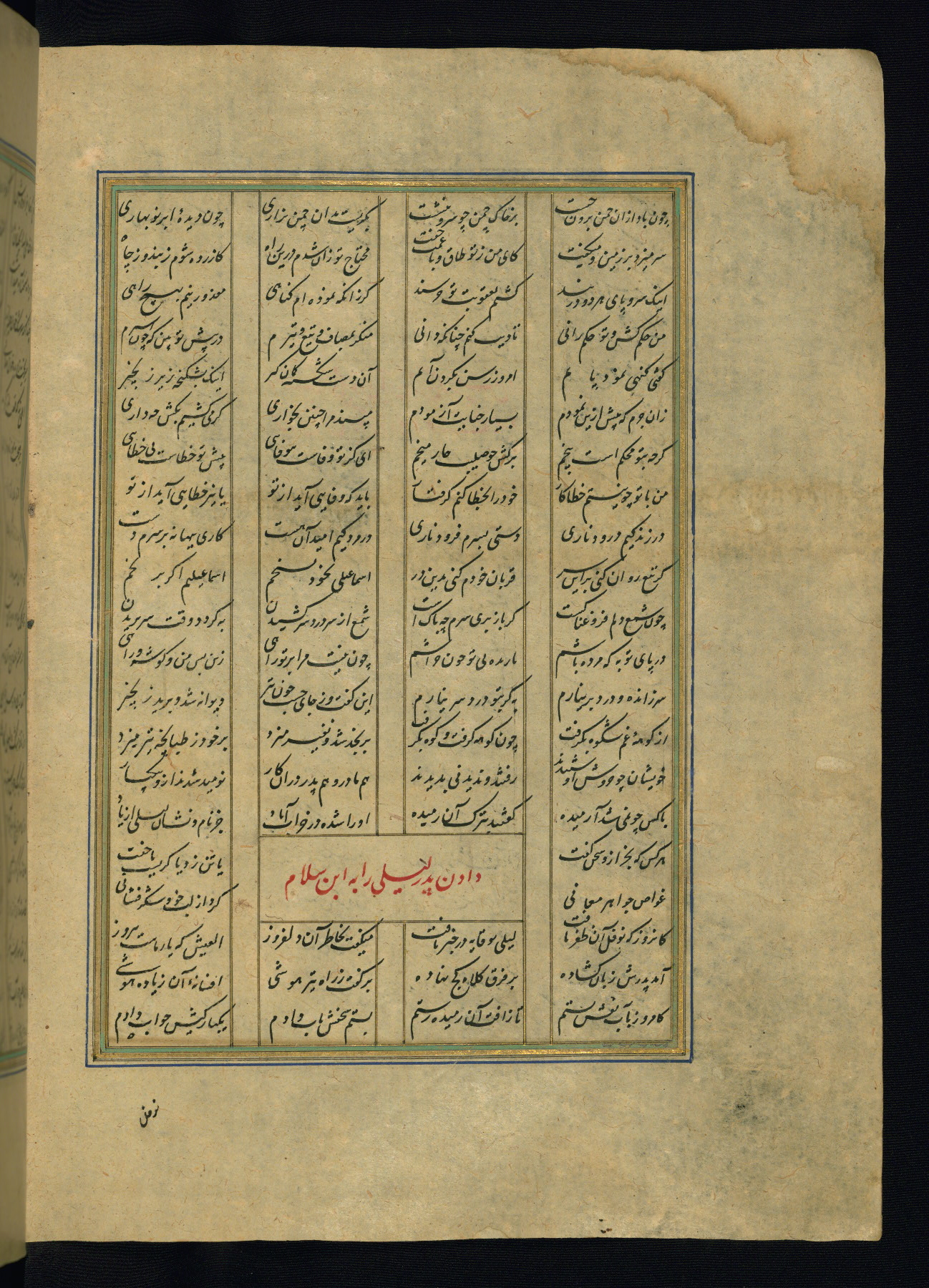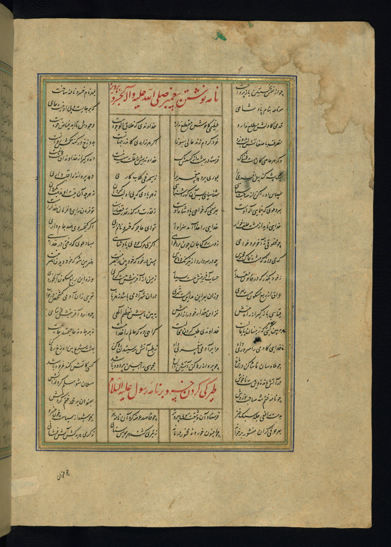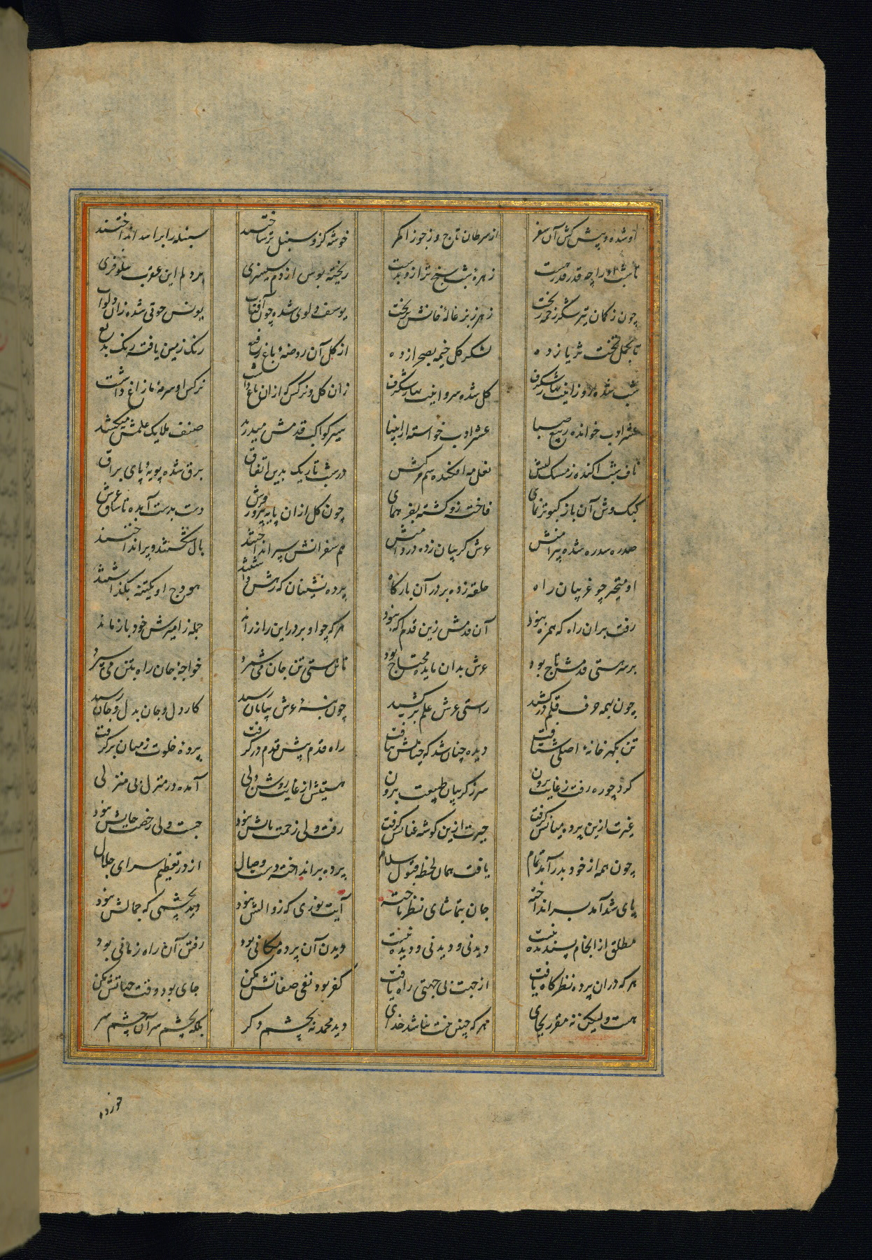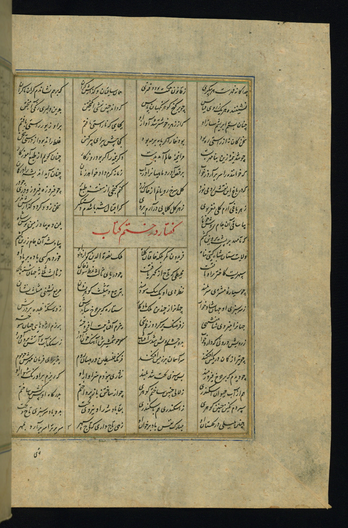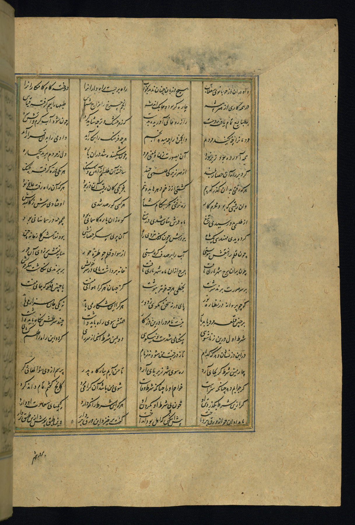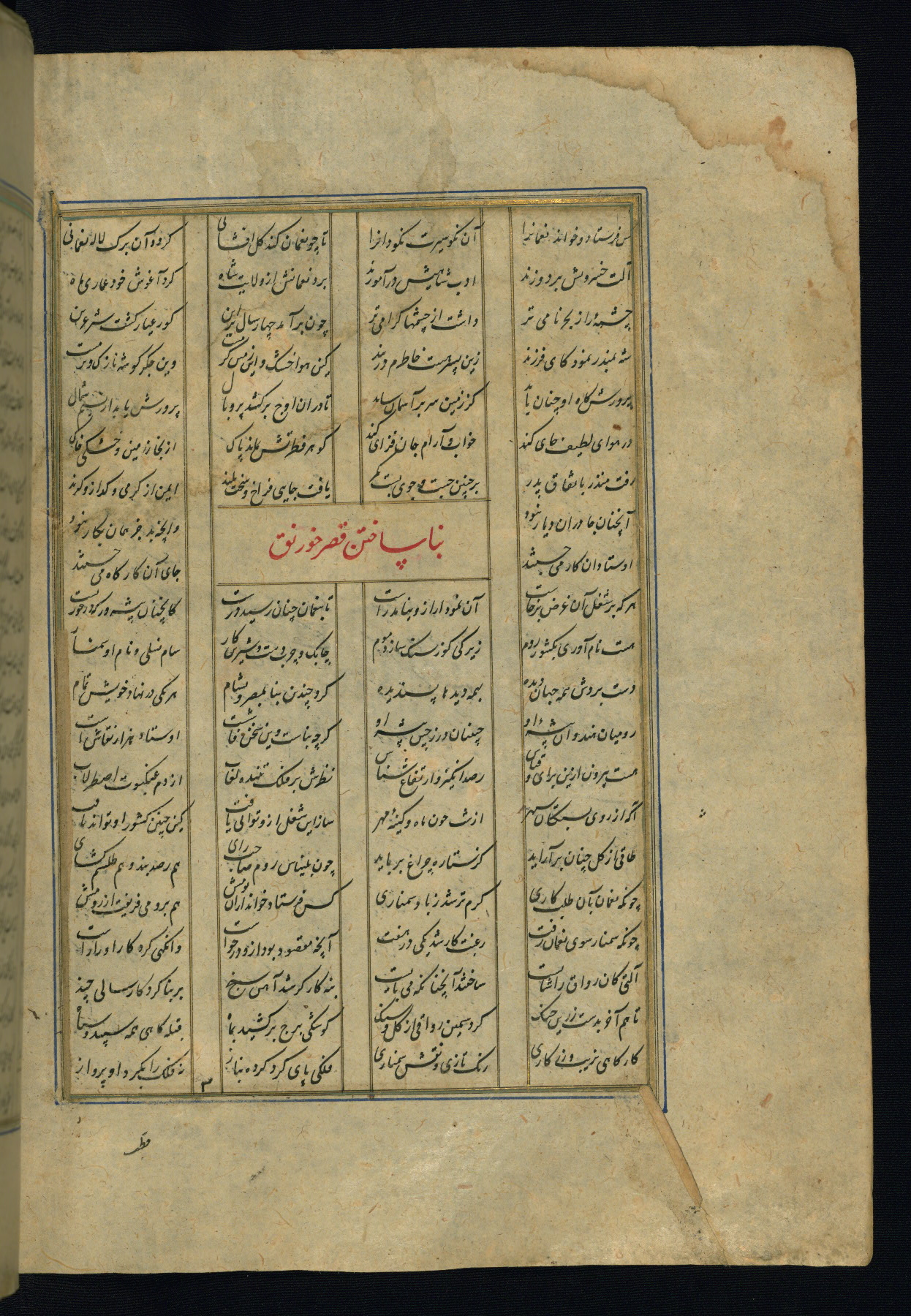 This is an illuminated and illustrated copy of the Khamsah (quintet) by Niẓāmī Ganjavī (d. 605 AH / 1209 CE), completed by Ḥabīb Allāh ibn ʿAlī ibn Ḥusām in Safavid Iran in Rabīʿ II 971 AH / 1563 CE. Illuminated titlepieces introduce the five poems, and there are thirty illustrations, the majority of which are attributable to thirteenth century AH / nineteenth CE Qajar Iran. Ownership notes and seals indicating the provenance of this manuscript are found throughout the codex (fols. 1a, 2a, 153a, 177a, 233a, 349a, and 351a). The binding is not original to the manuscript.