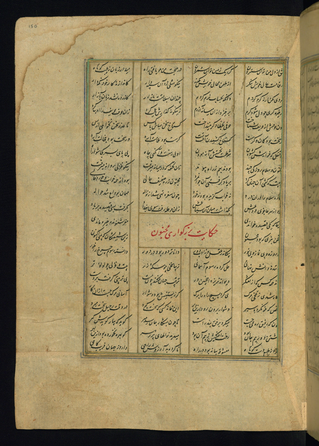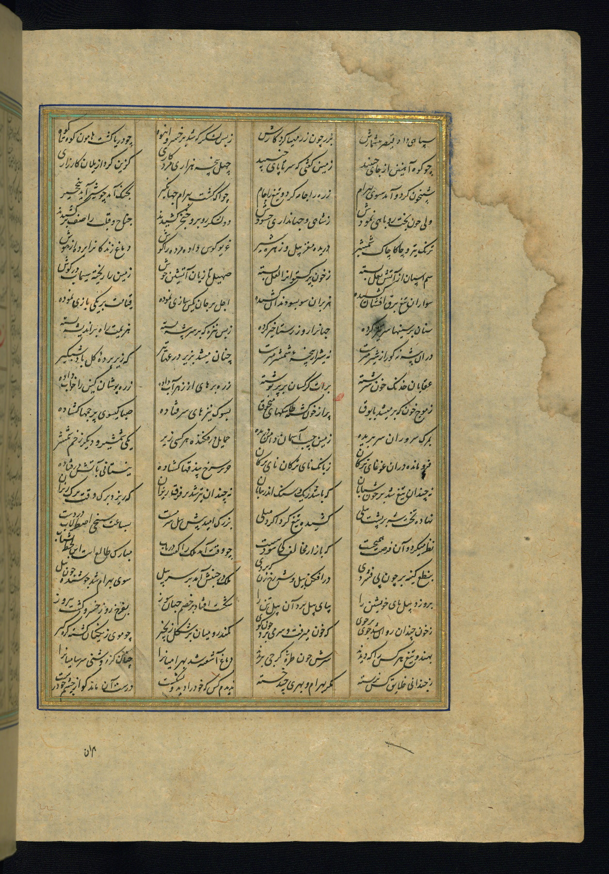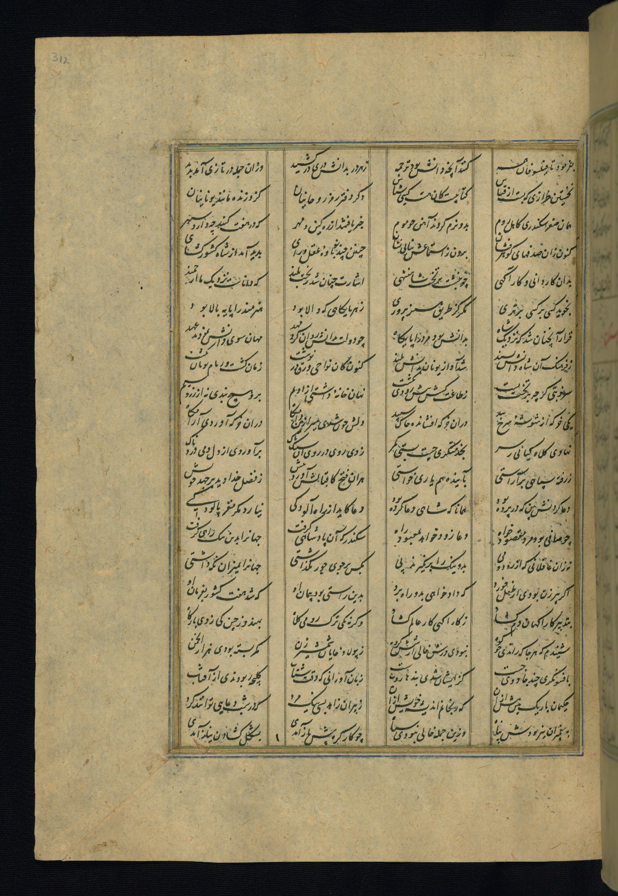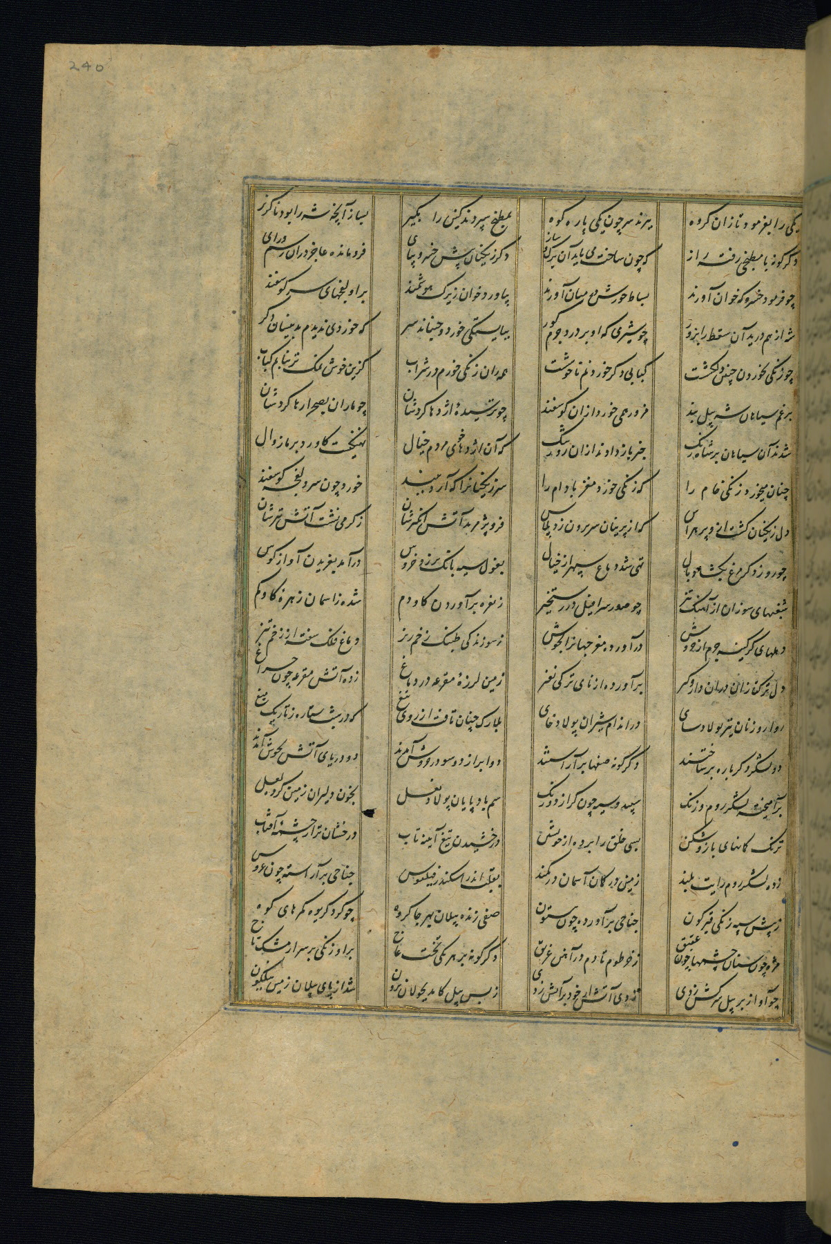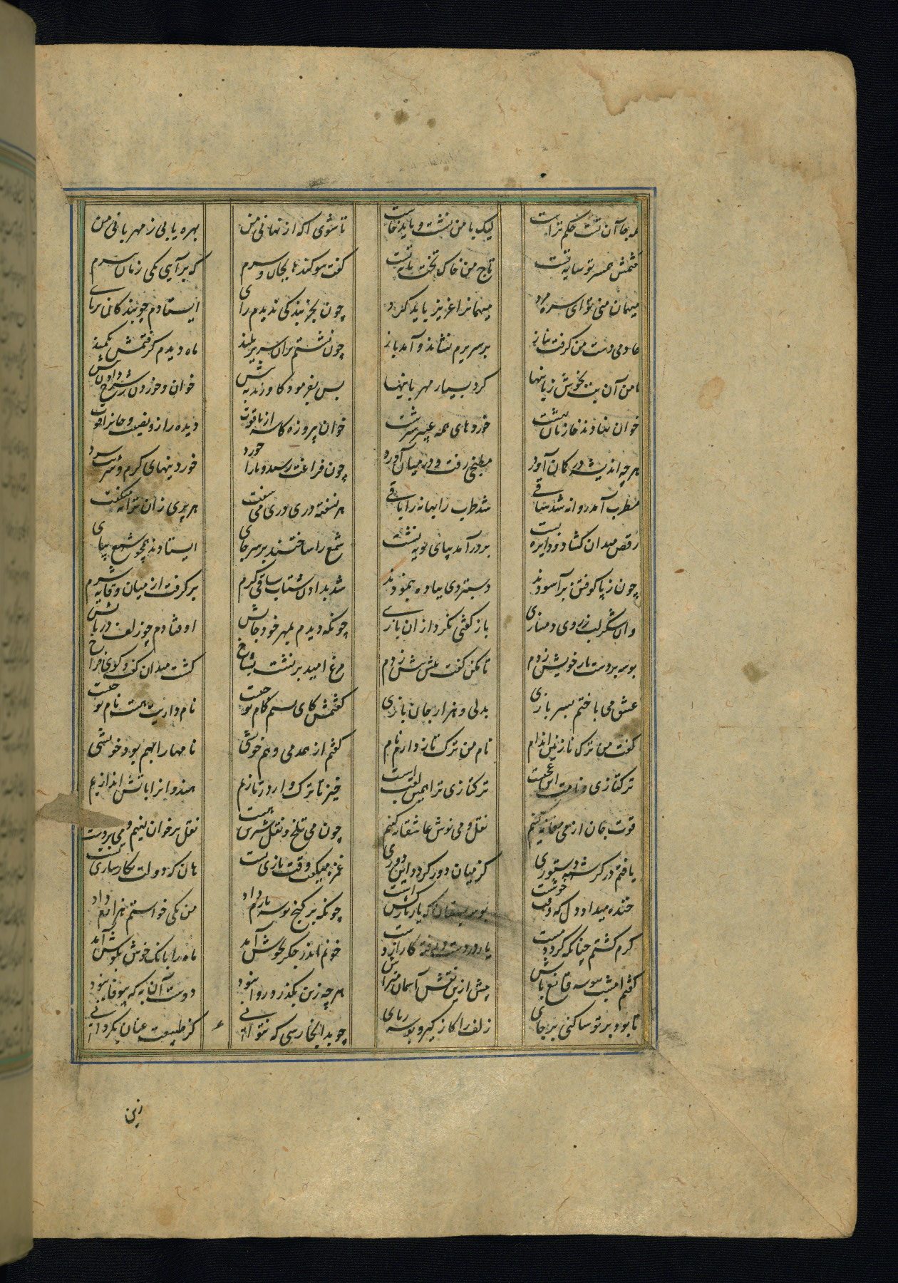 This is an illuminated and illustrated copy of the Khamsah (quintet) by Niẓāmī Ganjavī (d. 605 AH / 1209 CE), completed by Ḥabīb Allāh ibn ʿAlī ibn Ḥusām in Safavid Iran in Rabīʿ II 971 AH / 1563 CE. Illuminated titlepieces introduce the five poems, and there are thirty illustrations, the majority of which are attributable to thirteenth century AH / nineteenth CE Qajar Iran. Ownership notes and seals indicating the provenance of this manuscript are found throughout the codex (fols. 1a, 2a, 153a, 177a, 233a, 349a, and 351a). The binding is not original to the manuscript.
